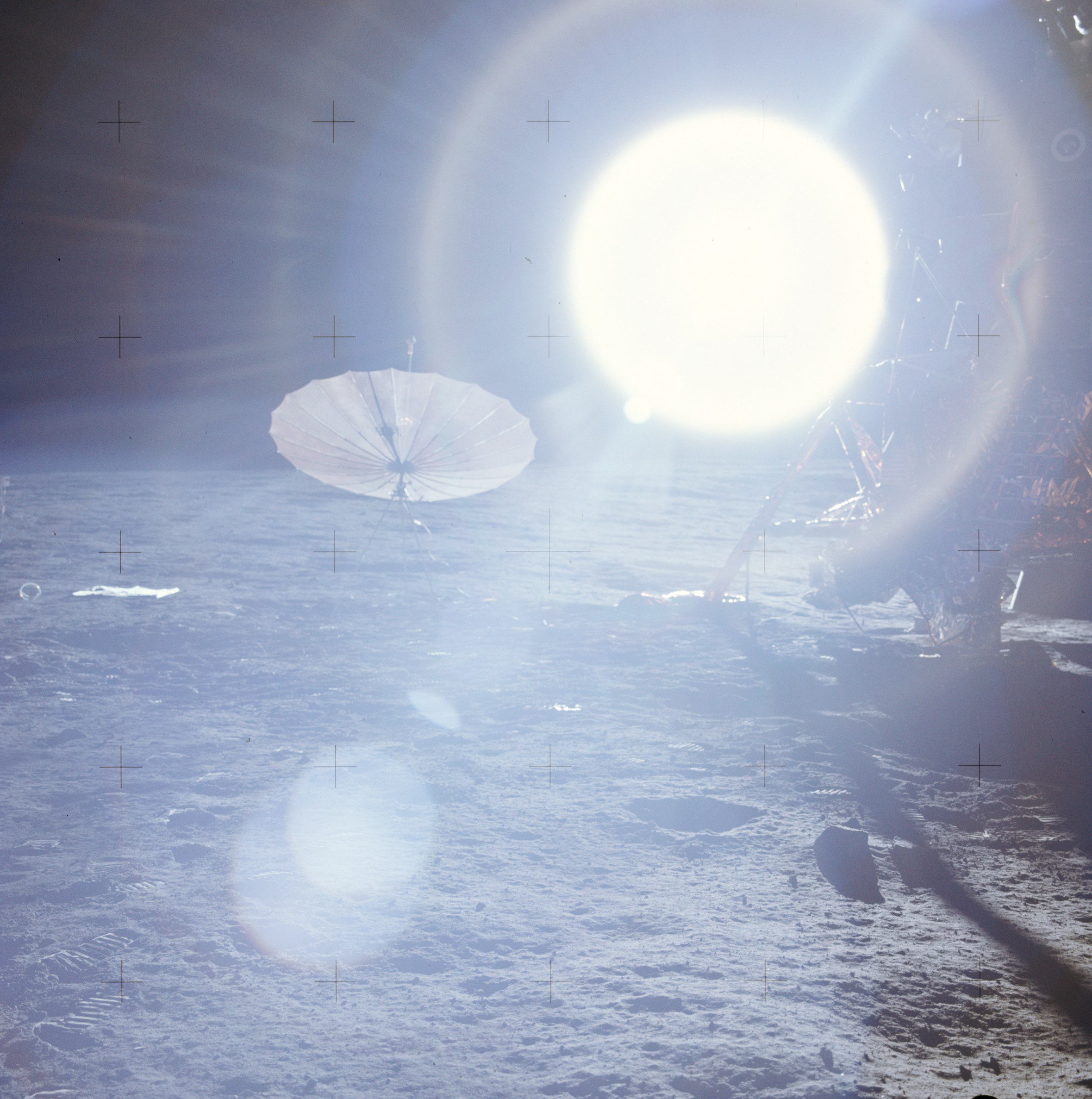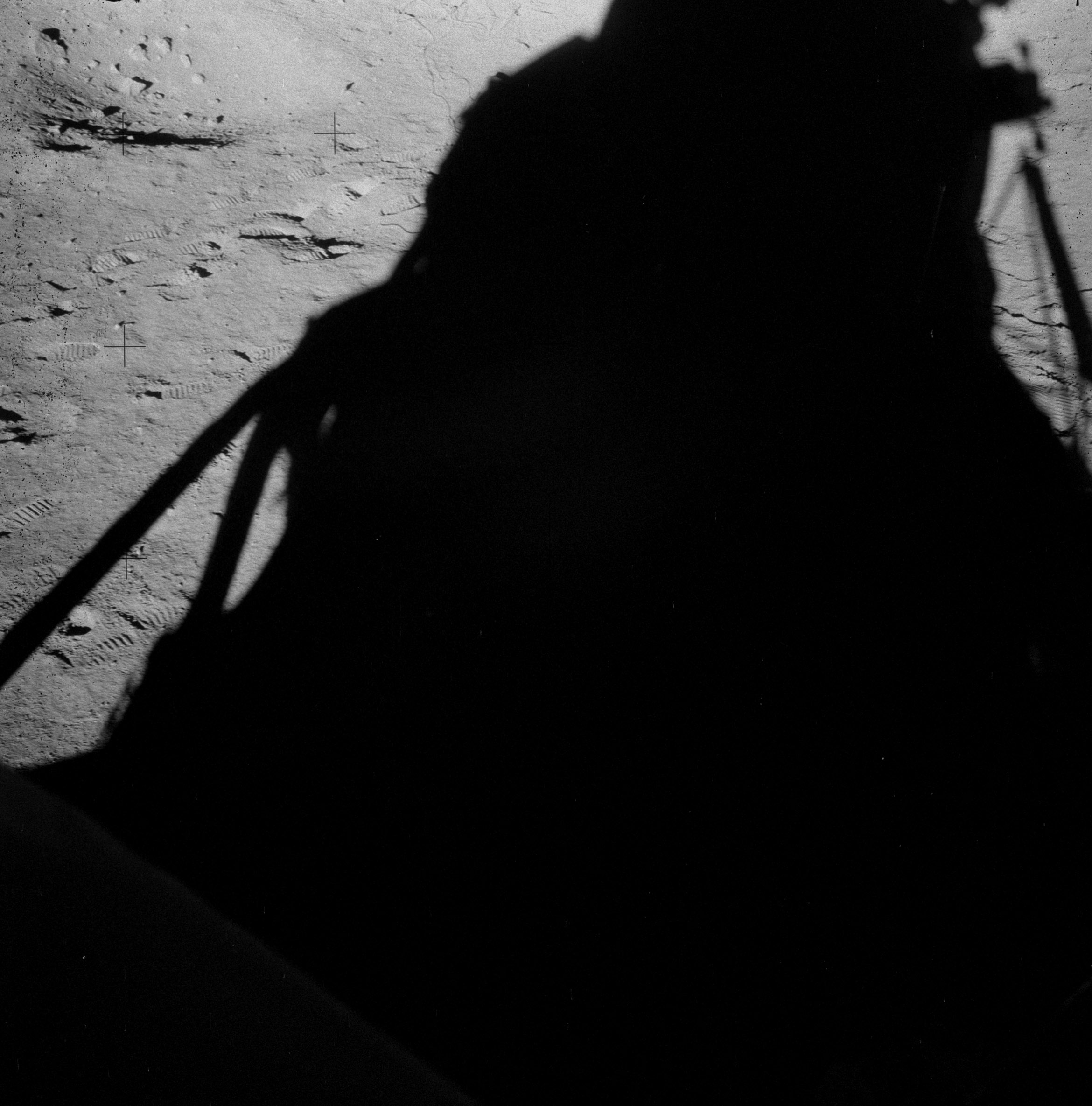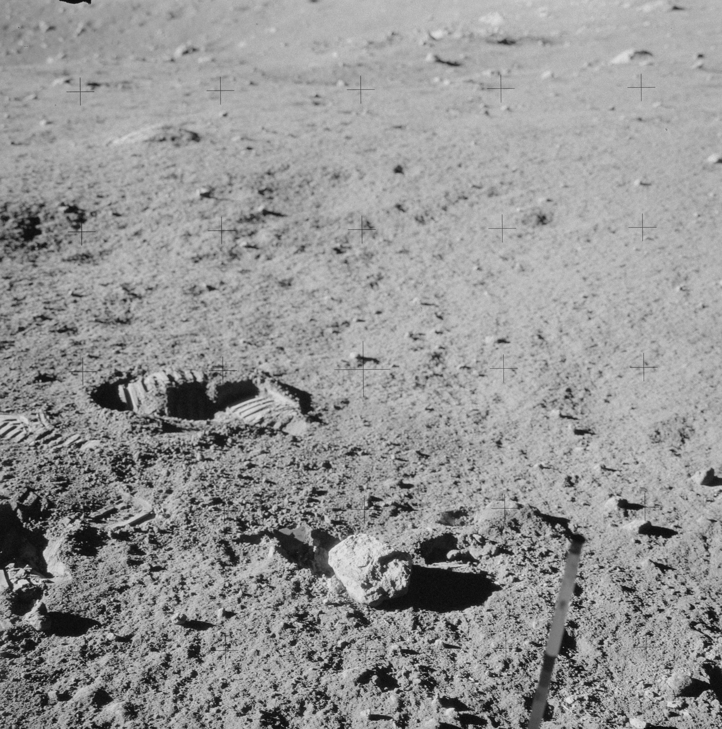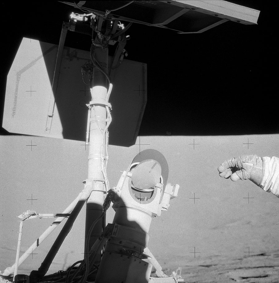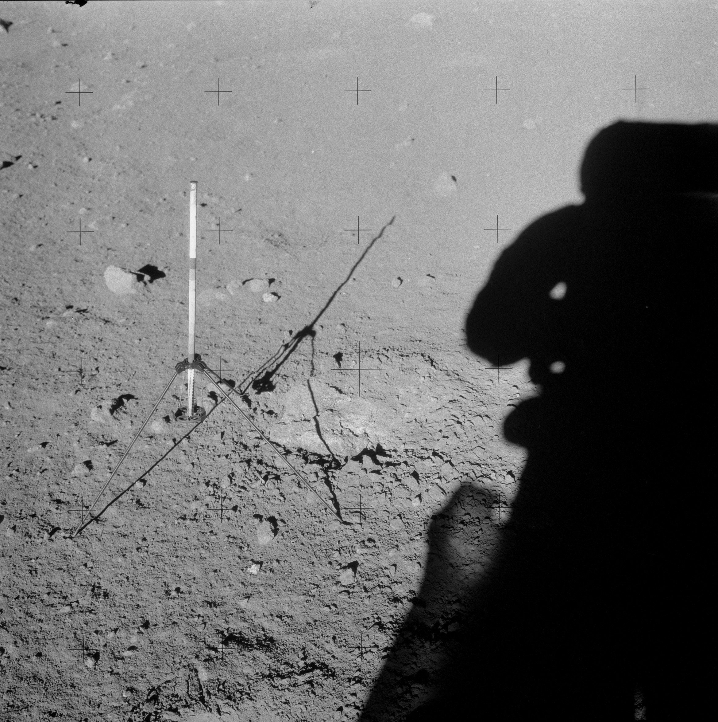 We have begun adding scans of the original film. These scans are being done by NASA Johnson, with some post-processing by Kipp Teague. The film is scanned at 4096 x 4096 pixels per image. (See a discussion from Arizona State University about the scanning process.) Kipp reduces each digital image to approximately 2350 x 2350 pixels (equivalent to 300 dpi) and does minor adjustments of levels to ensure that (1) brightly lit areas of lunar soil are neutral grey, (2) objects with known colors (such as the CDR stripes or the LCRU blankets) look right, and (3) information in bright or dark areas is not lost. These images from original film are indicated by the notation 'OF300' in the image description. In each case, a 900 x 900 pixel version is also provided.