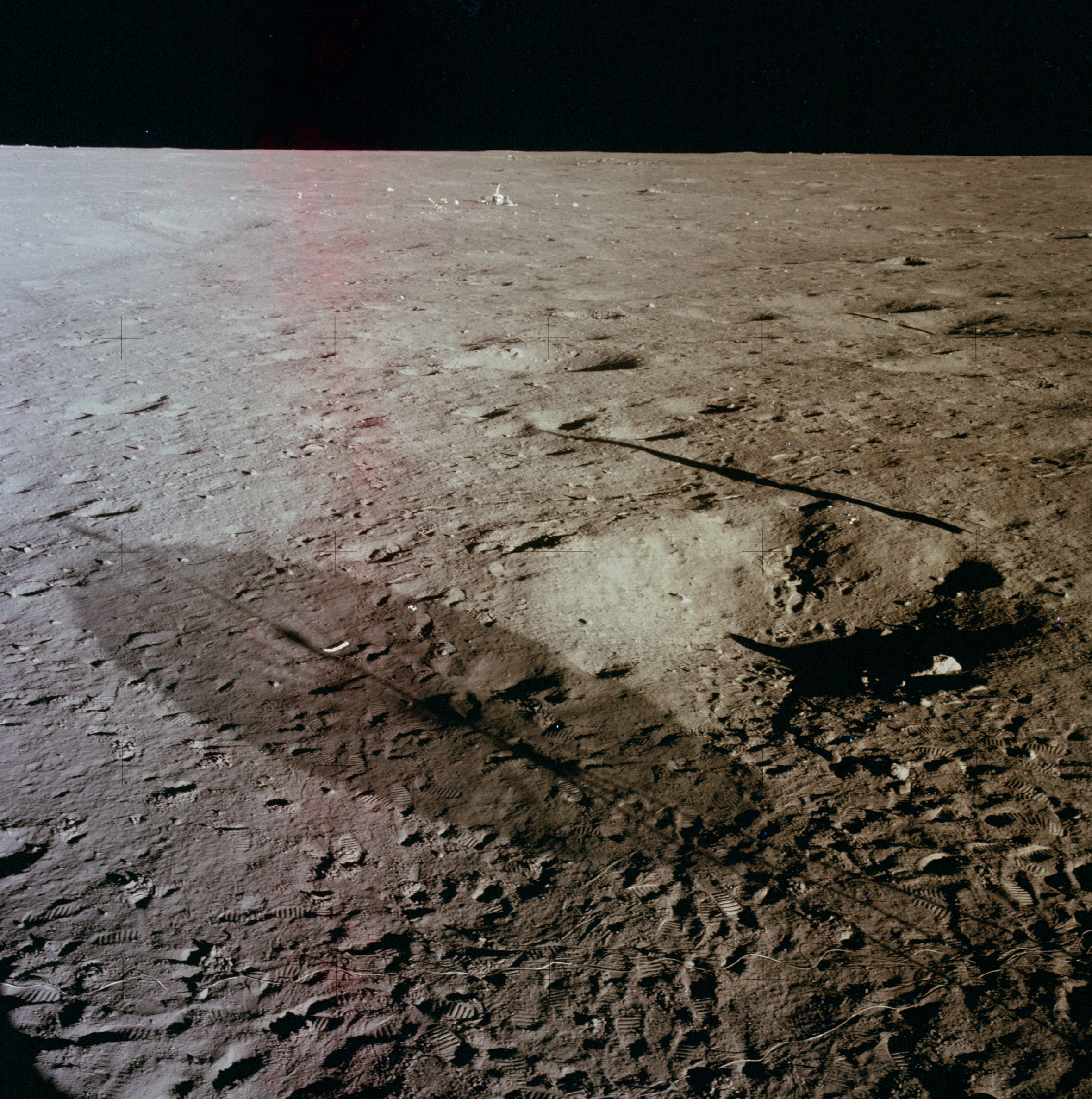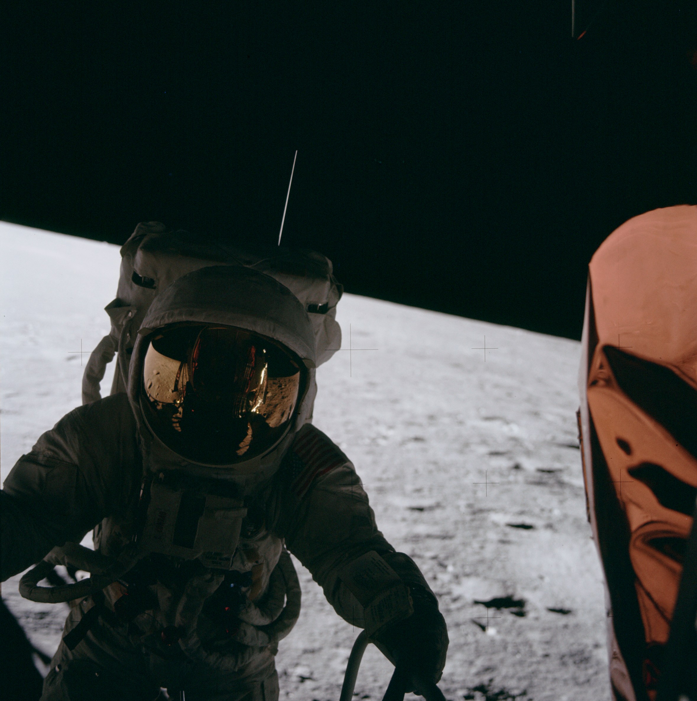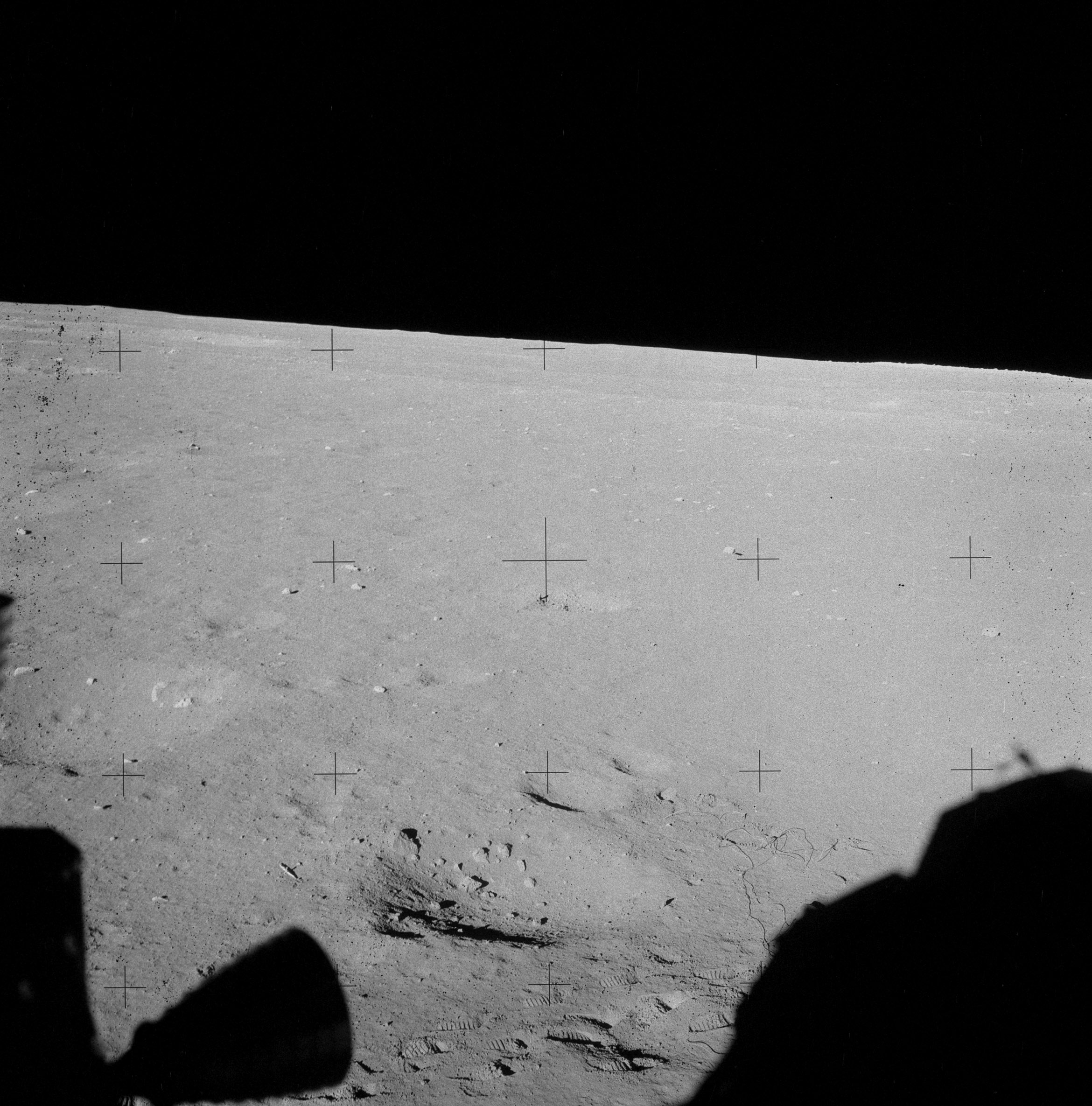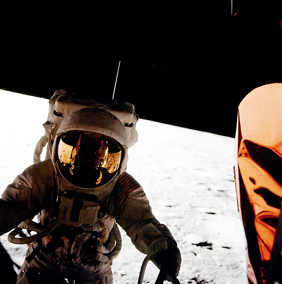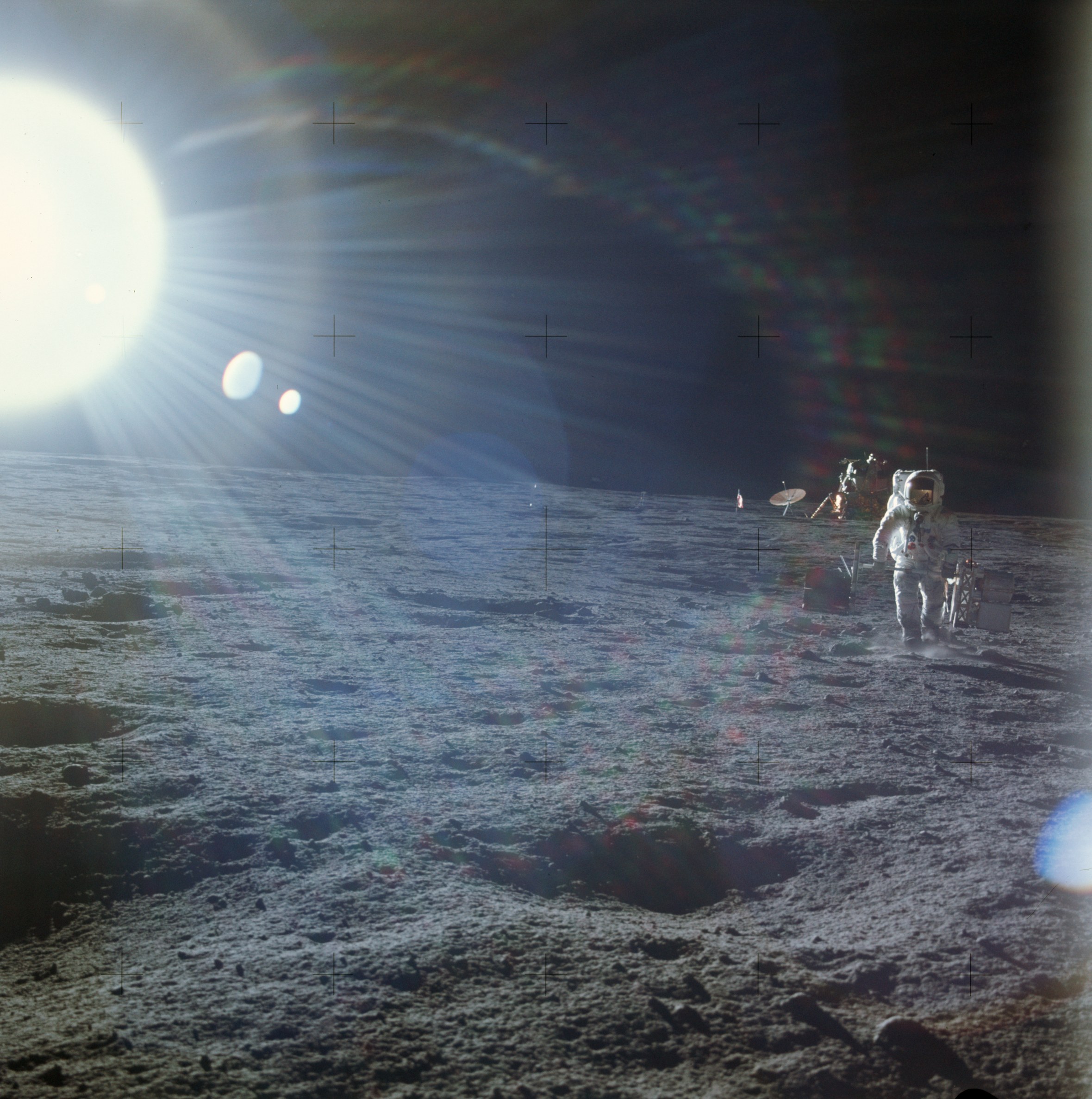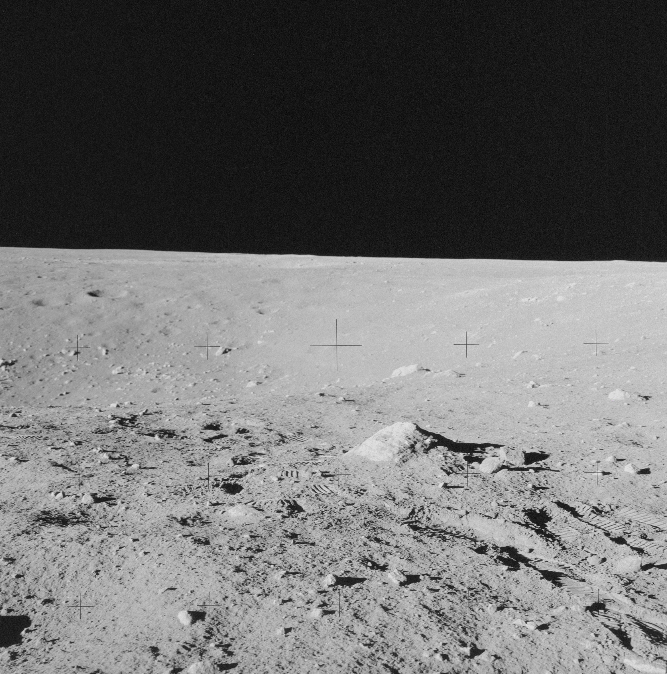 We have begun adding scans of the original film. These scans are being done by NASA Johnson, with some post-processing by Kipp Teague. The film is scanned at 4096 x 4096 pixels per image. (See a discussion from Arizona State University about the scanning process.) Kipp reduces each digital image to approximately 2350 x 2350 pixels (equivalent to 300 dpi) and does minor adjustments of levels to ensure that (1) brightly lit areas of lunar soil are neutral grey, (2) objects with known colors (such as the CDR stripes or the LCRU blankets) look right, and (3) information in bright or dark areas is not lost. These images from original film are indicated by the notation 'OF300' in the image description. In each case, a 900 x 900 pixel version is also provided.