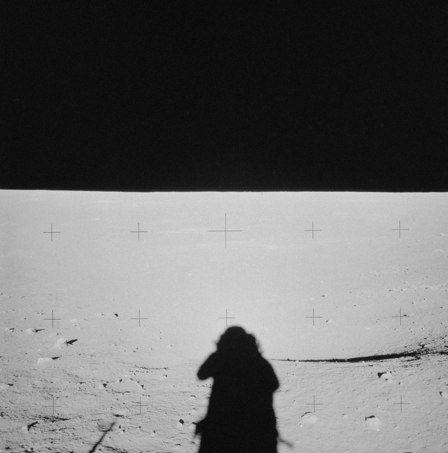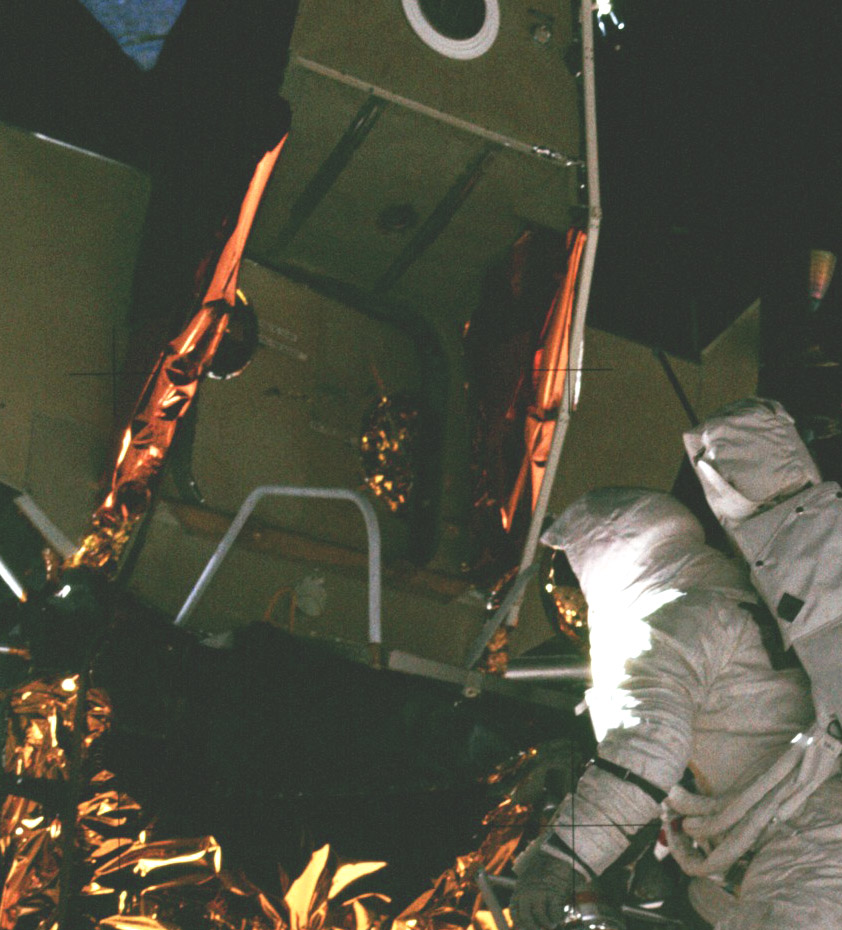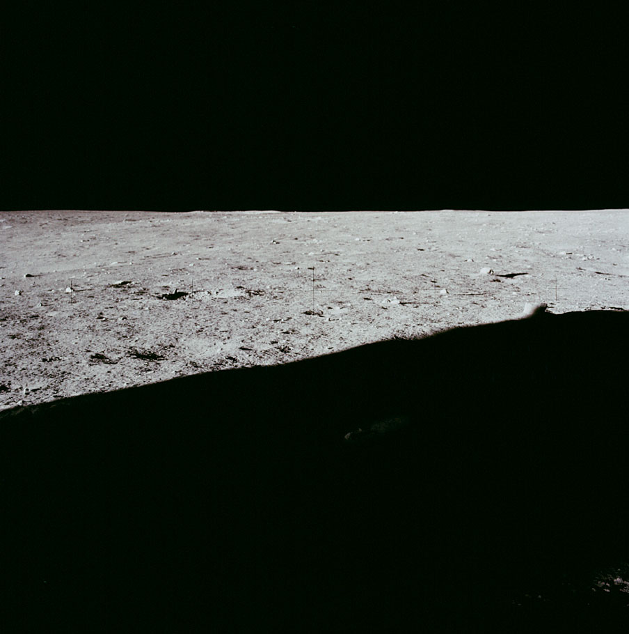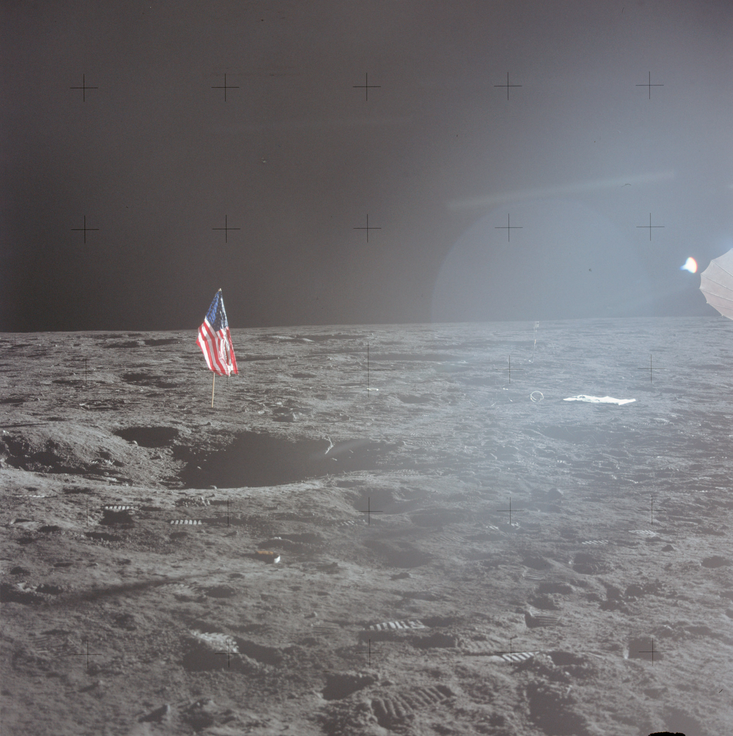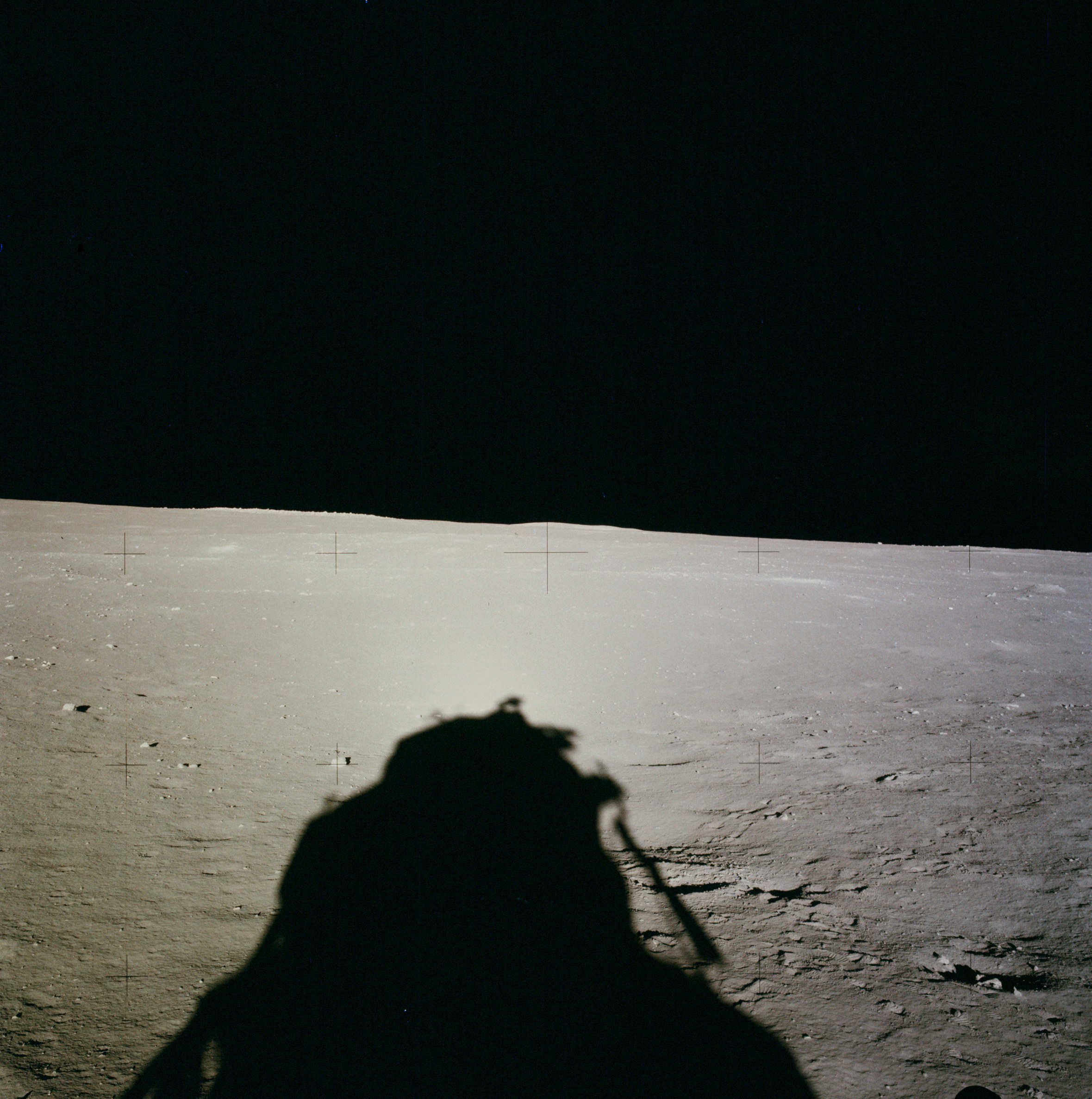 We have begun adding scans of the original film. These scans are being done by NASA Johnson, with some post-processing by Kipp Teague. The film is scanned at 4096 x 4096 pixels per image. (See a discussion from Arizona State University about the scanning process.) Kipp reduces each digital image to approximately 2350 x 2350 pixels (equivalent to 300 dpi) and does minor adjustments of levels to ensure that (1) brightly lit areas of lunar soil are neutral grey, (2) objects with known colors (such as the CDR stripes or the LCRU blankets) look right, and (3) information in bright or dark areas is not lost. These images from original film are indicated by the notation 'OF300' in the image description. In each case, a 900 x 900 pixel version is also provided.