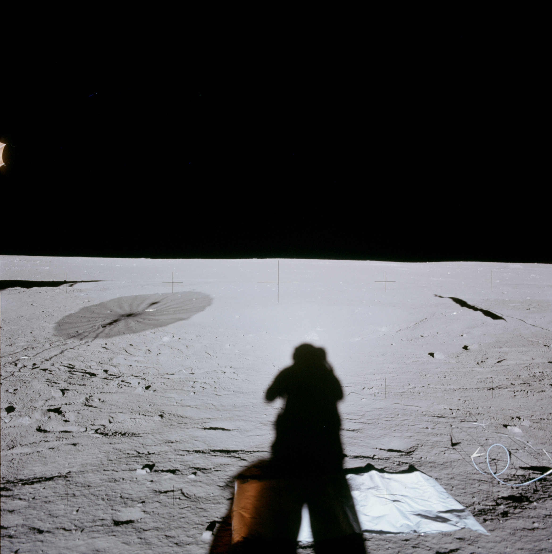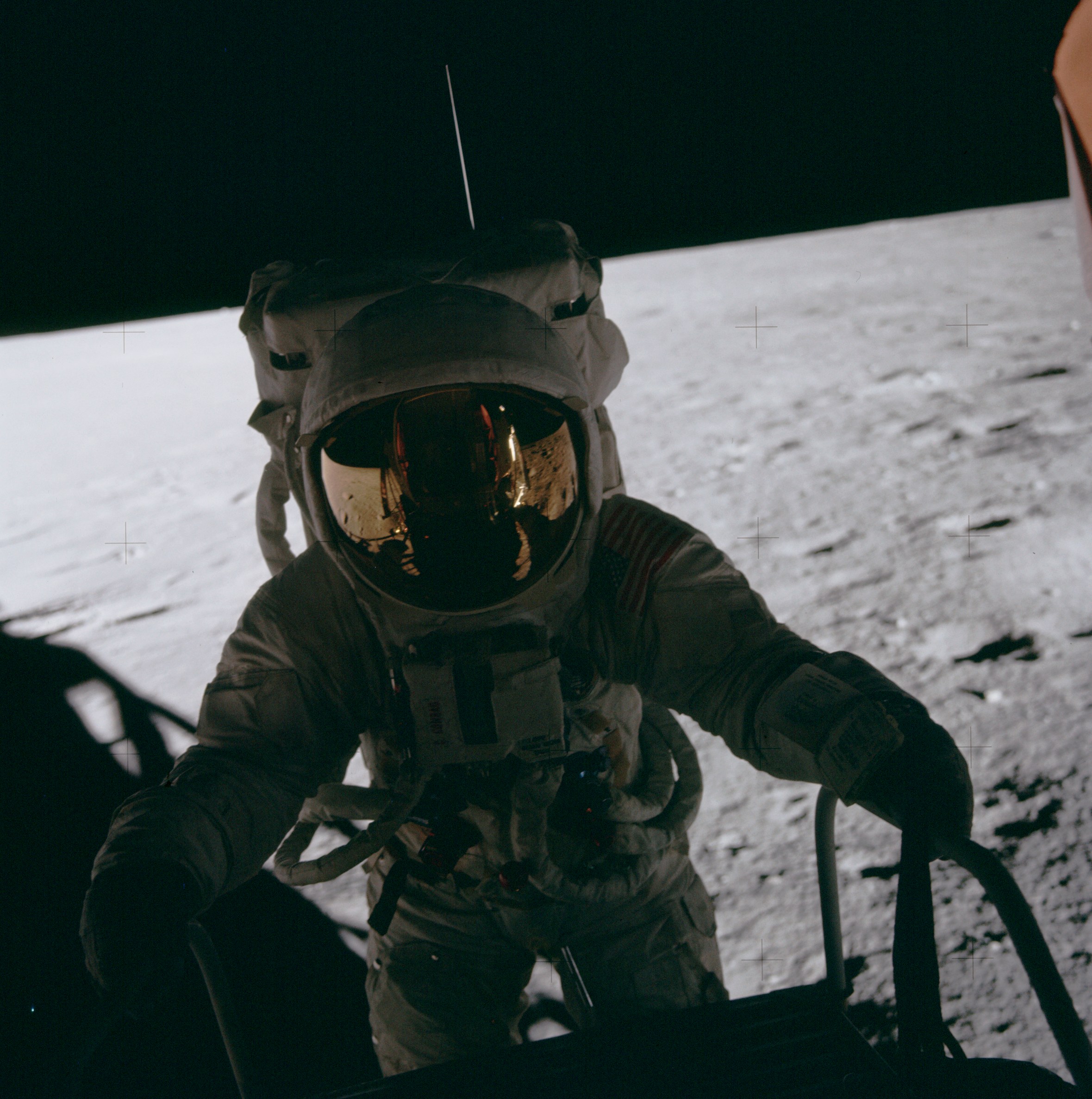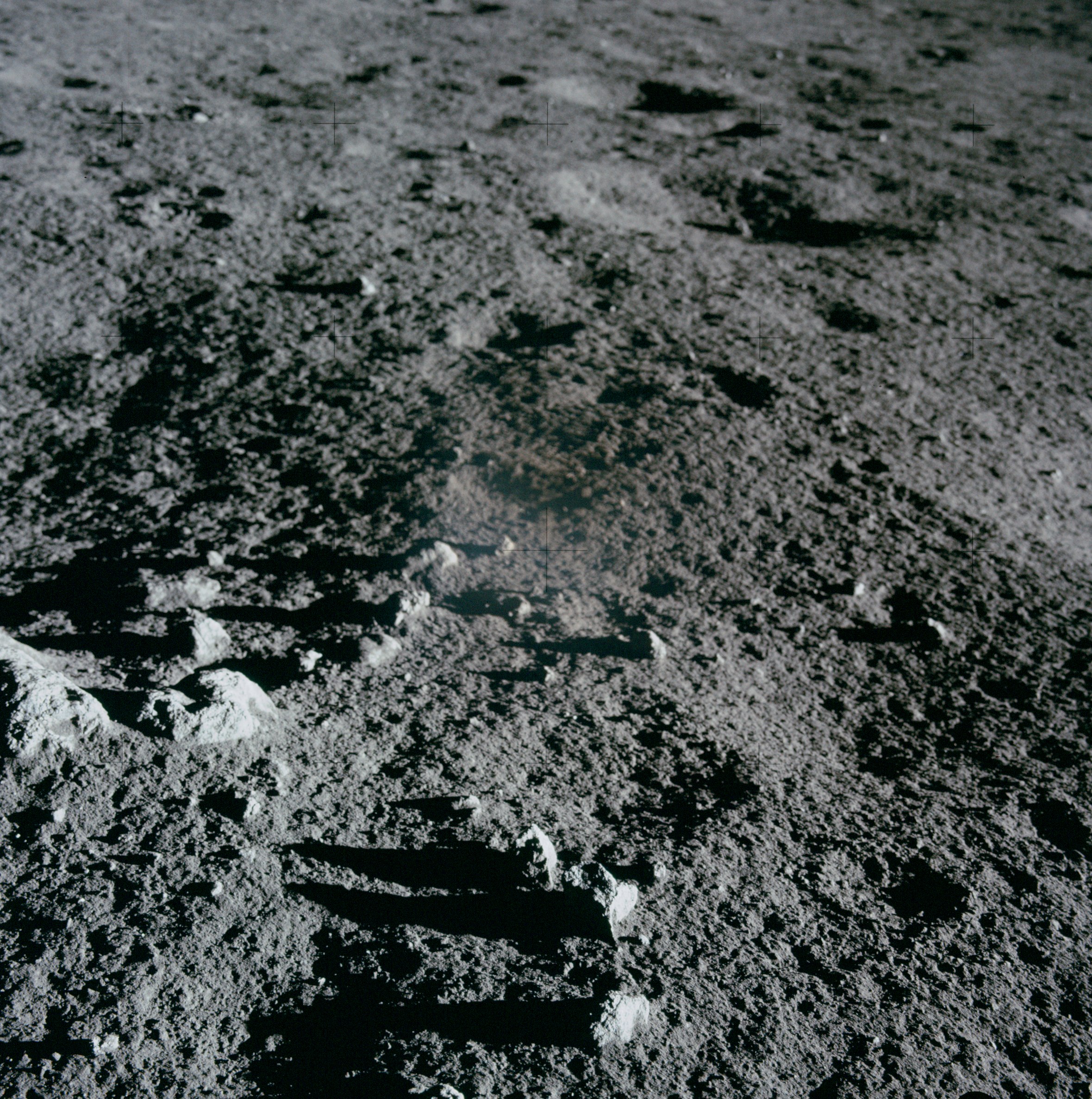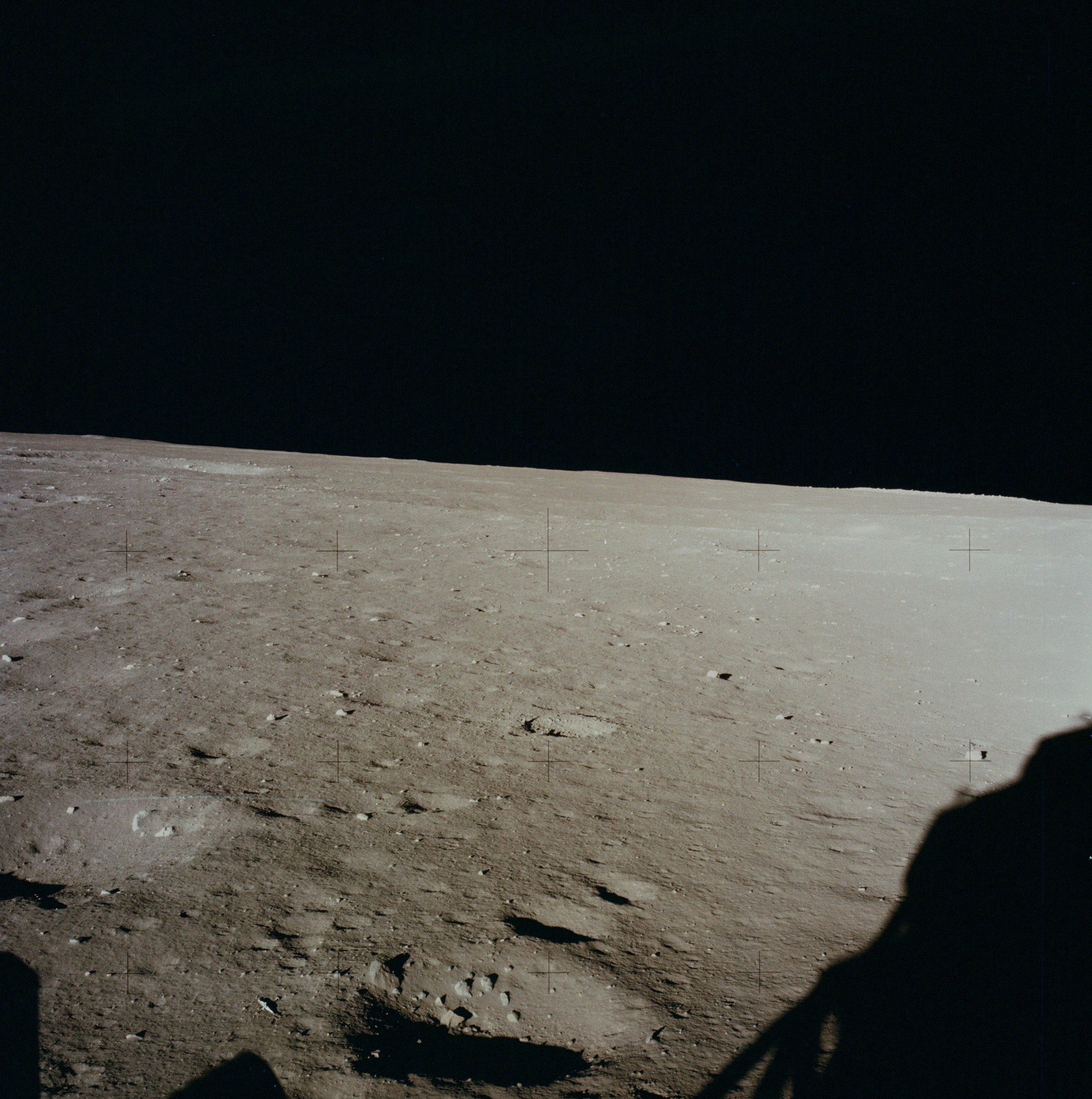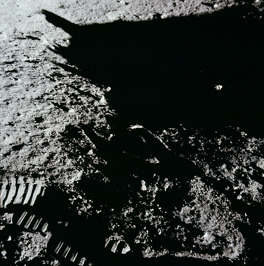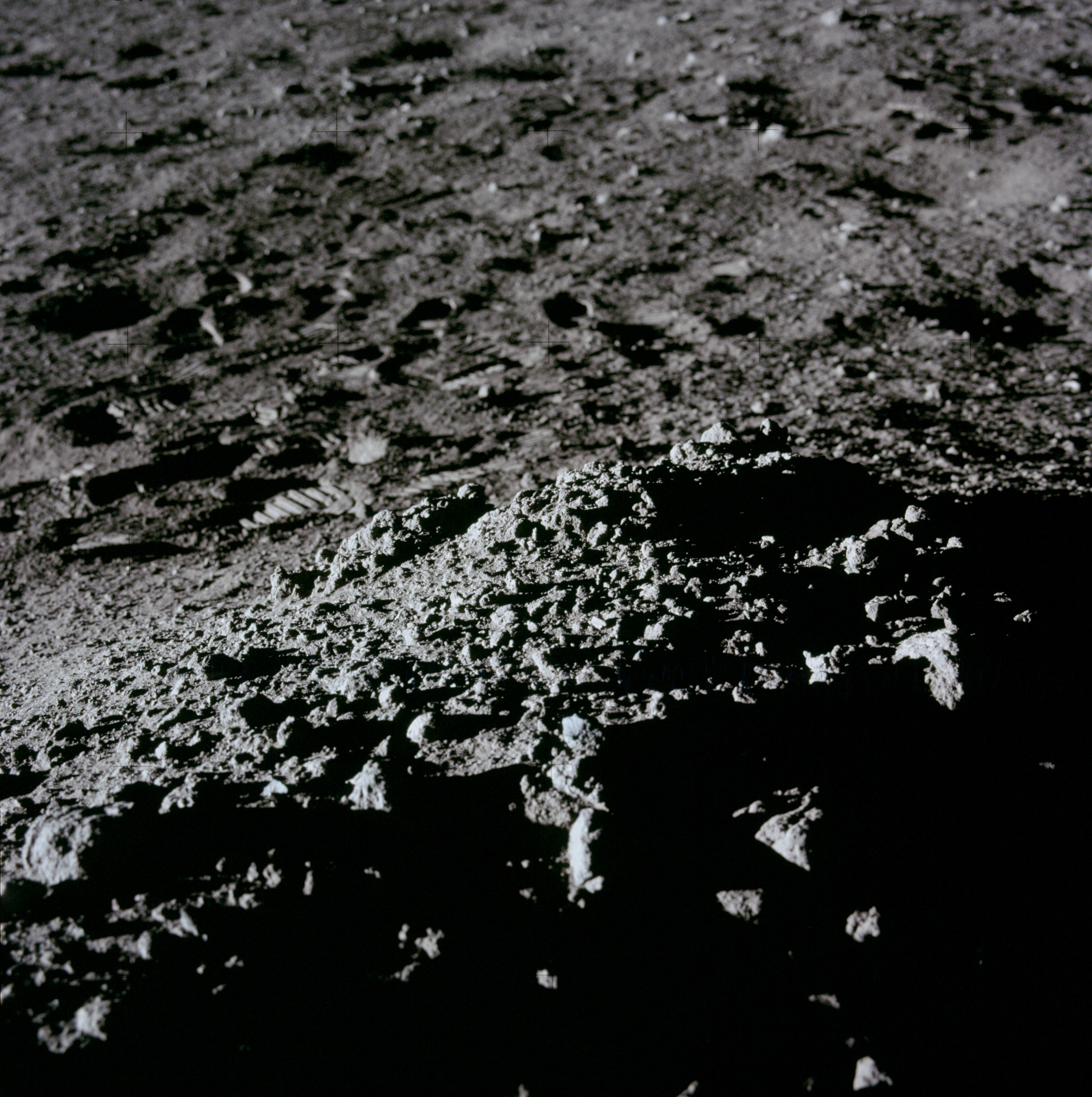 We have begun adding scans of the original film. These scans are being done by NASA Johnson, with some post-processing by Kipp Teague. The film is scanned at 4096 x 4096 pixels per image. (See a discussion from Arizona State University about the scanning process.) Kipp reduces each digital image to approximately 2350 x 2350 pixels (equivalent to 300 dpi) and does minor adjustments of levels to ensure that (1) brightly lit areas of lunar soil are neutral grey, (2) objects with known colors (such as the CDR stripes or the LCRU blankets) look right, and (3) information in bright or dark areas is not lost. These images from original film are indicated by the notation 'OF300' in the image description. In each case, a 900 x 900 pixel version is also provided.