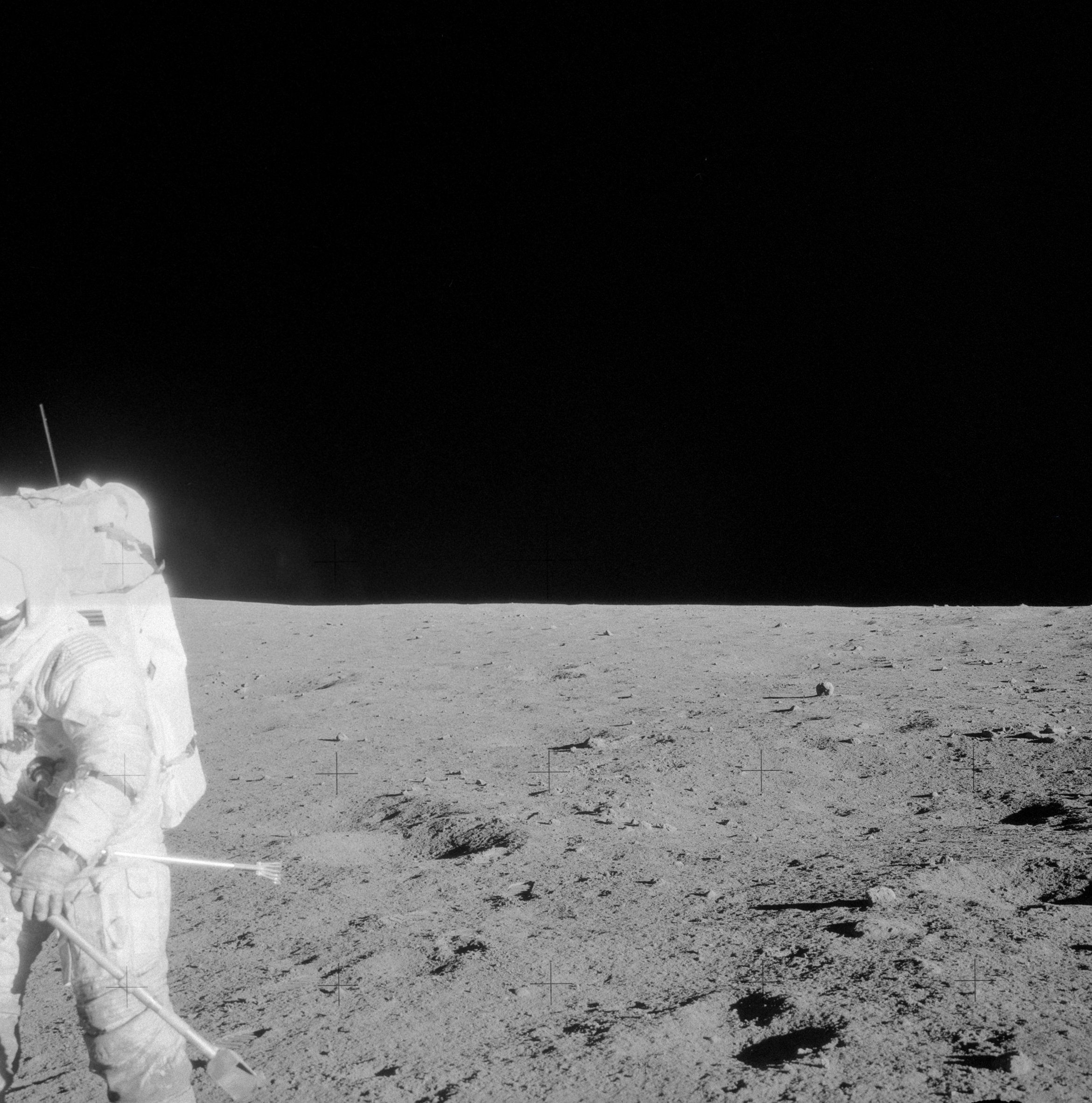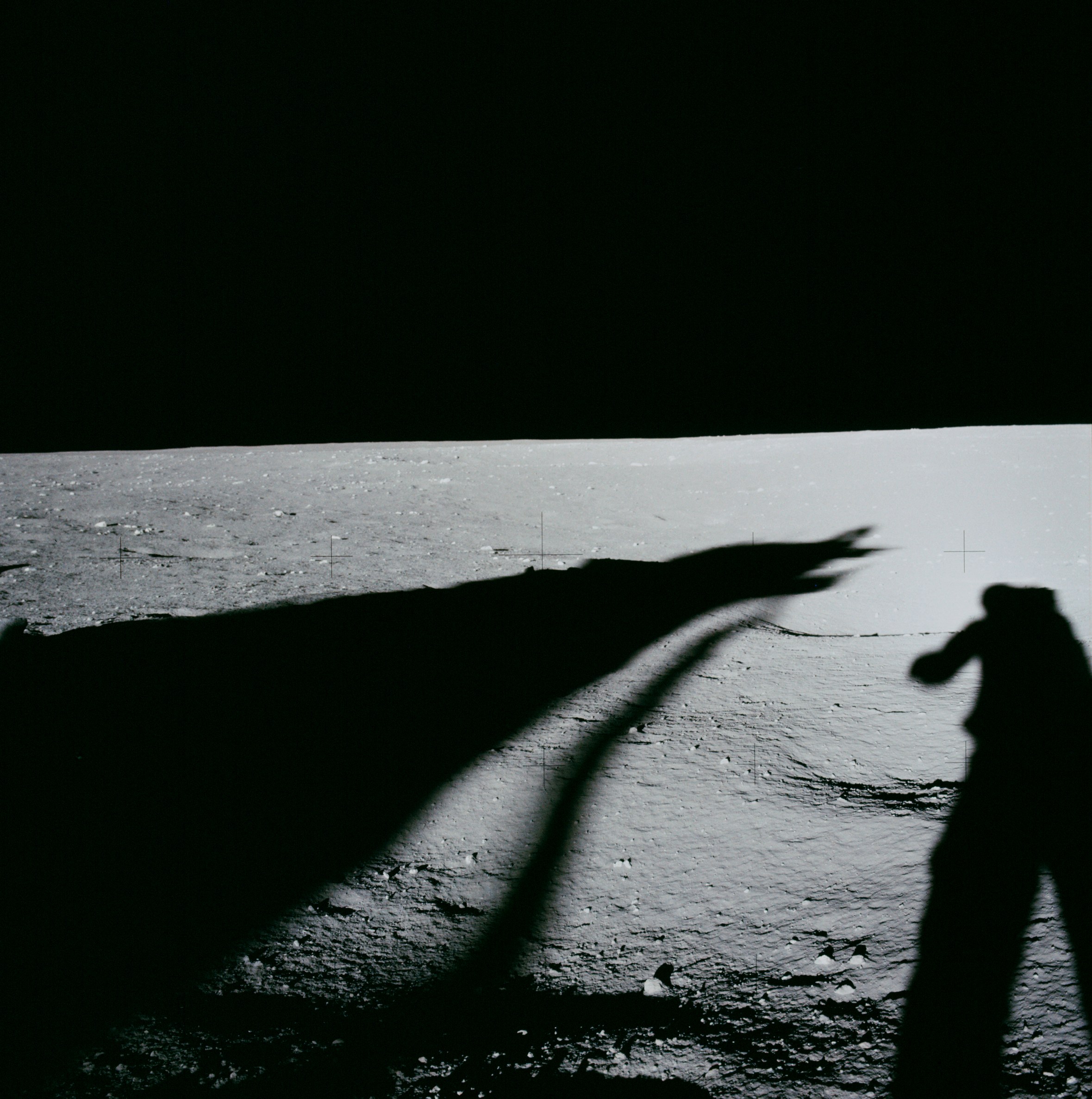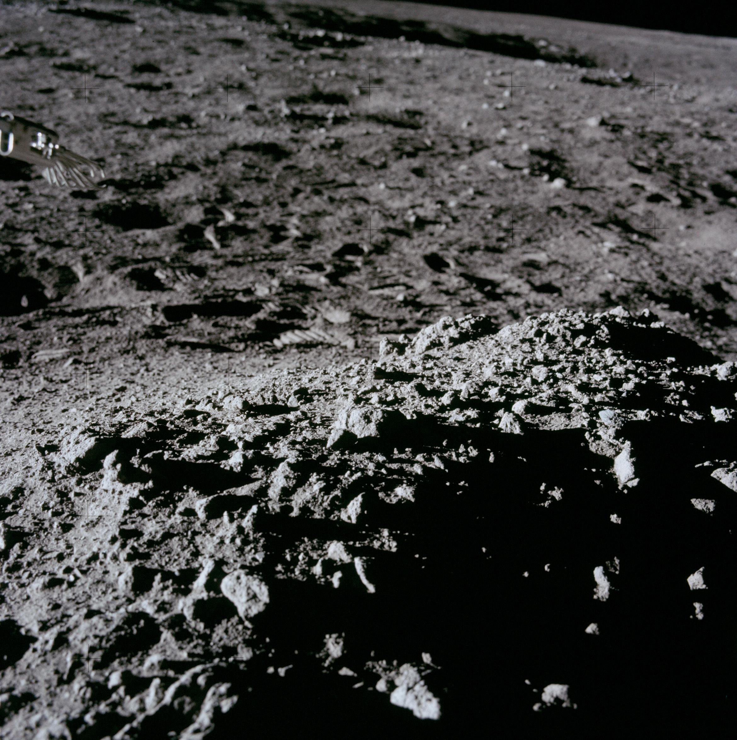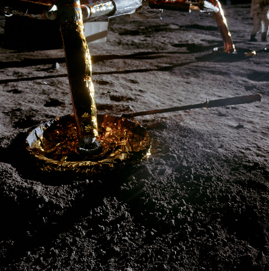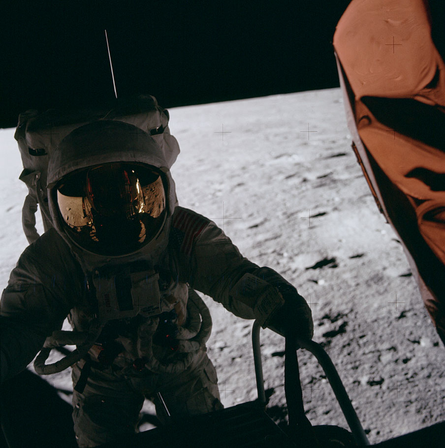 We have begun adding scans of the original film. These scans are being done by NASA Johnson, with some post-processing by Kipp Teague. The film is scanned at 4096 x 4096 pixels per image. (See a discussion from Arizona State University about the scanning process.) Kipp reduces each digital image to approximately 2350 x 2350 pixels (equivalent to 300 dpi) and does minor adjustments of levels to ensure that (1) brightly lit areas of lunar soil are neutral grey, (2) objects with known colors (such as the CDR stripes or the LCRU blankets) look right, and (3) information in bright or dark areas is not lost. These images from original film are indicated by the notation 'OF300' in the image description. In each case, a 900 x 900 pixel version is also provided.