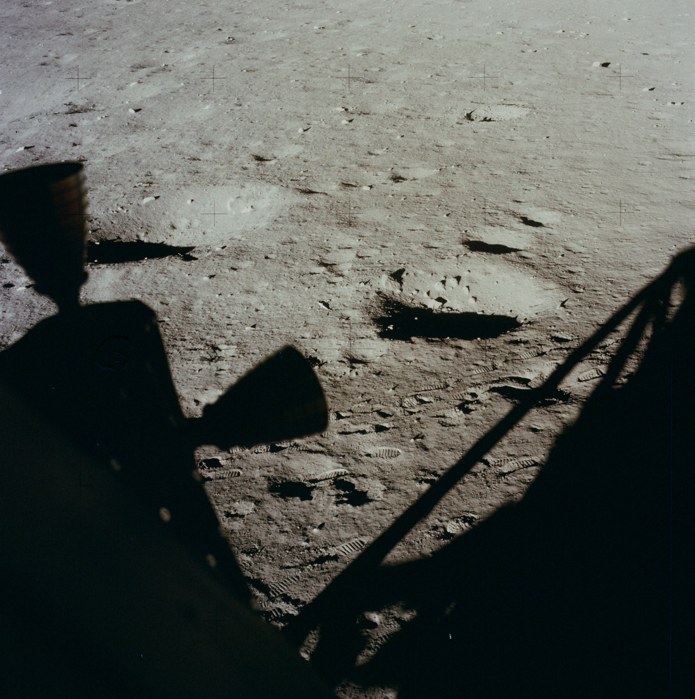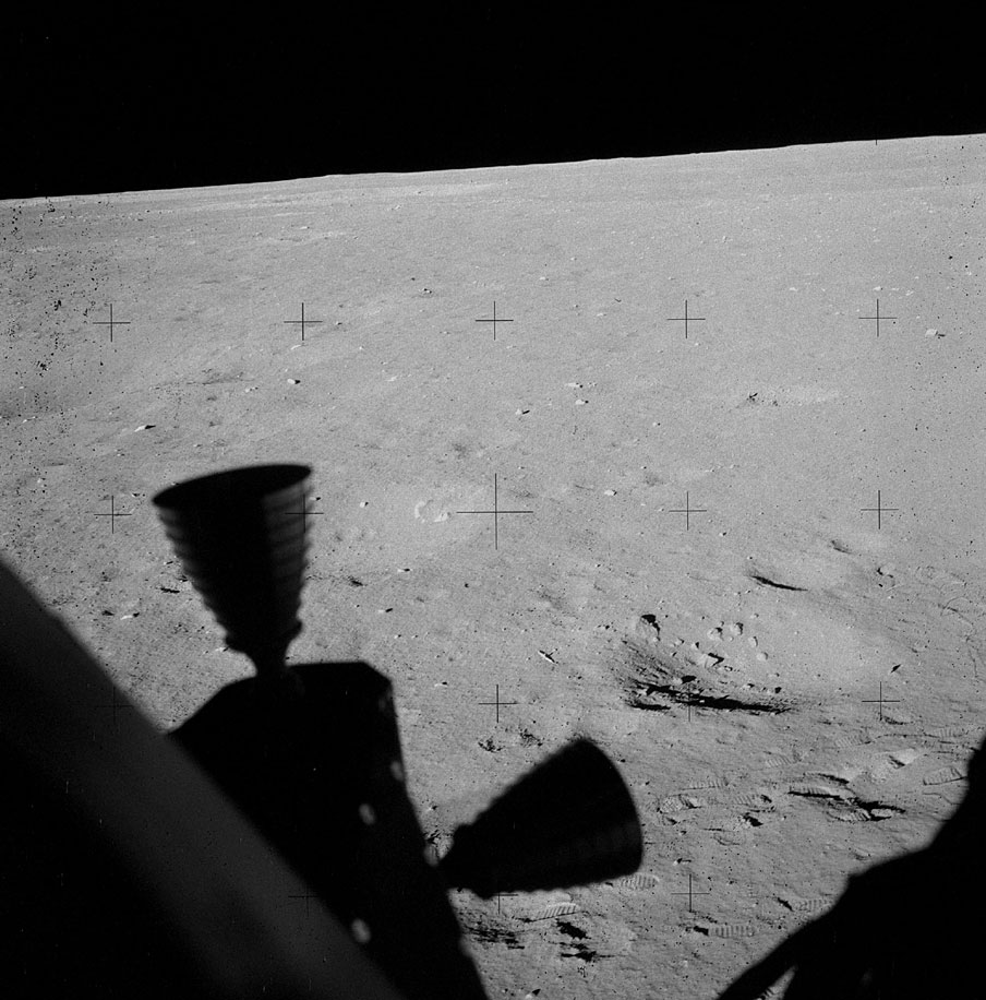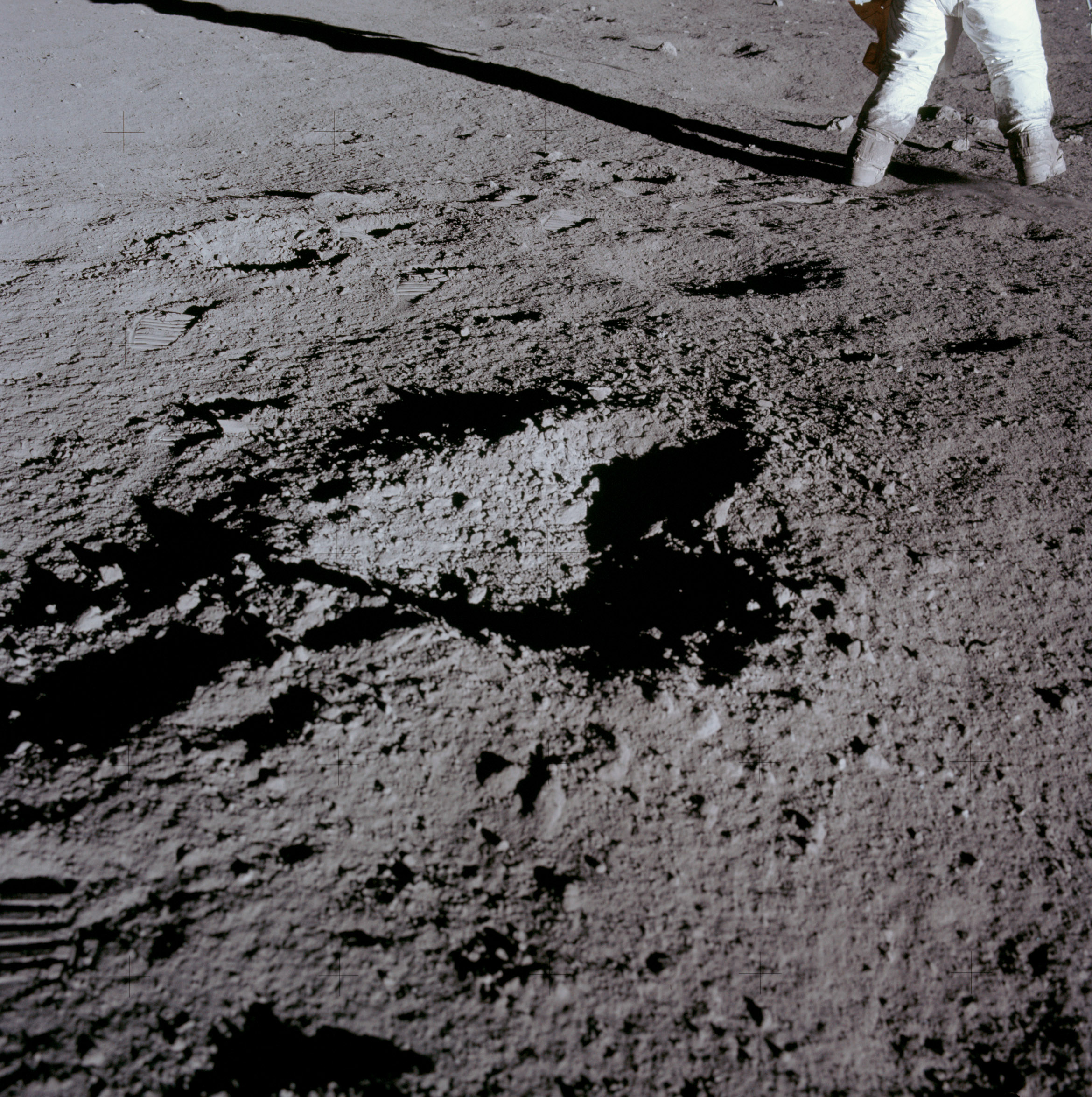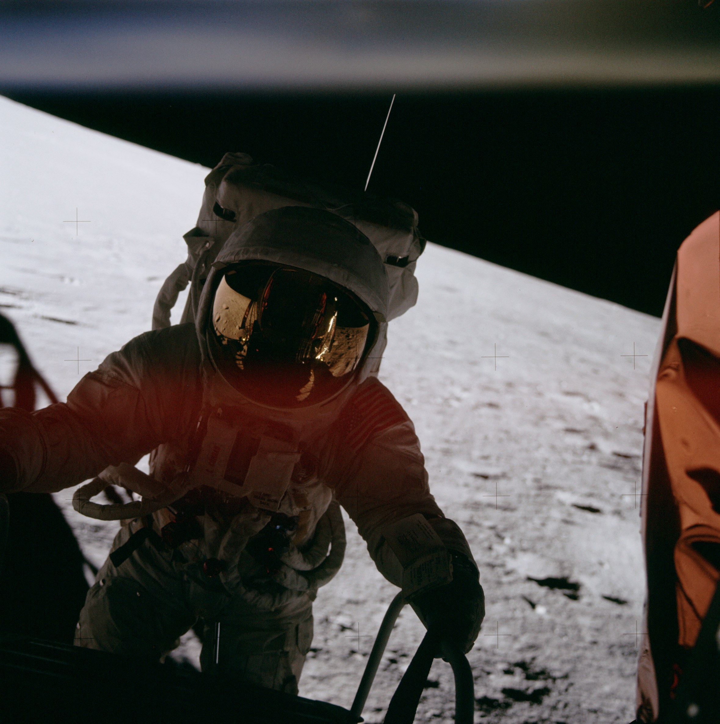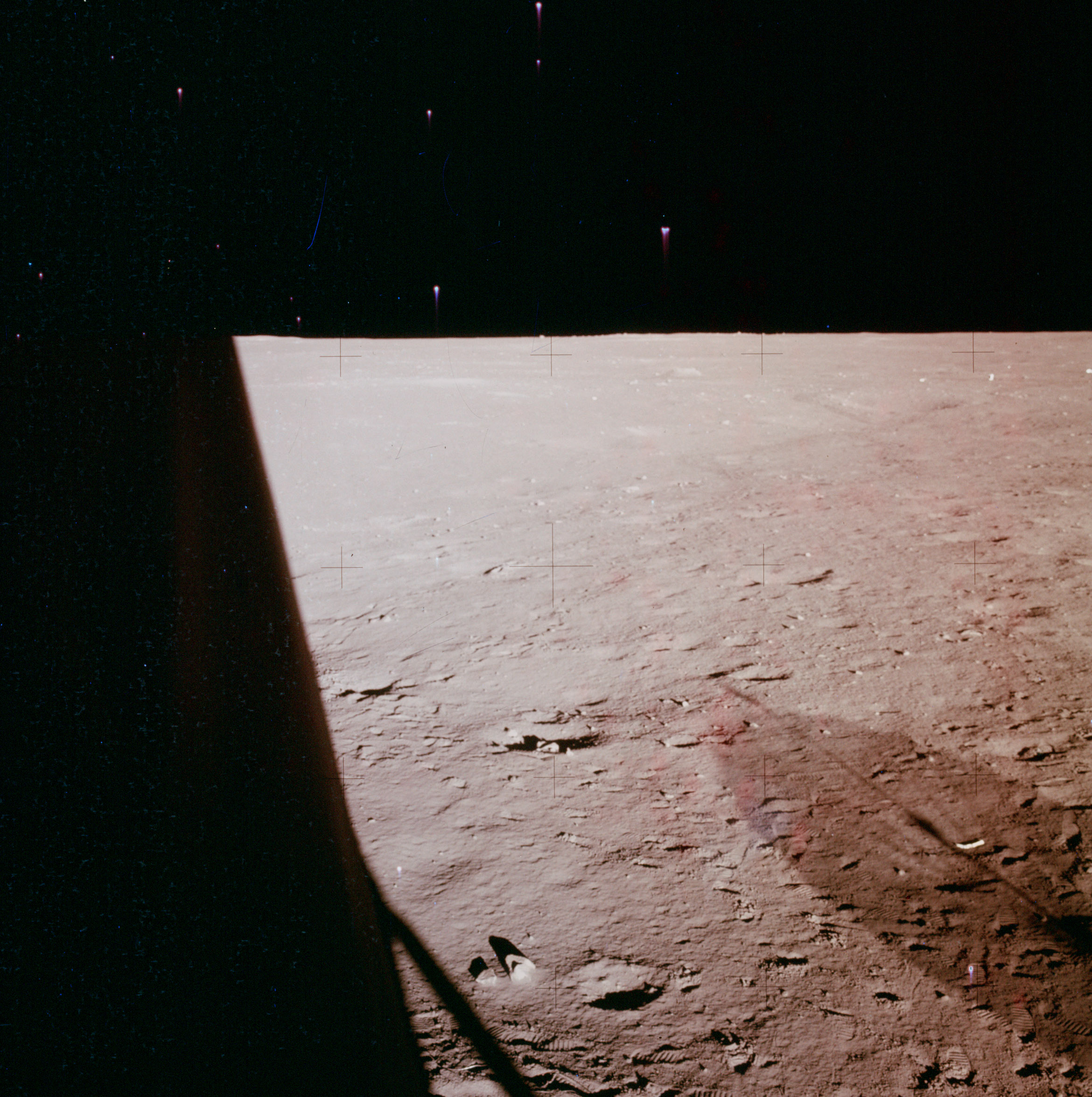 We have begun adding scans of the original film. These scans are being done by NASA Johnson, with some post-processing by Kipp Teague. The film is scanned at 4096 x 4096 pixels per image. (See a discussion from Arizona State University about the scanning process.) Kipp reduces each digital image to approximately 2350 x 2350 pixels (equivalent to 300 dpi) and does minor adjustments of levels to ensure that (1) brightly lit areas of lunar soil are neutral grey, (2) objects with known colors (such as the CDR stripes or the LCRU blankets) look right, and (3) information in bright or dark areas is not lost. These images from original film are indicated by the notation 'OF300' in the image description. In each case, a 900 x 900 pixel version is also provided.