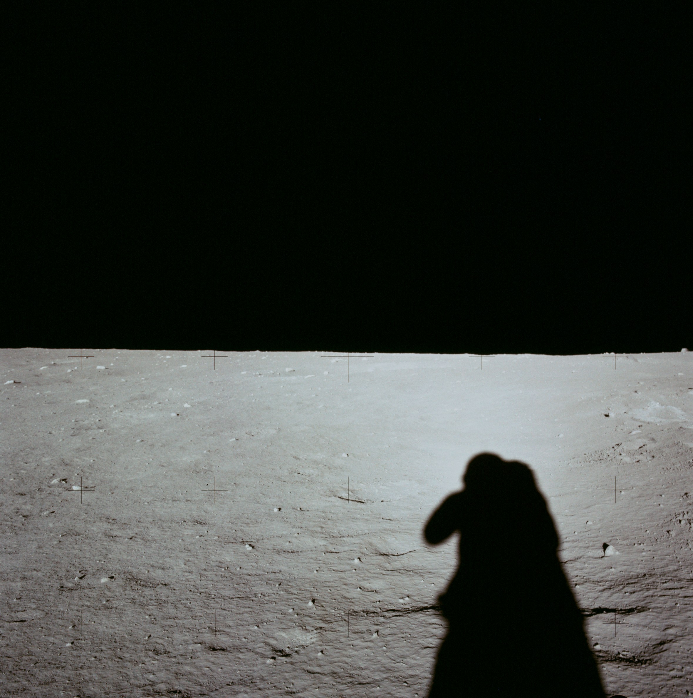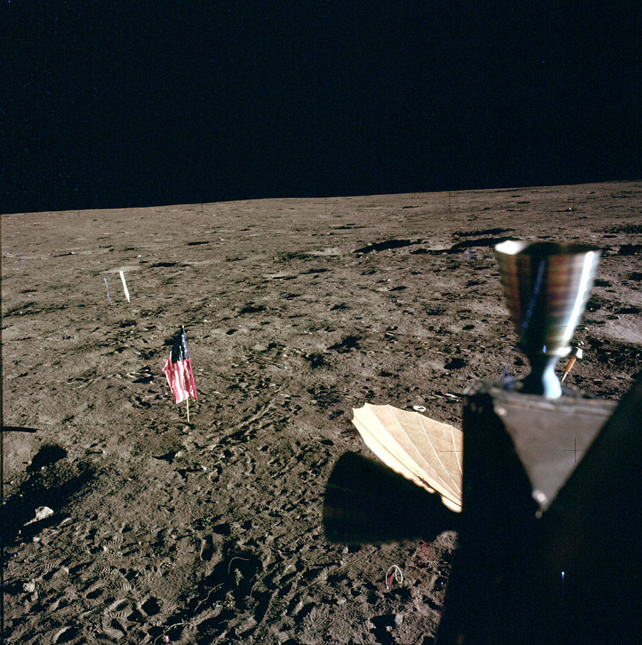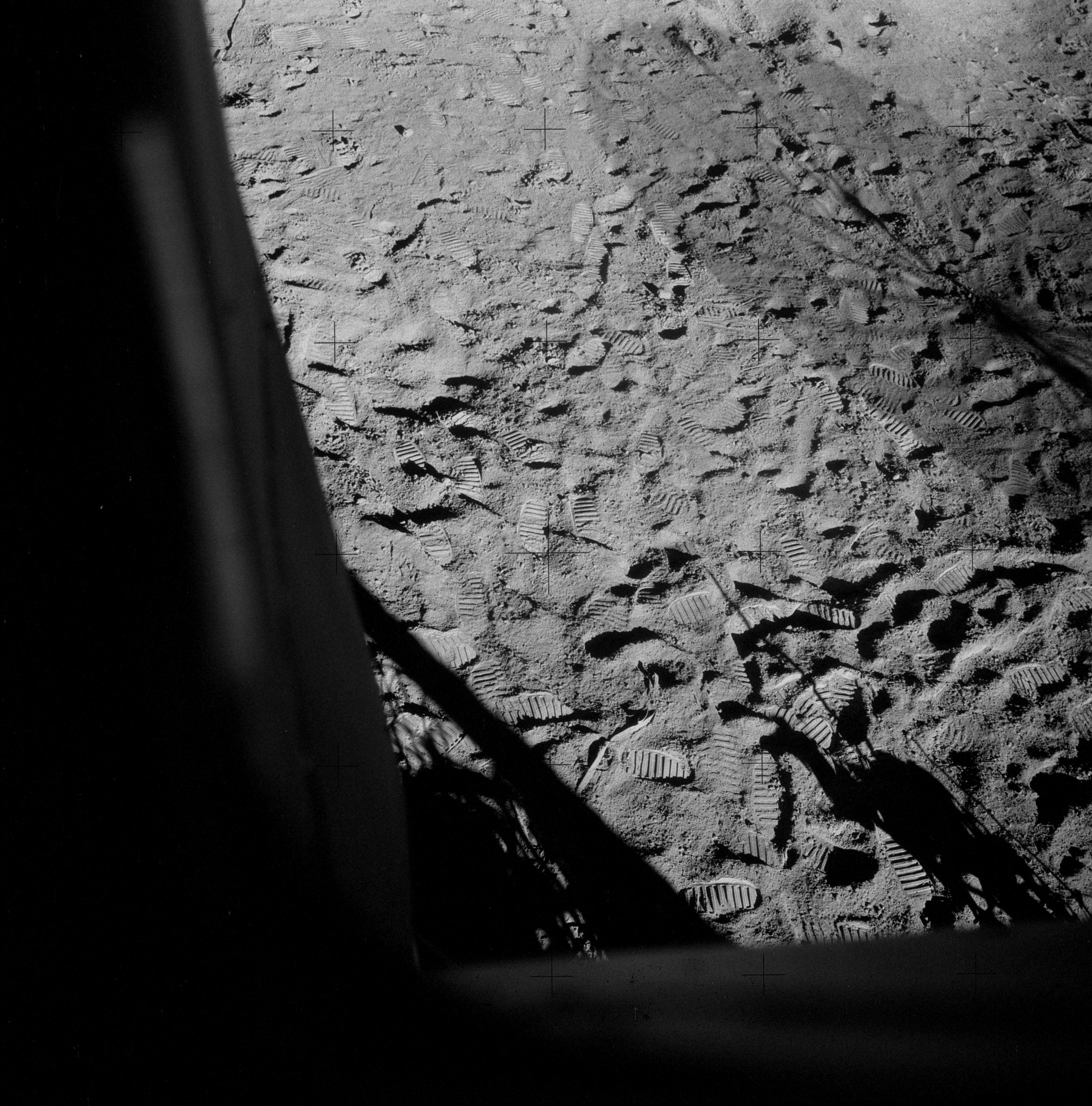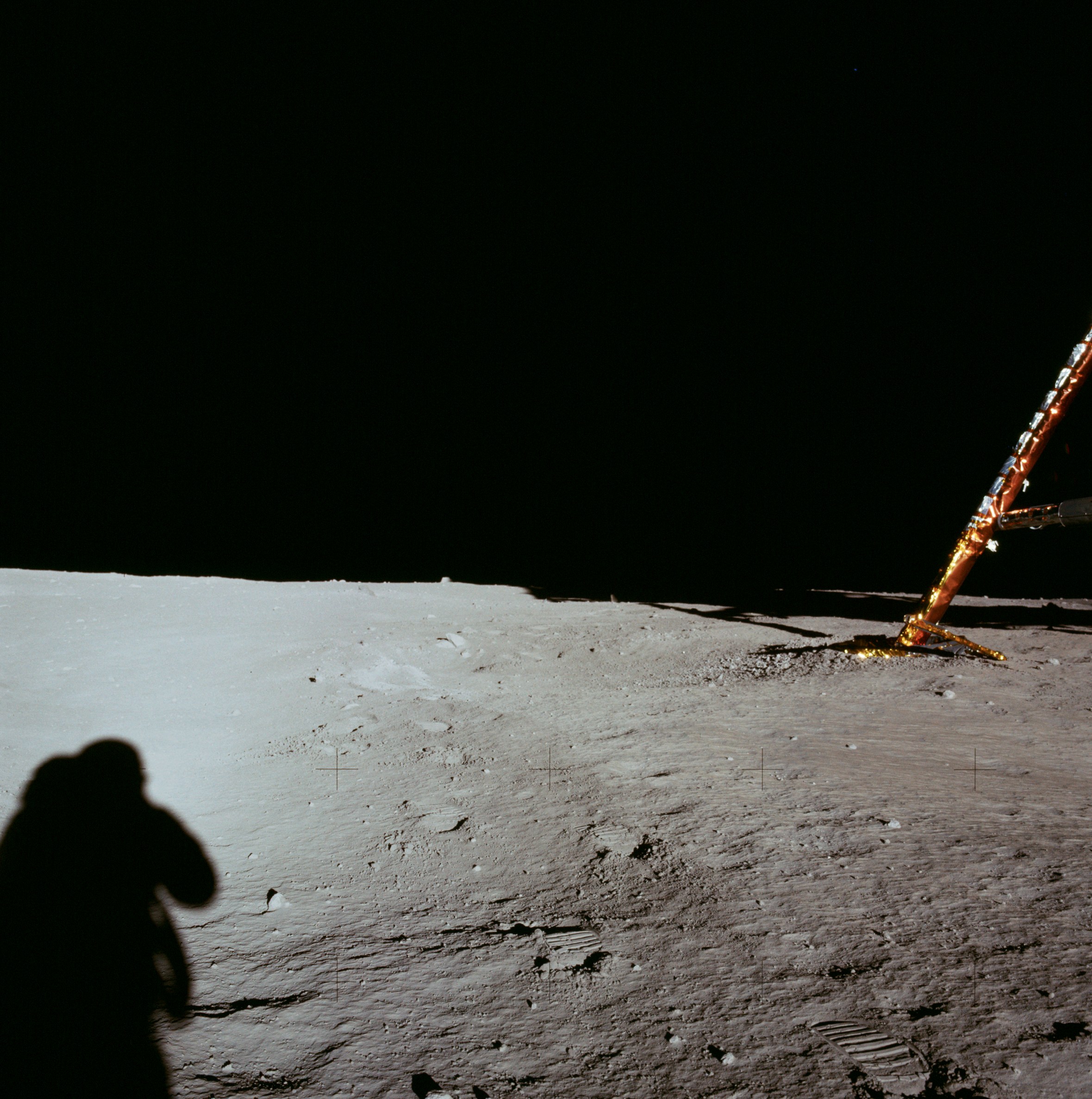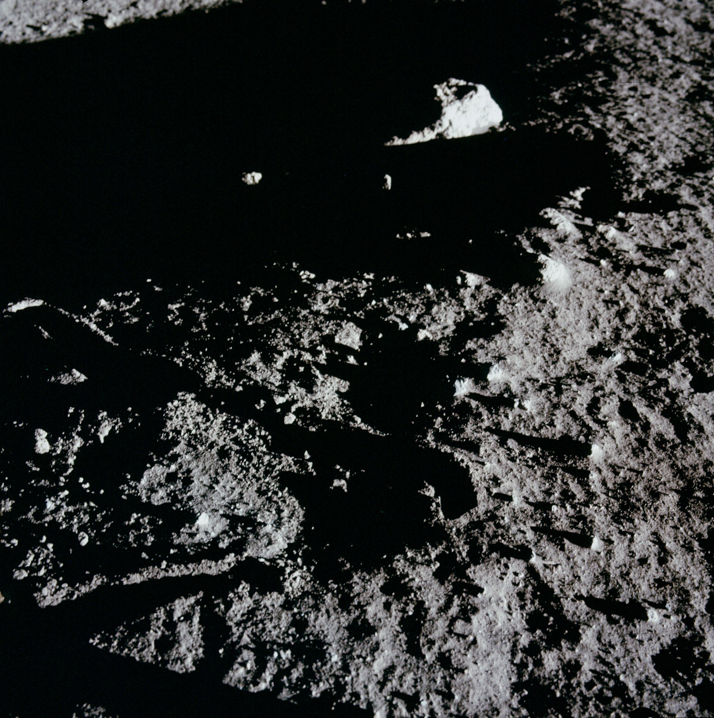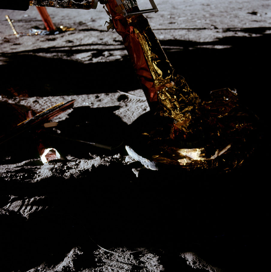 We have begun adding scans of the original film. These scans are being done by NASA Johnson, with some post-processing by Kipp Teague. The film is scanned at 4096 x 4096 pixels per image. (See a discussion from Arizona State University about the scanning process.) Kipp reduces each digital image to approximately 2350 x 2350 pixels (equivalent to 300 dpi) and does minor adjustments of levels to ensure that (1) brightly lit areas of lunar soil are neutral grey, (2) objects with known colors (such as the CDR stripes or the LCRU blankets) look right, and (3) information in bright or dark areas is not lost. These images from original film are indicated by the notation 'OF300' in the image description. In each case, a 900 x 900 pixel version is also provided.