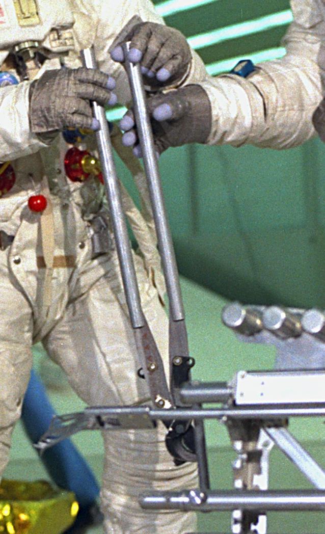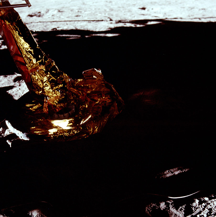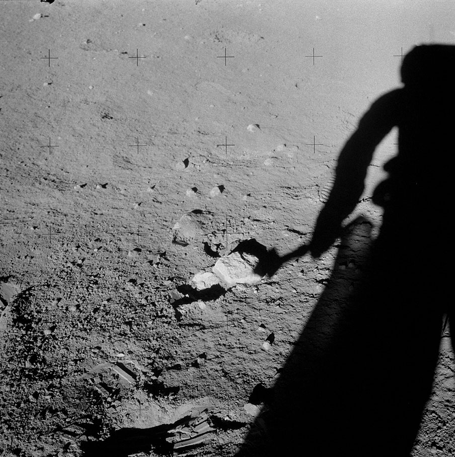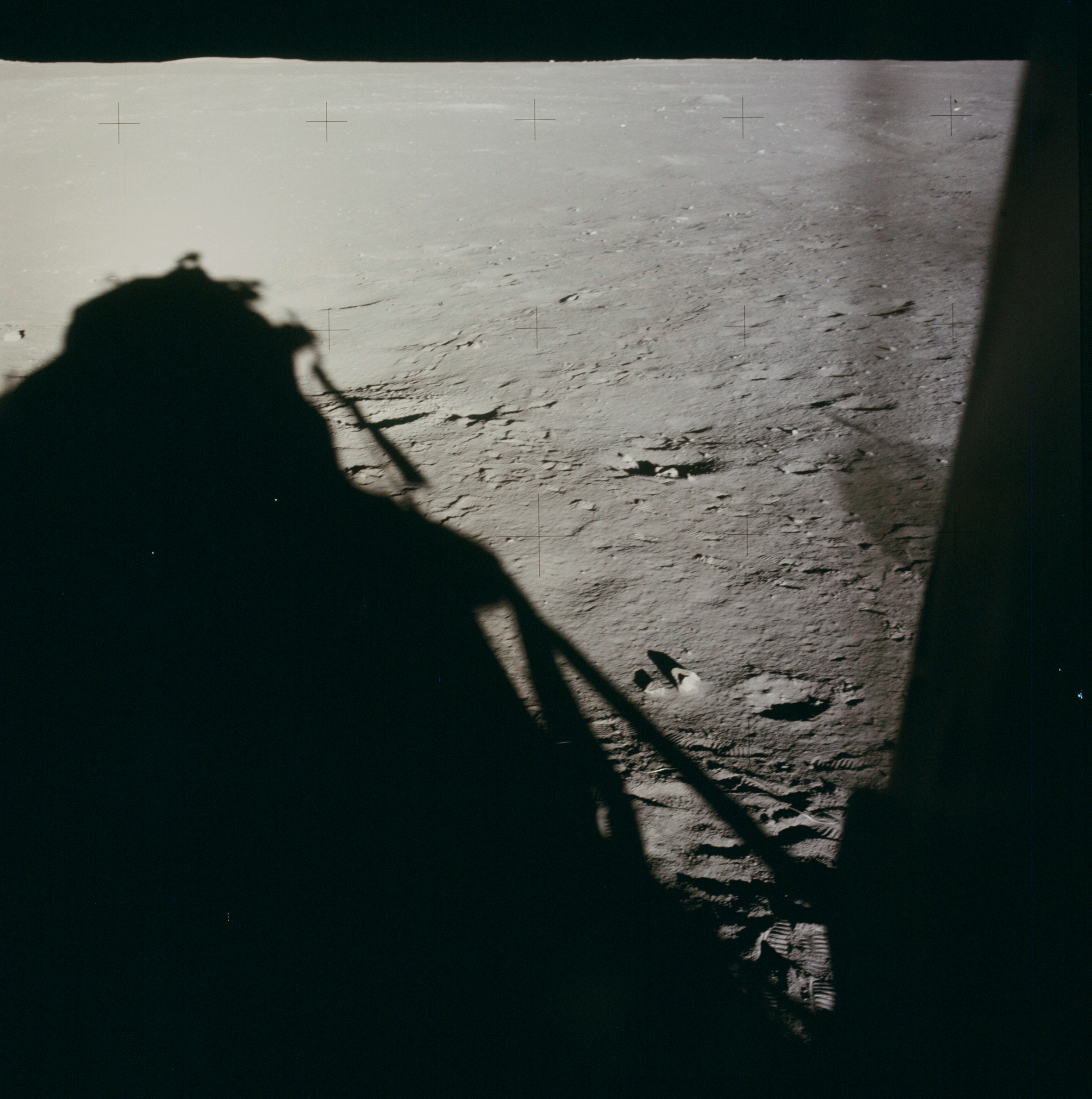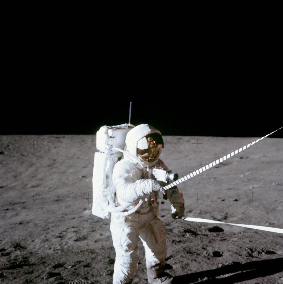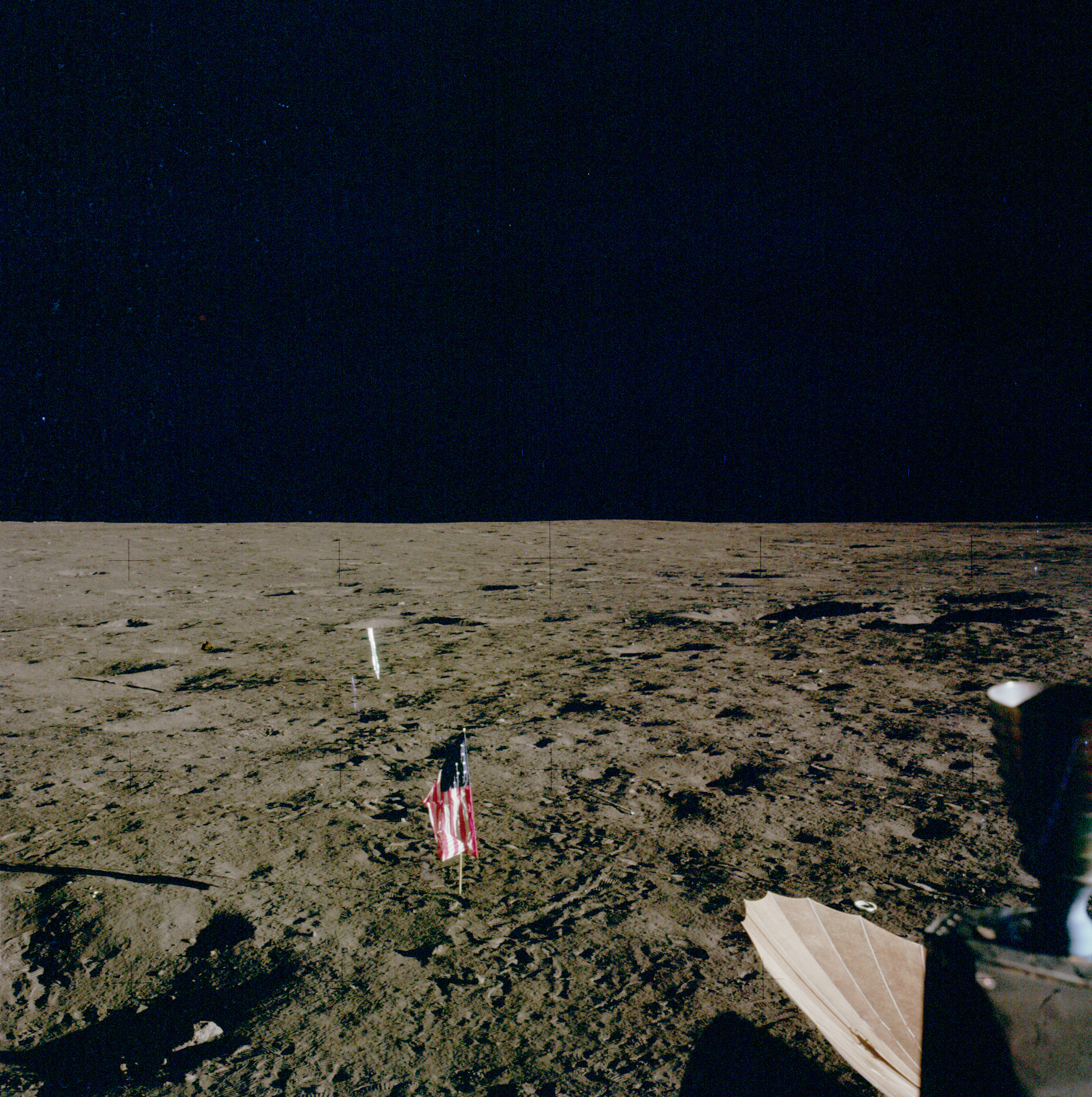 We have begun adding scans of the original film. These scans are being done by NASA Johnson, with some post-processing by Kipp Teague. The film is scanned at 4096 x 4096 pixels per image. (See a discussion from Arizona State University about the scanning process.) Kipp reduces each digital image to approximately 2350 x 2350 pixels (equivalent to 300 dpi) and does minor adjustments of levels to ensure that (1) brightly lit areas of lunar soil are neutral grey, (2) objects with known colors (such as the CDR stripes or the LCRU blankets) look right, and (3) information in bright or dark areas is not lost. These images from original film are indicated by the notation 'OF300' in the image description. In each case, a 900 x 900 pixel version is also provided.