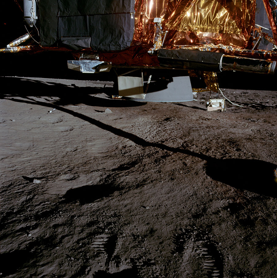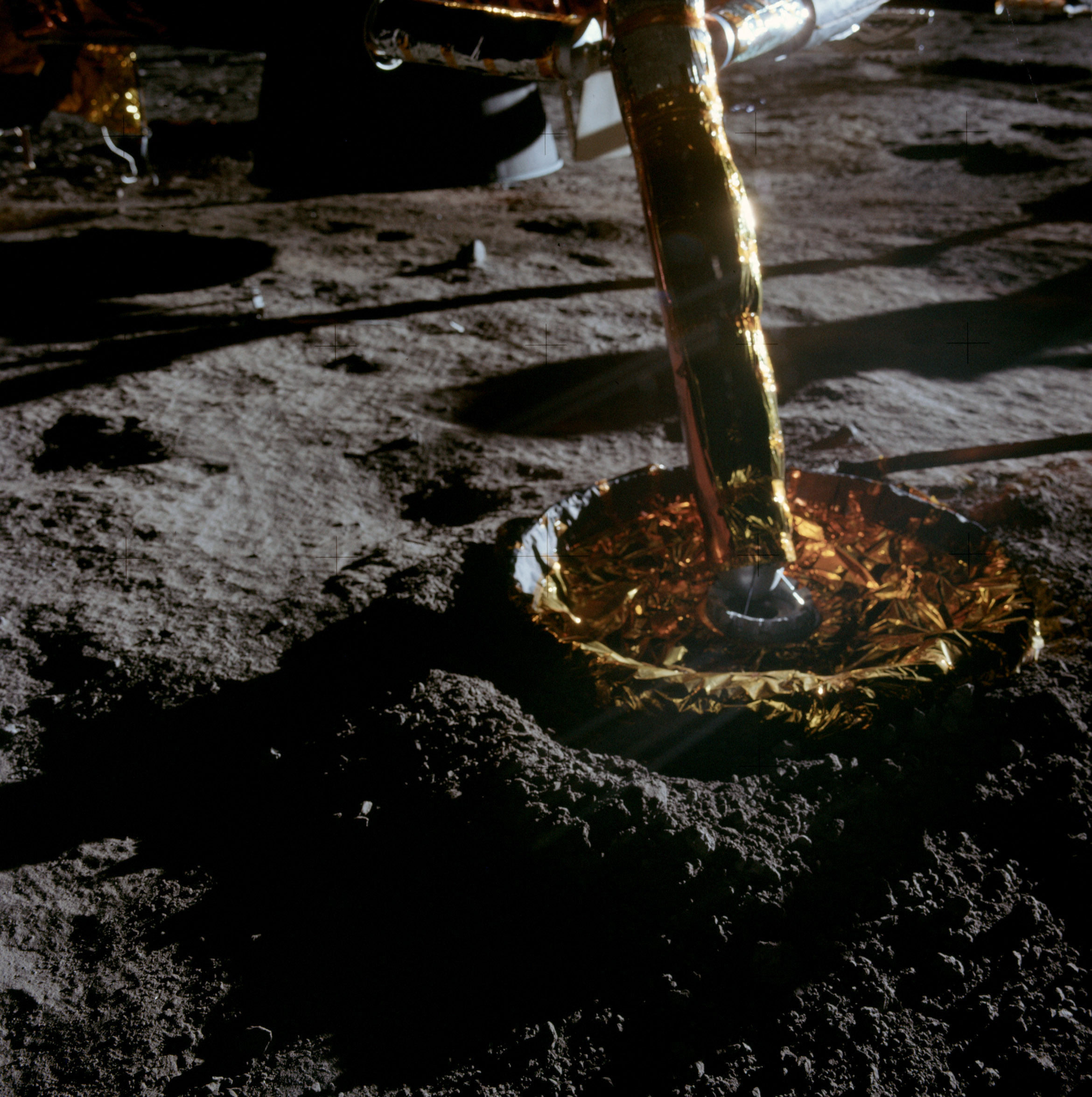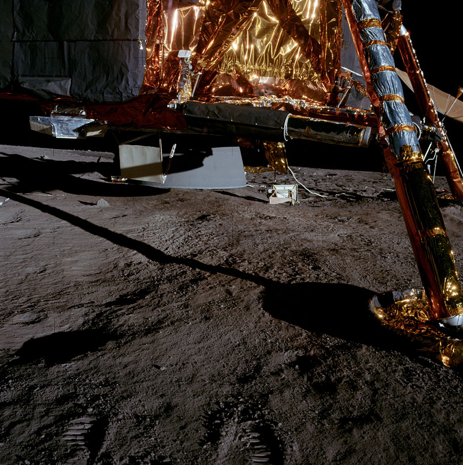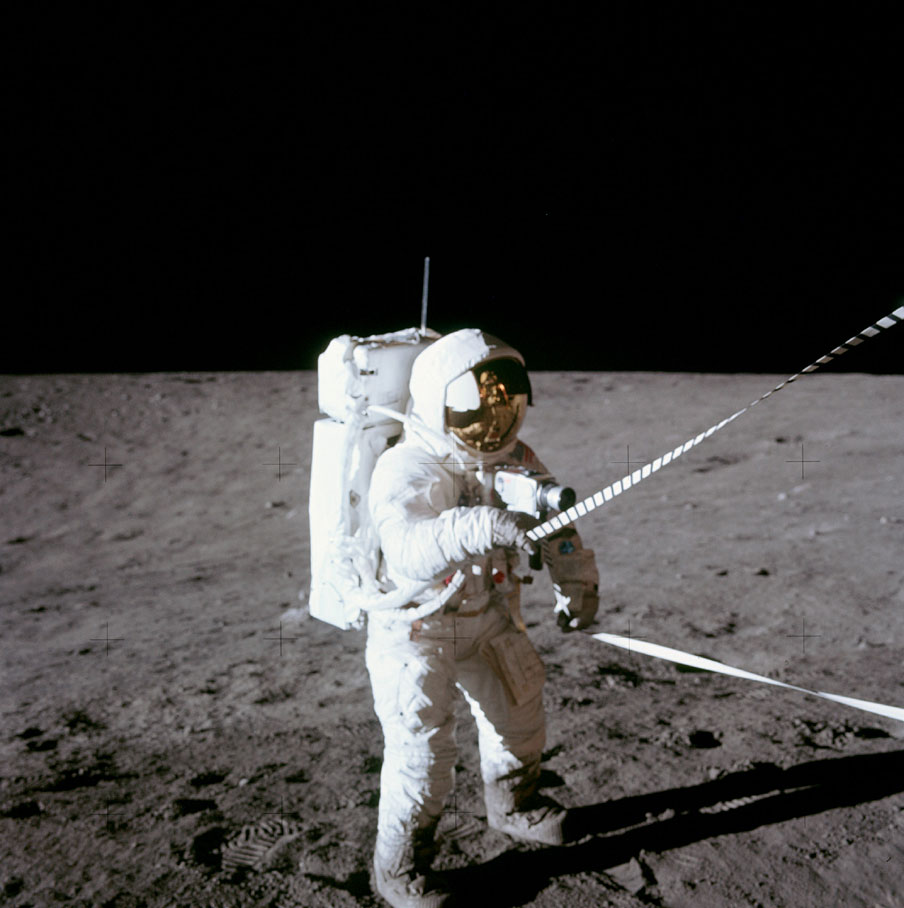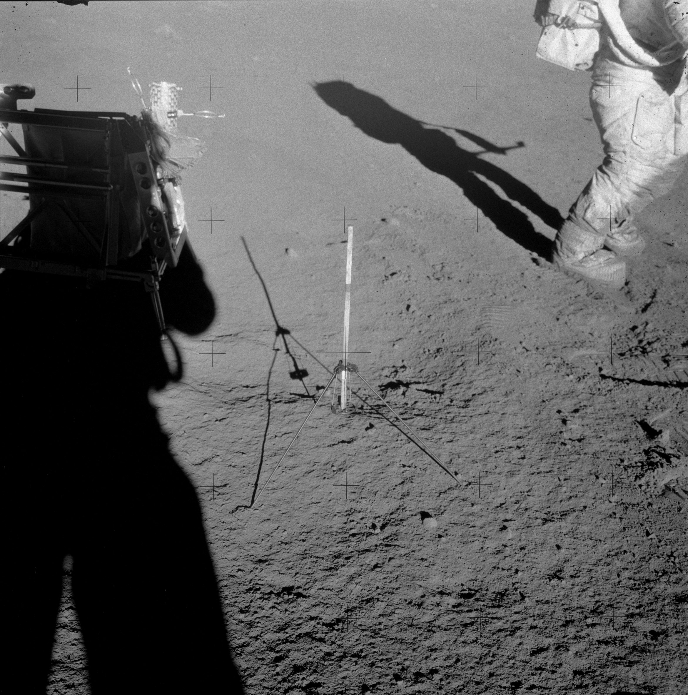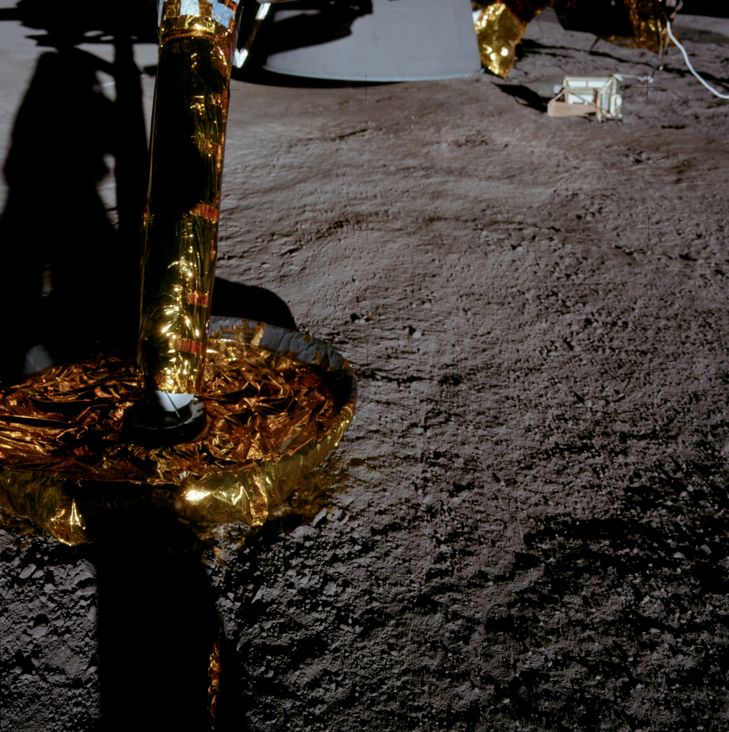 We have begun adding scans of the original film. These scans are being done by NASA Johnson, with some post-processing by Kipp Teague. The film is scanned at 4096 x 4096 pixels per image. (See a discussion from Arizona State University about the scanning process.) Kipp reduces each digital image to approximately 2350 x 2350 pixels (equivalent to 300 dpi) and does minor adjustments of levels to ensure that (1) brightly lit areas of lunar soil are neutral grey, (2) objects with known colors (such as the CDR stripes or the LCRU blankets) look right, and (3) information in bright or dark areas is not lost. These images from original film are indicated by the notation 'OF300' in the image description. In each case, a 900 x 900 pixel version is also provided.