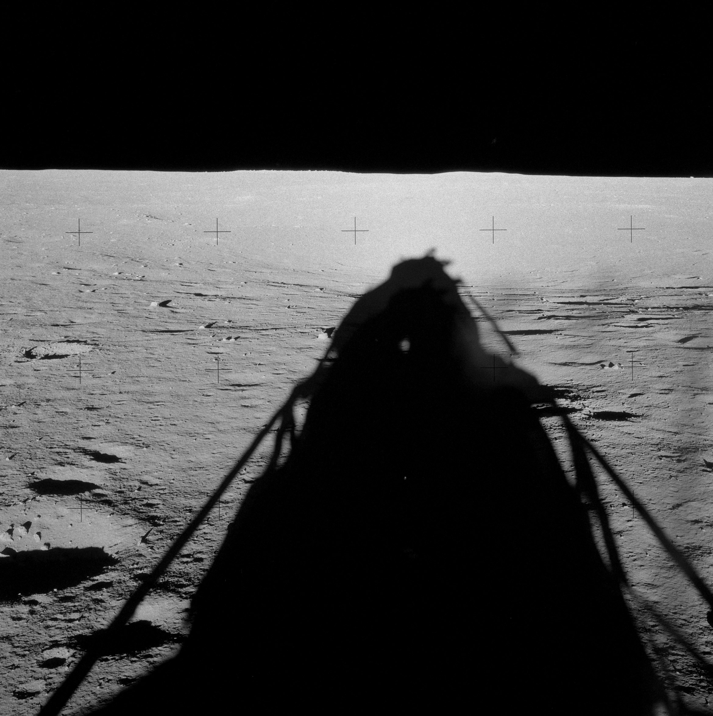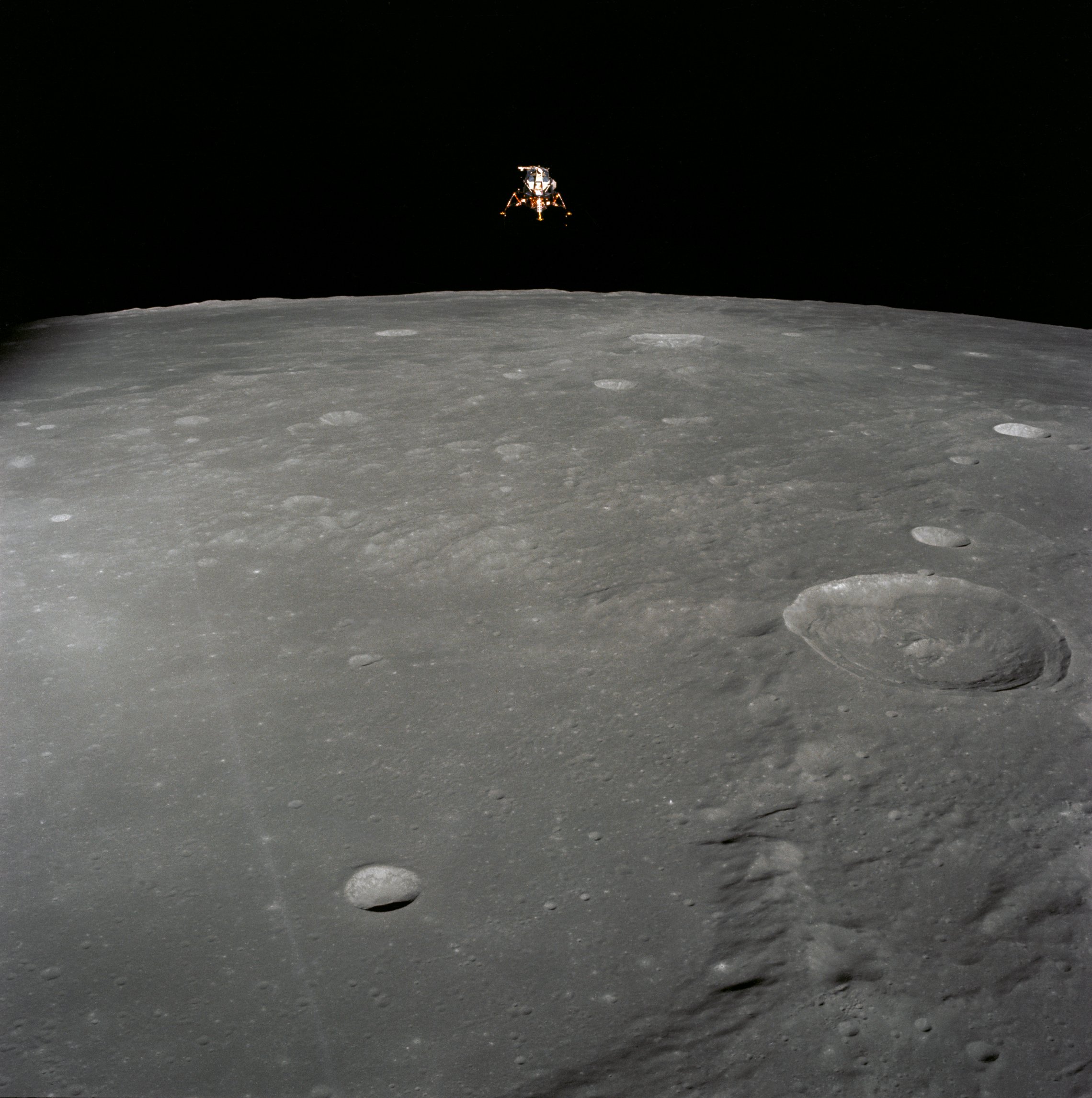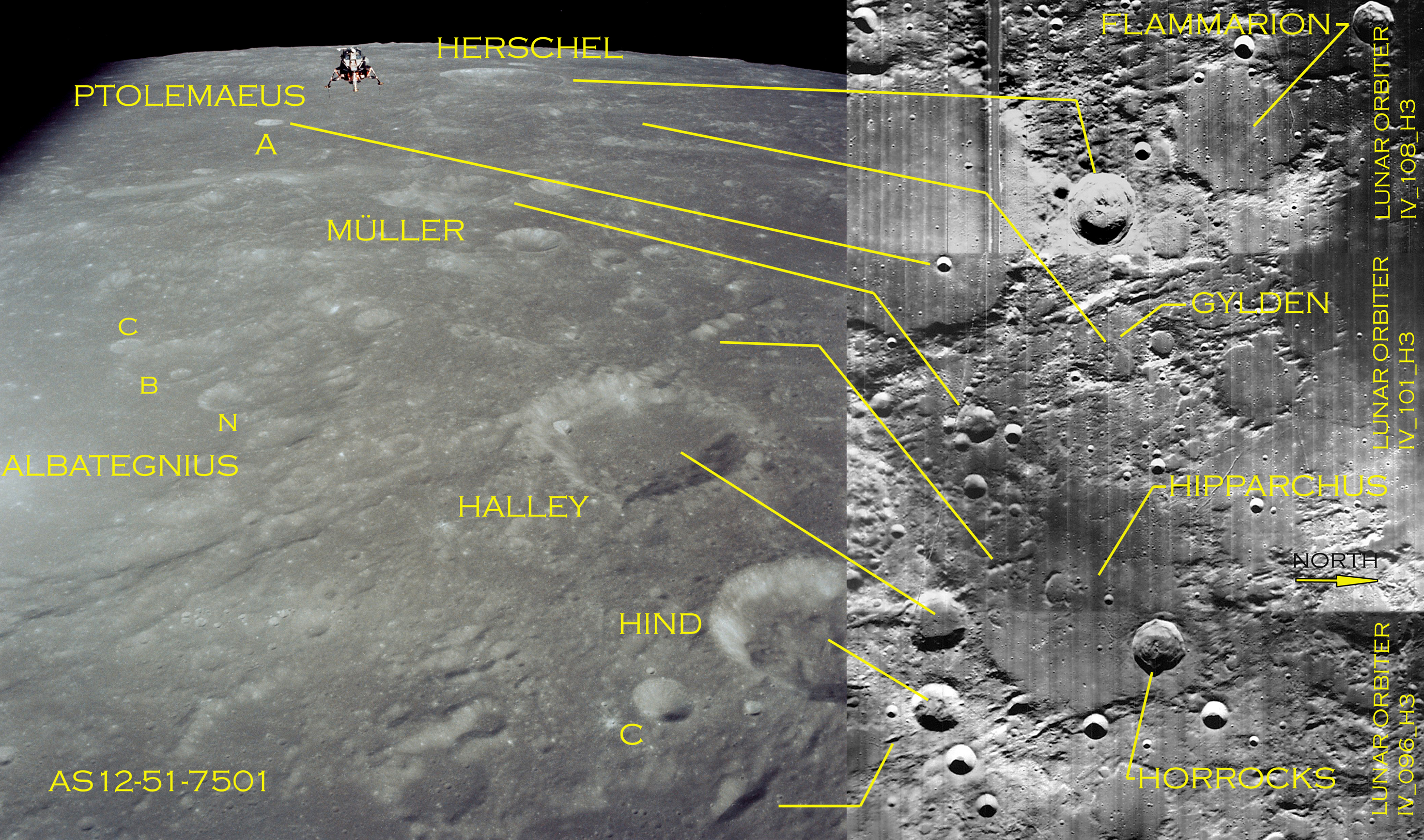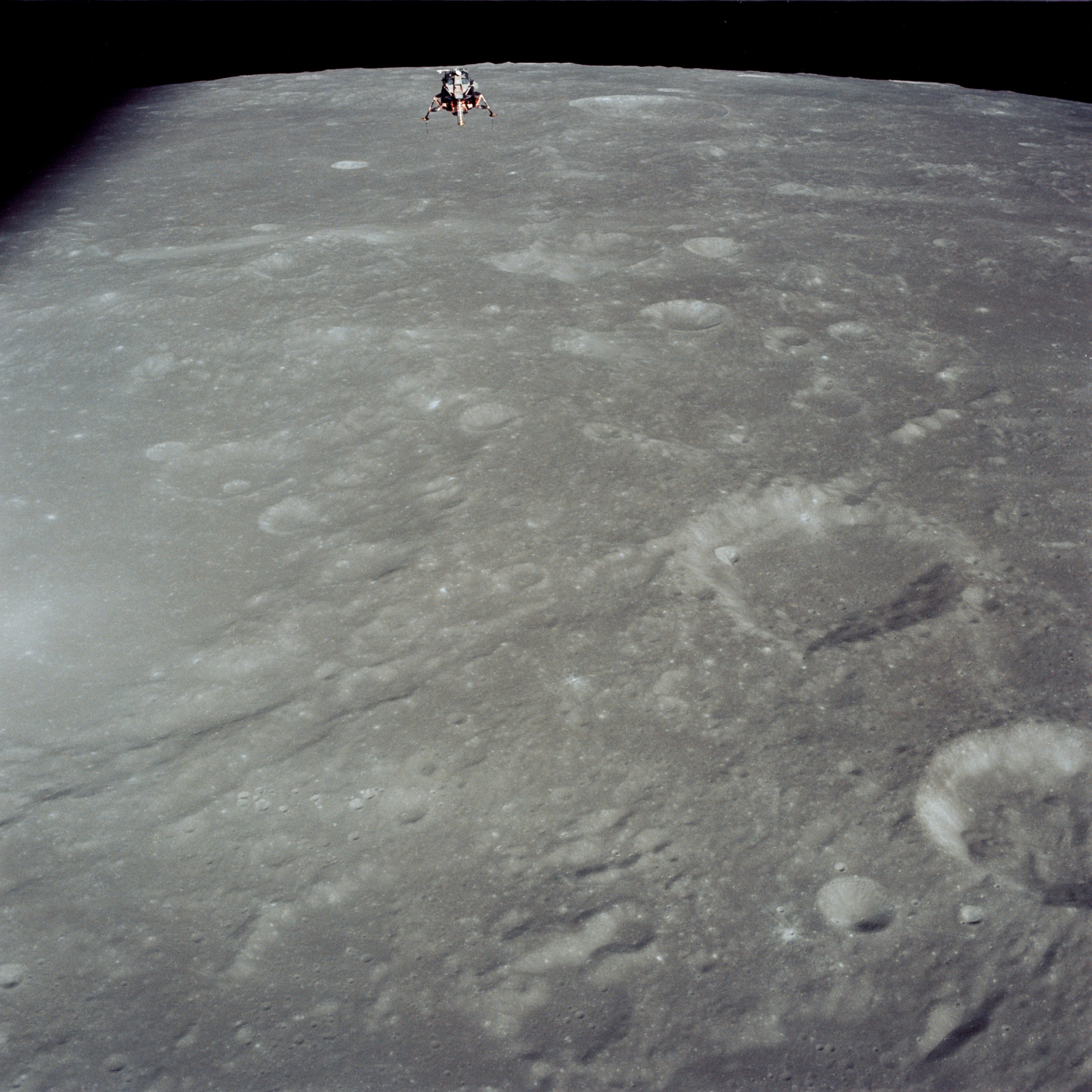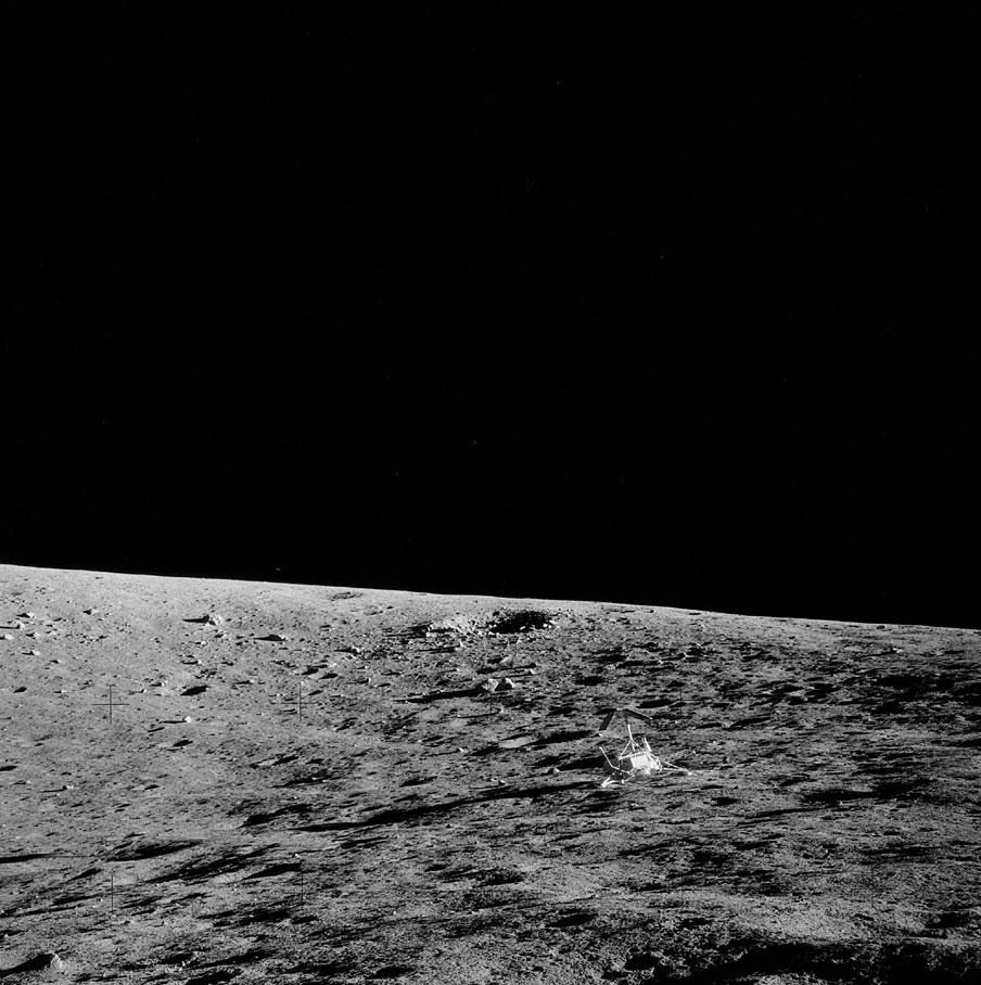 The Apollo 12 Lunar Module, in lunar landing configuration, is photographed in lunar orbit from the Command and Service Modules. Herschel Crater is just to the right of the LM. 19 November 1969. See, also, a labeled version ( 3.4 Mb ) by René Cantin.AS12-51-7507 ( 122k or 635k )