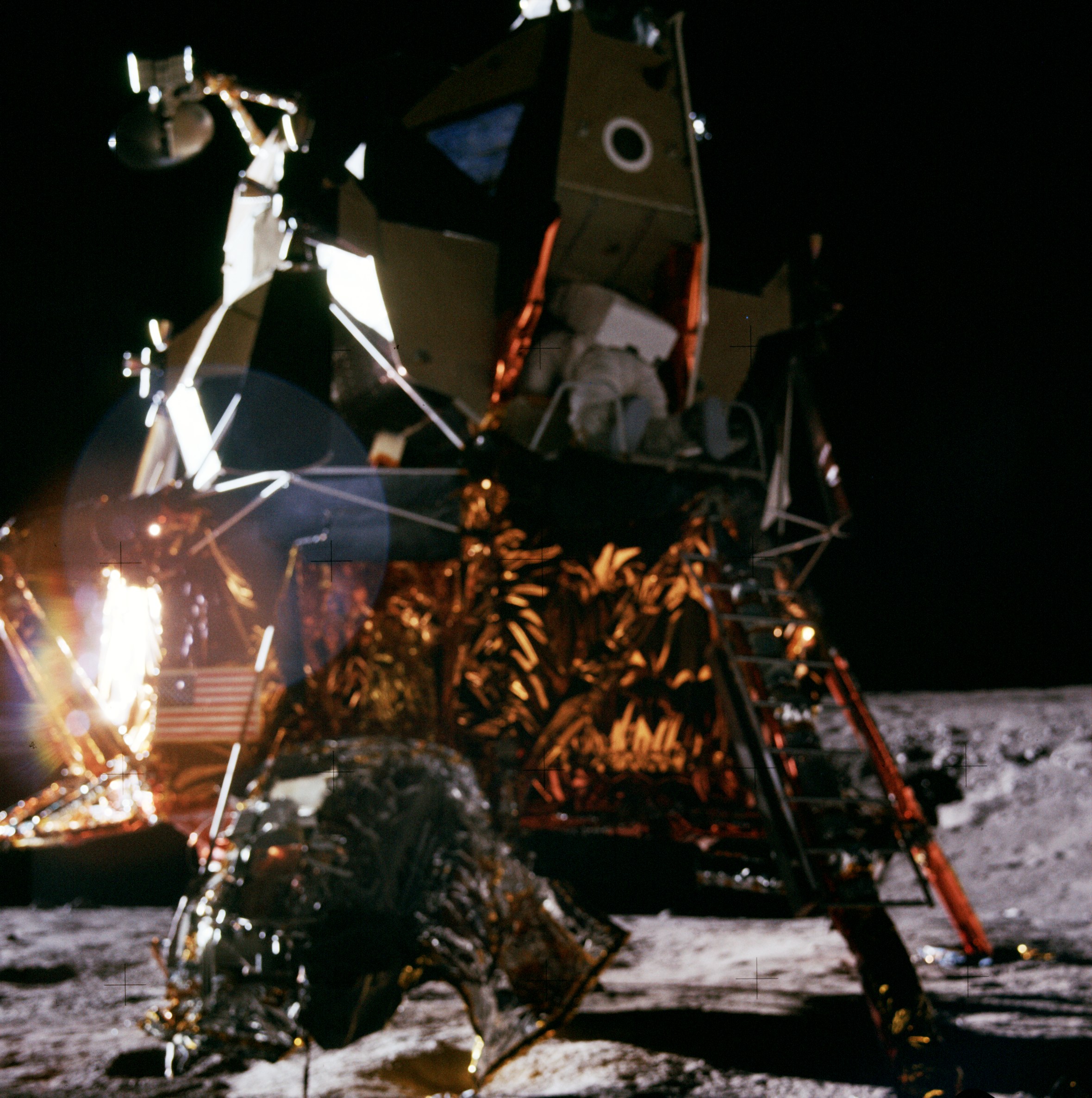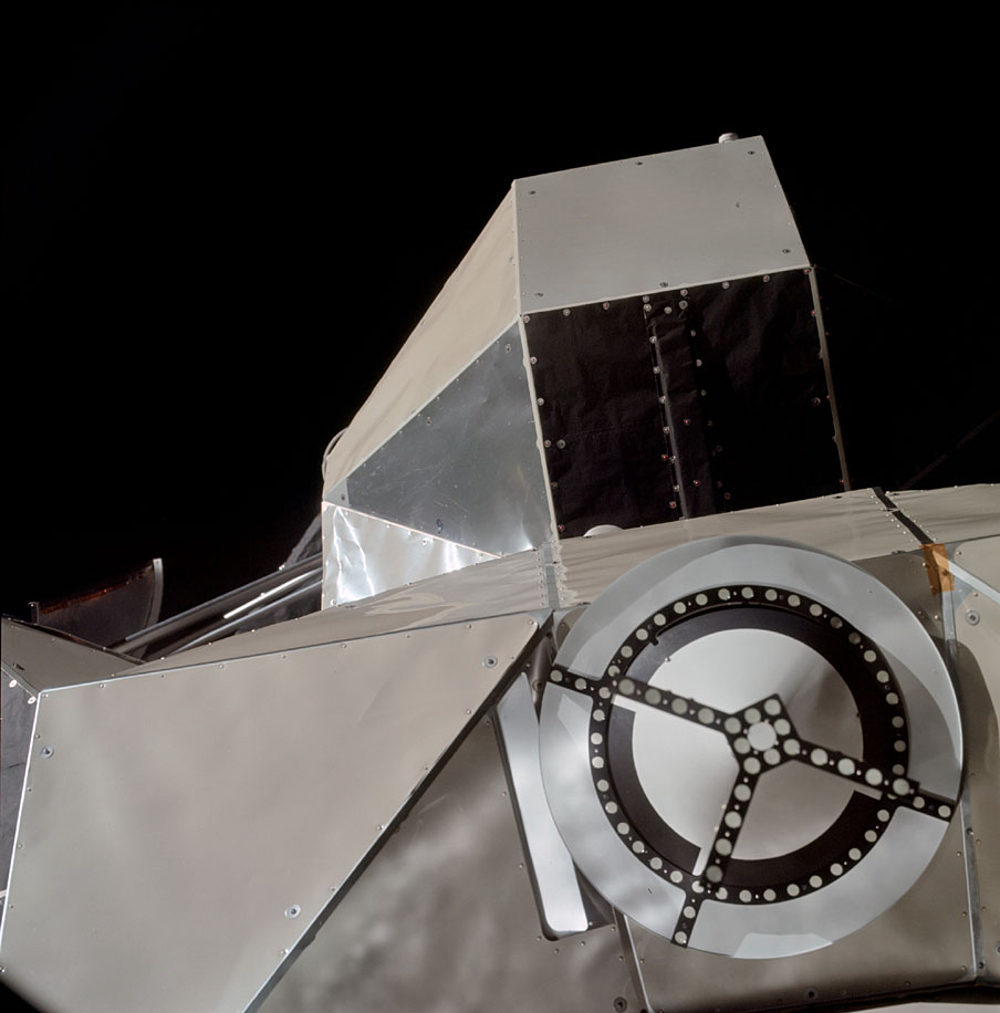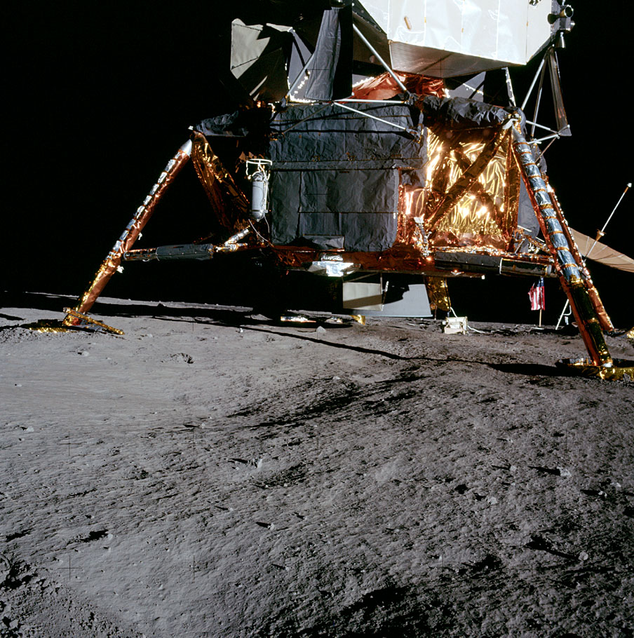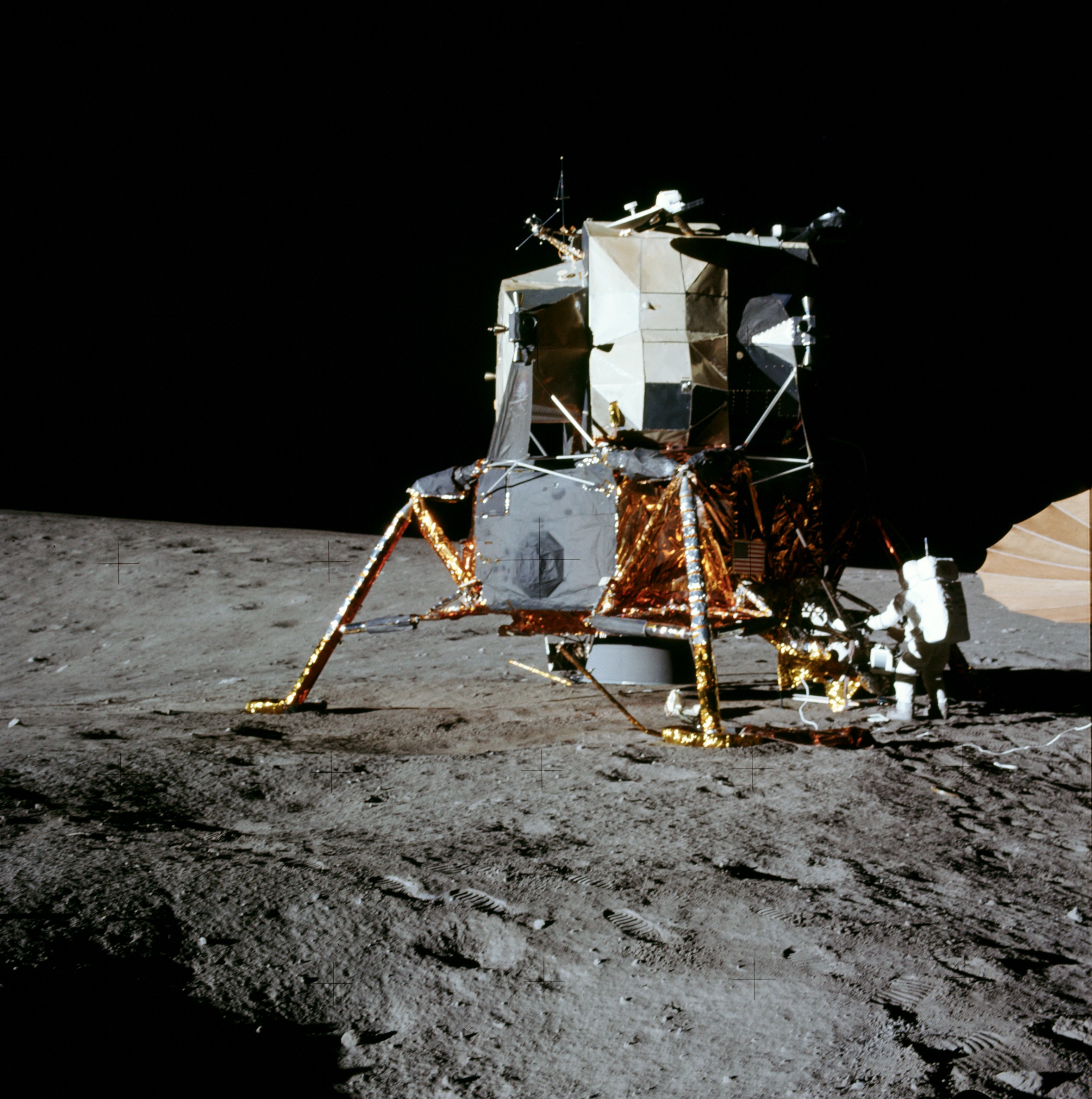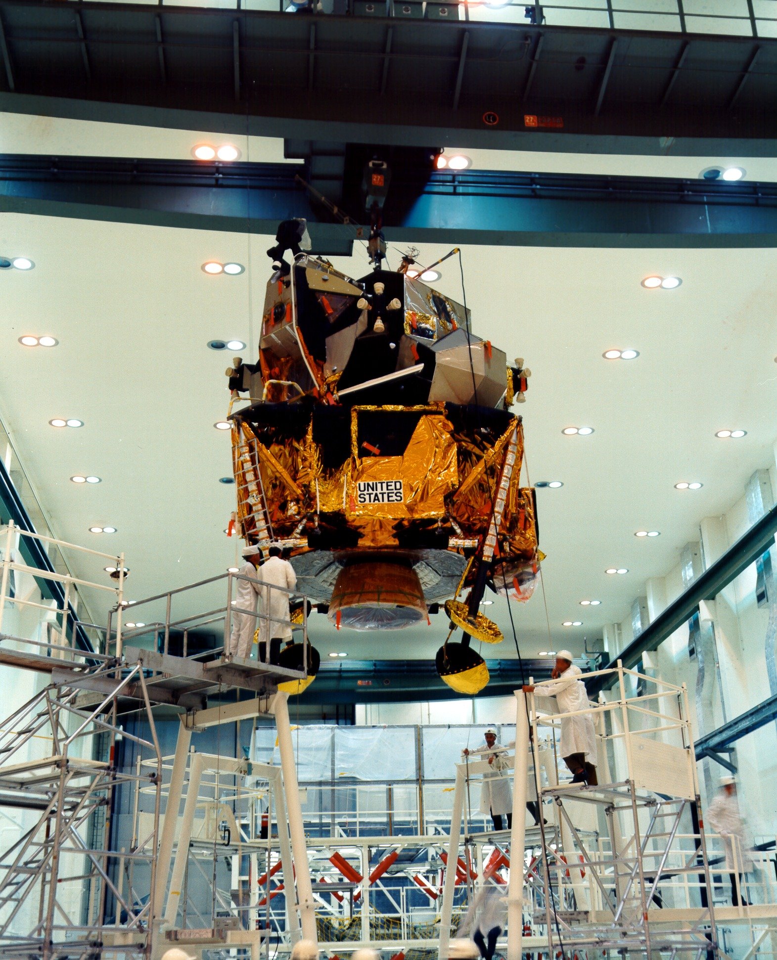 The Apollo 12 Lunar Module, in lunar landing configuration, is photographed in lunar orbit from the Command and Service Modules. Herschel Crater is just to the right of the LM. 19 November 1969. See, also, a labeled version ( 3.4 Mb ) by René Cantin.AS12-51-7507 ( 122k or 635k )