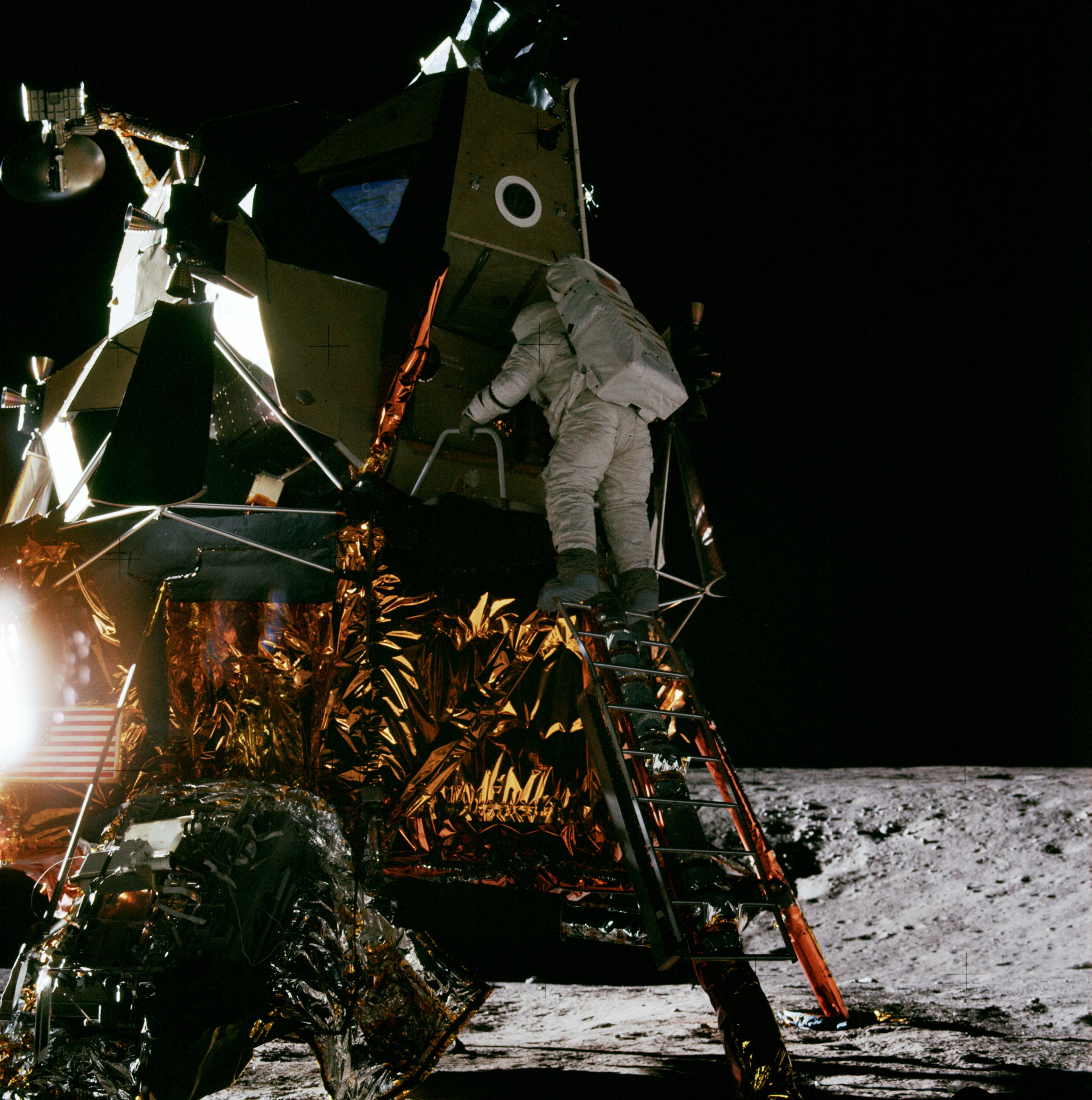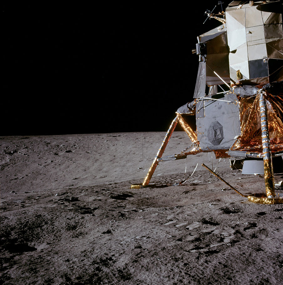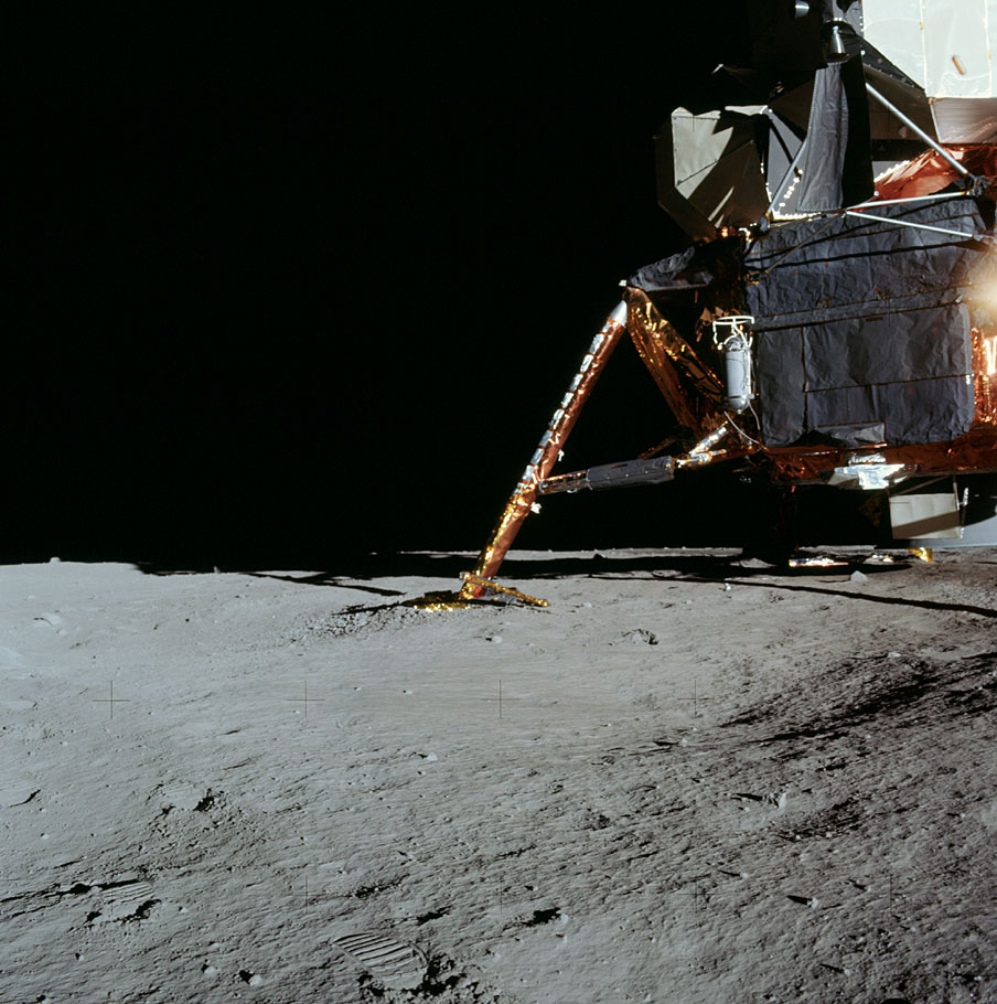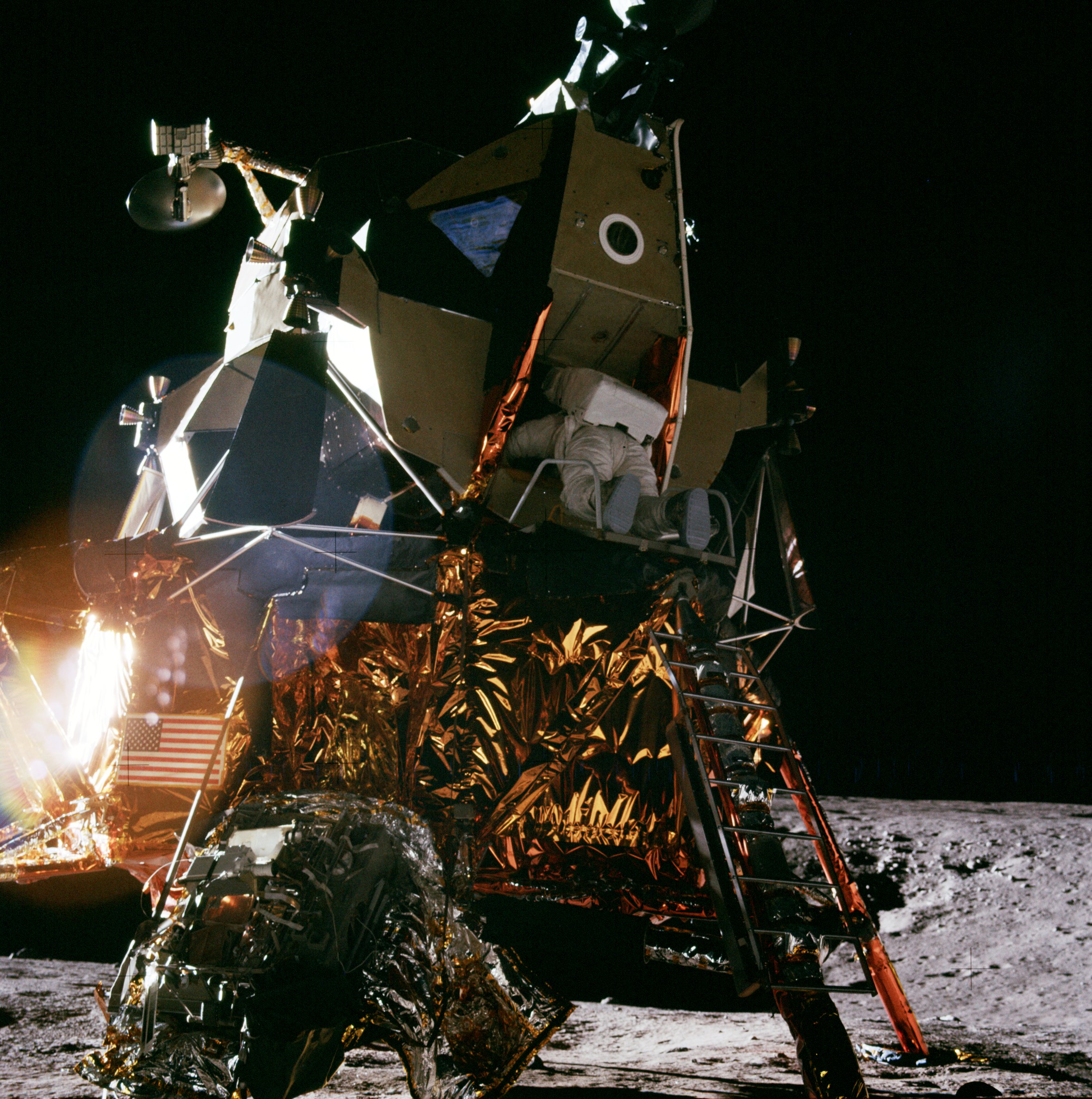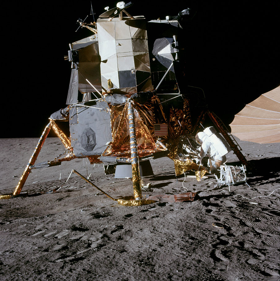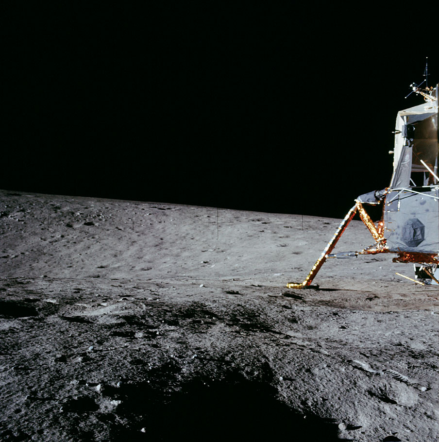 The Apollo 12 Lunar Module, in lunar landing configuration, is photographed in lunar orbit from the Command and Service Modules. Herschel Crater is just to the right of the LM. 19 November 1969. See, also, a labeled version ( 3.4 Mb ) by René Cantin.AS12-51-7507 ( 122k or 635k )
