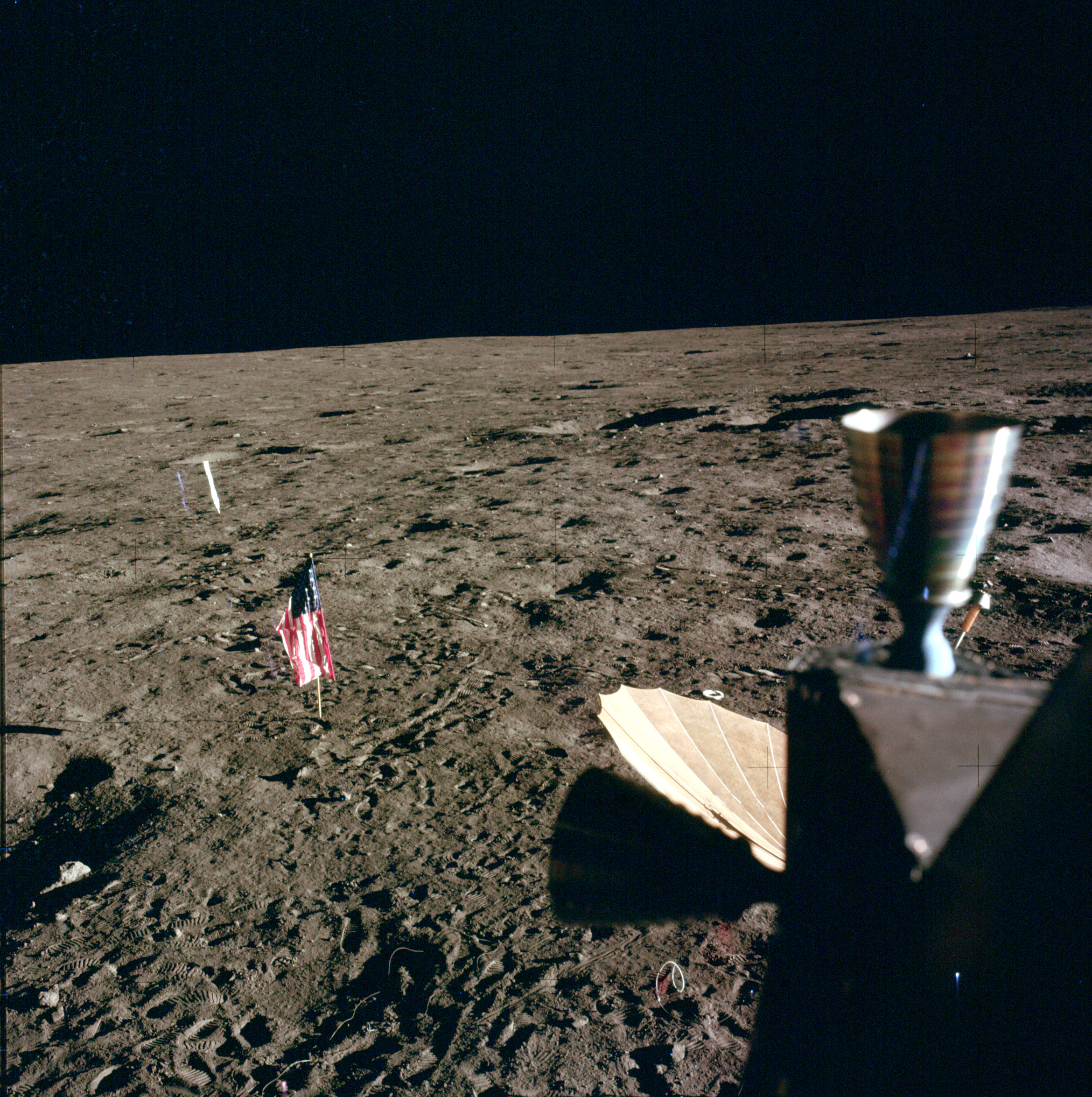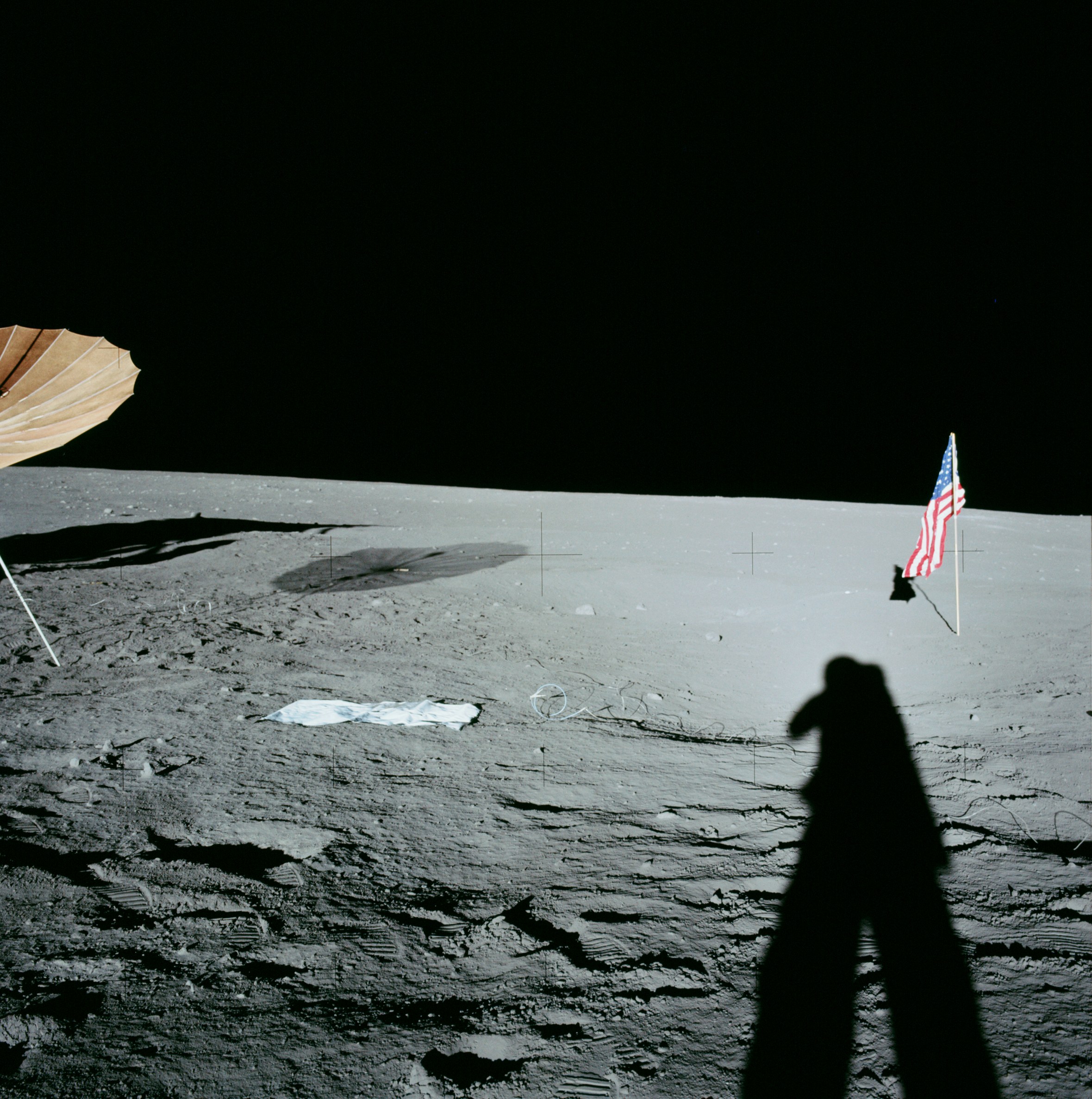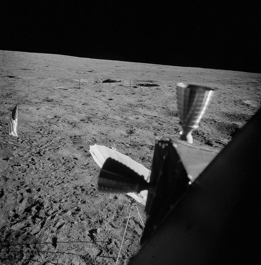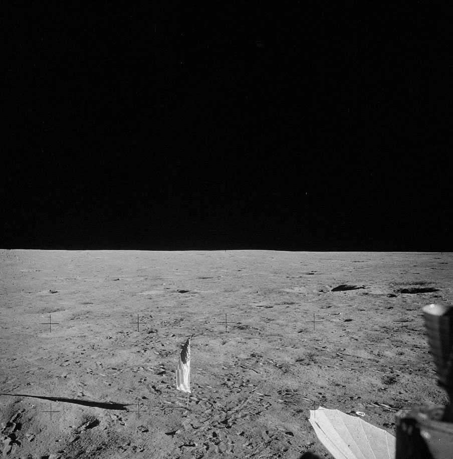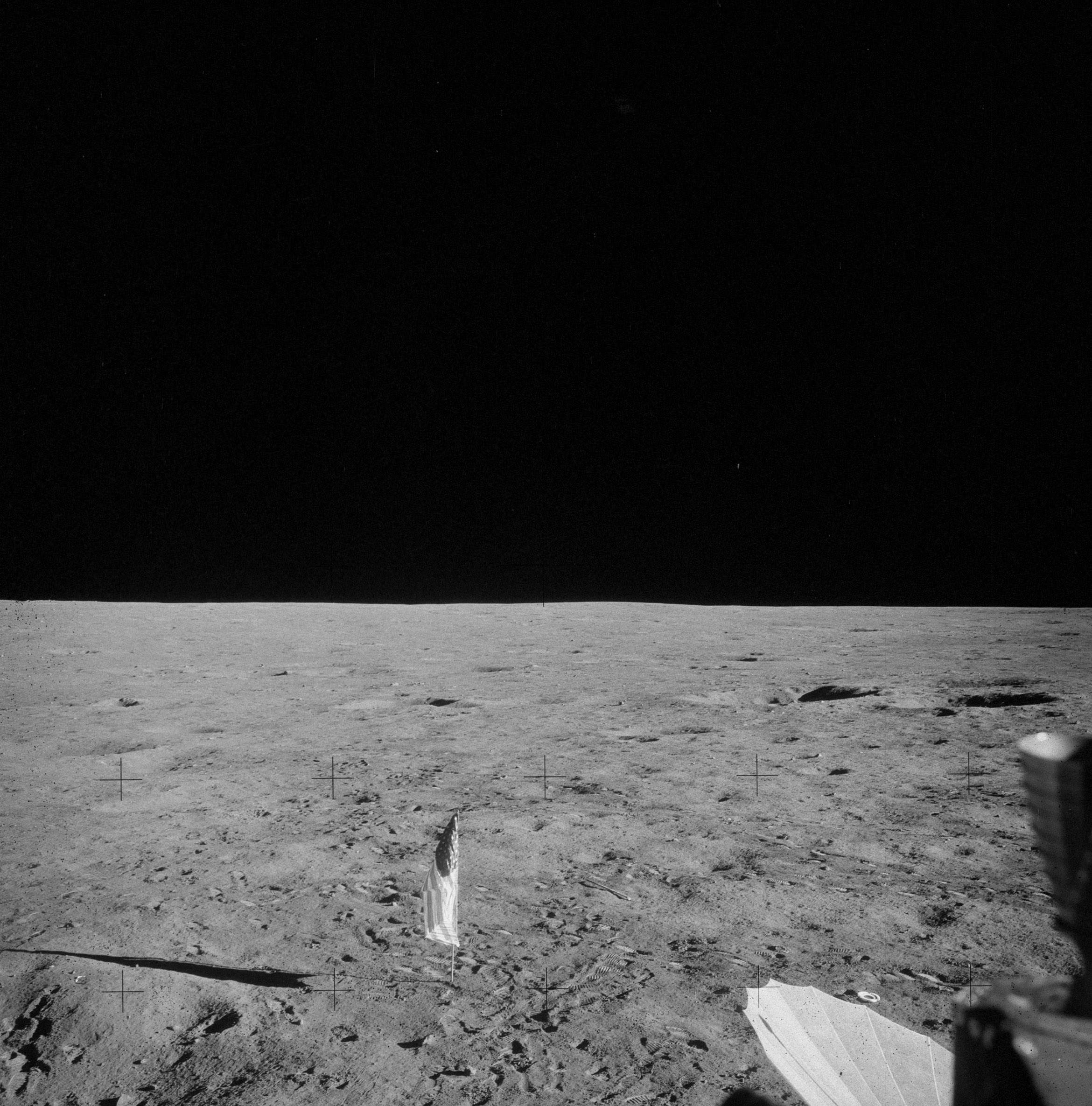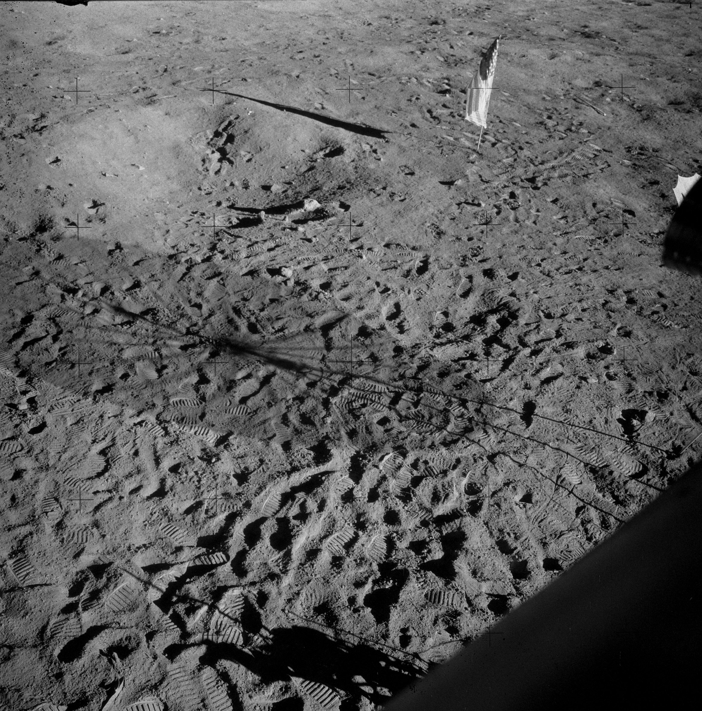 [Journal Contributor James Fincannon has used sunrise-to-sunset sequences of LROC images on the site to demonstrate that, as of 2009-2011, the Apollo 12 flag is still aloft and casting a shadow. The shadow cast by the erectable S-band antenna has also been identified.]11 August 2009 20:46:34 UTC; Solar El/Az 40.5/272.1; LRO altitude 103.1 km. (3.9 Mb)