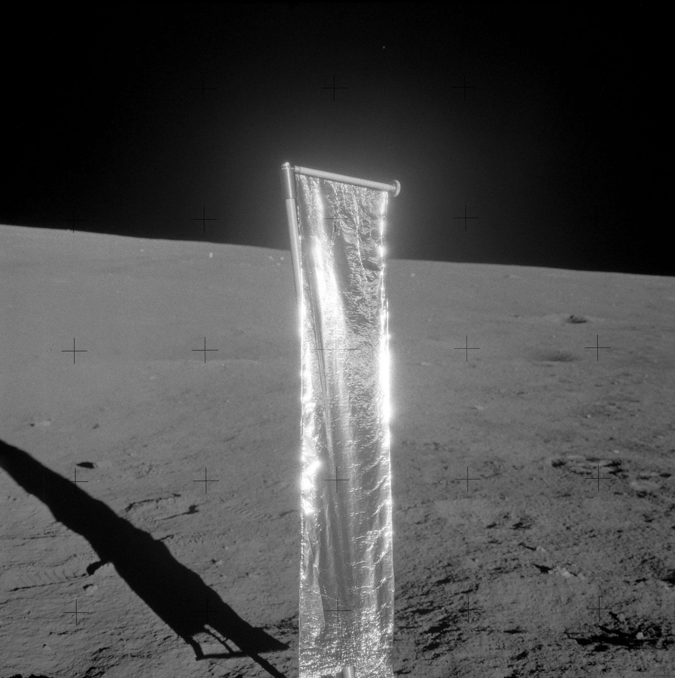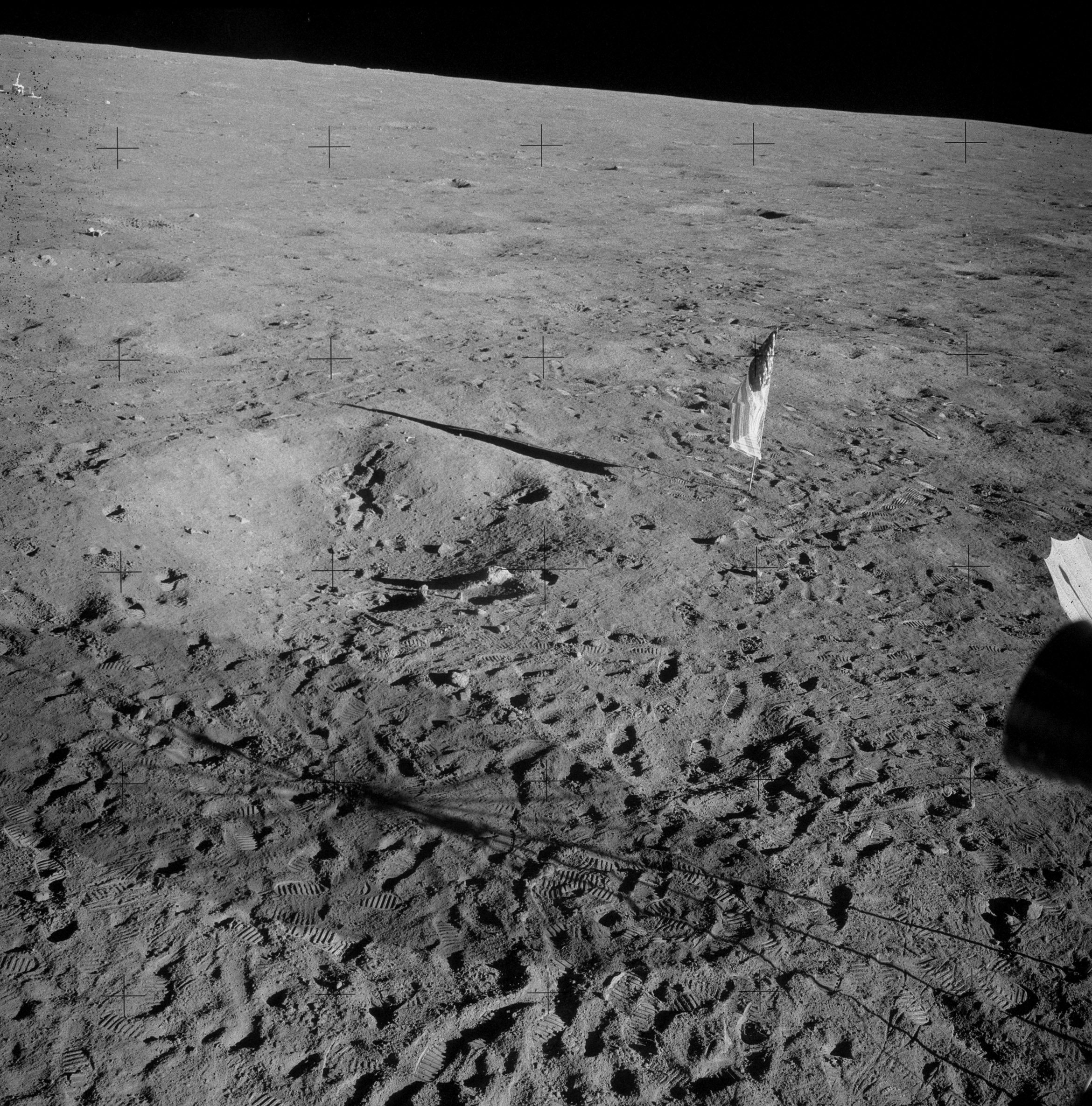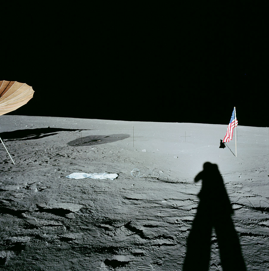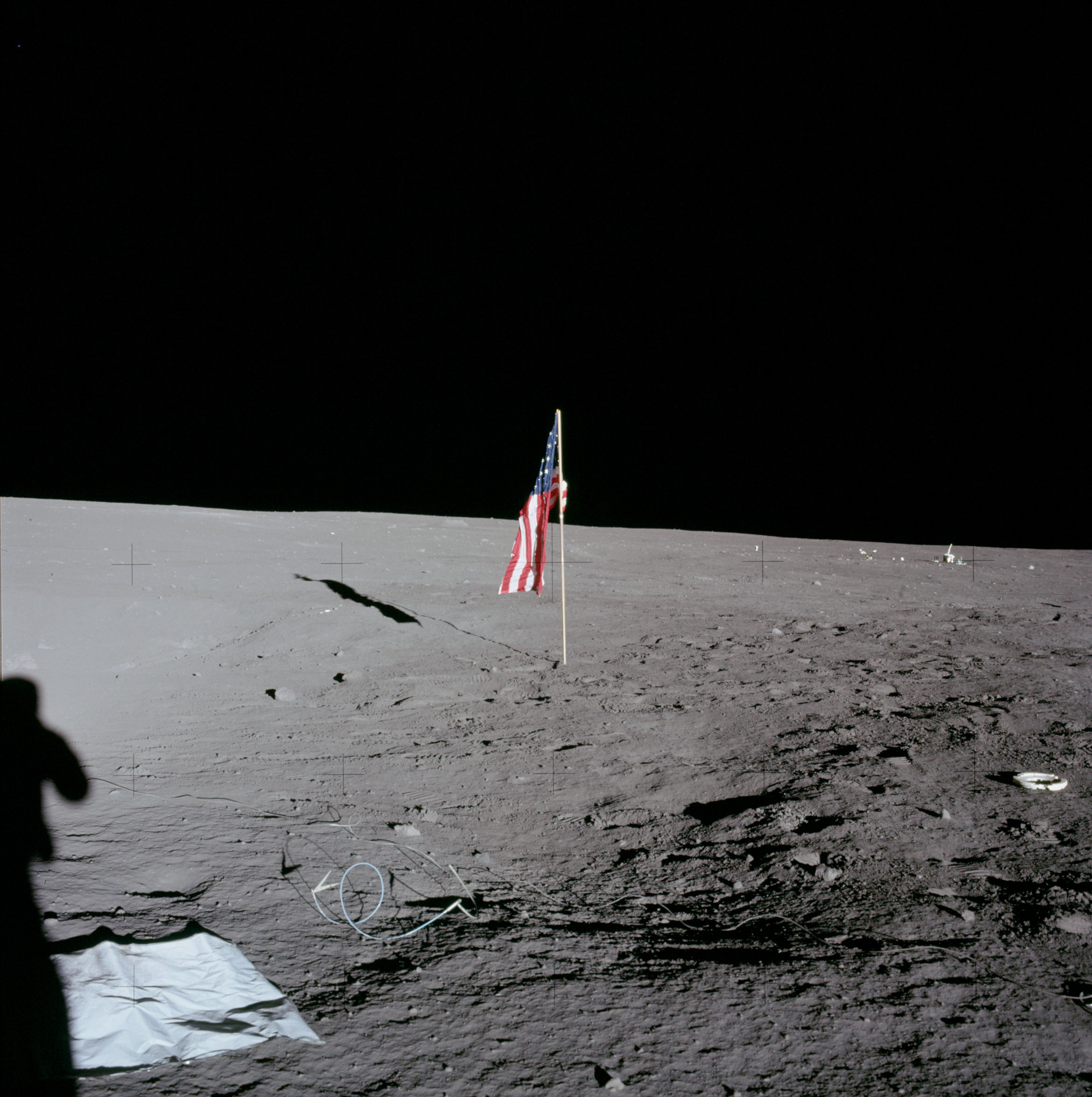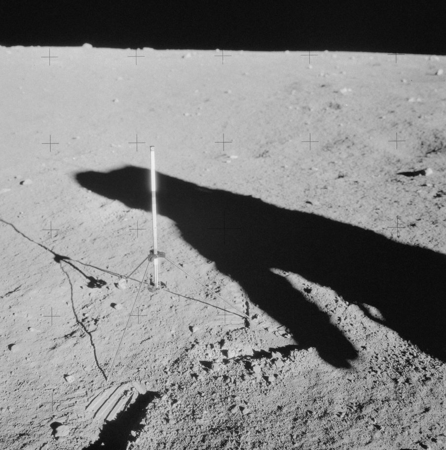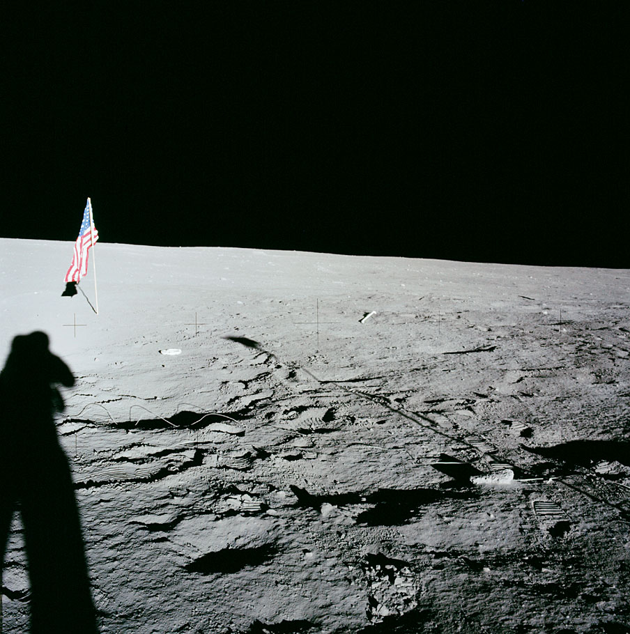 [Journal Contributor James Fincannon has used sunrise-to-sunset sequences of LROC images on the site to demonstrate that, as of 2009-2011, the Apollo 12 flag is still aloft and casting a shadow. The shadow cast by the erectable S-band antenna has also been identified.]11 August 2009 20:46:34 UTC; Solar El/Az 40.5/272.1; LRO altitude 103.1 km. (3.9 Mb)