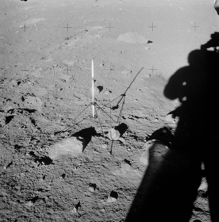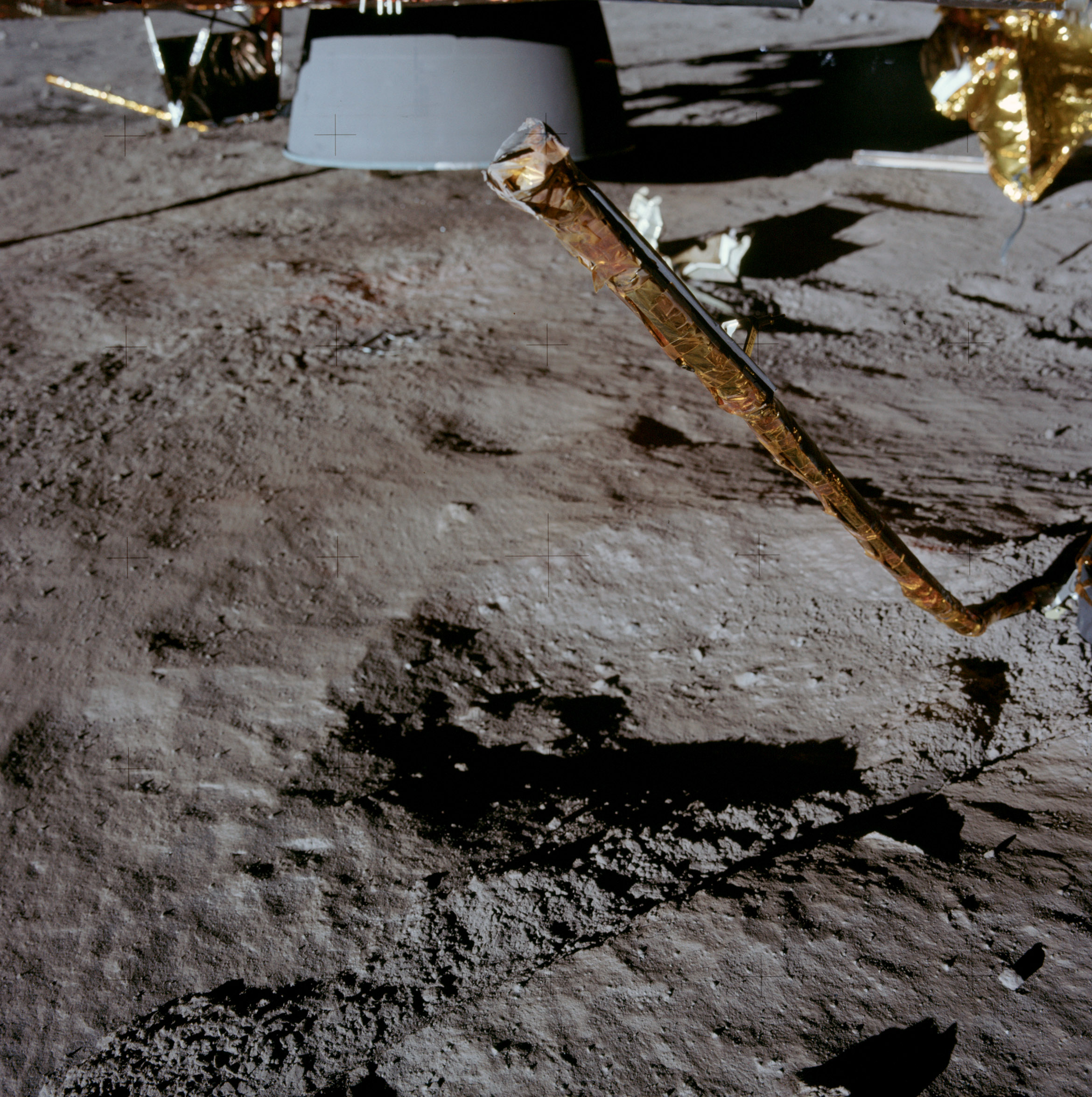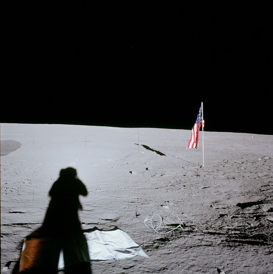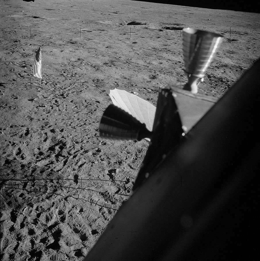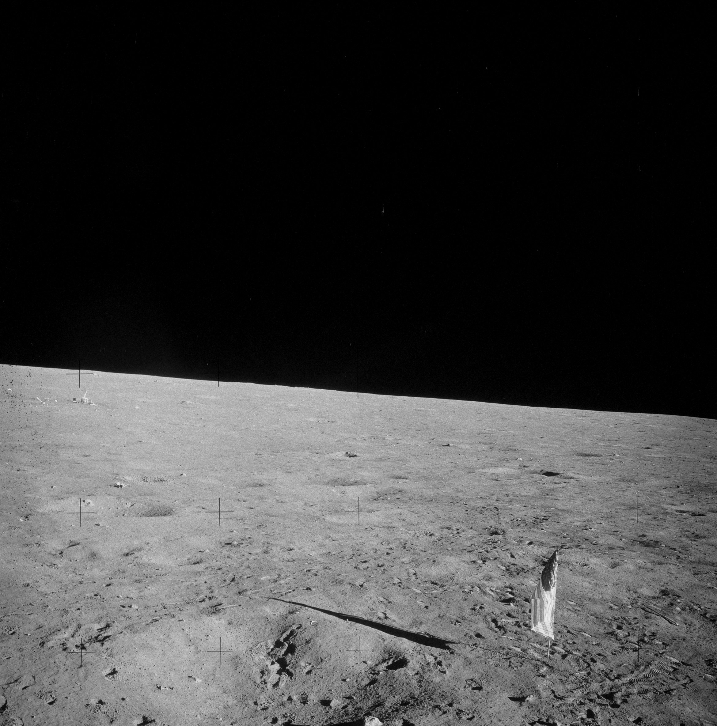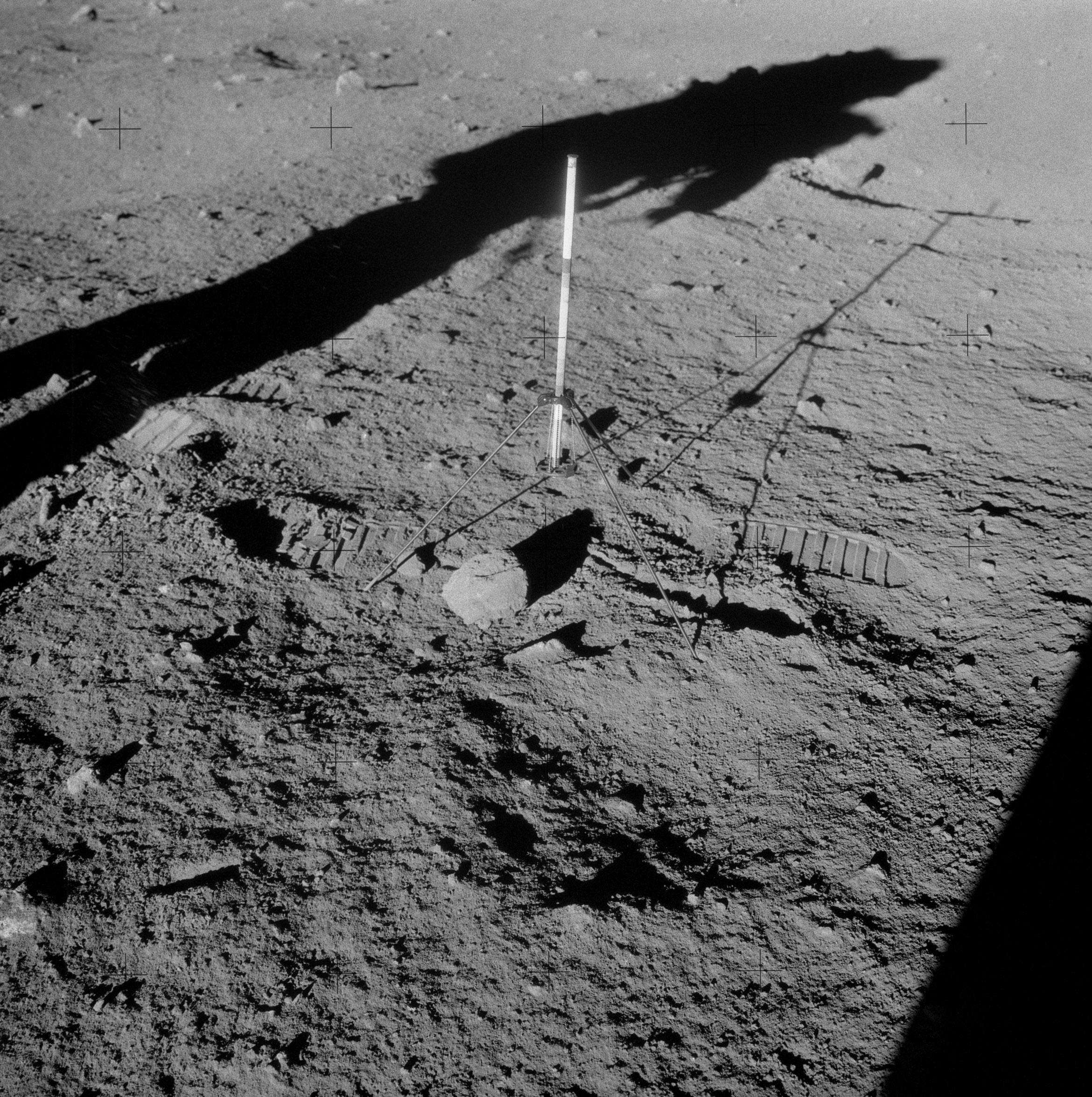 [Journal Contributor James Fincannon has used sunrise-to-sunset sequences of LROC images on the site to demonstrate that, as of 2009-2011, the Apollo 12 flag is still aloft and casting a shadow. The shadow cast by the erectable S-band antenna has also been identified.]11 August 2009 20:46:34 UTC; Solar El/Az 40.5/272.1; LRO altitude 103.1 km. (3.9 Mb)