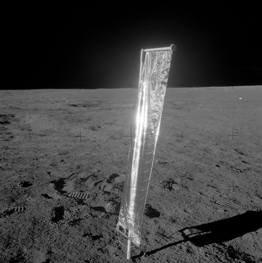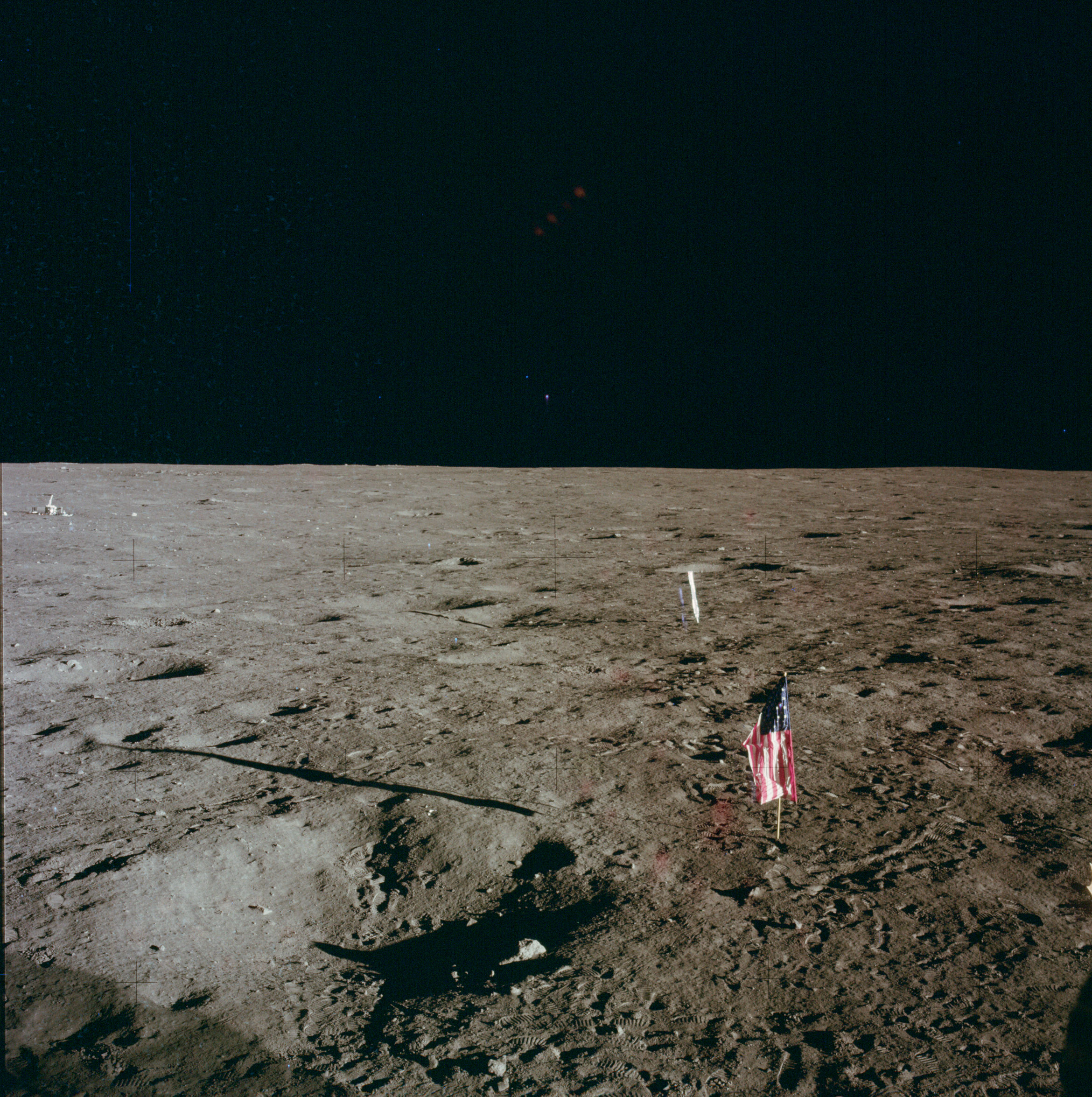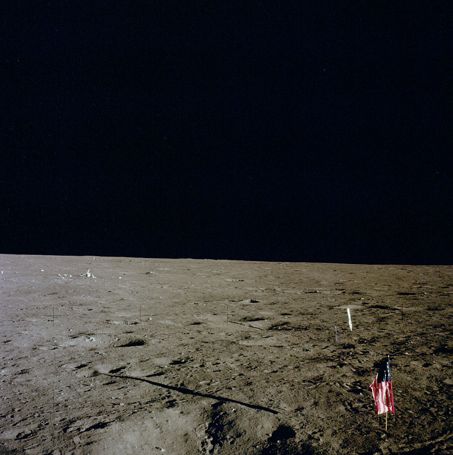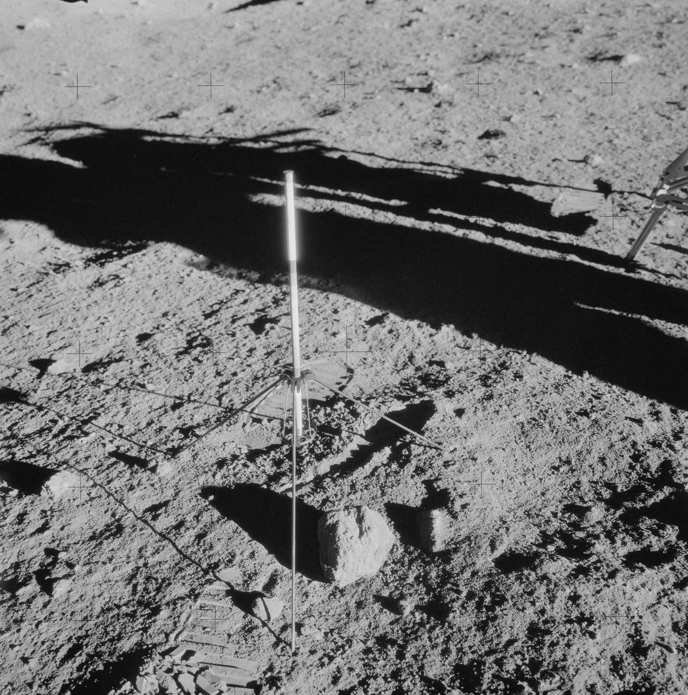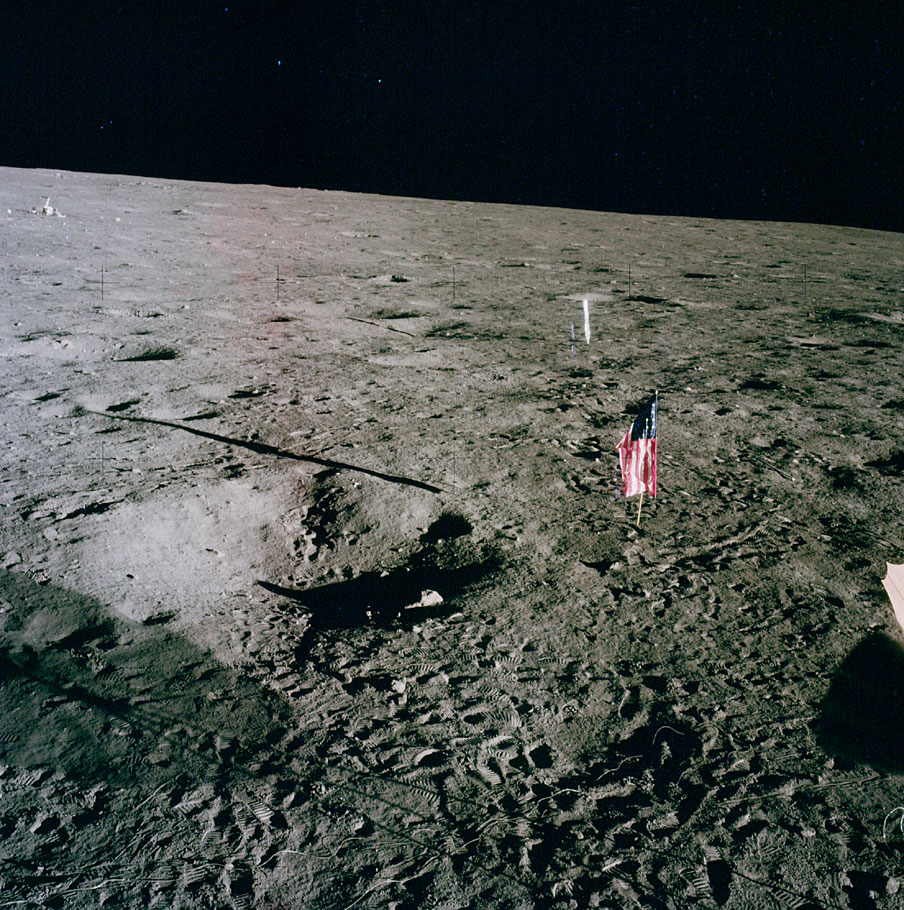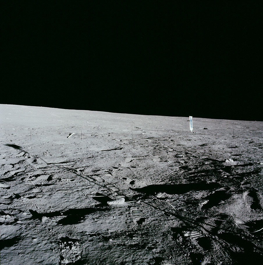 [Journal Contributor James Fincannon has used sunrise-to-sunset sequences of LROC images on the site to demonstrate that, as of 2009-2011, the Apollo 12 flag is still aloft and casting a shadow. The shadow cast by the erectable S-band antenna has also been identified.]11 August 2009 20:46:34 UTC; Solar El/Az 40.5/272.1; LRO altitude 103.1 km. (3.9 Mb)