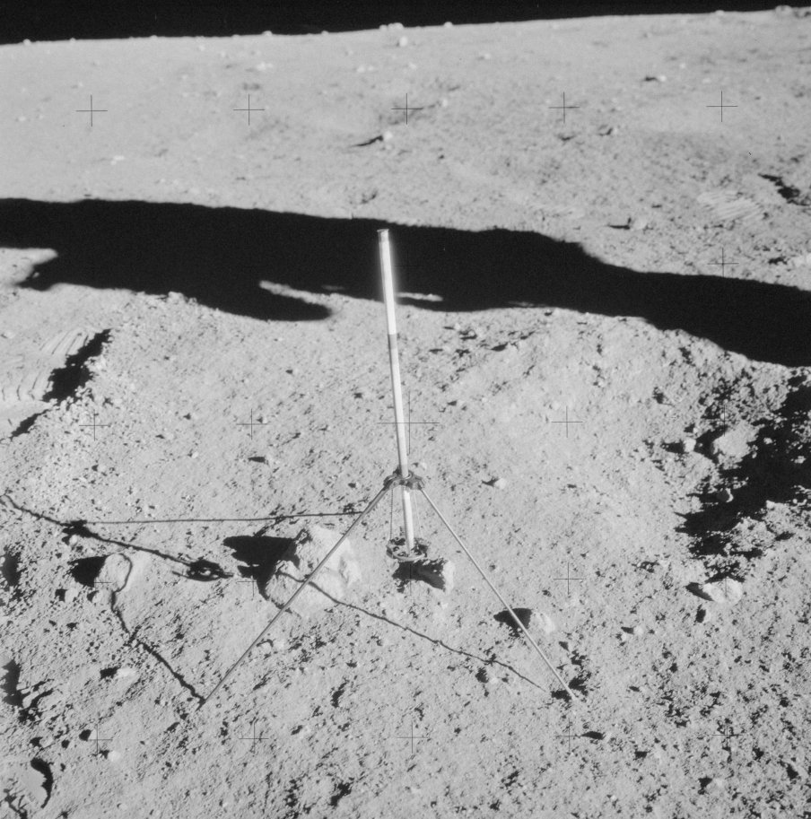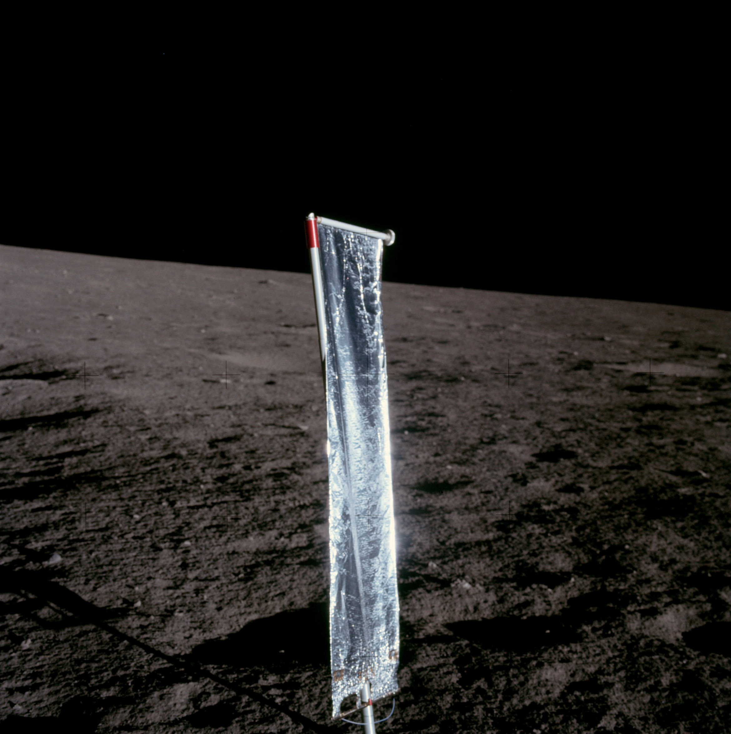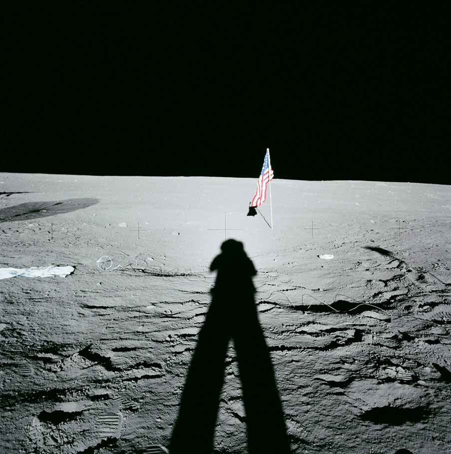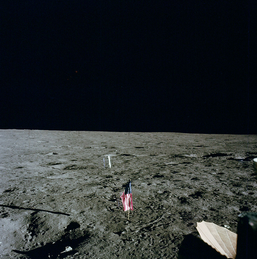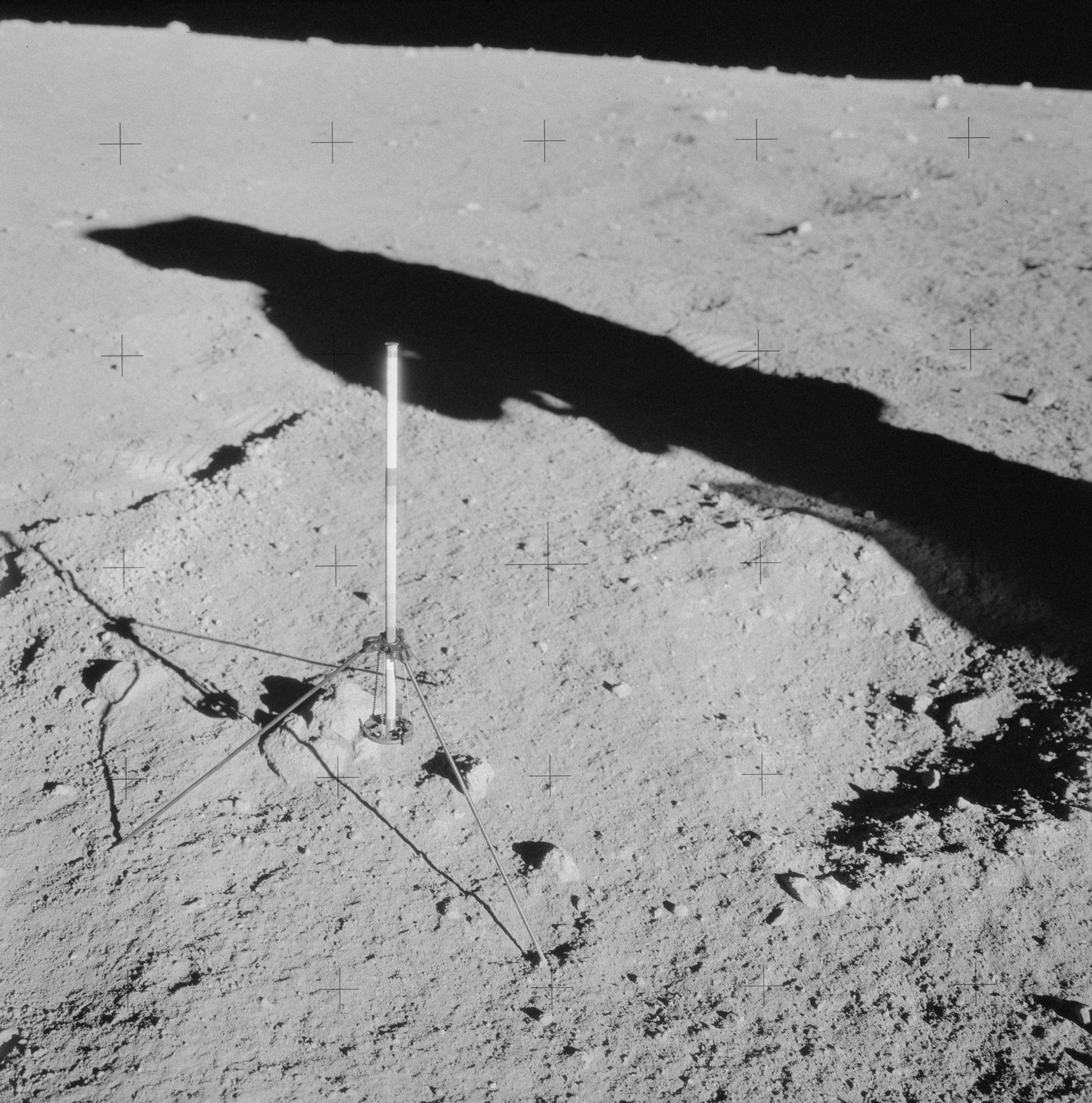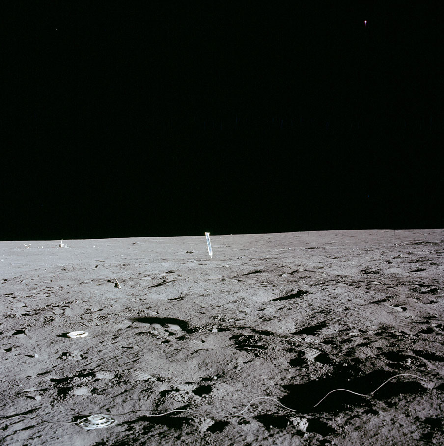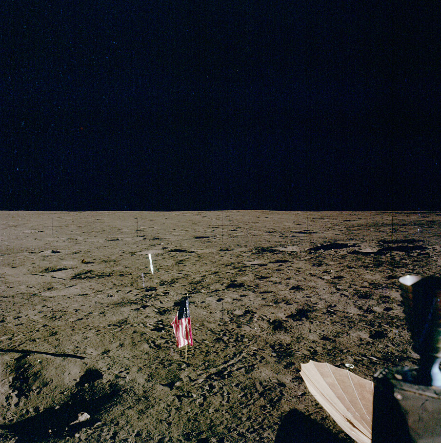 [Journal Contributor James Fincannon has used sunrise-to-sunset sequences of LROC images on the site to demonstrate that, as of 2009-2011, the Apollo 12 flag is still aloft and casting a shadow. The shadow cast by the erectable S-band antenna has also been identified.]11 August 2009 20:46:34 UTC; Solar El/Az 40.5/272.1; LRO altitude 103.1 km. (3.9 Mb)