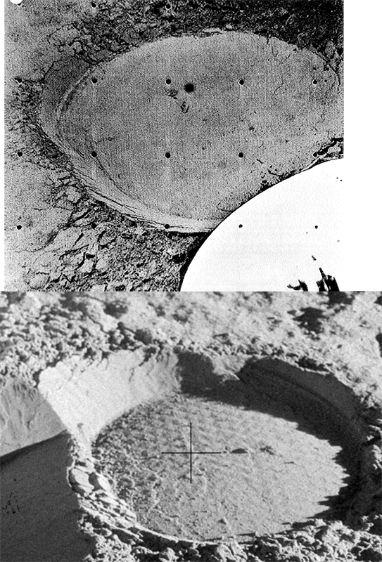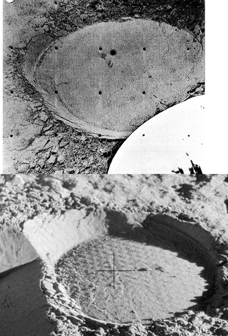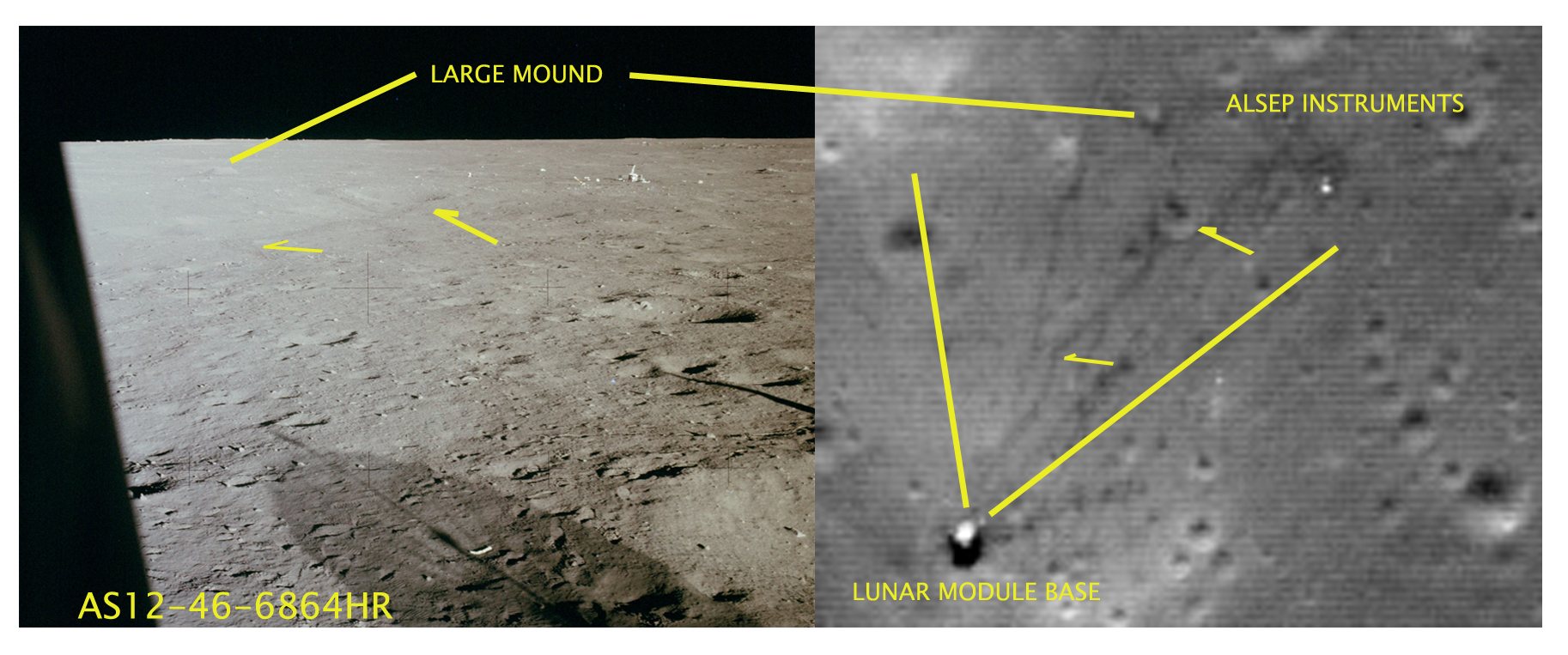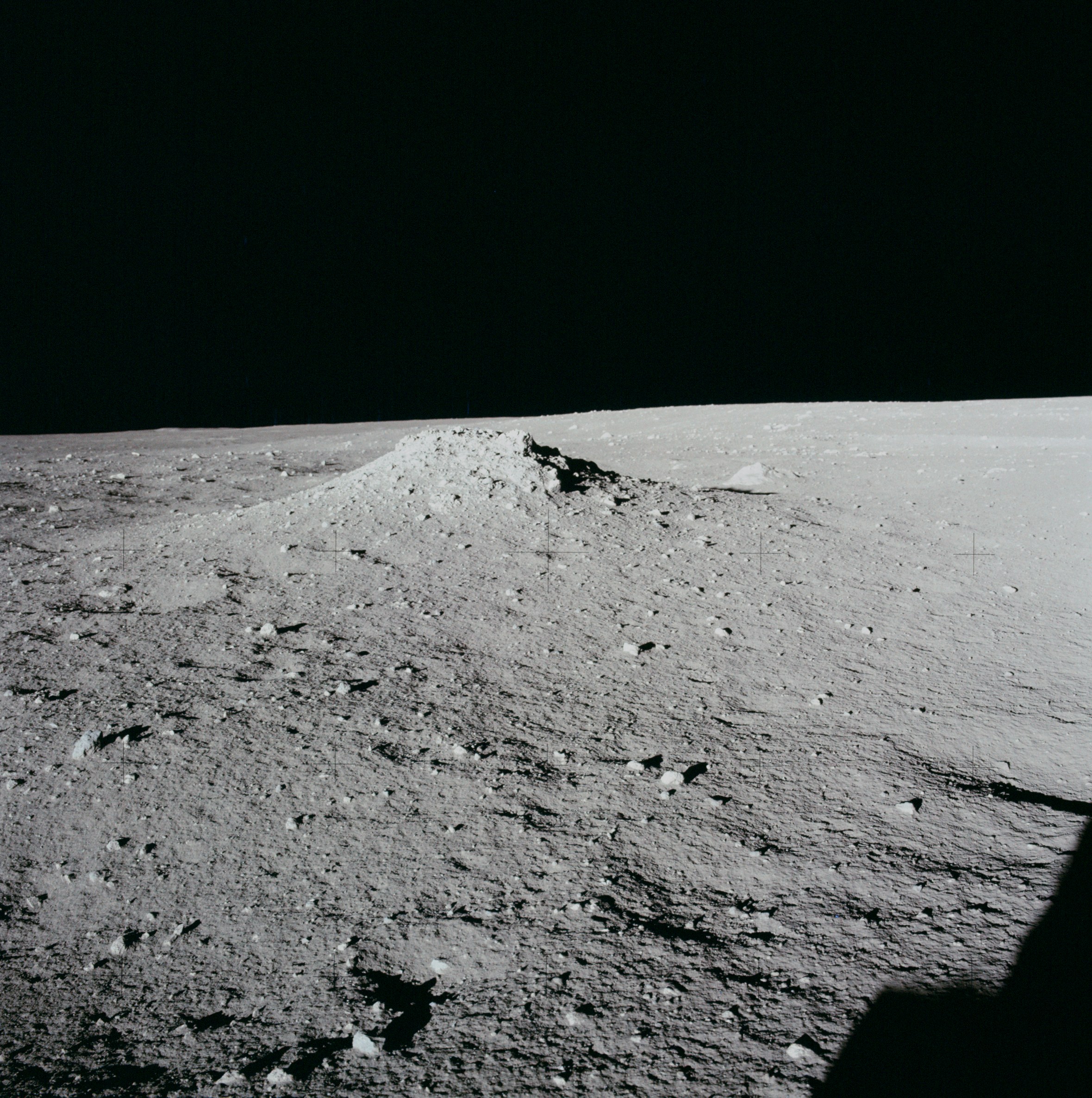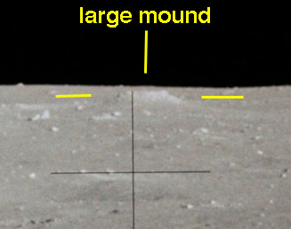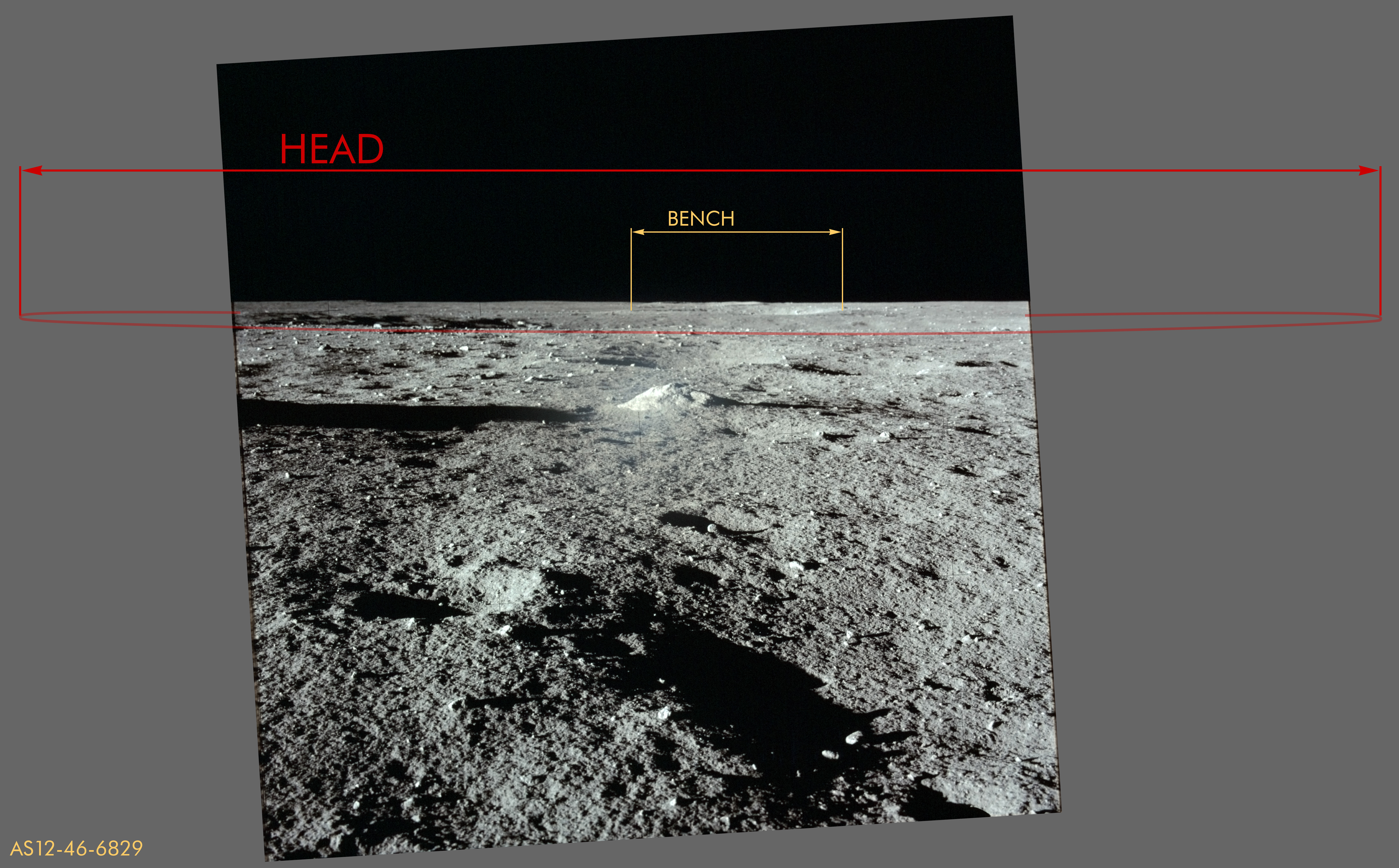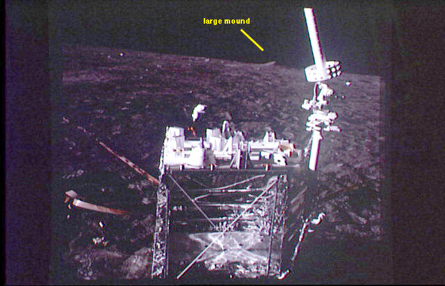 This detail shows head Crater and the larger of the two soil mounds found by the crew on the north rim. Scan by John Pfannerstill. AS12-46- 6793 is a surface-level photo of the mound.Approach View