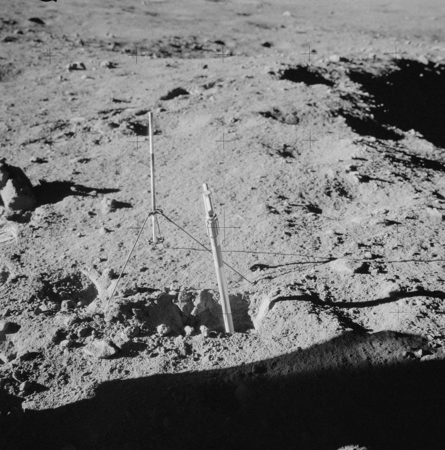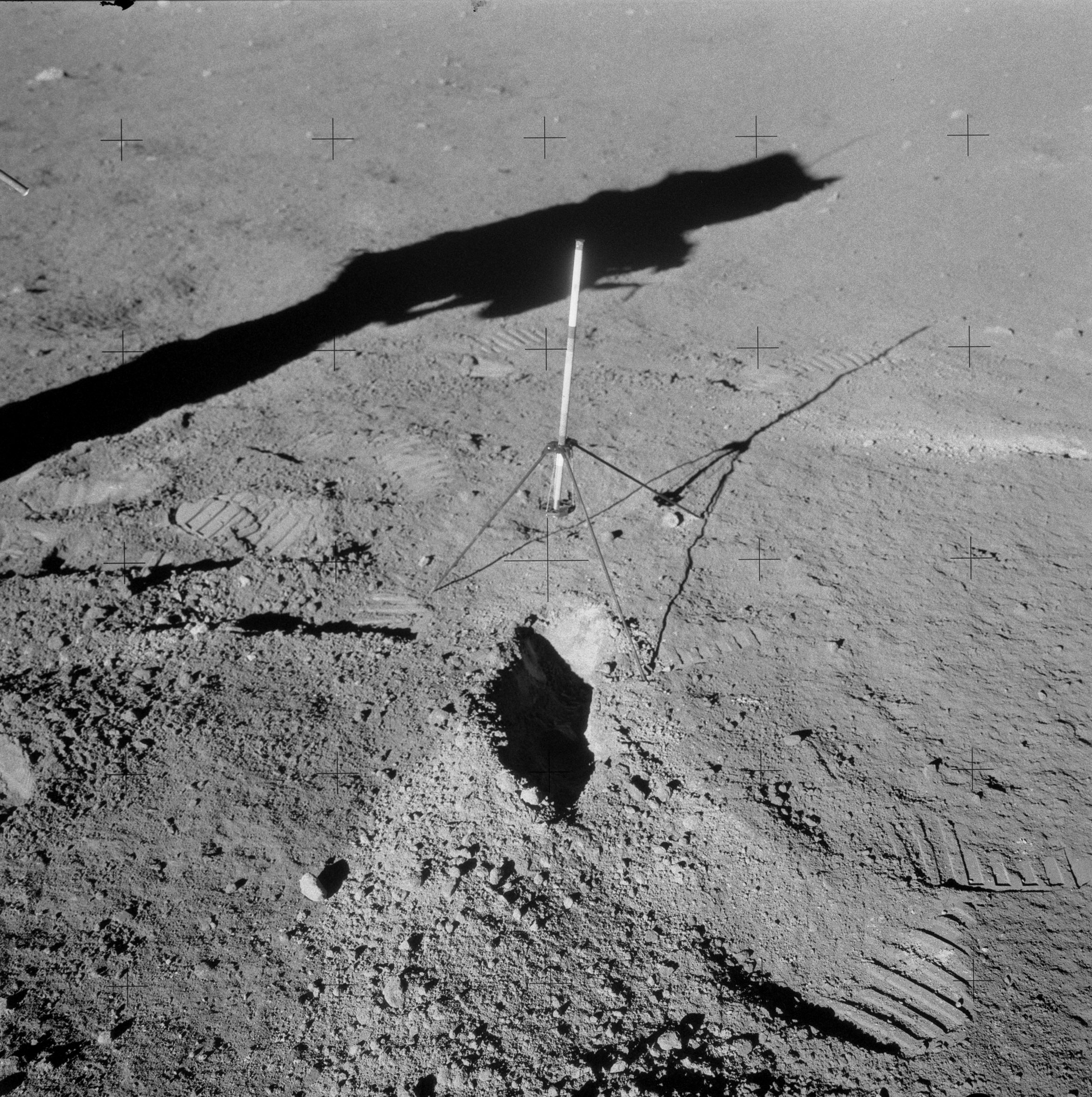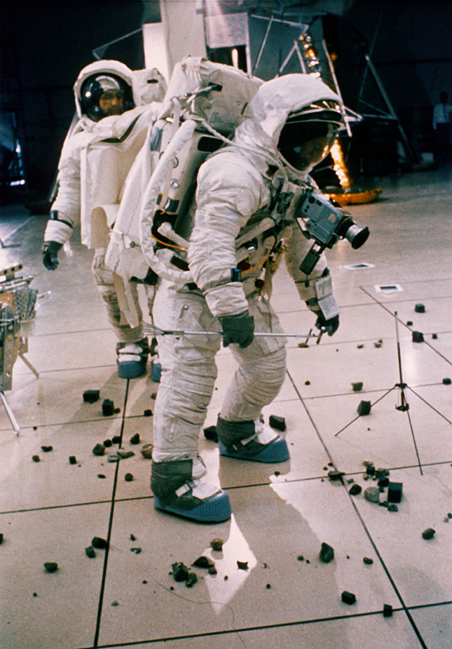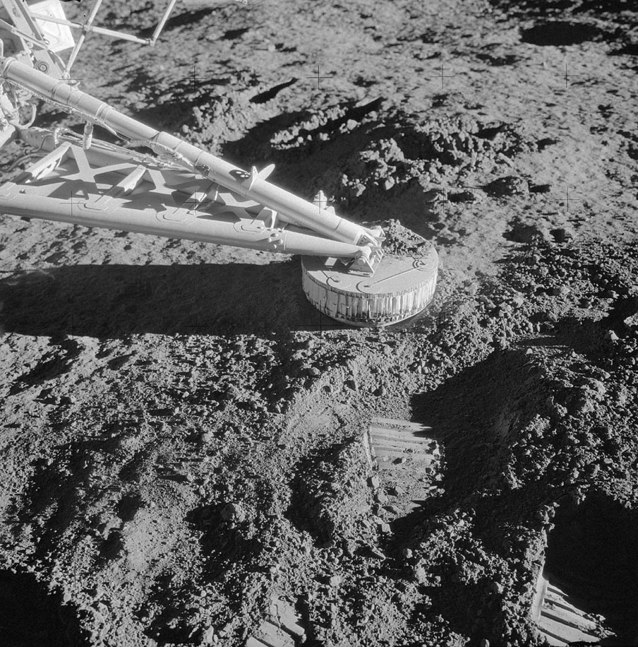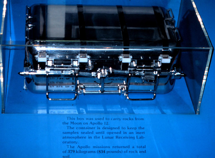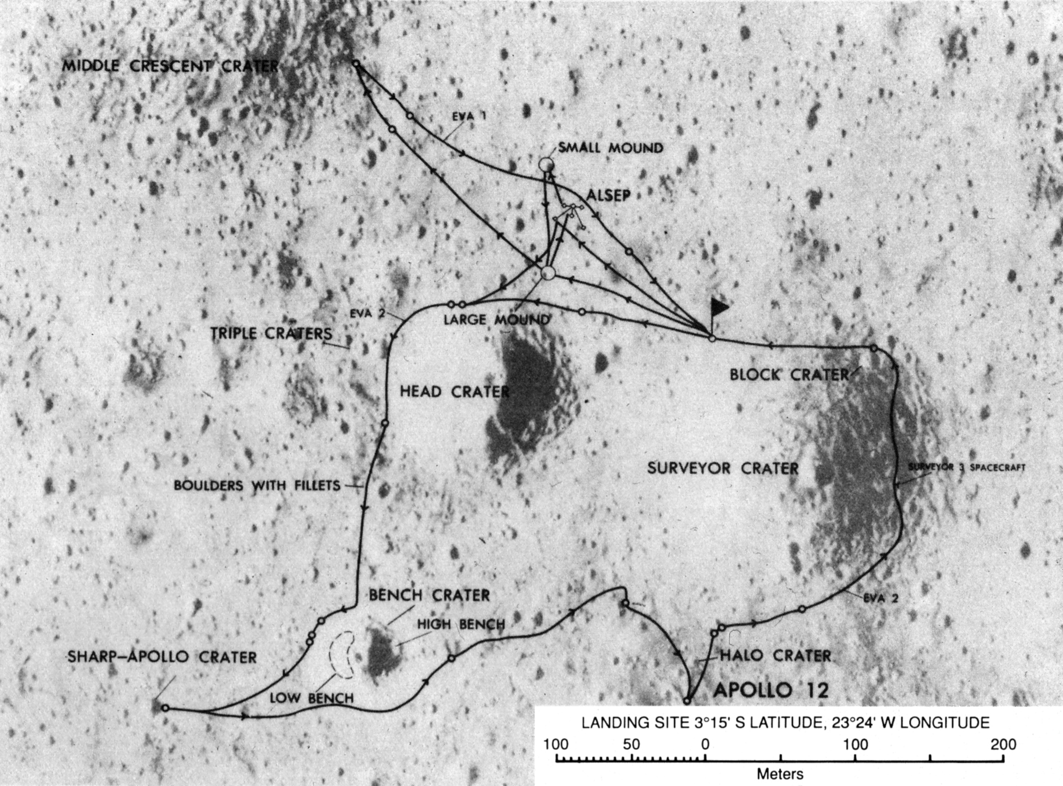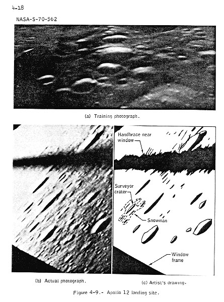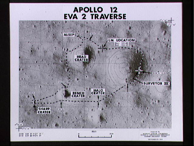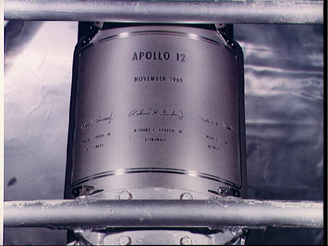 Close-up view of a replica of the plaque which the Apollo 12 astronauts left on the Moon in commemoration of their flight. The plaque was attached to the ladder on a landing gear strut of the Descent Stage of the Apollo 12 Lunar Module, Intrepid.S69-54148 ( 48k )This photo shows Pete Conrad and Al Bean practicing sampling procedures in the Flight Crew Training Building at the Kennedy Space Center. The object in the foreground is a gnomon. The free-swinging vertical element provides a local vertical and a length scale. The flight gnomon had a color/gray-scale on one leg, which the crew oriented toward the Sun. The Hand Tool Carrier (HTC) is between the astronauts. Both Pete and Al are wearing a 70-mm Hasselblad camera mounted on their Remote Control Units (RCUs). On the Moon, one of them would take a "before" documentation photo from the east (up-Sun) and the other would take a "cross-Sun" stereopair from the north or south, stepping sideways between frames. Pete has a pair of long-handled tongs in his left hand and will use them to collect a rock.S69-55362 ( 46k )In this photo, Al is practicing driving a core tube into the lunar surface. The core tube is mounted on the bottom of a re-inforced Extension Handle so that Al can hit the top of the extension handle and drive the core tube all the way into the ground without having to bend over very far. Note that he is hitting the extension handle with the flat side of the hammer. The pressurized suit makes it difficult to deliver an accurate blow and, by using the flat of the hammer, he increases his chances of making contact. Each of the astronauts has two visors in his Lunar Extravehicular Visor Assembly (LEVA) that covers the bubble helmet. The inner visor reduces the light level reaching the astronaut's eyes while the outer visor, which is electroplated with gold, provides UV protection. We can see the edges of both of Pete's visors. Note, also, the cuff checklist on Pete's left wrist. There is a LM mock-up in the background. We are looking at the side of the spacecraft and, behind Al, we can see the open area from which the MESA (hidden from view) has been deployed.S69-55662 ( 74k )During a geology training exercise at Cinder Lake crater field near Sunset Crater, Arizona, Pete Conrad examines the stratigraphy in a crater dug by the USGS with an explosive charge in thick blanket of volcanic ash. 10 October 1969S69-56058 ( 28k )Astronaut Pete Conrad sits in the cockpit of a Lunar Landing Training Vehicle (LLTV) during a lunar simulation flight at Ellington Air Force Base. The LLTV is used to train Apollo crews in lunar landing techniques.S69-56059 ( 0.4 Mb or 1.5 Mb )Astronaut Al Bean participates in lunar surface simulation training in Bldg 29 at the Manned Spacecraft Center. He is strapped into a device called the POGO which supports 5/6th of his weight. The POGO assembly is suspended from a centrifuge arm so that Bean can run around the outer edge of the centrifuge chamber on a simulated lunar surface. The astronauts who used the facility in this way described it as a useful simulation. 24-25 October 1969. Scan courtesy Susan Erskine at NASA Johnson.AS12-51-7478 ( 33k )View of the lunar surface from low orbit.S69-59547 ( 28k )The seismometer reading from the impact made by the LM Ascent Stage when it struck the lunar surface. The impact was registered by the Passive Seismic Experiment Package (PSEP) which was deployed on the Moon by the Apollo 12 astronauts. The LM's Ascent Stage was jettisoned and sent toward impact on the Moon after astronauts Pete Conrad and Al Bean returned to lunar orbit and rejoined astronaut Dick Gordon, in the Command/Service Modules.AS12-57-8448 ( 76k or 216k )Apollo 12 stereo view showing a boot imprint. The exposure was made with an Apollo 35mm stereo close-up camera during extravehicular activity of the Apollo 12 lunar landing mission. The camera was developed to get the highest possible resolution of a small area. Scan by Kipp Teague. Ulli Lotzmann has produced red(left)-blue(right) and green(left)-red(right) stereo-images.AS12-57-8452 ( 34k )Apollo 12 stereo views showing a three-inch square of the lunar surface. Ulli Lotzmann has produced red(left)-blue(right) and green(left)-red(right) stereo-images.AS12-57-8455 ( 38k )Apollo 12 stereo views showing a three-inch square of the lunar surface. Ulli Lotzmann has produced red(left)-blue(right) and green(left)-red(right) stereo-images.Apollo 12 Rock box ( 84k )One of the Apollo 12 Sample Return Containers, probably 1008, is on display at the Smithsonian's National Air and space Museum in Washington D.C. Photo by Ulrich Lotzmann.