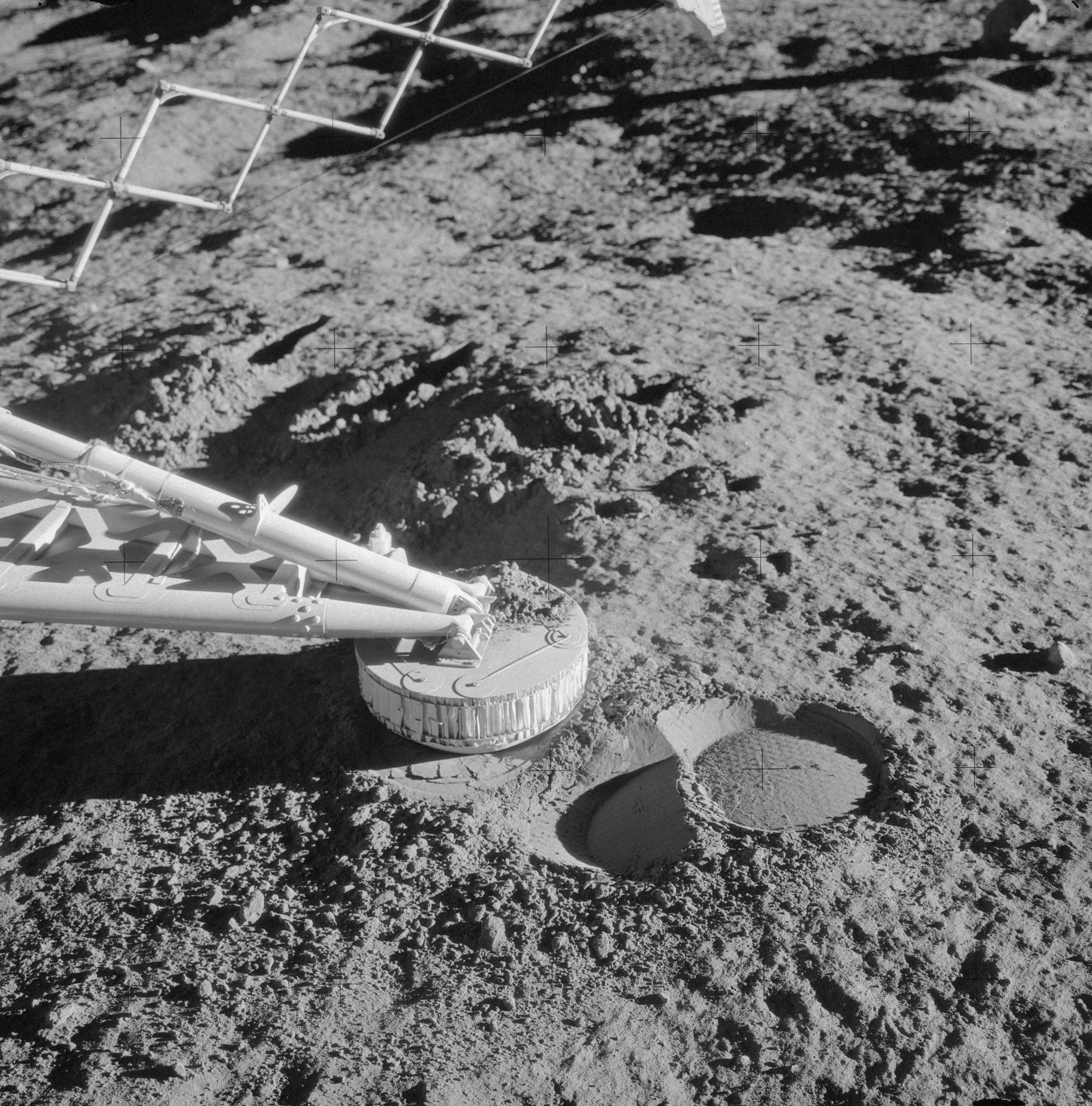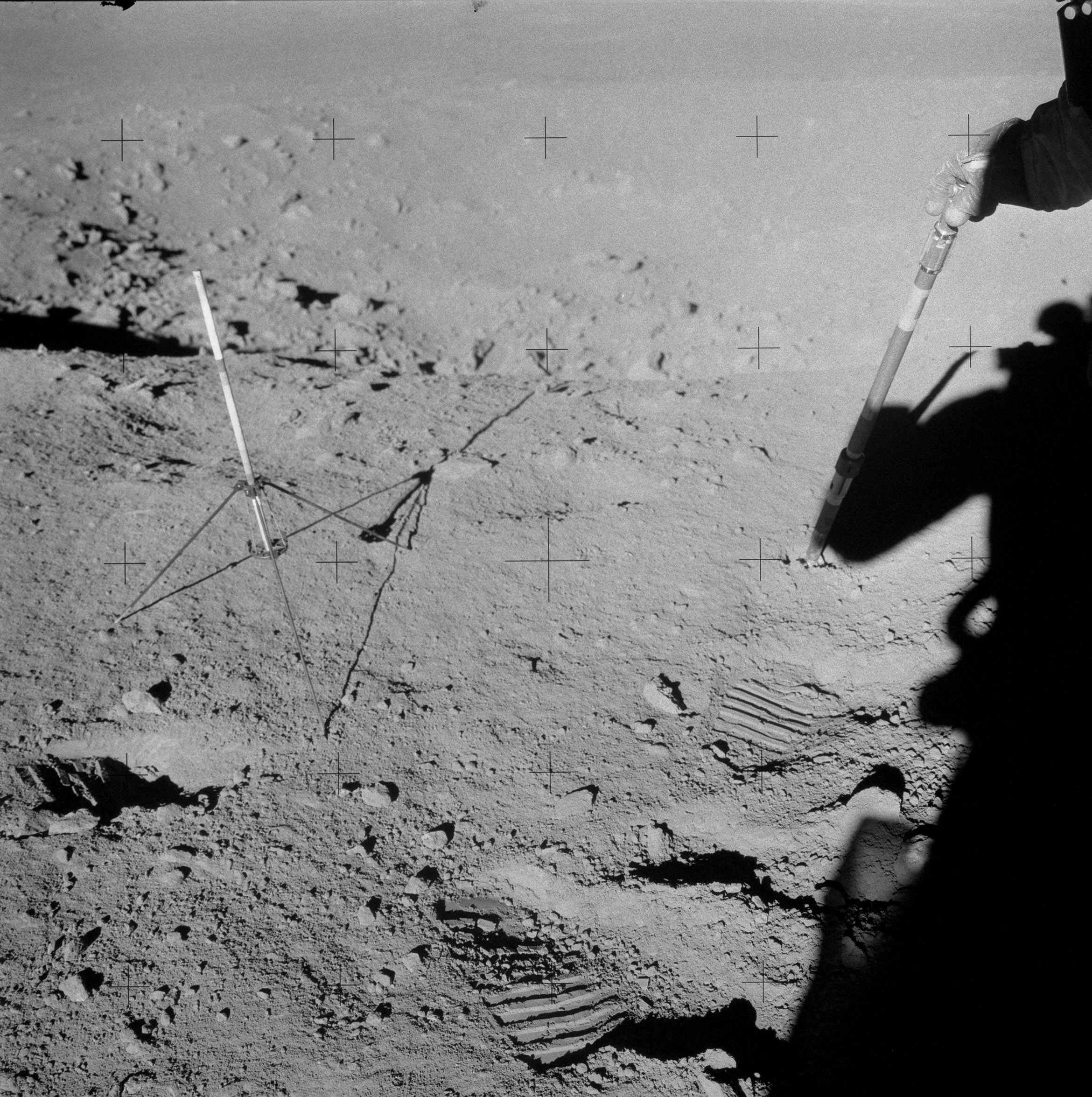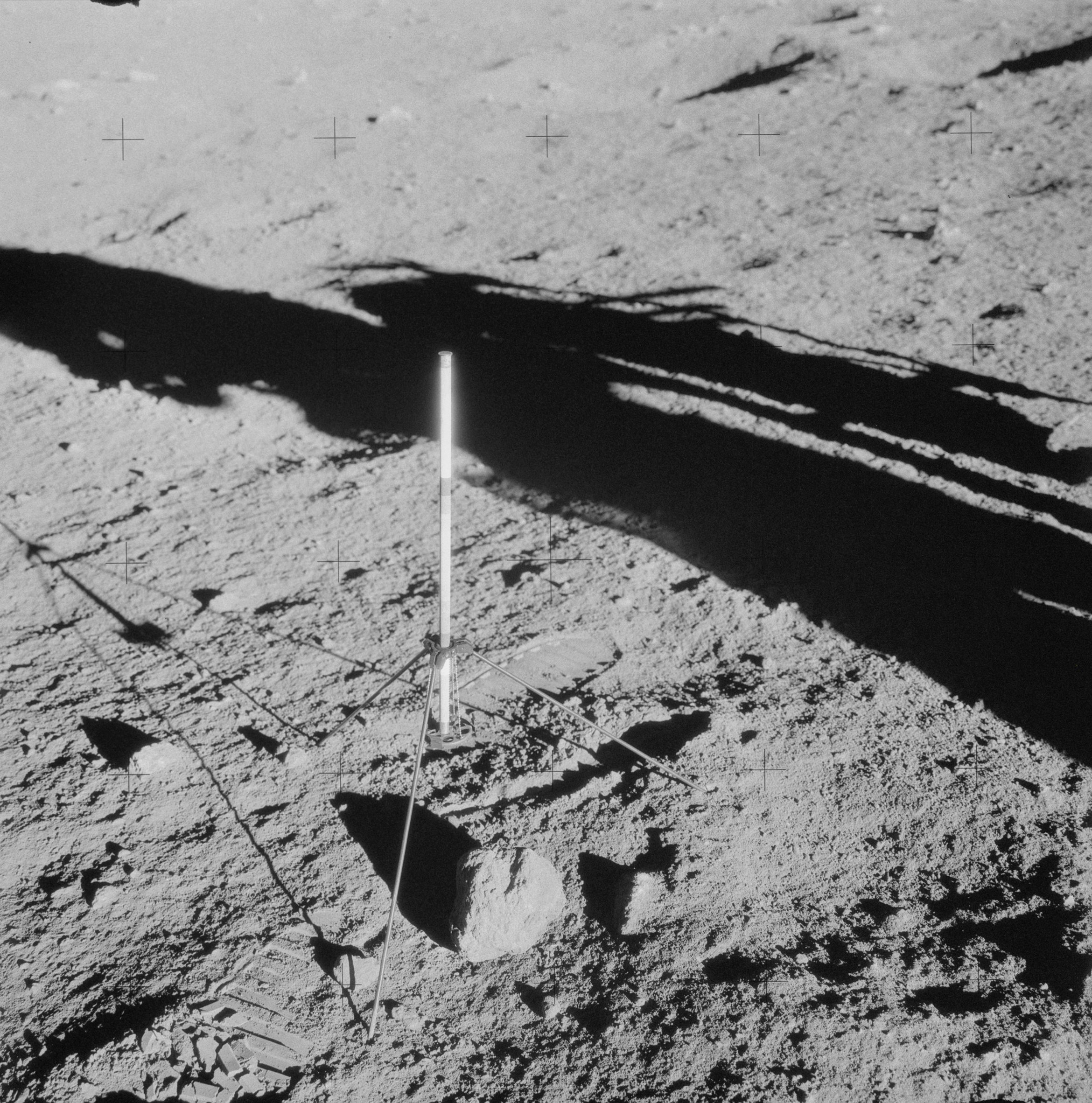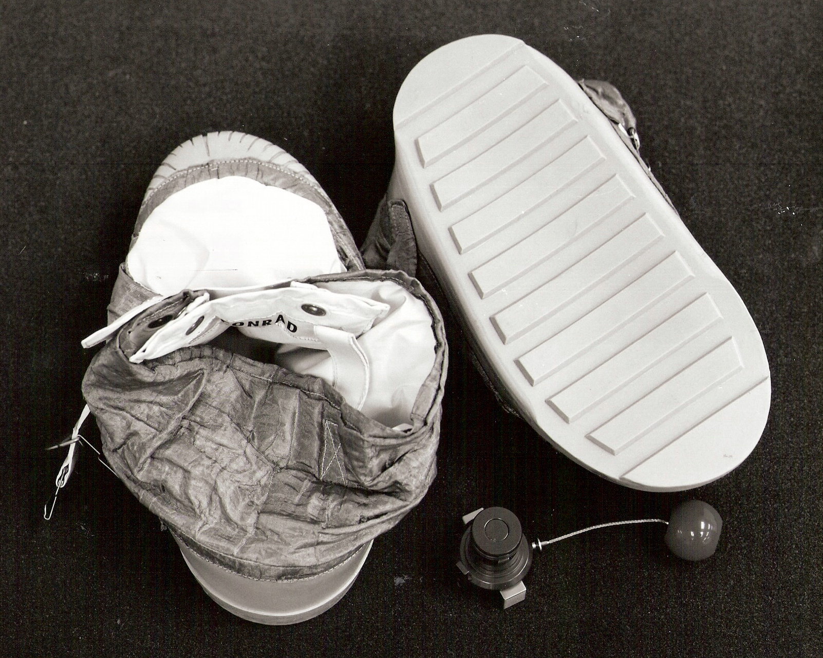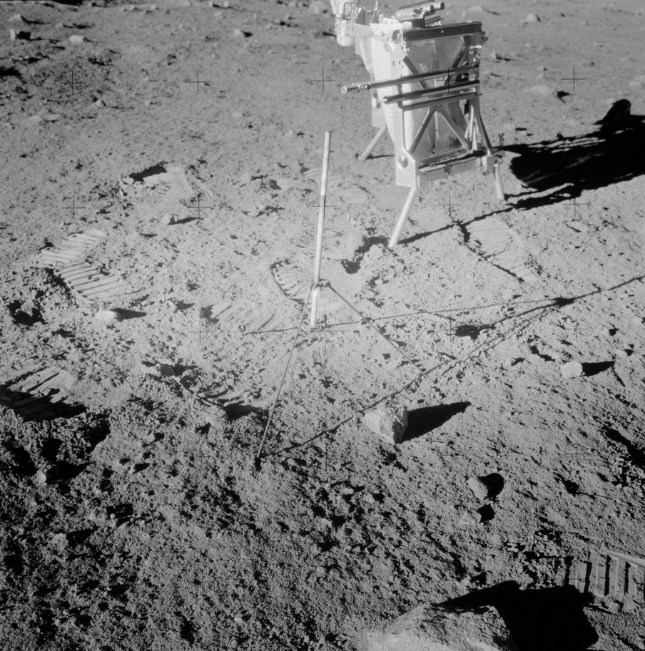 Close-up view of a replica of the plaque which the Apollo 12 astronauts left on the Moon in commemoration of their flight. The plaque was attached to the ladder on a landing gear strut of the Descent Stage of the Apollo 12 Lunar Module, Intrepid.S69-54148 ( 48k )This photo shows Pete Conrad and Al Bean practicing sampling procedures in the Flight Crew Training Building at the Kennedy Space Center. The object in the foreground is a gnomon. The free-swinging vertical element provides a local vertical and a length scale. The flight gnomon had a color/gray-scale on one leg, which the crew oriented toward the Sun. The Hand Tool Carrier (HTC) is between the astronauts. Both Pete and Al are wearing a 70-mm Hasselblad camera mounted on their Remote Control Units (RCUs). On the Moon, one of them would take a "before" documentation photo from the east (up-Sun) and the other would take a "cross-Sun" stereopair from the north or south, stepping sideways between frames. Pete has a pair of long-handled tongs in his left hand and will use them to collect a rock.S69-55362 ( 46k )In this photo, Al is practicing driving a core tube into the lunar surface. The core tube is mounted on the bottom of a re-inforced Extension Handle so that Al can hit the top of the extension handle and drive the core tube all the way into the ground without having to bend over very far. Note that he is hitting the extension handle with the flat side of the hammer. The pressurized suit makes it difficult to deliver an accurate blow and, by using the flat of the hammer, he increases his chances of making contact. Each of the astronauts has two visors in his Lunar Extravehicular Visor Assembly (LEVA) that covers the bubble helmet. The inner visor reduces the light level reaching the astronaut's eyes while the outer visor, which is electroplated with gold, provides UV protection. We can see the edges of both of Pete's visors. Note, also, the cuff checklist on Pete's left wrist. There is a LM mock-up in the background. We are looking at the side of the spacecraft and, behind Al, we can see the open area from which the MESA (hidden from view) has been deployed.S69-55662 ( 74k )During a geology training exercise at Cinder Lake crater field near Sunset Crater, Arizona, Pete Conrad examines the stratigraphy in a crater dug by the USGS with an explosive charge in thick blanket of volcanic ash. 10 October 1969S69-56058 ( 28k )Astronaut Pete Conrad sits in the cockpit of a Lunar Landing Training Vehicle (LLTV) during a lunar simulation flight at Ellington Air Force Base. The LLTV is used to train Apollo crews in lunar landing techniques.S69-56059 ( 0.4 Mb or 1.5 Mb )Astronaut Al Bean participates in lunar surface simulation training in Bldg 29 at the Manned Spacecraft Center. He is strapped into a device called the POGO which supports 5/6th of his weight. The POGO assembly is suspended from a centrifuge arm so that Bean can run around the outer edge of the centrifuge chamber on a simulated lunar surface. The astronauts who used the facility in this way described it as a useful simulation. 24-25 October 1969. Scan courtesy Susan Erskine at NASA Johnson.AS12-51-7478 ( 33k )View of the lunar surface from low orbit.S69-59547 ( 28k )The seismometer reading from the impact made by the LM Ascent Stage when it struck the lunar surface. The impact was registered by the Passive Seismic Experiment Package (PSEP) which was deployed on the Moon by the Apollo 12 astronauts. The LM's Ascent Stage was jettisoned and sent toward impact on the Moon after astronauts Pete Conrad and Al Bean returned to lunar orbit and rejoined astronaut Dick Gordon, in the Command/Service Modules.AS12-57-8448 ( 76k or 216k )Apollo 12 stereo view showing a boot imprint. The exposure was made with an Apollo 35mm stereo close-up camera during extravehicular activity of the Apollo 12 lunar landing mission. The camera was developed to get the highest possible resolution of a small area. Scan by Kipp Teague. Ulli Lotzmann has produced red(left)-blue(right) and green(left)-red(right) stereo-images.AS12-57-8452 ( 34k )Apollo 12 stereo views showing a three-inch square of the lunar surface. Ulli Lotzmann has produced red(left)-blue(right) and green(left)-red(right) stereo-images.AS12-57-8455 ( 38k )Apollo 12 stereo views showing a three-inch square of the lunar surface. Ulli Lotzmann has produced red(left)-blue(right) and green(left)-red(right) stereo-images.Apollo 12 Rock box ( 84k )One of the Apollo 12 Sample Return Containers, probably 1008, is on display at the Smithsonian's National Air and space Museum in Washington D.C. Photo by Ulrich Lotzmann.