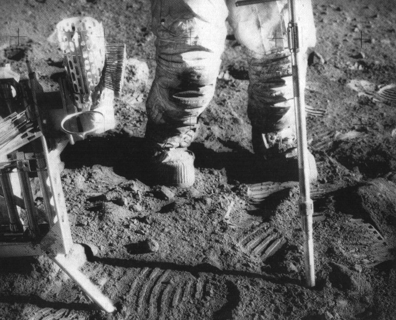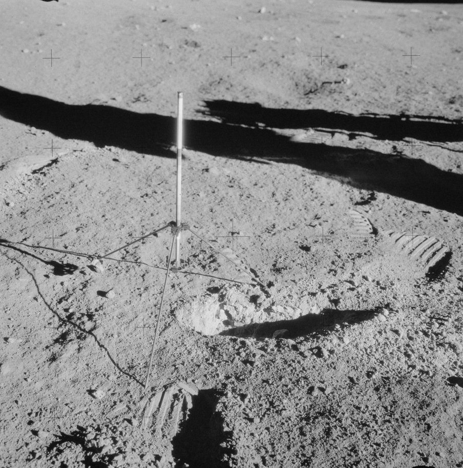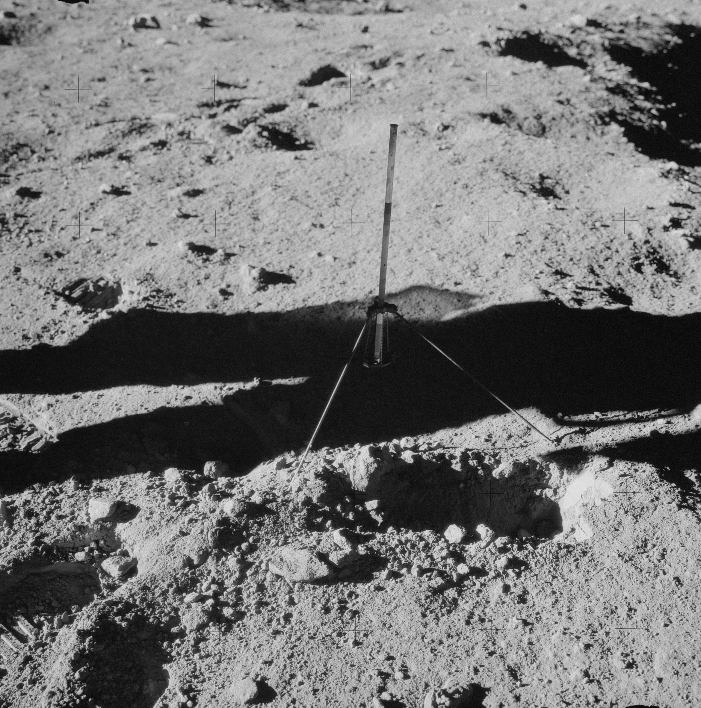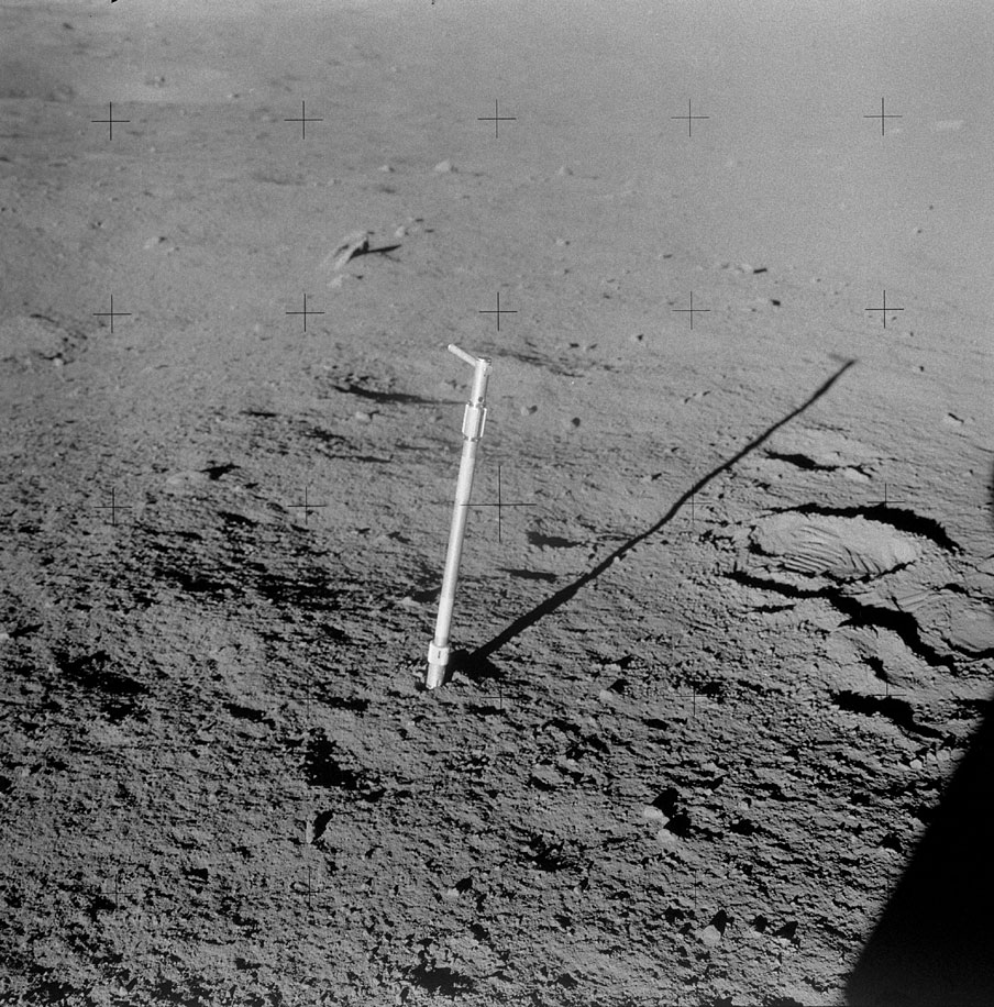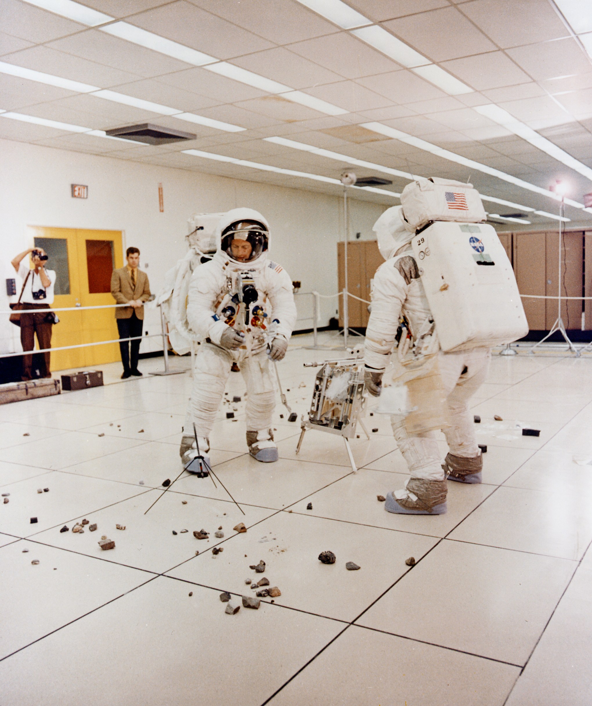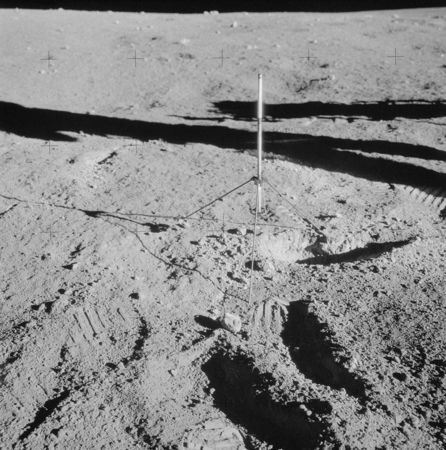 Close-up view of a replica of the plaque which the Apollo 12 astronauts left on the Moon in commemoration of their flight. The plaque was attached to the ladder on a landing gear strut of the Descent Stage of the Apollo 12 Lunar Module, Intrepid.S69-54148 ( 48k )This photo shows Pete Conrad and Al Bean practicing sampling procedures in the Flight Crew Training Building at the Kennedy Space Center. The object in the foreground is a gnomon. The free-swinging vertical element provides a local vertical and a length scale. The flight gnomon had a color/gray-scale on one leg, which the crew oriented toward the Sun. The Hand Tool Carrier (HTC) is between the astronauts. Both Pete and Al are wearing a 70-mm Hasselblad camera mounted on their Remote Control Units (RCUs). On the Moon, one of them would take a "before" documentation photo from the east (up-Sun) and the other would take a "cross-Sun" stereopair from the north or south, stepping sideways between frames. Pete has a pair of long-handled tongs in his left hand and will use them to collect a rock.S69-55362 ( 46k )In this photo, Al is practicing driving a core tube into the lunar surface. The core tube is mounted on the bottom of a re-inforced Extension Handle so that Al can hit the top of the extension handle and drive the core tube all the way into the ground without having to bend over very far. Note that he is hitting the extension handle with the flat side of the hammer. The pressurized suit makes it difficult to deliver an accurate blow and, by using the flat of the hammer, he increases his chances of making contact. Each of the astronauts has two visors in his Lunar Extravehicular Visor Assembly (LEVA) that covers the bubble helmet. The inner visor reduces the light level reaching the astronaut's eyes while the outer visor, which is electroplated with gold, provides UV protection. We can see the edges of both of Pete's visors. Note, also, the cuff checklist on Pete's left wrist. There is a LM mock-up in the background. We are looking at the side of the spacecraft and, behind Al, we can see the open area from which the MESA (hidden from view) has been deployed.S69-55662 ( 74k )During a geology training exercise at Cinder Lake crater field near Sunset Crater, Arizona, Pete Conrad examines the stratigraphy in a crater dug by the USGS with an explosive charge in thick blanket of volcanic ash. 10 October 1969S69-56058 ( 28k )Astronaut Pete Conrad sits in the cockpit of a Lunar Landing Training Vehicle (LLTV) during a lunar simulation flight at Ellington Air Force Base. The LLTV is used to train Apollo crews in lunar landing techniques.S69-56059 ( 0.4 Mb or 1.5 Mb )Astronaut Al Bean participates in lunar surface simulation training in Bldg 29 at the Manned Spacecraft Center. He is strapped into a device called the POGO which supports 5/6th of his weight. The POGO assembly is suspended from a centrifuge arm so that Bean can run around the outer edge of the centrifuge chamber on a simulated lunar surface. The astronauts who used the facility in this way described it as a useful simulation. 24-25 October 1969. Scan courtesy Susan Erskine at NASA Johnson.AS12-51-7478 ( 33k )View of the lunar surface from low orbit.S69-59547 ( 28k )The seismometer reading from the impact made by the LM Ascent Stage when it struck the lunar surface. The impact was registered by the Passive Seismic Experiment Package (PSEP) which was deployed on the Moon by the Apollo 12 astronauts. The LM's Ascent Stage was jettisoned and sent toward impact on the Moon after astronauts Pete Conrad and Al Bean returned to lunar orbit and rejoined astronaut Dick Gordon, in the Command/Service Modules.AS12-57-8448 ( 76k or 216k )Apollo 12 stereo view showing a boot imprint. The exposure was made with an Apollo 35mm stereo close-up camera during extravehicular activity of the Apollo 12 lunar landing mission. The camera was developed to get the highest possible resolution of a small area. Scan by Kipp Teague. Ulli Lotzmann has produced red(left)-blue(right) and green(left)-red(right) stereo-images.AS12-57-8452 ( 34k )Apollo 12 stereo views showing a three-inch square of the lunar surface. Ulli Lotzmann has produced red(left)-blue(right) and green(left)-red(right) stereo-images.AS12-57-8455 ( 38k )Apollo 12 stereo views showing a three-inch square of the lunar surface. Ulli Lotzmann has produced red(left)-blue(right) and green(left)-red(right) stereo-images.Apollo 12 Rock box ( 84k )One of the Apollo 12 Sample Return Containers, probably 1008, is on display at the Smithsonian's National Air and space Museum in Washington D.C. Photo by Ulrich Lotzmann.