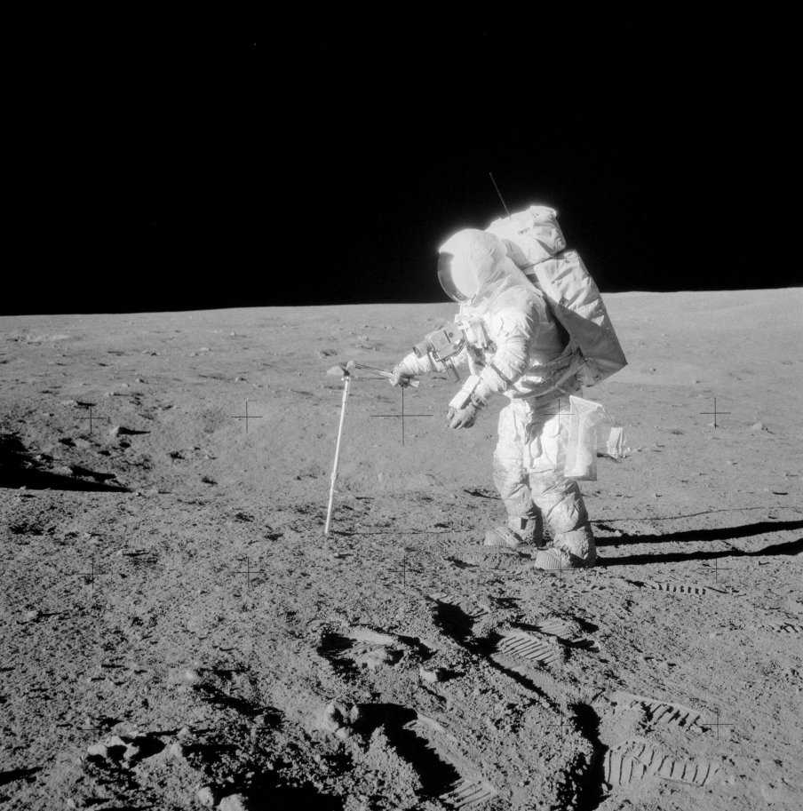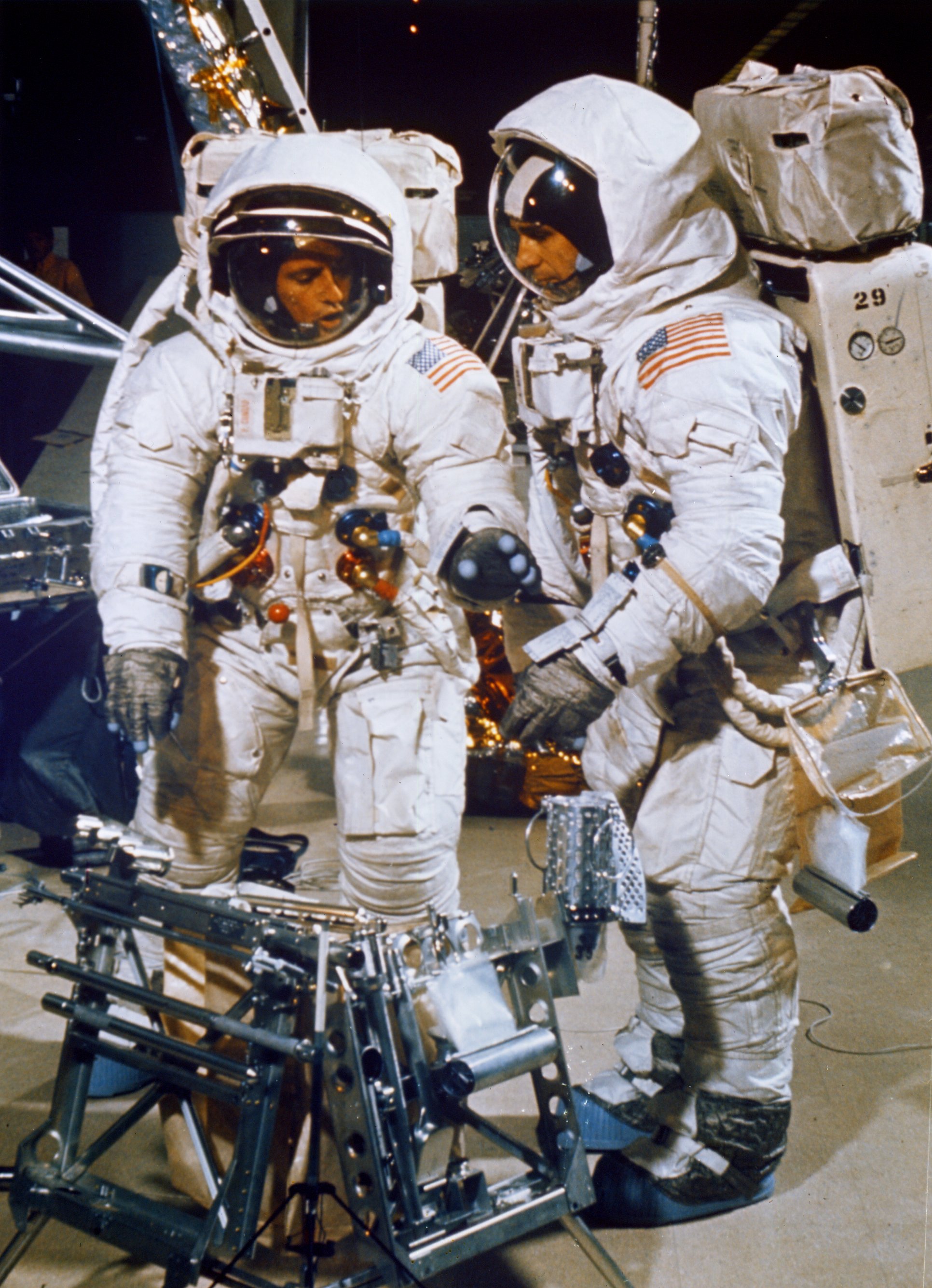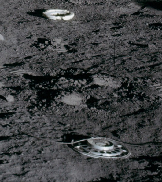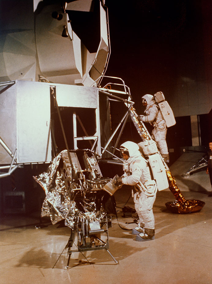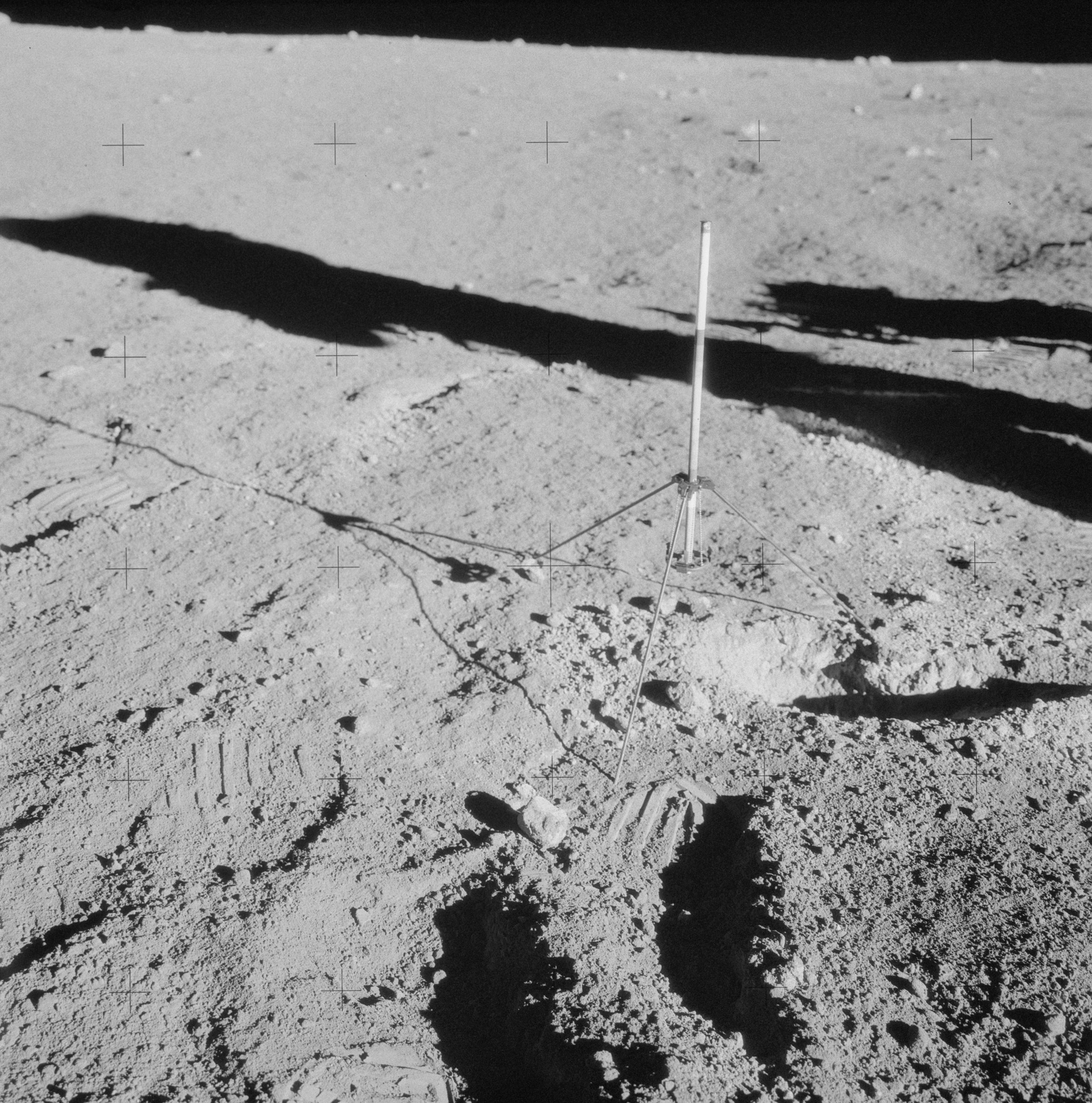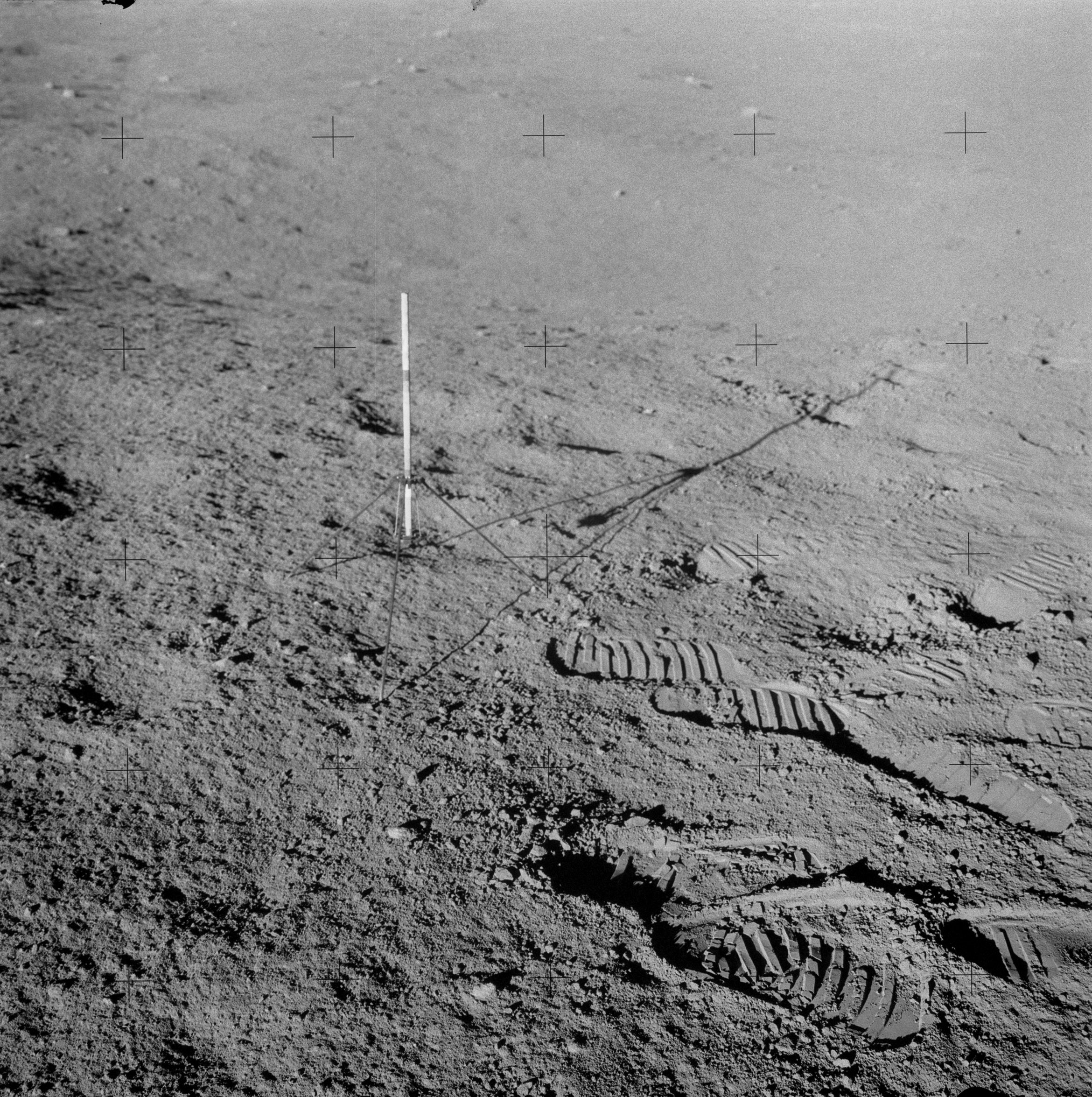 Close-up view of a replica of the plaque which the Apollo 12 astronauts left on the Moon in commemoration of their flight. The plaque was attached to the ladder on a landing gear strut of the Descent Stage of the Apollo 12 Lunar Module, Intrepid.S69-54148 ( 48k )This photo shows Pete Conrad and Al Bean practicing sampling procedures in the Flight Crew Training Building at the Kennedy Space Center. The object in the foreground is a gnomon. The free-swinging vertical element provides a local vertical and a length scale. The flight gnomon had a color/gray-scale on one leg, which the crew oriented toward the Sun. The Hand Tool Carrier (HTC) is between the astronauts. Both Pete and Al are wearing a 70-mm Hasselblad camera mounted on their Remote Control Units (RCUs). On the Moon, one of them would take a "before" documentation photo from the east (up-Sun) and the other would take a "cross-Sun" stereopair from the north or south, stepping sideways between frames. Pete has a pair of long-handled tongs in his left hand and will use them to collect a rock.S69-55362 ( 46k )In this photo, Al is practicing driving a core tube into the lunar surface. The core tube is mounted on the bottom of a re-inforced Extension Handle so that Al can hit the top of the extension handle and drive the core tube all the way into the ground without having to bend over very far. Note that he is hitting the extension handle with the flat side of the hammer. The pressurized suit makes it difficult to deliver an accurate blow and, by using the flat of the hammer, he increases his chances of making contact. Each of the astronauts has two visors in his Lunar Extravehicular Visor Assembly (LEVA) that covers the bubble helmet. The inner visor reduces the light level reaching the astronaut's eyes while the outer visor, which is electroplated with gold, provides UV protection. We can see the edges of both of Pete's visors. Note, also, the cuff checklist on Pete's left wrist. There is a LM mock-up in the background. We are looking at the side of the spacecraft and, behind Al, we can see the open area from which the MESA (hidden from view) has been deployed.S69-55662 ( 74k )During a geology training exercise at Cinder Lake crater field near Sunset Crater, Arizona, Pete Conrad examines the stratigraphy in a crater dug by the USGS with an explosive charge in thick blanket of volcanic ash. 10 October 1969S69-56058 ( 28k )Astronaut Pete Conrad sits in the cockpit of a Lunar Landing Training Vehicle (LLTV) during a lunar simulation flight at Ellington Air Force Base. The LLTV is used to train Apollo crews in lunar landing techniques.S69-56059 ( 0.4 Mb or 1.5 Mb )Astronaut Al Bean participates in lunar surface simulation training in Bldg 29 at the Manned Spacecraft Center. He is strapped into a device called the POGO which supports 5/6th of his weight. The POGO assembly is suspended from a centrifuge arm so that Bean can run around the outer edge of the centrifuge chamber on a simulated lunar surface. The astronauts who used the facility in this way described it as a useful simulation. 24-25 October 1969. Scan courtesy Susan Erskine at NASA Johnson.AS12-51-7478 ( 33k )View of the lunar surface from low orbit.S69-59547 ( 28k )The seismometer reading from the impact made by the LM Ascent Stage when it struck the lunar surface. The impact was registered by the Passive Seismic Experiment Package (PSEP) which was deployed on the Moon by the Apollo 12 astronauts. The LM's Ascent Stage was jettisoned and sent toward impact on the Moon after astronauts Pete Conrad and Al Bean returned to lunar orbit and rejoined astronaut Dick Gordon, in the Command/Service Modules.AS12-57-8448 ( 76k or 216k )Apollo 12 stereo view showing a boot imprint. The exposure was made with an Apollo 35mm stereo close-up camera during extravehicular activity of the Apollo 12 lunar landing mission. The camera was developed to get the highest possible resolution of a small area. Scan by Kipp Teague. Ulli Lotzmann has produced red(left)-blue(right) and green(left)-red(right) stereo-images.AS12-57-8452 ( 34k )Apollo 12 stereo views showing a three-inch square of the lunar surface. Ulli Lotzmann has produced red(left)-blue(right) and green(left)-red(right) stereo-images.AS12-57-8455 ( 38k )Apollo 12 stereo views showing a three-inch square of the lunar surface. Ulli Lotzmann has produced red(left)-blue(right) and green(left)-red(right) stereo-images.Apollo 12 Rock box ( 84k )One of the Apollo 12 Sample Return Containers, probably 1008, is on display at the Smithsonian's National Air and space Museum in Washington D.C. Photo by Ulrich Lotzmann.