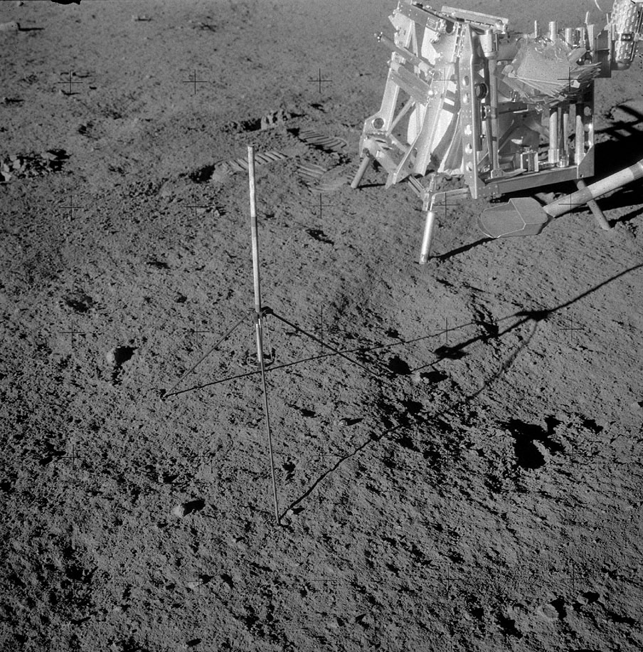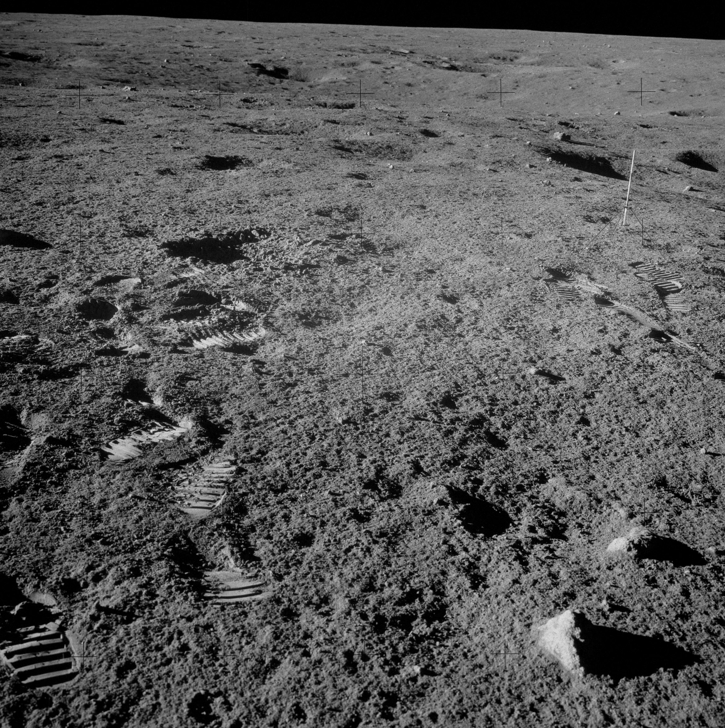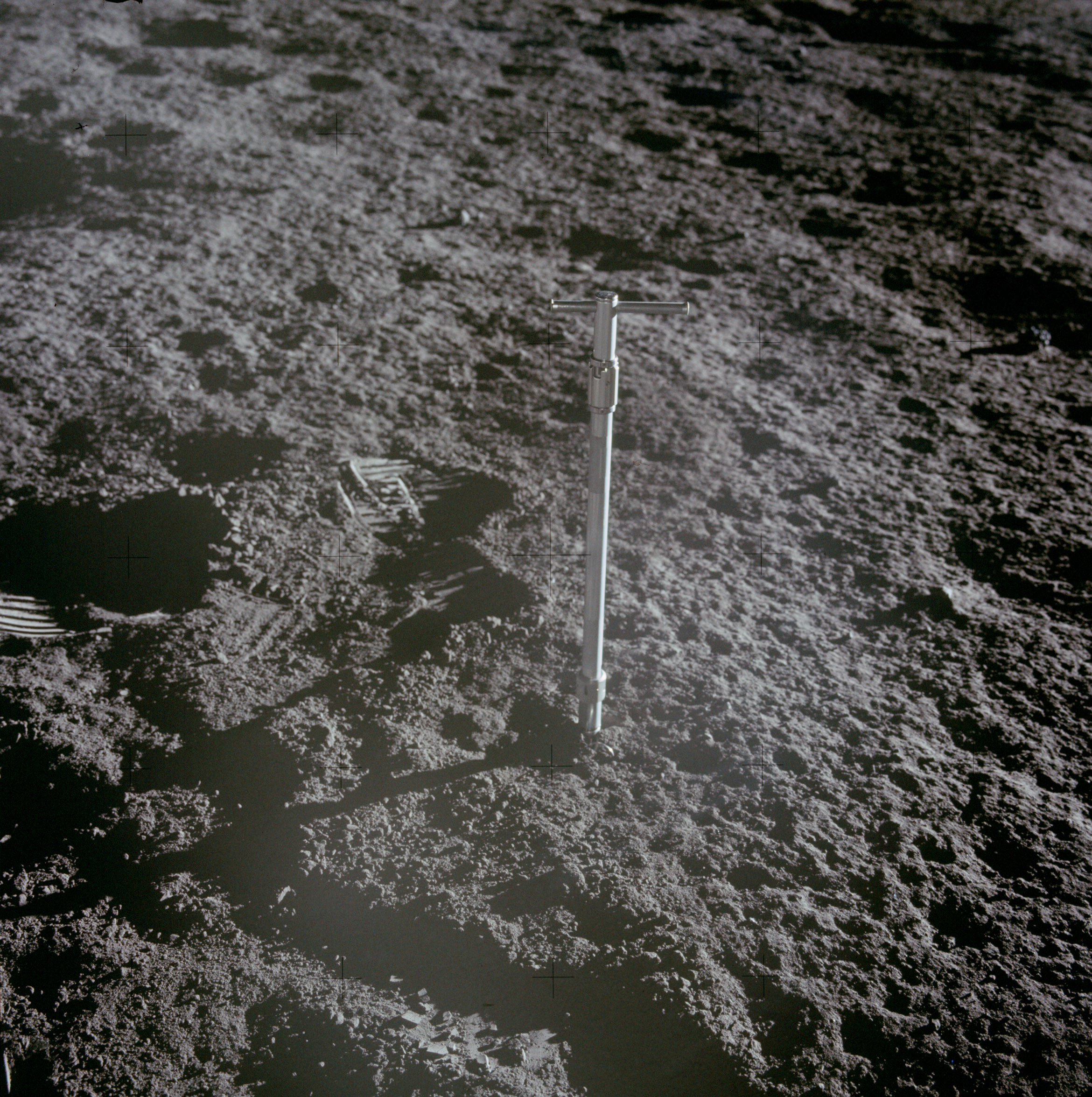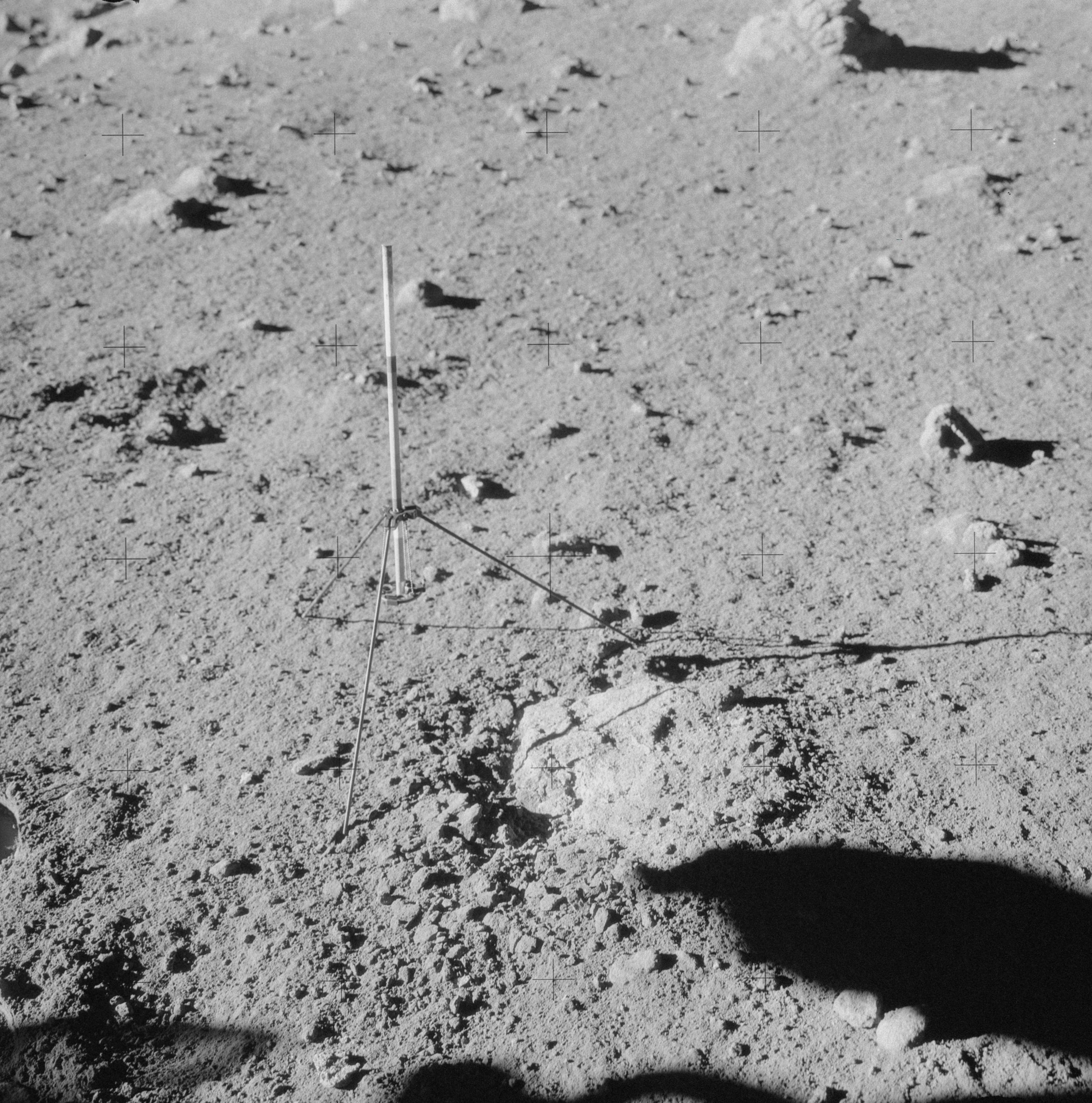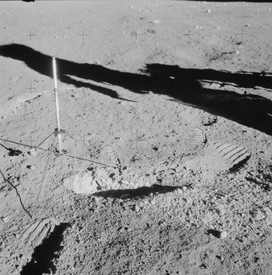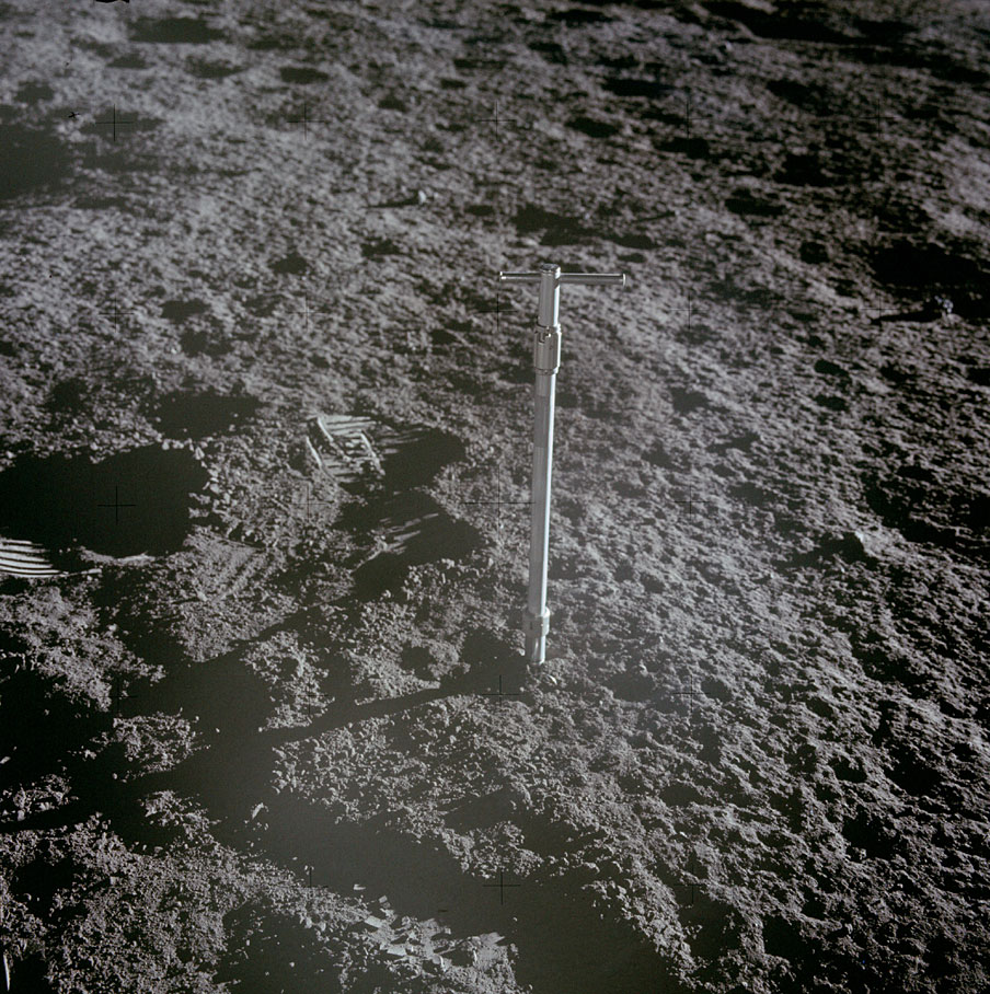 Close-up view of a replica of the plaque which the Apollo 12 astronauts left on the Moon in commemoration of their flight. The plaque was attached to the ladder on a landing gear strut of the Descent Stage of the Apollo 12 Lunar Module, Intrepid.S69-54148 ( 48k )This photo shows Pete Conrad and Al Bean practicing sampling procedures in the Flight Crew Training Building at the Kennedy Space Center. The object in the foreground is a gnomon. The free-swinging vertical element provides a local vertical and a length scale. The flight gnomon had a color/gray-scale on one leg, which the crew oriented toward the Sun. The Hand Tool Carrier (HTC) is between the astronauts. Both Pete and Al are wearing a 70-mm Hasselblad camera mounted on their Remote Control Units (RCUs). On the Moon, one of them would take a "before" documentation photo from the east (up-Sun) and the other would take a "cross-Sun" stereopair from the north or south, stepping sideways between frames. Pete has a pair of long-handled tongs in his left hand and will use them to collect a rock.S69-55362 ( 46k )In this photo, Al is practicing driving a core tube into the lunar surface. The core tube is mounted on the bottom of a re-inforced Extension Handle so that Al can hit the top of the extension handle and drive the core tube all the way into the ground without having to bend over very far. Note that he is hitting the extension handle with the flat side of the hammer. The pressurized suit makes it difficult to deliver an accurate blow and, by using the flat of the hammer, he increases his chances of making contact. Each of the astronauts has two visors in his Lunar Extravehicular Visor Assembly (LEVA) that covers the bubble helmet. The inner visor reduces the light level reaching the astronaut's eyes while the outer visor, which is electroplated with gold, provides UV protection. We can see the edges of both of Pete's visors. Note, also, the cuff checklist on Pete's left wrist. There is a LM mock-up in the background. We are looking at the side of the spacecraft and, behind Al, we can see the open area from which the MESA (hidden from view) has been deployed.S69-55662 ( 74k )During a geology training exercise at Cinder Lake crater field near Sunset Crater, Arizona, Pete Conrad examines the stratigraphy in a crater dug by the USGS with an explosive charge in thick blanket of volcanic ash. 10 October 1969S69-56058 ( 28k )Astronaut Pete Conrad sits in the cockpit of a Lunar Landing Training Vehicle (LLTV) during a lunar simulation flight at Ellington Air Force Base. The LLTV is used to train Apollo crews in lunar landing techniques.S69-56059 ( 0.4 Mb or 1.5 Mb )Astronaut Al Bean participates in lunar surface simulation training in Bldg 29 at the Manned Spacecraft Center. He is strapped into a device called the POGO which supports 5/6th of his weight. The POGO assembly is suspended from a centrifuge arm so that Bean can run around the outer edge of the centrifuge chamber on a simulated lunar surface. The astronauts who used the facility in this way described it as a useful simulation. 24-25 October 1969. Scan courtesy Susan Erskine at NASA Johnson.AS12-51-7478 ( 33k )View of the lunar surface from low orbit.S69-59547 ( 28k )The seismometer reading from the impact made by the LM Ascent Stage when it struck the lunar surface. The impact was registered by the Passive Seismic Experiment Package (PSEP) which was deployed on the Moon by the Apollo 12 astronauts. The LM's Ascent Stage was jettisoned and sent toward impact on the Moon after astronauts Pete Conrad and Al Bean returned to lunar orbit and rejoined astronaut Dick Gordon, in the Command/Service Modules.AS12-57-8448 ( 76k or 216k )Apollo 12 stereo view showing a boot imprint. The exposure was made with an Apollo 35mm stereo close-up camera during extravehicular activity of the Apollo 12 lunar landing mission. The camera was developed to get the highest possible resolution of a small area. Scan by Kipp Teague. Ulli Lotzmann has produced red(left)-blue(right) and green(left)-red(right) stereo-images.AS12-57-8452 ( 34k )Apollo 12 stereo views showing a three-inch square of the lunar surface. Ulli Lotzmann has produced red(left)-blue(right) and green(left)-red(right) stereo-images.AS12-57-8455 ( 38k )Apollo 12 stereo views showing a three-inch square of the lunar surface. Ulli Lotzmann has produced red(left)-blue(right) and green(left)-red(right) stereo-images.Apollo 12 Rock box ( 84k )One of the Apollo 12 Sample Return Containers, probably 1008, is on display at the Smithsonian's National Air and space Museum in Washington D.C. Photo by Ulrich Lotzmann.
