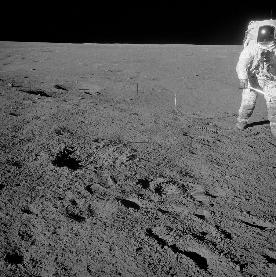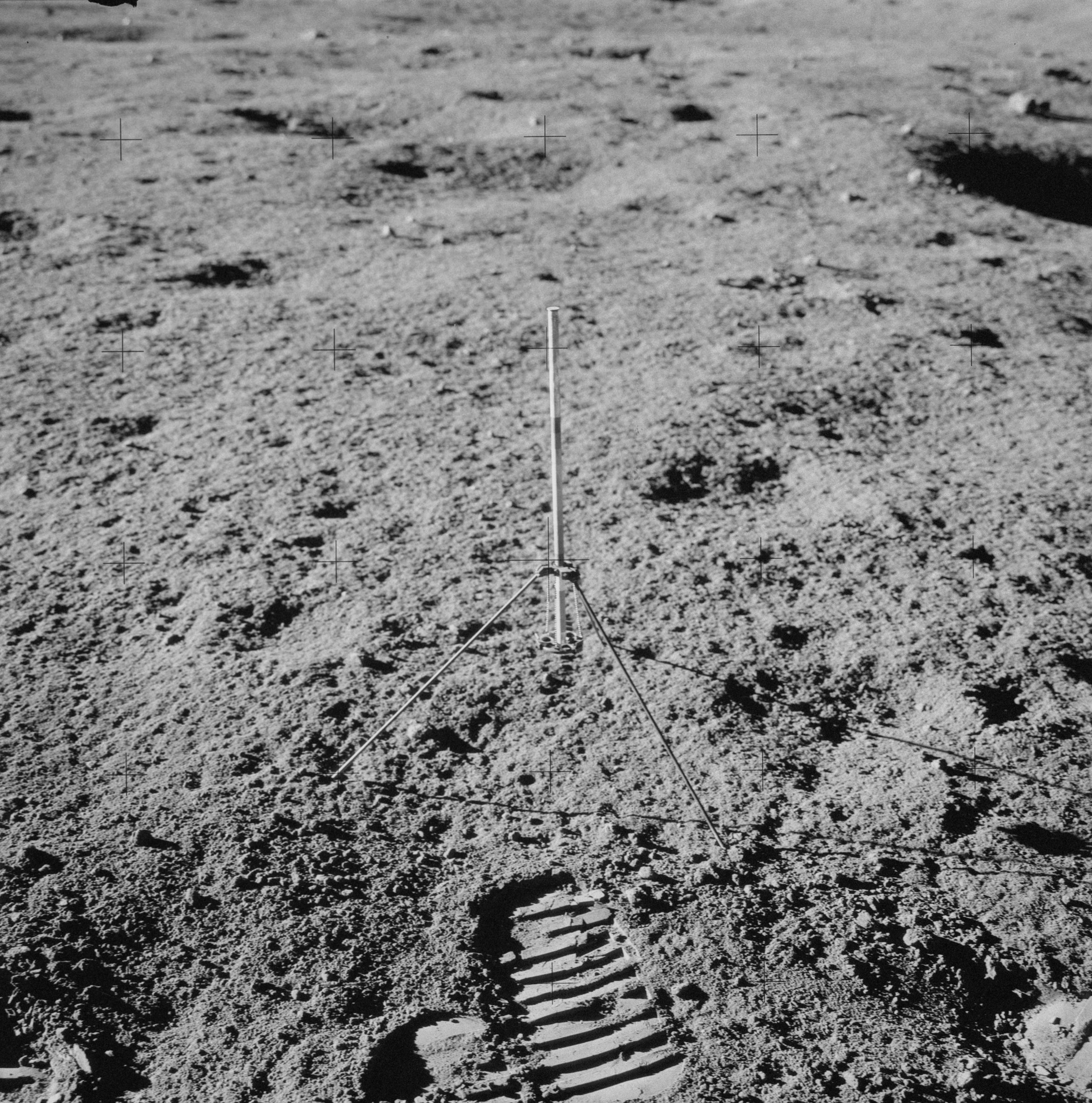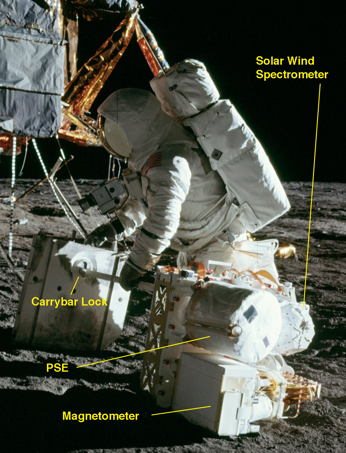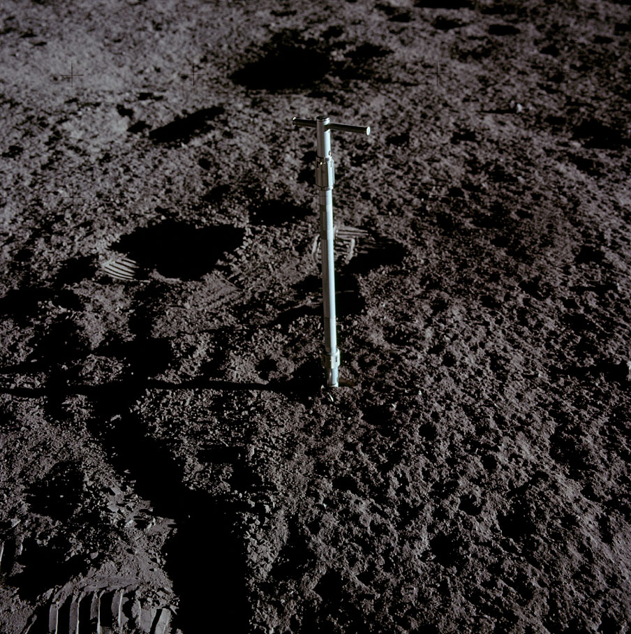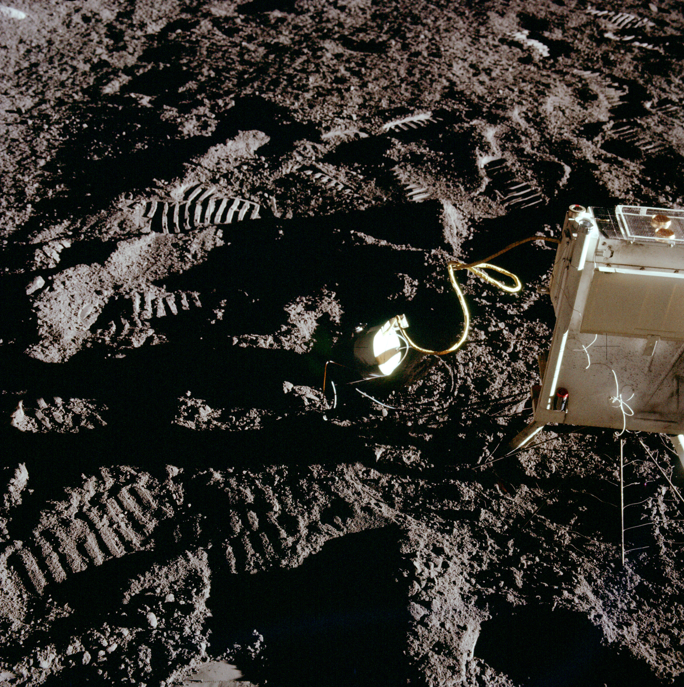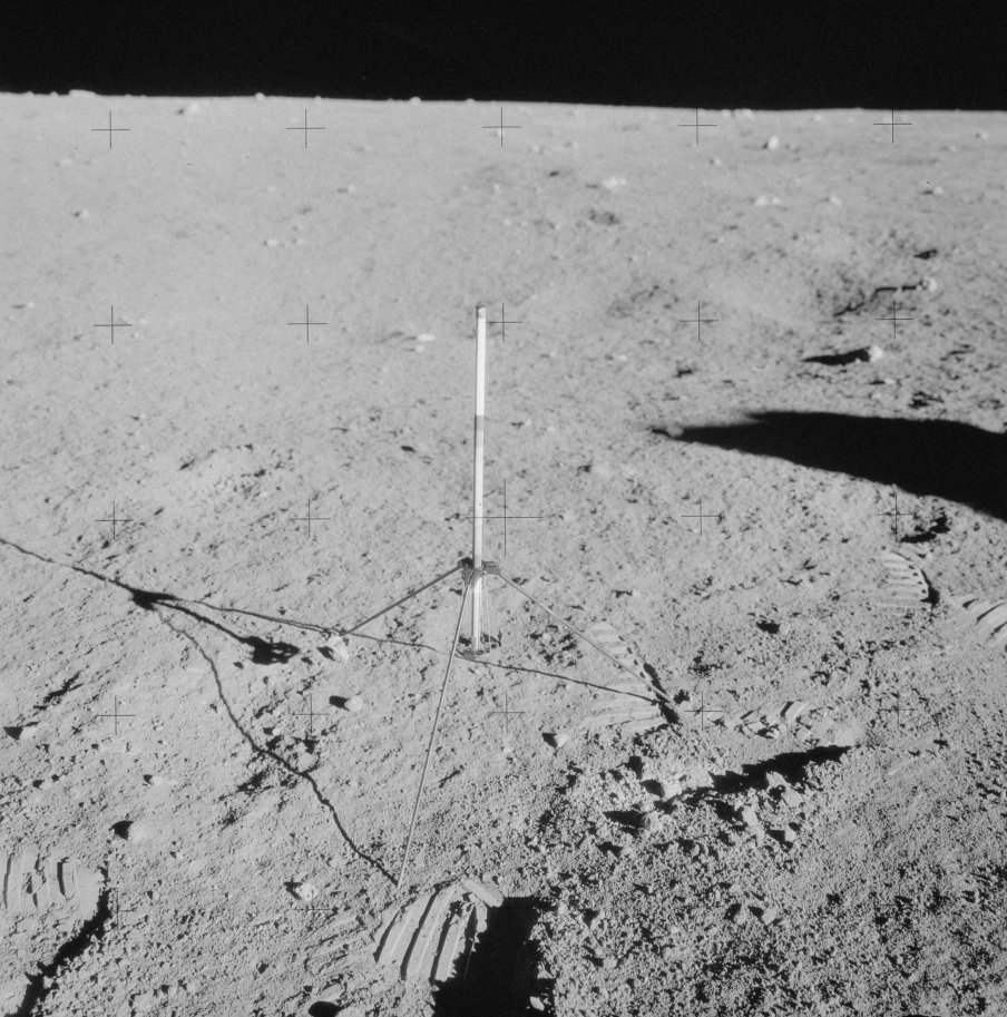 Close-up view of a replica of the plaque which the Apollo 12 astronauts left on the Moon in commemoration of their flight. The plaque was attached to the ladder on a landing gear strut of the Descent Stage of the Apollo 12 Lunar Module, Intrepid.S69-54148 ( 48k )This photo shows Pete Conrad and Al Bean practicing sampling procedures in the Flight Crew Training Building at the Kennedy Space Center. The object in the foreground is a gnomon. The free-swinging vertical element provides a local vertical and a length scale. The flight gnomon had a color/gray-scale on one leg, which the crew oriented toward the Sun. The Hand Tool Carrier (HTC) is between the astronauts. Both Pete and Al are wearing a 70-mm Hasselblad camera mounted on their Remote Control Units (RCUs). On the Moon, one of them would take a "before" documentation photo from the east (up-Sun) and the other would take a "cross-Sun" stereopair from the north or south, stepping sideways between frames. Pete has a pair of long-handled tongs in his left hand and will use them to collect a rock.S69-55362 ( 46k )In this photo, Al is practicing driving a core tube into the lunar surface. The core tube is mounted on the bottom of a re-inforced Extension Handle so that Al can hit the top of the extension handle and drive the core tube all the way into the ground without having to bend over very far. Note that he is hitting the extension handle with the flat side of the hammer. The pressurized suit makes it difficult to deliver an accurate blow and, by using the flat of the hammer, he increases his chances of making contact. Each of the astronauts has two visors in his Lunar Extravehicular Visor Assembly (LEVA) that covers the bubble helmet. The inner visor reduces the light level reaching the astronaut's eyes while the outer visor, which is electroplated with gold, provides UV protection. We can see the edges of both of Pete's visors. Note, also, the cuff checklist on Pete's left wrist. There is a LM mock-up in the background. We are looking at the side of the spacecraft and, behind Al, we can see the open area from which the MESA (hidden from view) has been deployed.S69-55662 ( 74k )During a geology training exercise at Cinder Lake crater field near Sunset Crater, Arizona, Pete Conrad examines the stratigraphy in a crater dug by the USGS with an explosive charge in thick blanket of volcanic ash. 10 October 1969S69-56058 ( 28k )Astronaut Pete Conrad sits in the cockpit of a Lunar Landing Training Vehicle (LLTV) during a lunar simulation flight at Ellington Air Force Base. The LLTV is used to train Apollo crews in lunar landing techniques.S69-56059 ( 0.4 Mb or 1.5 Mb )Astronaut Al Bean participates in lunar surface simulation training in Bldg 29 at the Manned Spacecraft Center. He is strapped into a device called the POGO which supports 5/6th of his weight. The POGO assembly is suspended from a centrifuge arm so that Bean can run around the outer edge of the centrifuge chamber on a simulated lunar surface. The astronauts who used the facility in this way described it as a useful simulation. 24-25 October 1969. Scan courtesy Susan Erskine at NASA Johnson.AS12-51-7478 ( 33k )View of the lunar surface from low orbit.S69-59547 ( 28k )The seismometer reading from the impact made by the LM Ascent Stage when it struck the lunar surface. The impact was registered by the Passive Seismic Experiment Package (PSEP) which was deployed on the Moon by the Apollo 12 astronauts. The LM's Ascent Stage was jettisoned and sent toward impact on the Moon after astronauts Pete Conrad and Al Bean returned to lunar orbit and rejoined astronaut Dick Gordon, in the Command/Service Modules.AS12-57-8448 ( 76k or 216k )Apollo 12 stereo view showing a boot imprint. The exposure was made with an Apollo 35mm stereo close-up camera during extravehicular activity of the Apollo 12 lunar landing mission. The camera was developed to get the highest possible resolution of a small area. Scan by Kipp Teague. Ulli Lotzmann has produced red(left)-blue(right) and green(left)-red(right) stereo-images.AS12-57-8452 ( 34k )Apollo 12 stereo views showing a three-inch square of the lunar surface. Ulli Lotzmann has produced red(left)-blue(right) and green(left)-red(right) stereo-images.AS12-57-8455 ( 38k )Apollo 12 stereo views showing a three-inch square of the lunar surface. Ulli Lotzmann has produced red(left)-blue(right) and green(left)-red(right) stereo-images.Apollo 12 Rock box ( 84k )One of the Apollo 12 Sample Return Containers, probably 1008, is on display at the Smithsonian's National Air and space Museum in Washington D.C. Photo by Ulrich Lotzmann.