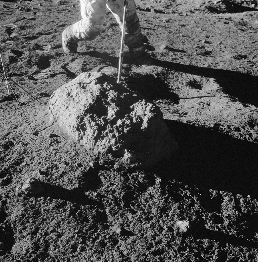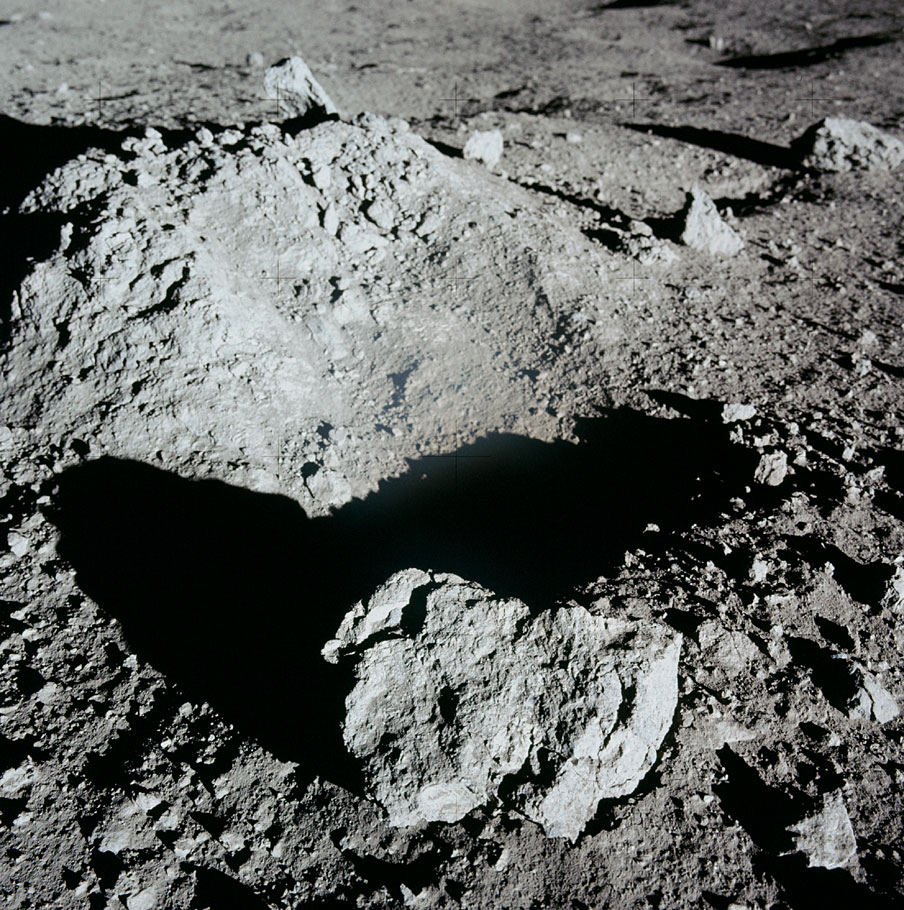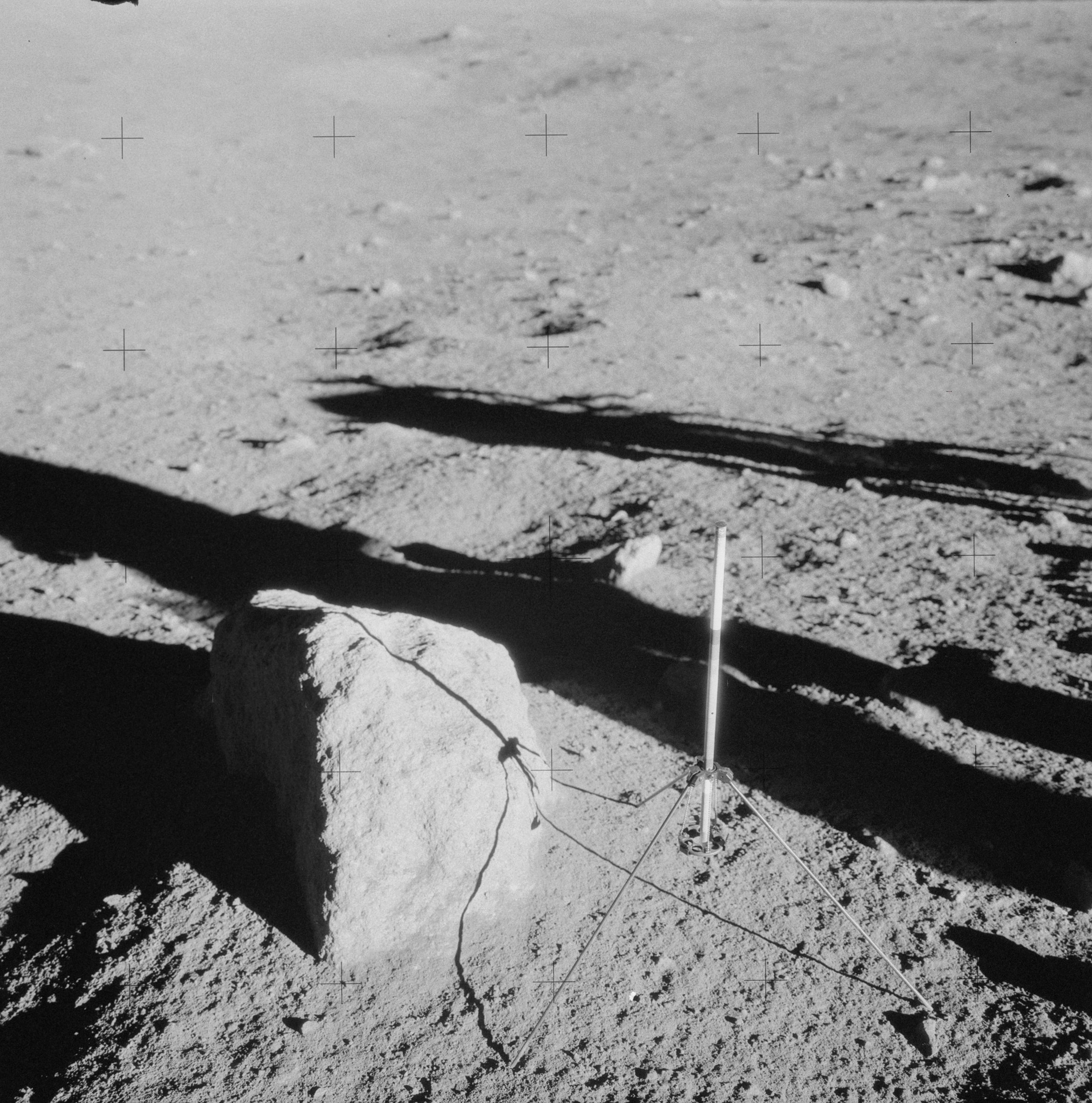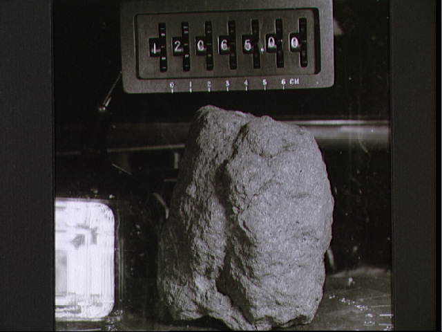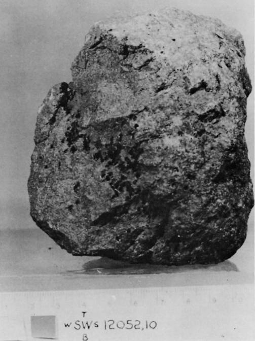 Sample 12052 is a 1.9 kilogram piece of olivine basalt that Al noticed at 132:33:20 during the run from Head Crater to Bench Crater. Scan courtesy Harald Kucharek.Sample 12054, S69-62793 (1.4 Mb)