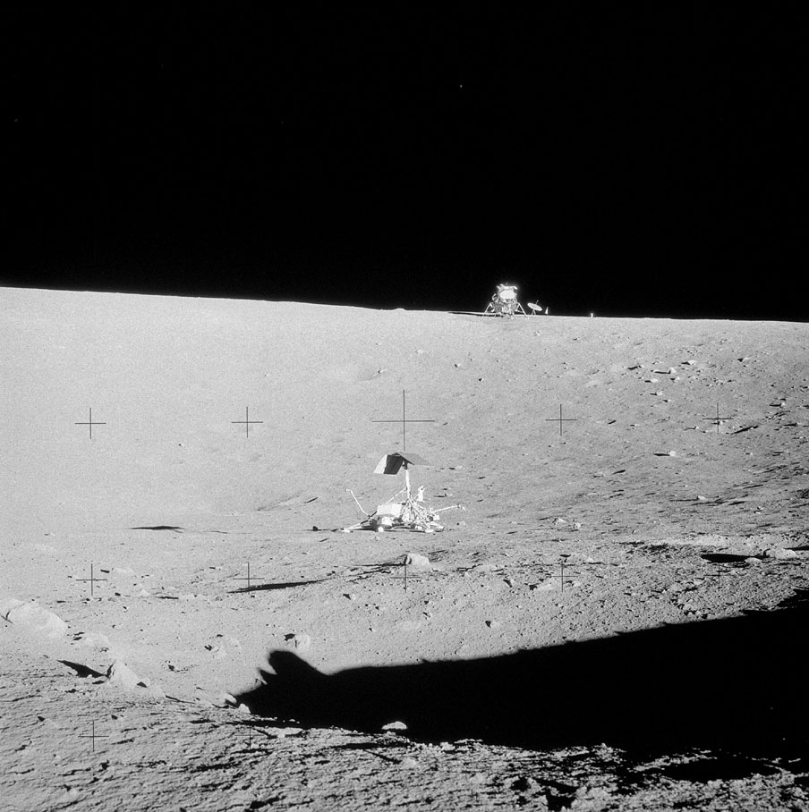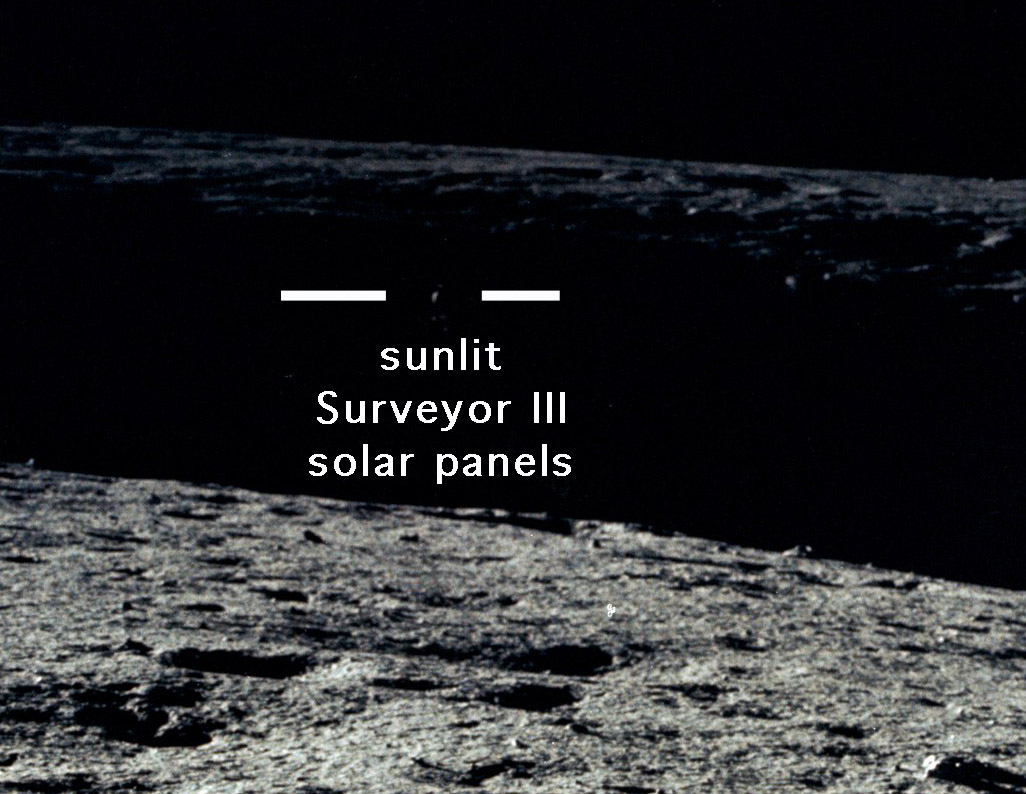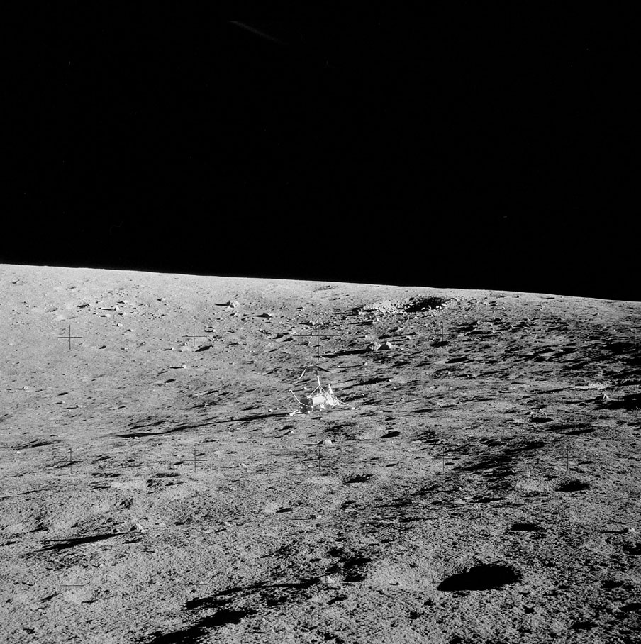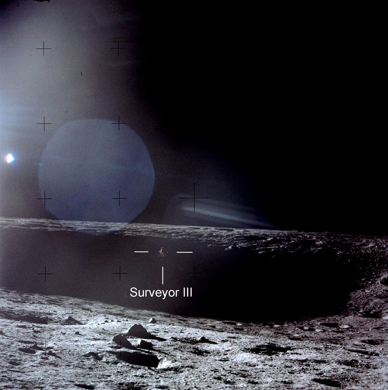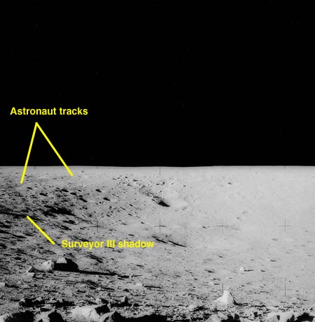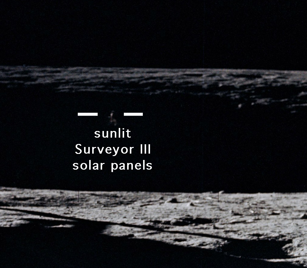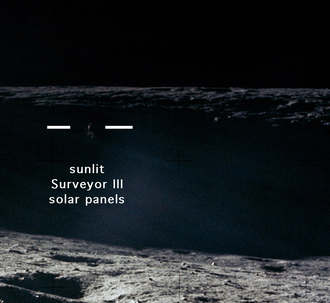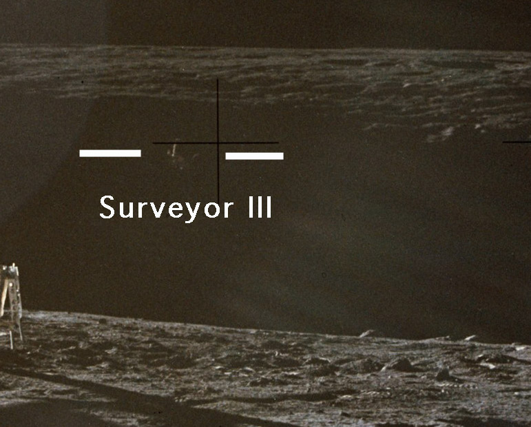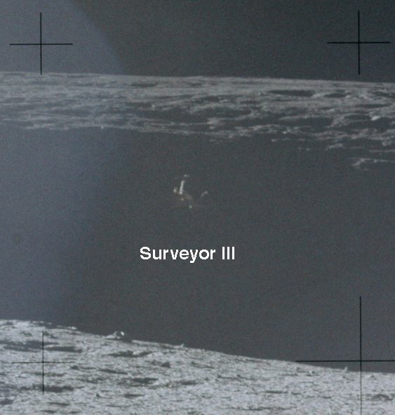 Dick Gordon spotted both the LM and Surveyor III on the surface, using the Command Module sextant during his pass over the landing site at 114:22:28. At Houston's suggestion, he used the DAC to film his next pass and this is a frame from that film sequence. At that time, the solar elevation was about 8.1 degrees and the LM sahdow about 160 feet. Ulli Lotzmann provided the frame and a labeled version.