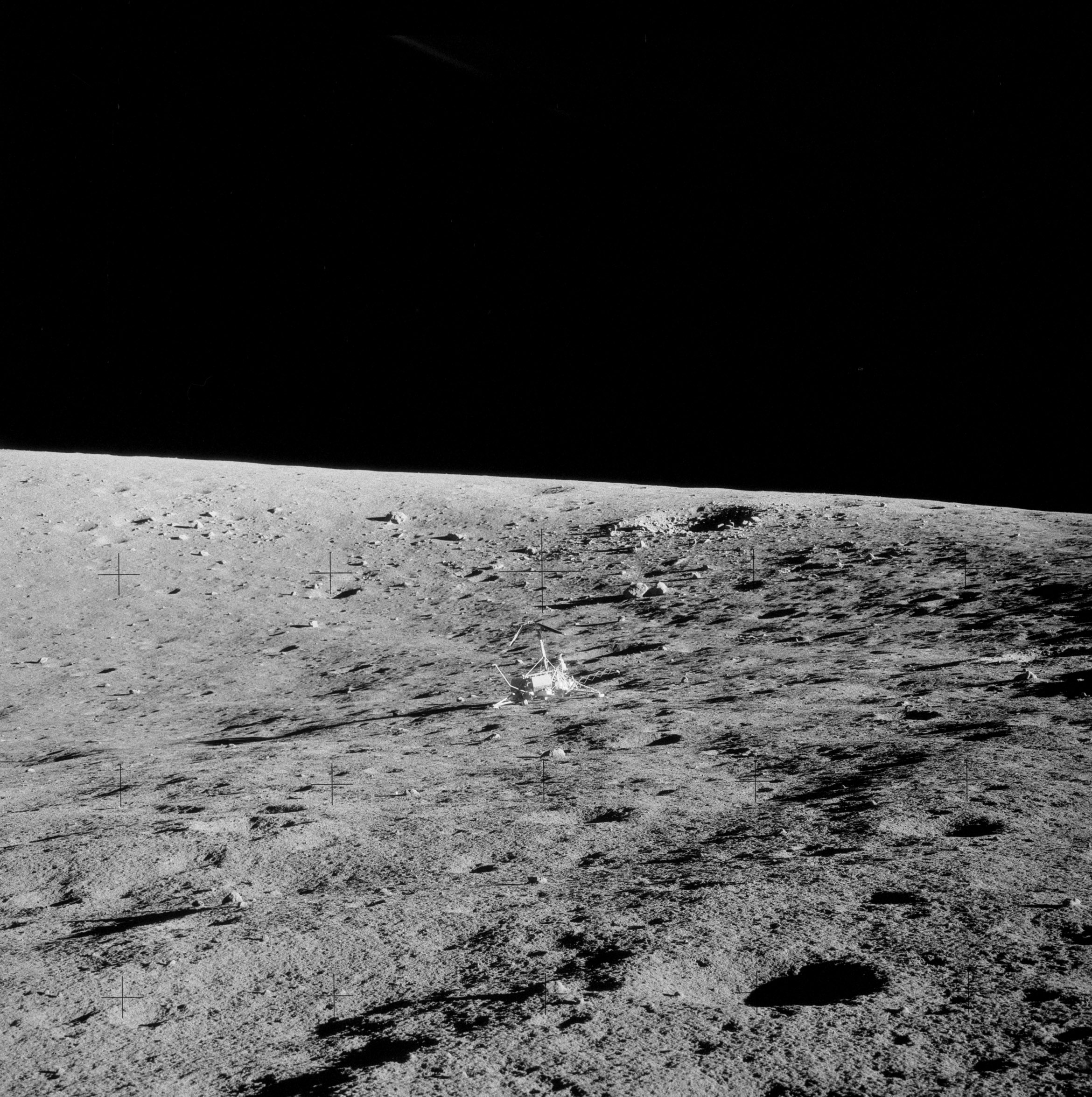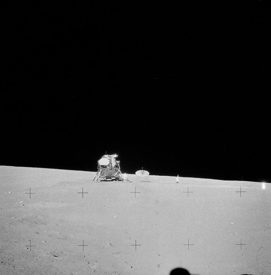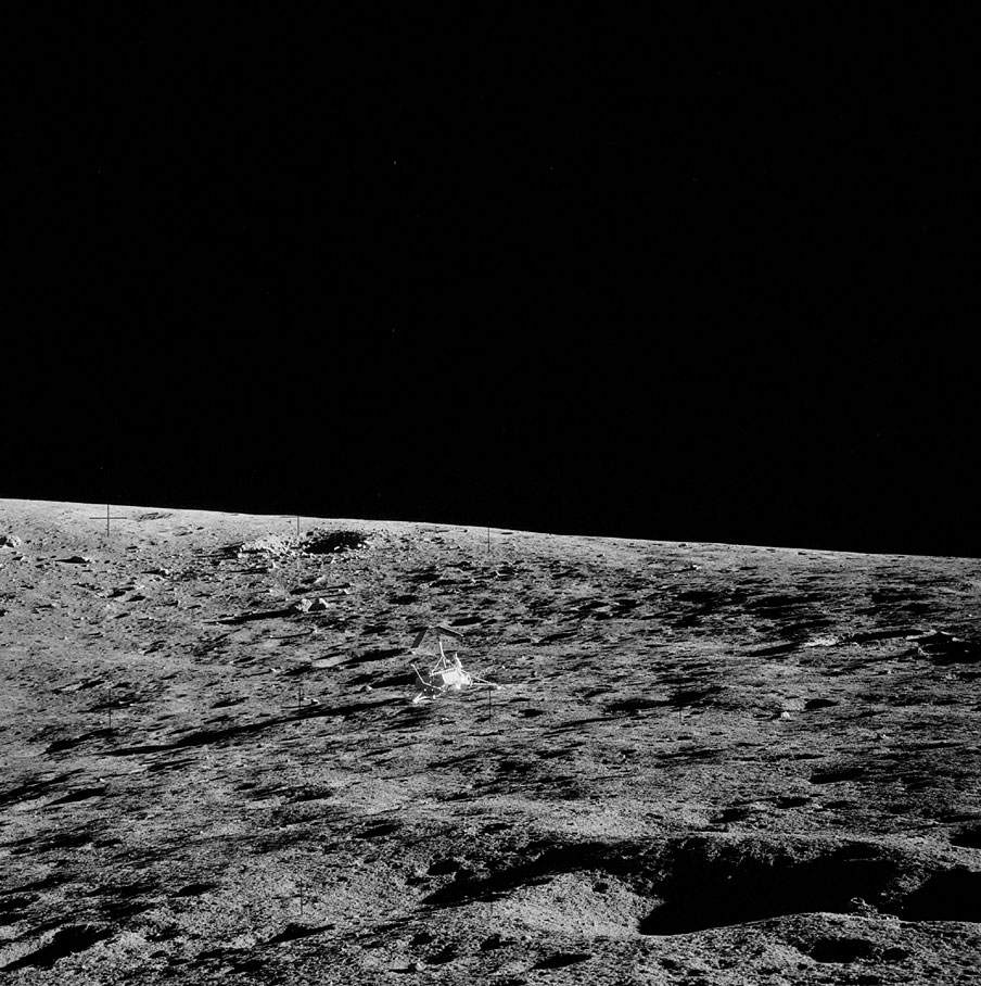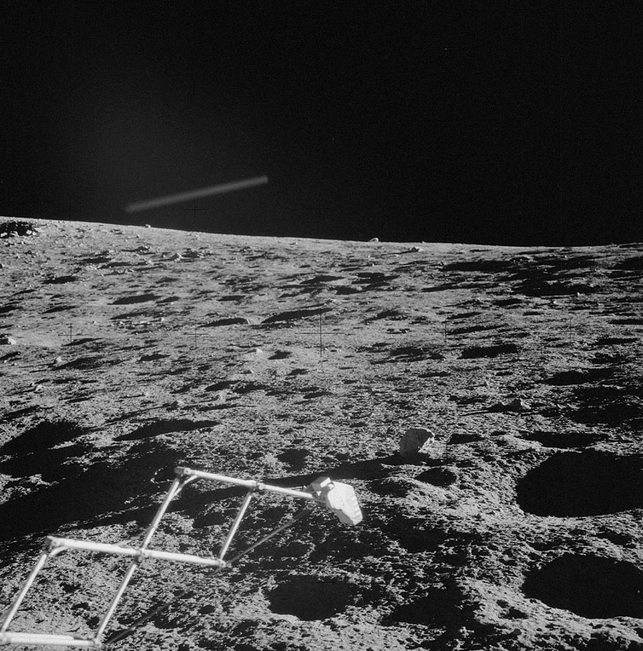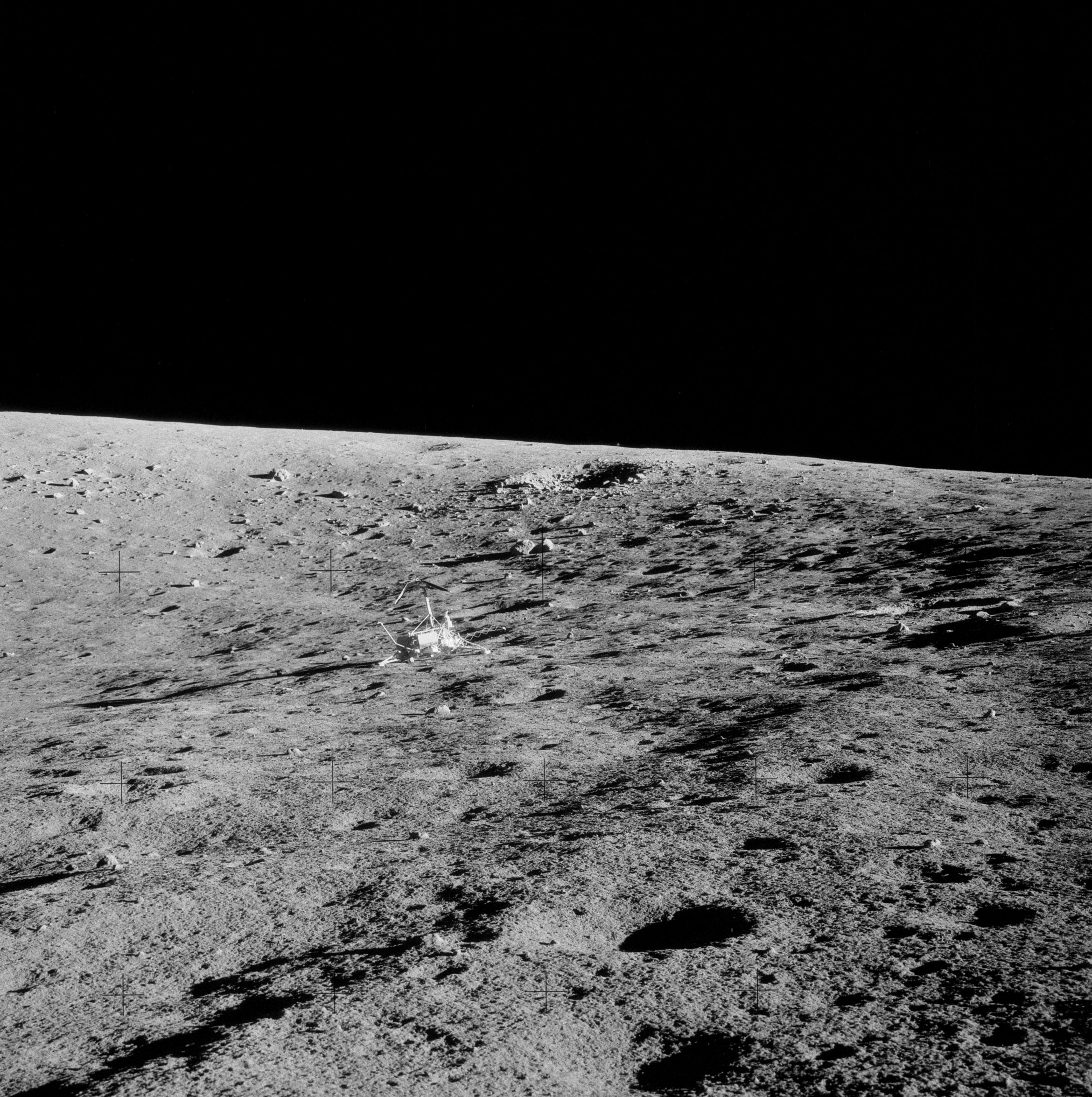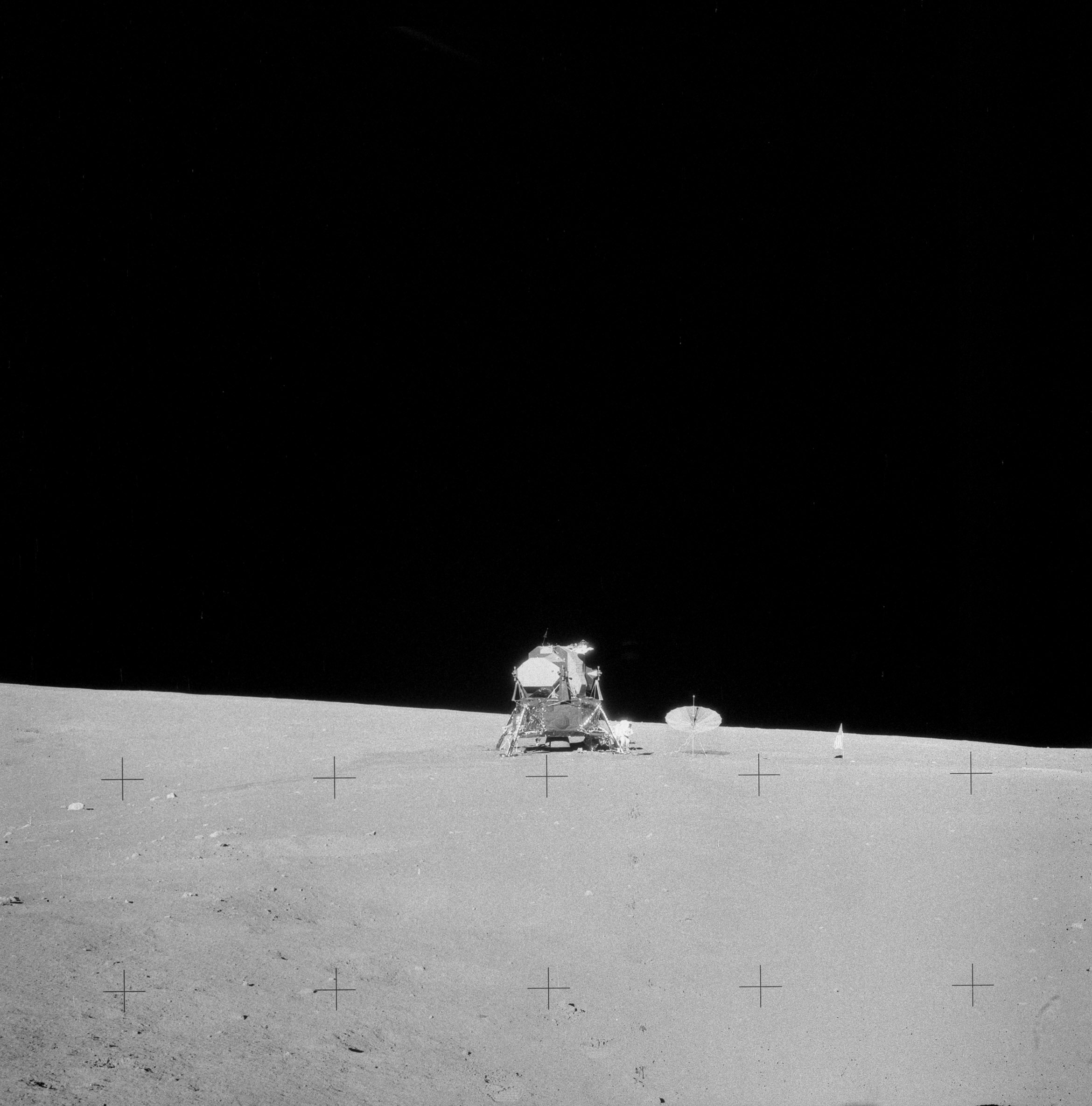 Dick Gordon spotted both the LM and Surveyor III on the surface, using the Command Module sextant during his pass over the landing site at 114:22:28. At Houston's suggestion, he used the DAC to film his next pass and this is a frame from that film sequence. At that time, the solar elevation was about 8.1 degrees and the LM sahdow about 160 feet. Ulli Lotzmann provided the frame and a labeled version.