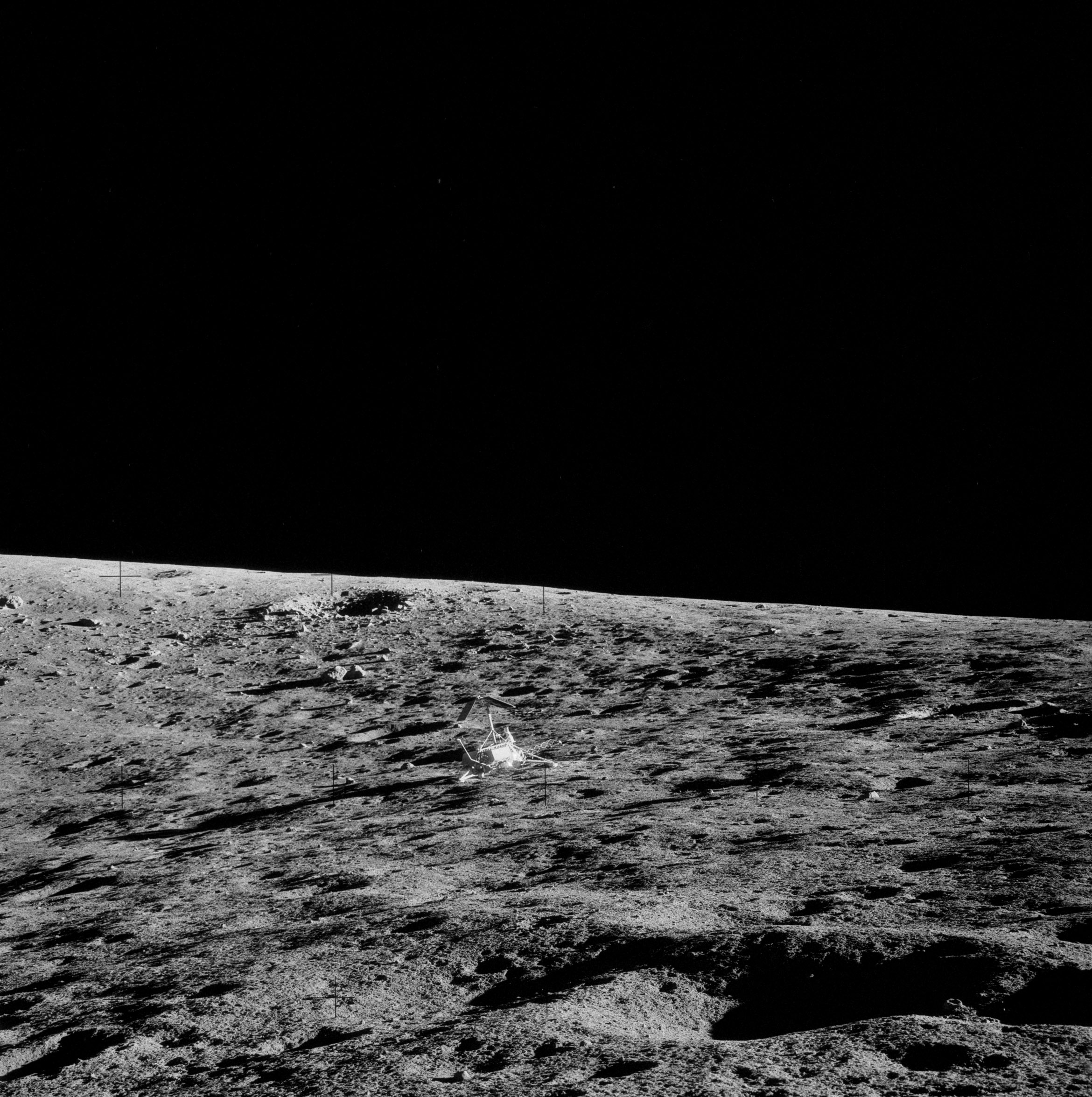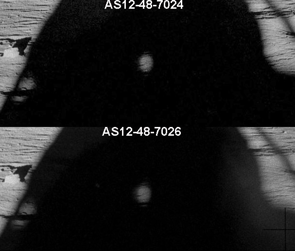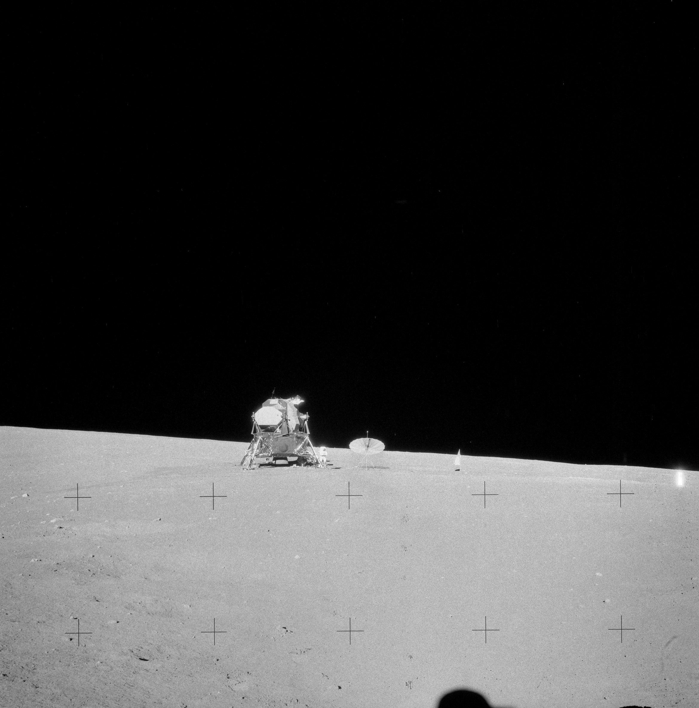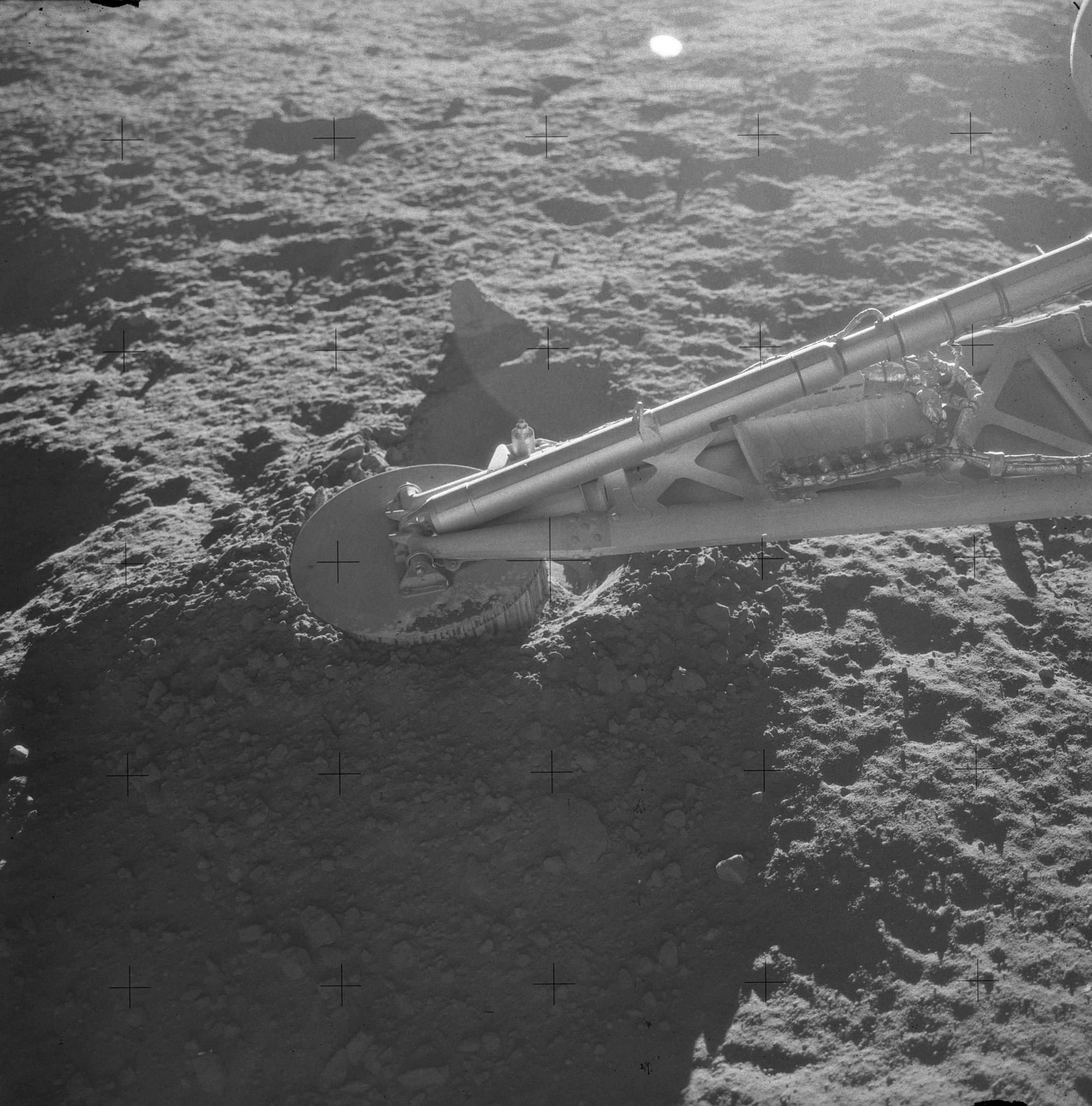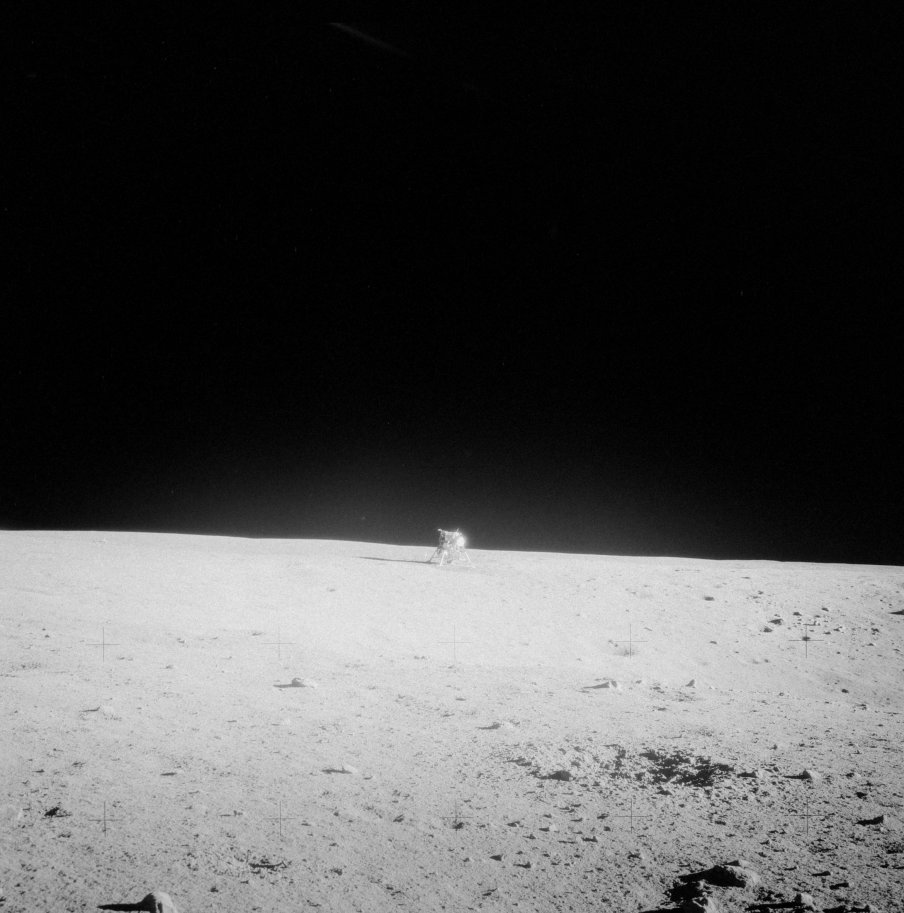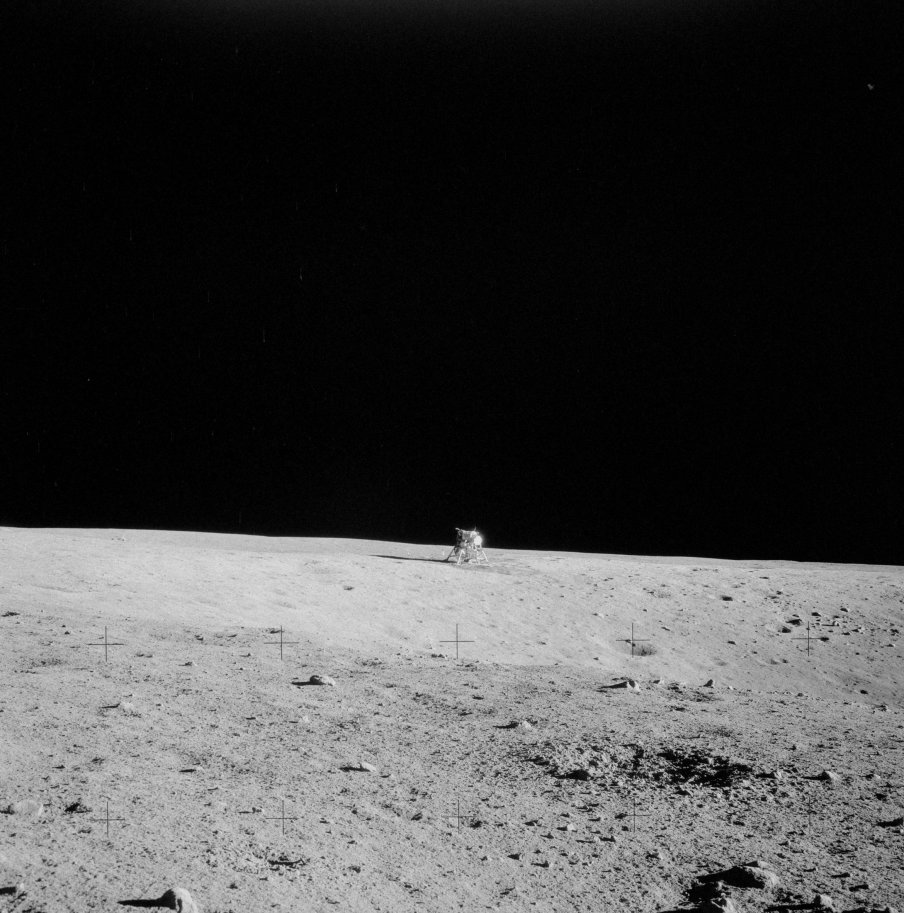 Dick Gordon spotted both the LM and Surveyor III on the surface, using the Command Module sextant during his pass over the landing site at 114:22:28. At Houston's suggestion, he used the DAC to film his next pass and this is a frame from that film sequence. At that time, the solar elevation was about 8.1 degrees and the LM sahdow about 160 feet. Ulli Lotzmann provided the frame and a labeled version.