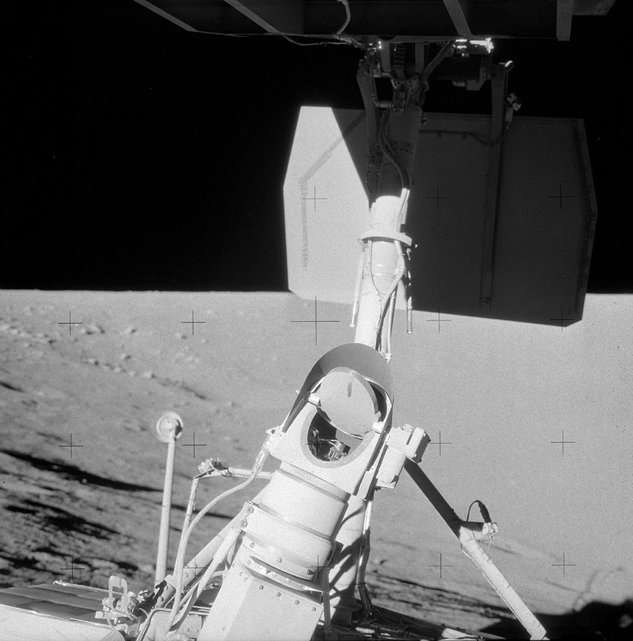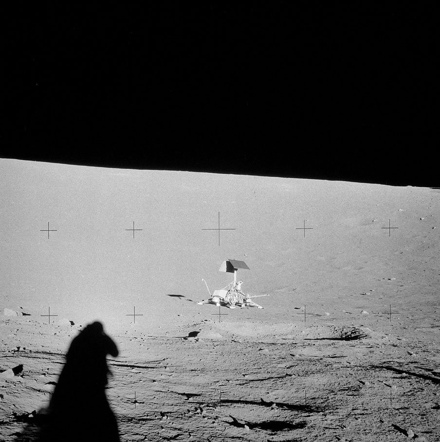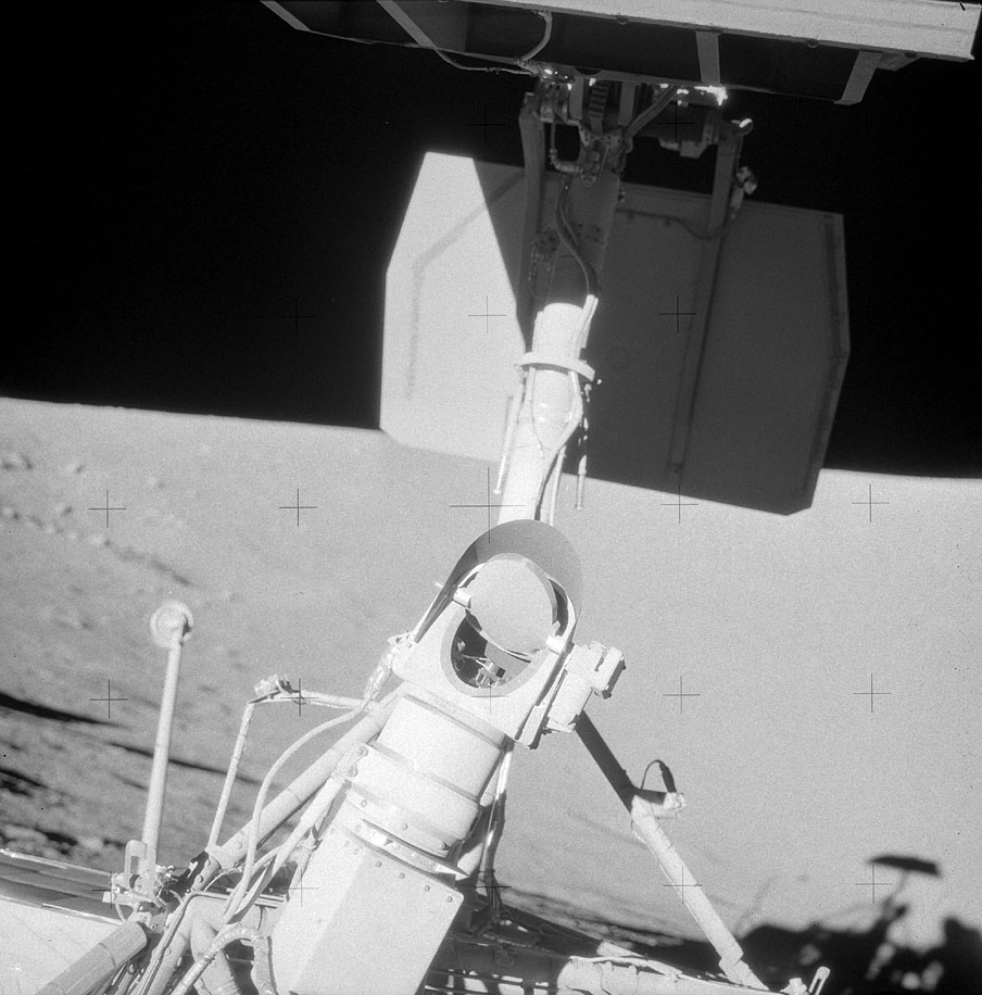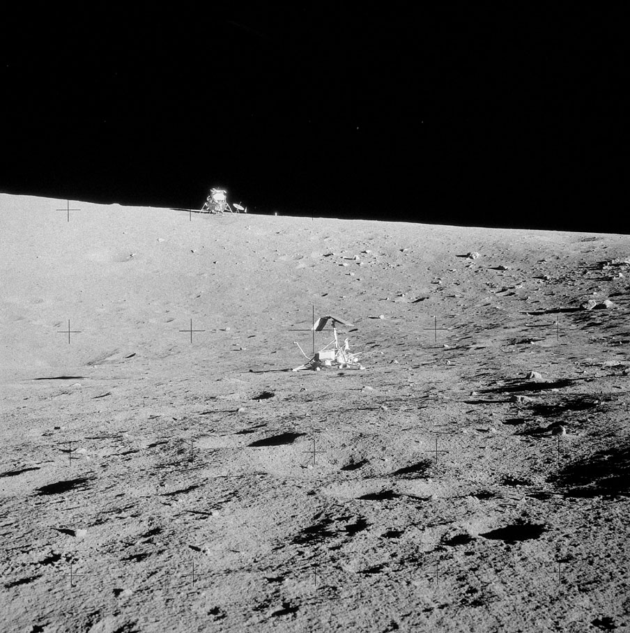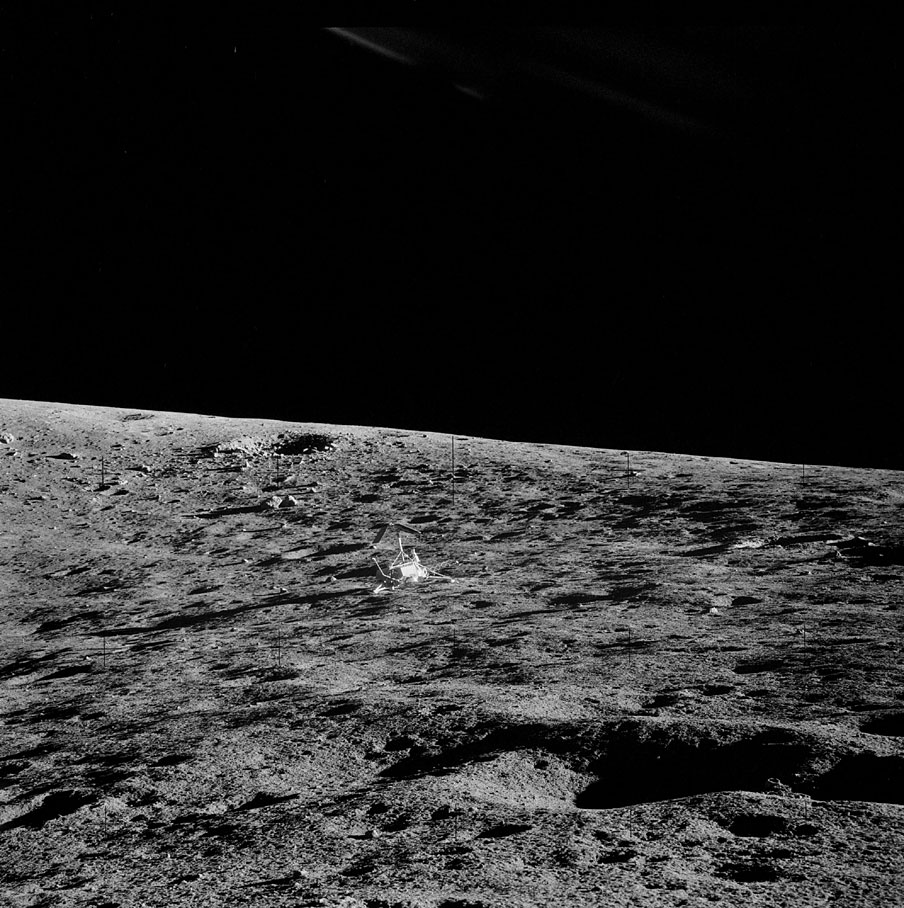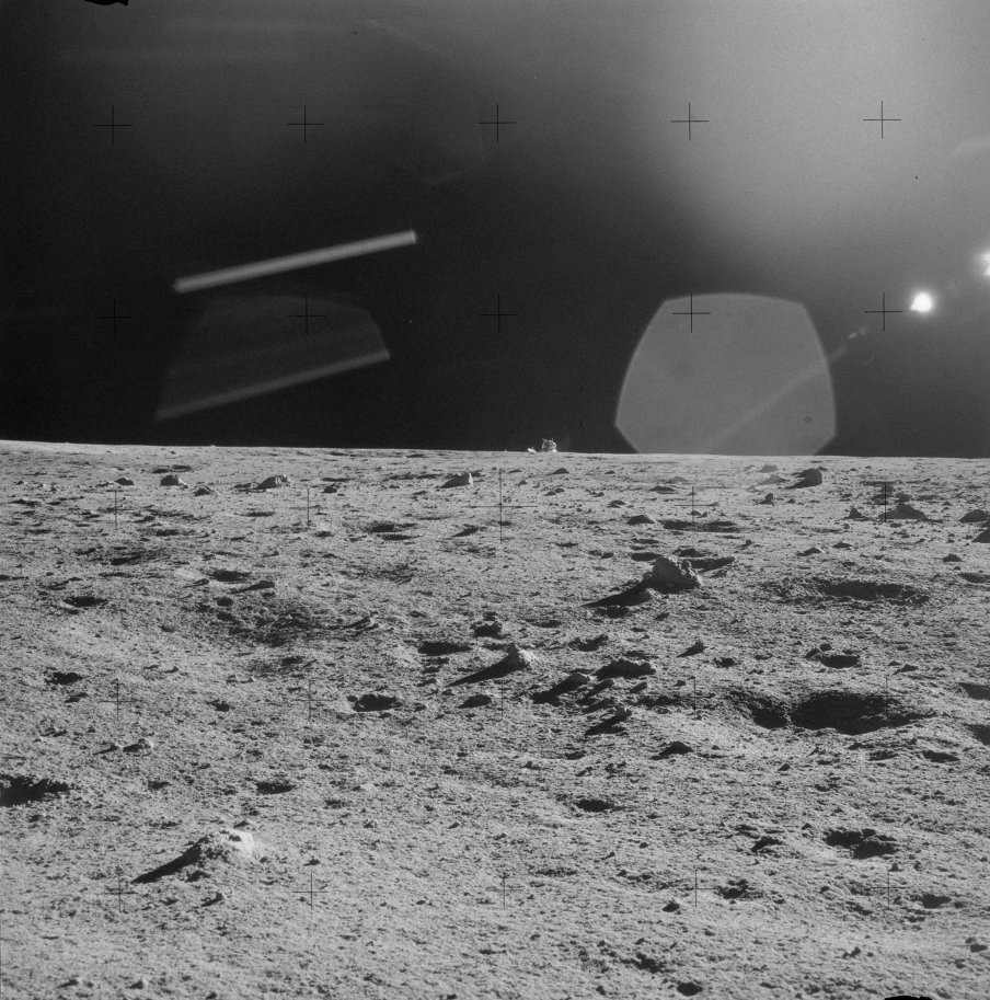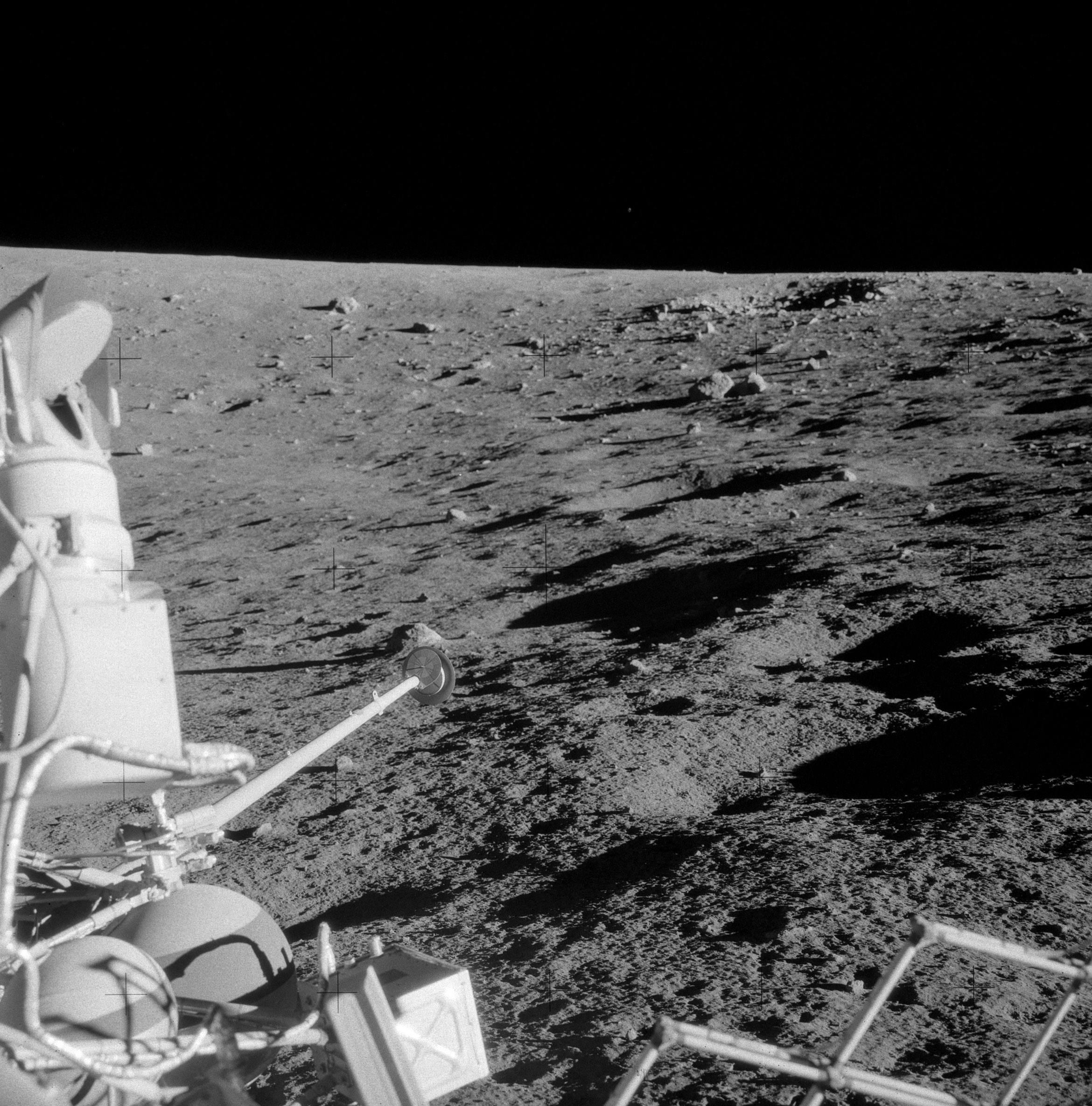 Dick Gordon spotted both the LM and Surveyor III on the surface, using the Command Module sextant during his pass over the landing site at 114:22:28. At Houston's suggestion, he used the DAC to film his next pass and this is a frame from that film sequence. At that time, the solar elevation was about 8.1 degrees and the LM sahdow about 160 feet. Ulli Lotzmann provided the frame and a labeled version.