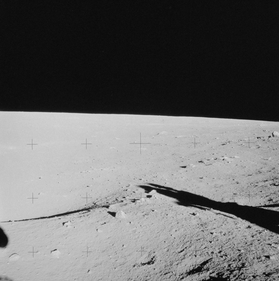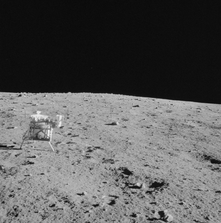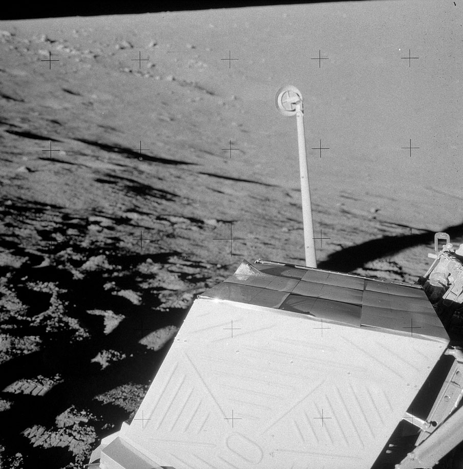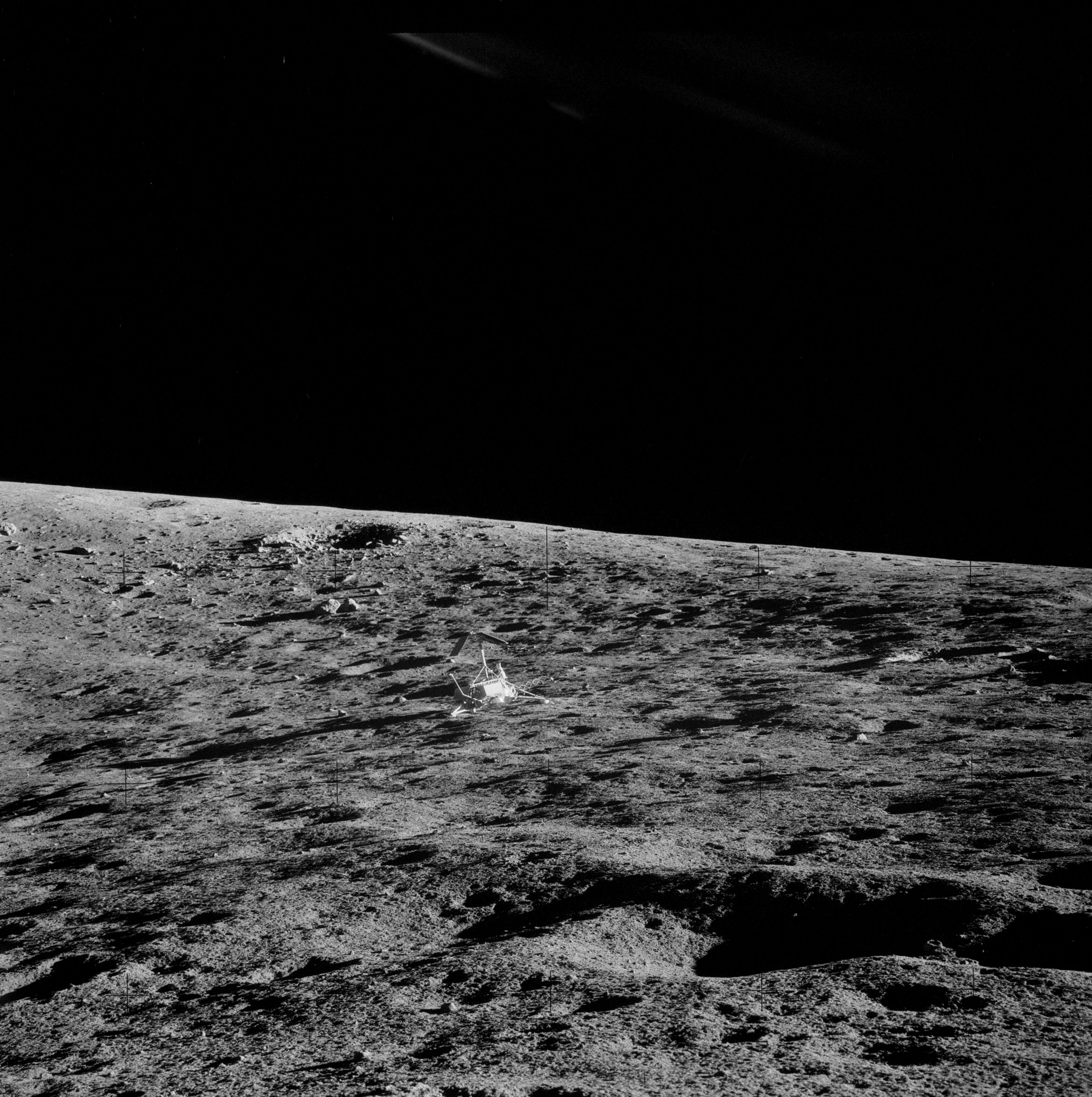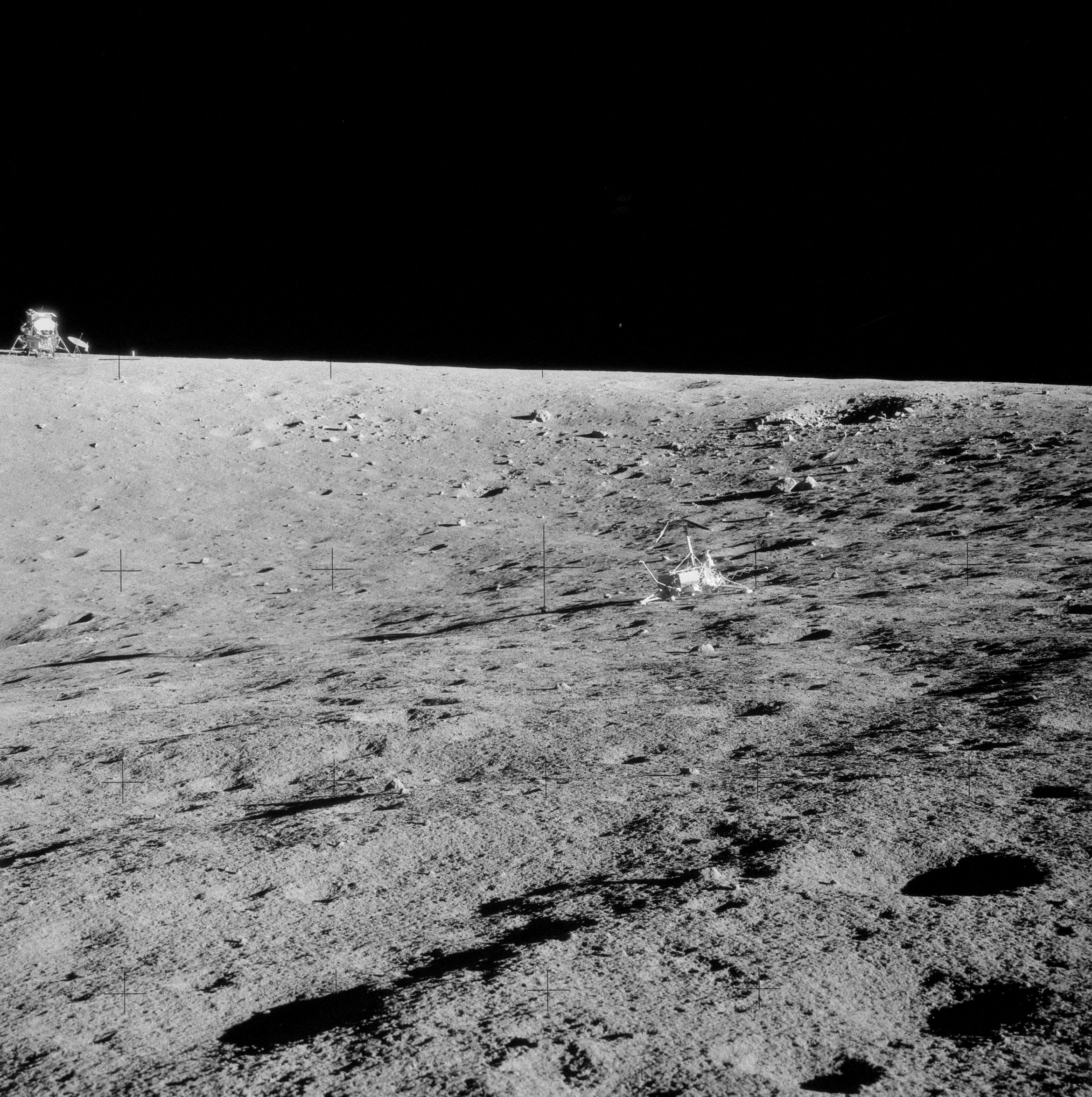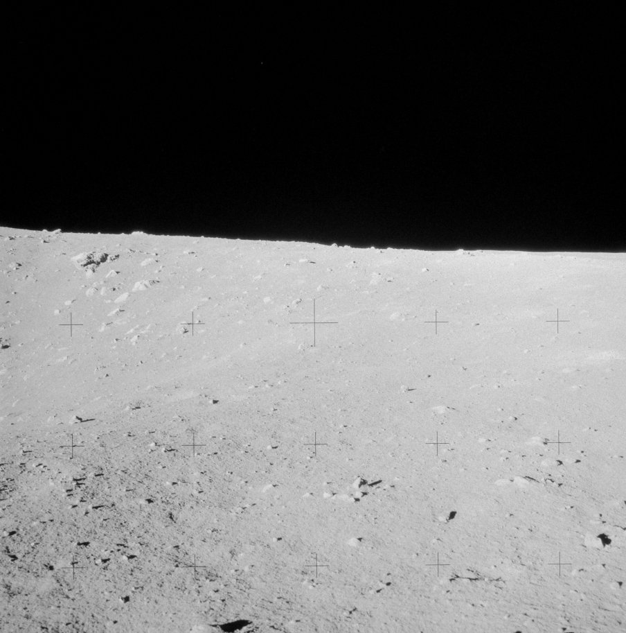 Dick Gordon spotted both the LM and Surveyor III on the surface, using the Command Module sextant during his pass over the landing site at 114:22:28. At Houston's suggestion, he used the DAC to film his next pass and this is a frame from that film sequence. At that time, the solar elevation was about 8.1 degrees and the LM sahdow about 160 feet. Ulli Lotzmann provided the frame and a labeled version.