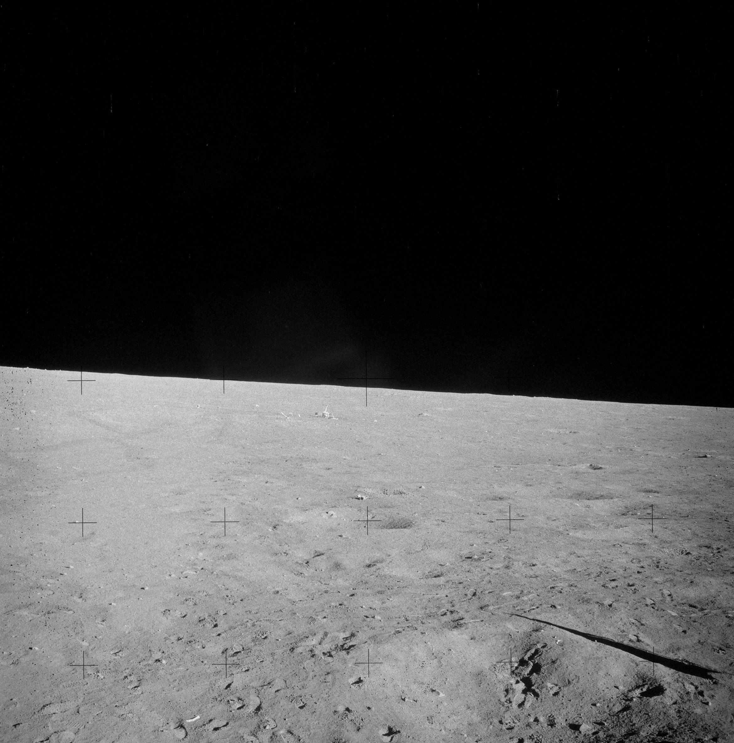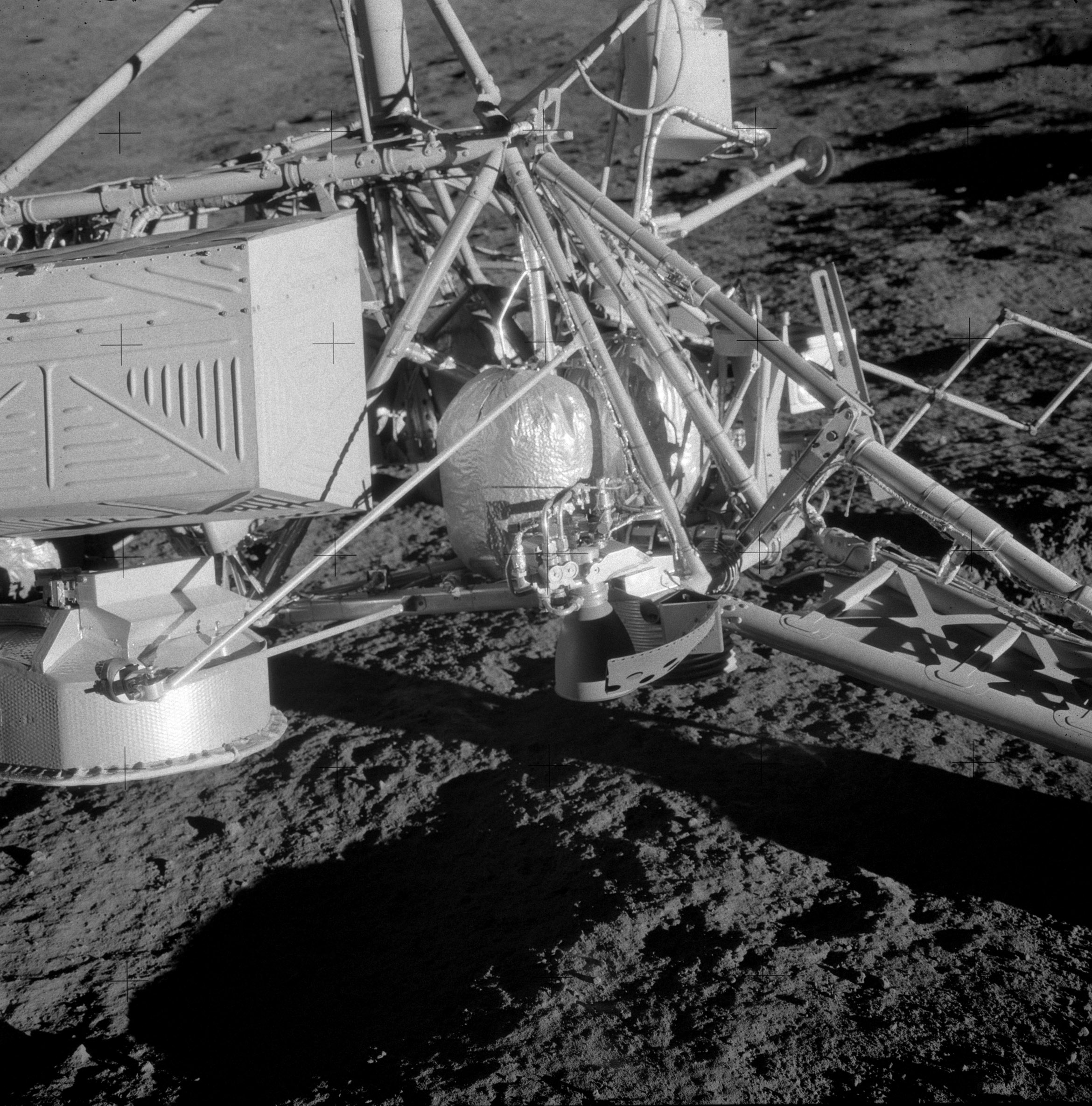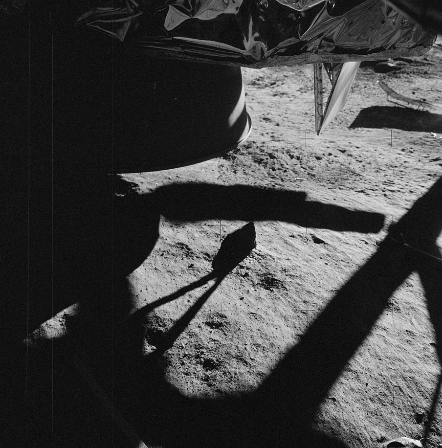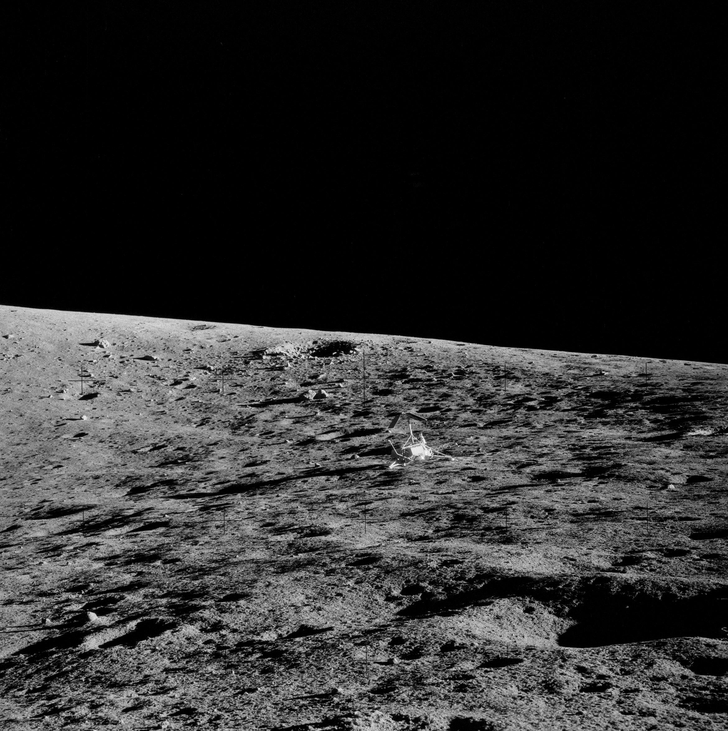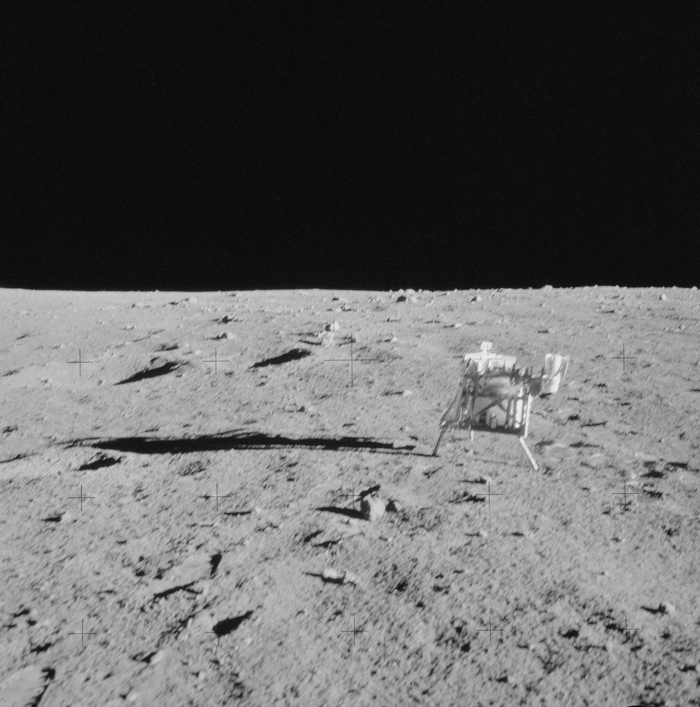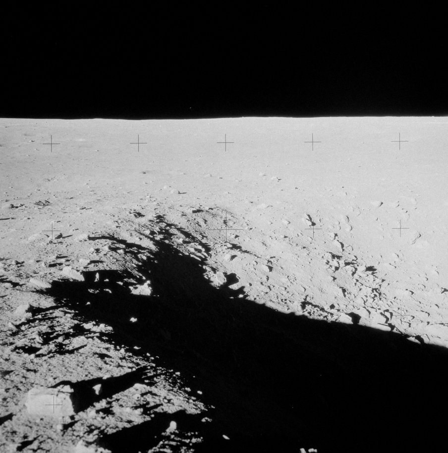 Dick Gordon spotted both the LM and Surveyor III on the surface, using the Command Module sextant during his pass over the landing site at 114:22:28. At Houston's suggestion, he used the DAC to film his next pass and this is a frame from that film sequence. At that time, the solar elevation was about 8.1 degrees and the LM sahdow about 160 feet. Ulli Lotzmann provided the frame and a labeled version.