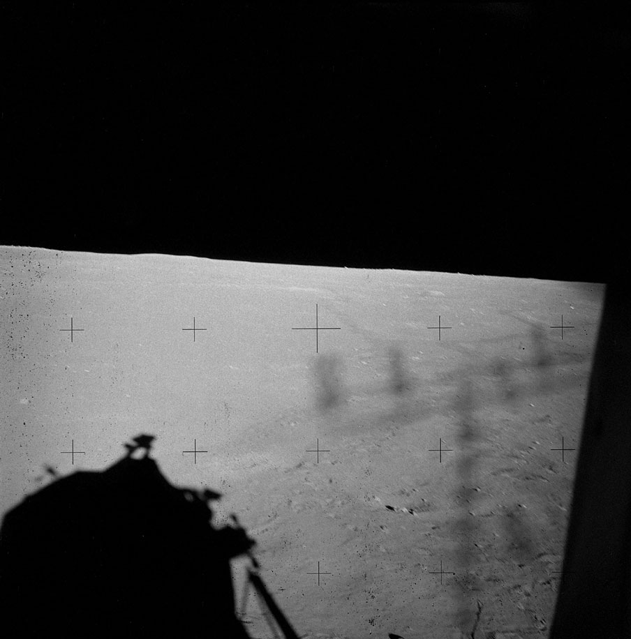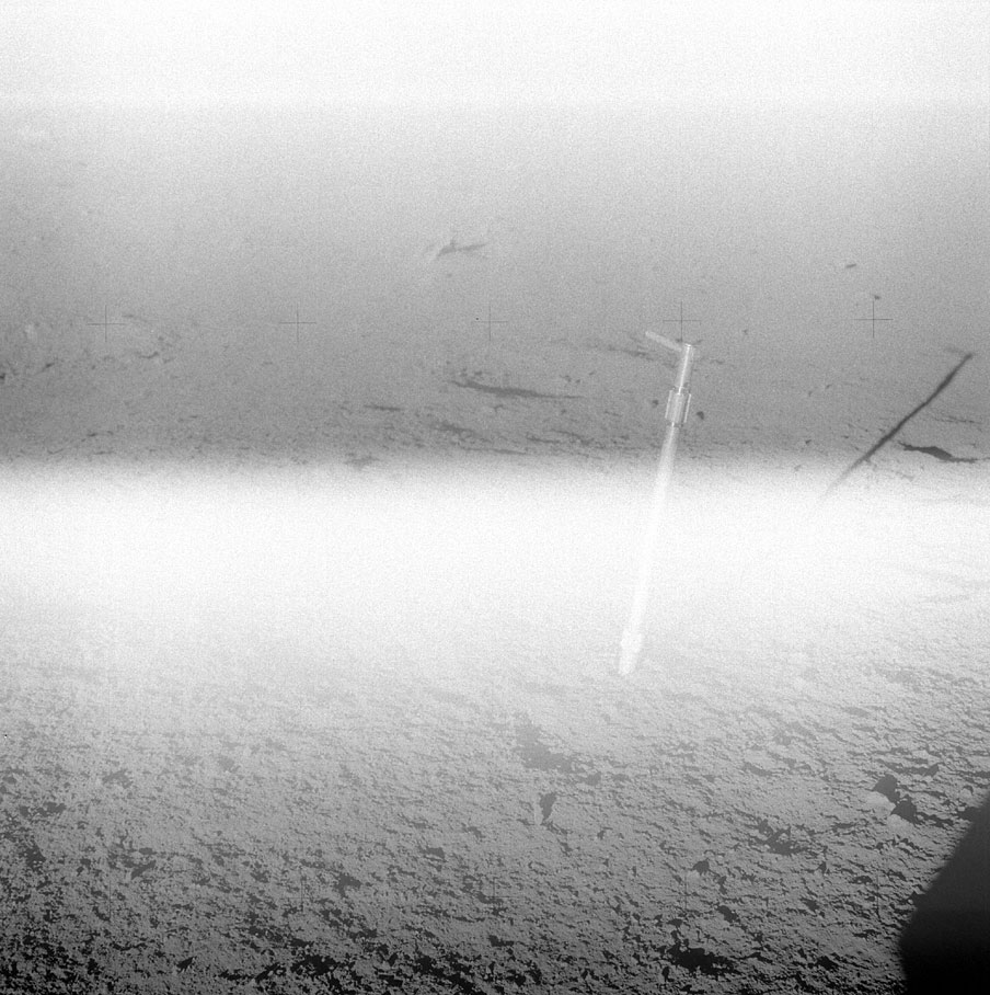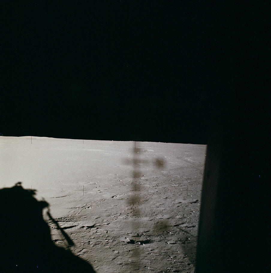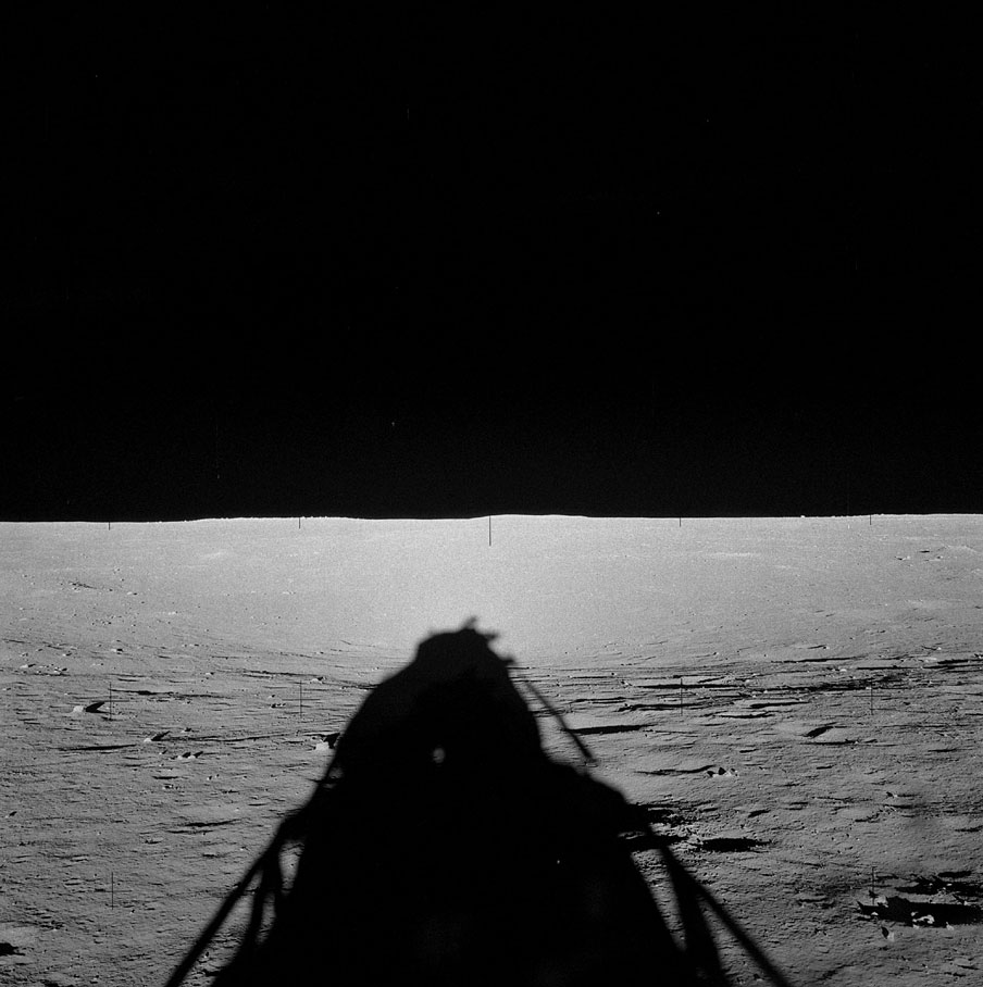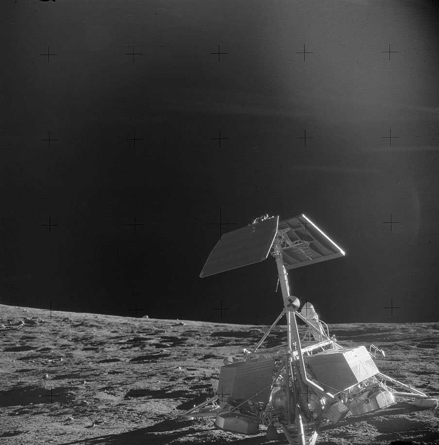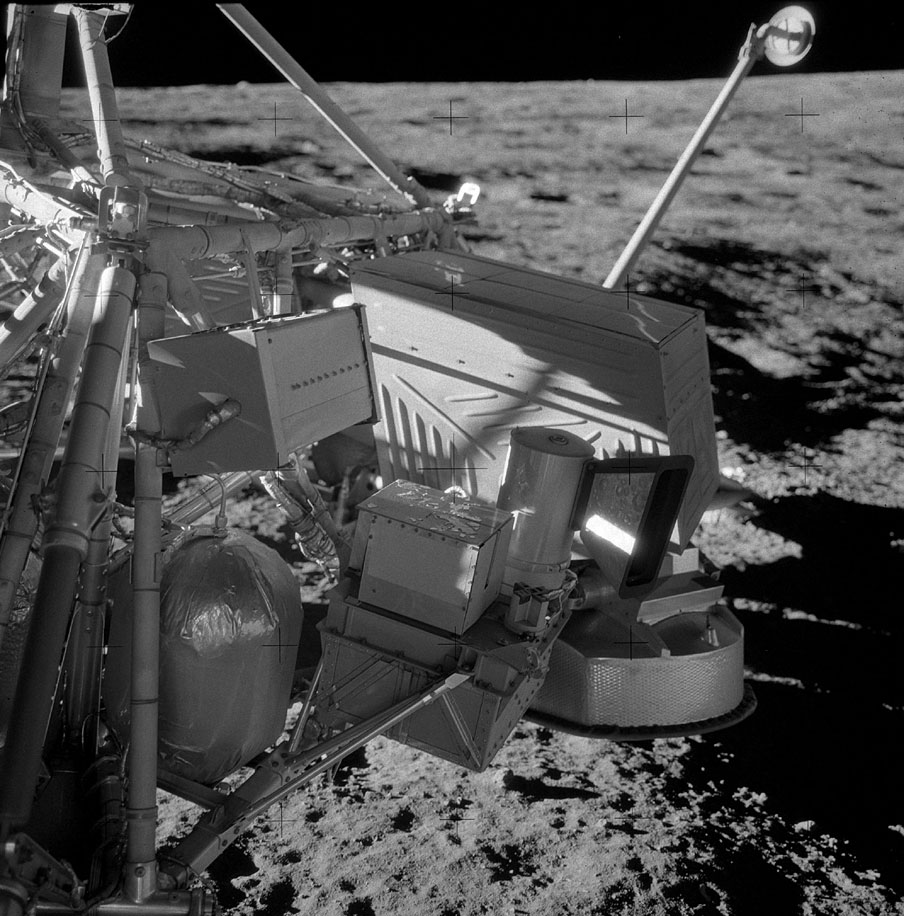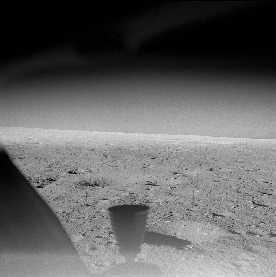 Dick Gordon spotted both the LM and Surveyor III on the surface, using the Command Module sextant during his pass over the landing site at 114:22:28. At Houston's suggestion, he used the DAC to film his next pass and this is a frame from that film sequence. At that time, the solar elevation was about 8.1 degrees and the LM sahdow about 160 feet. Ulli Lotzmann provided the frame and a labeled version.