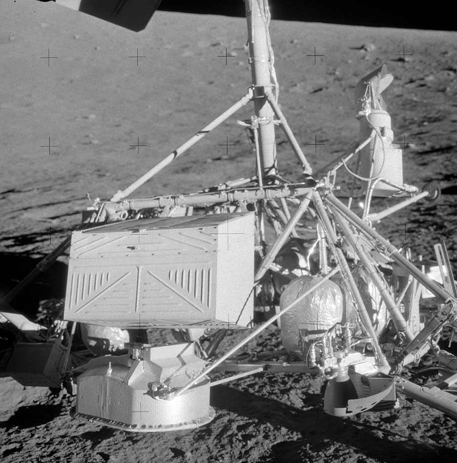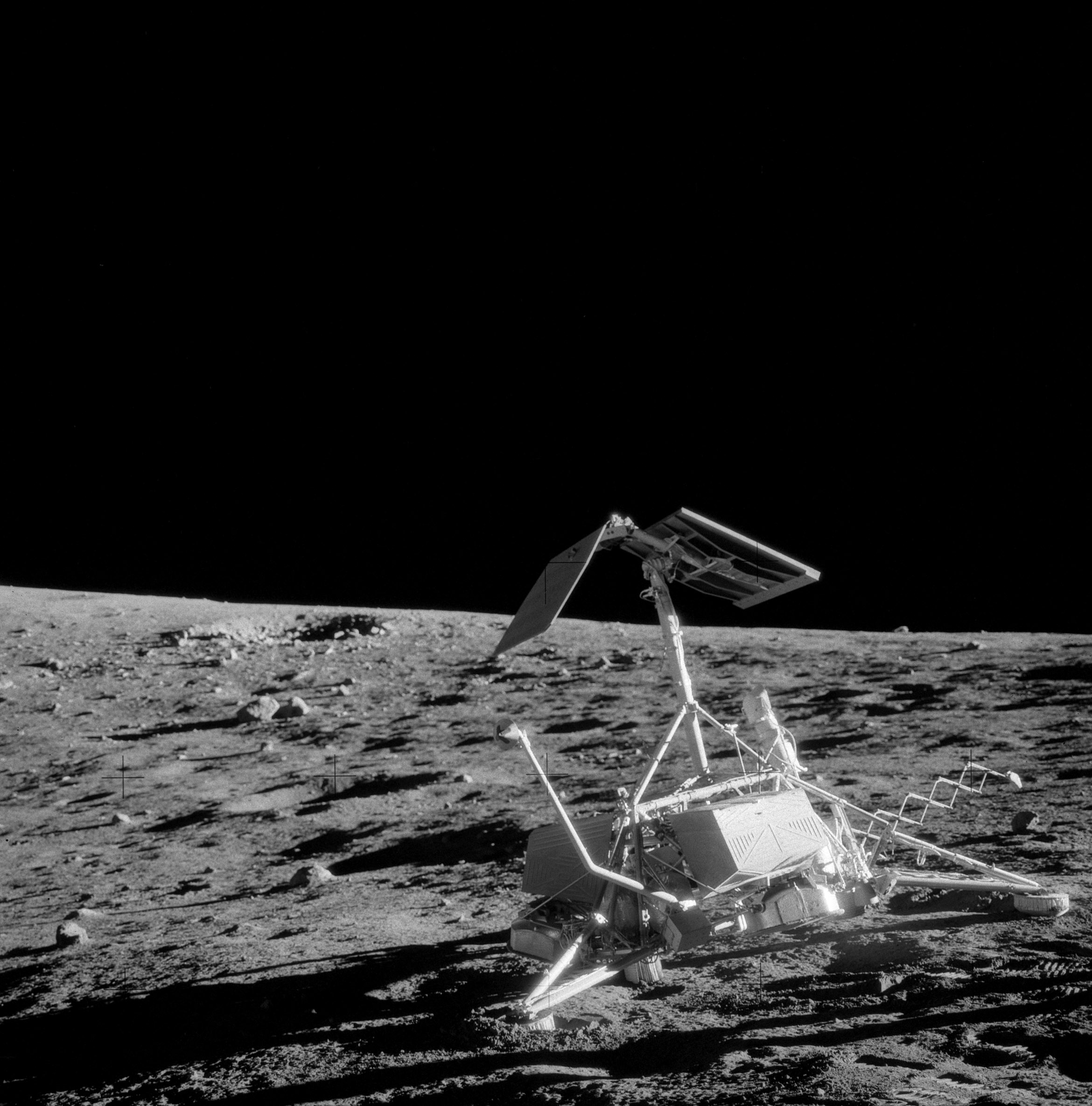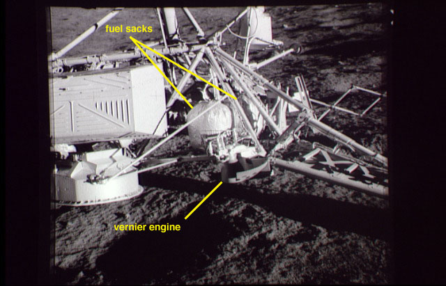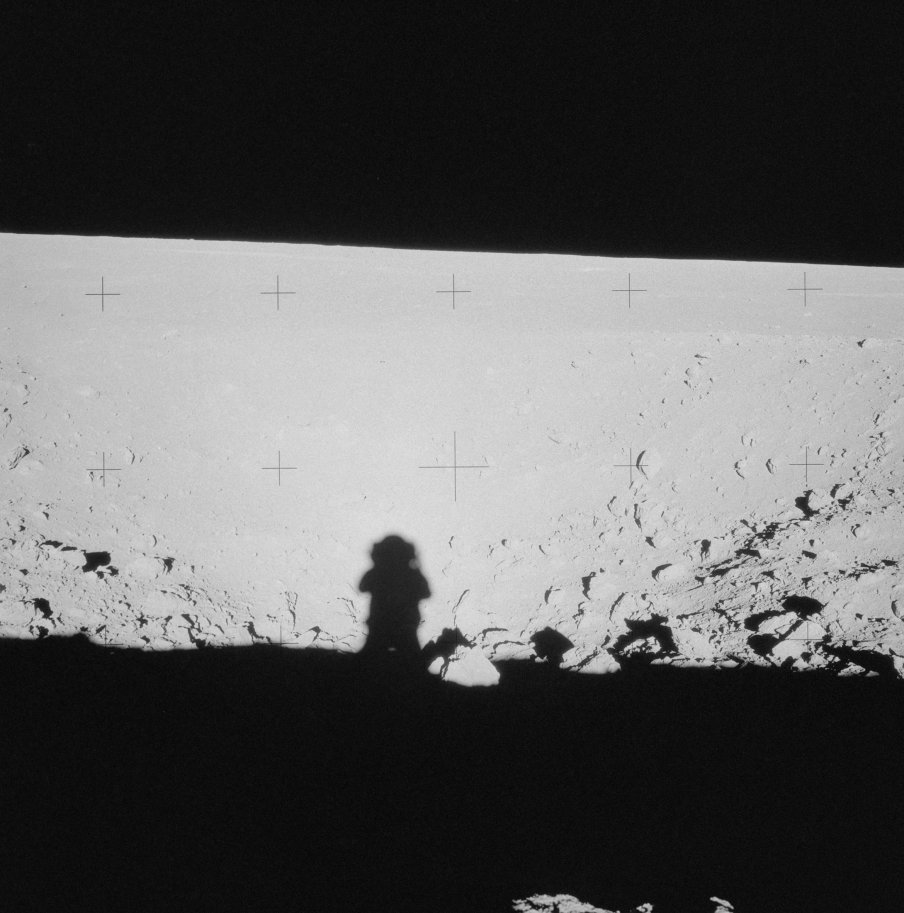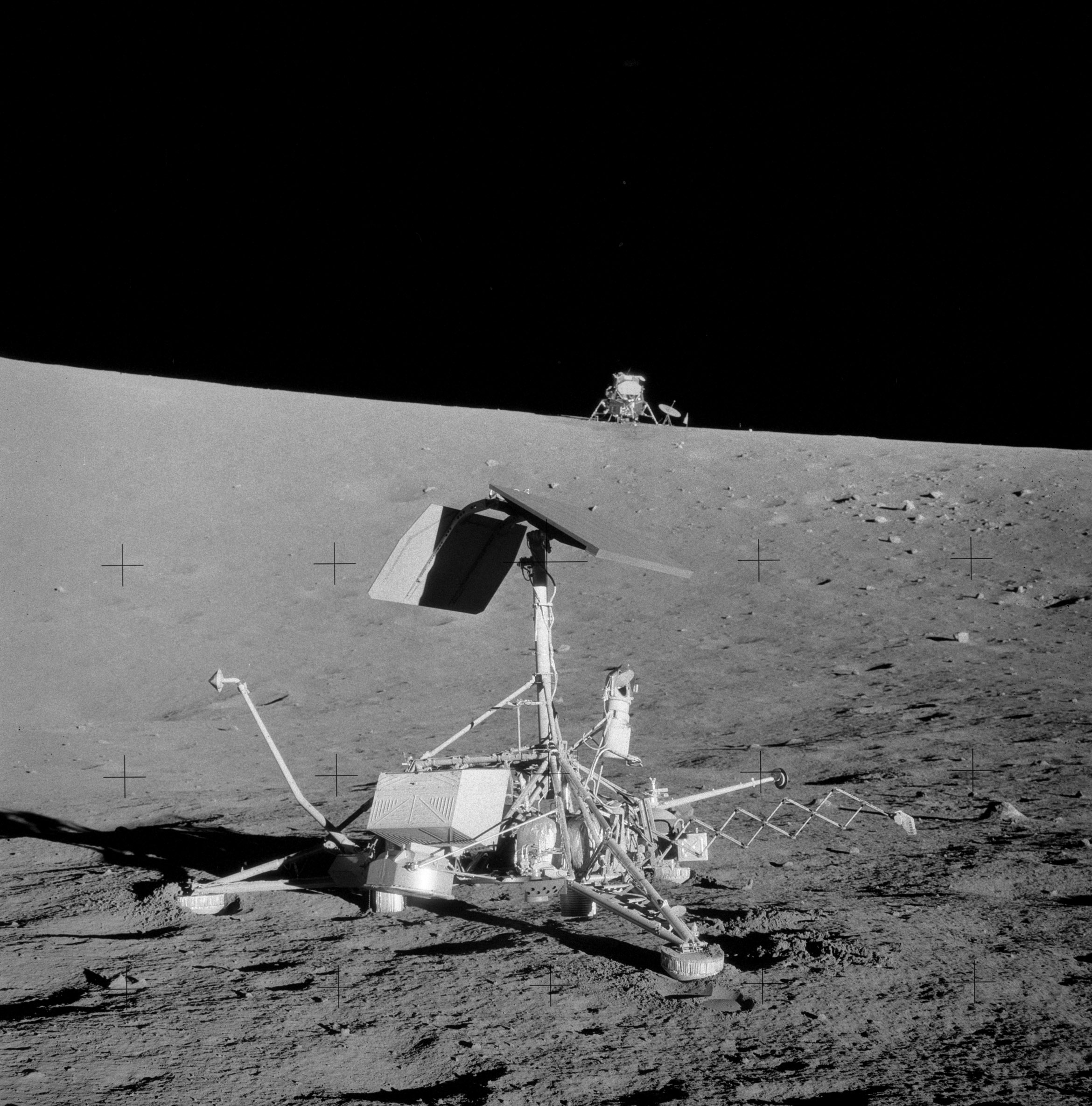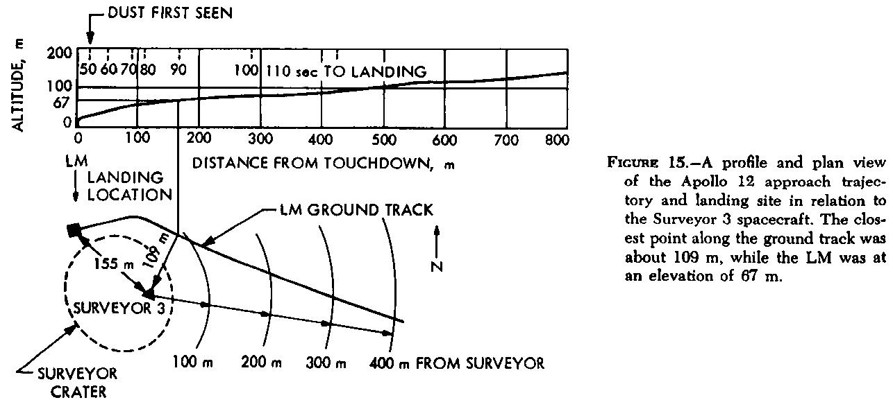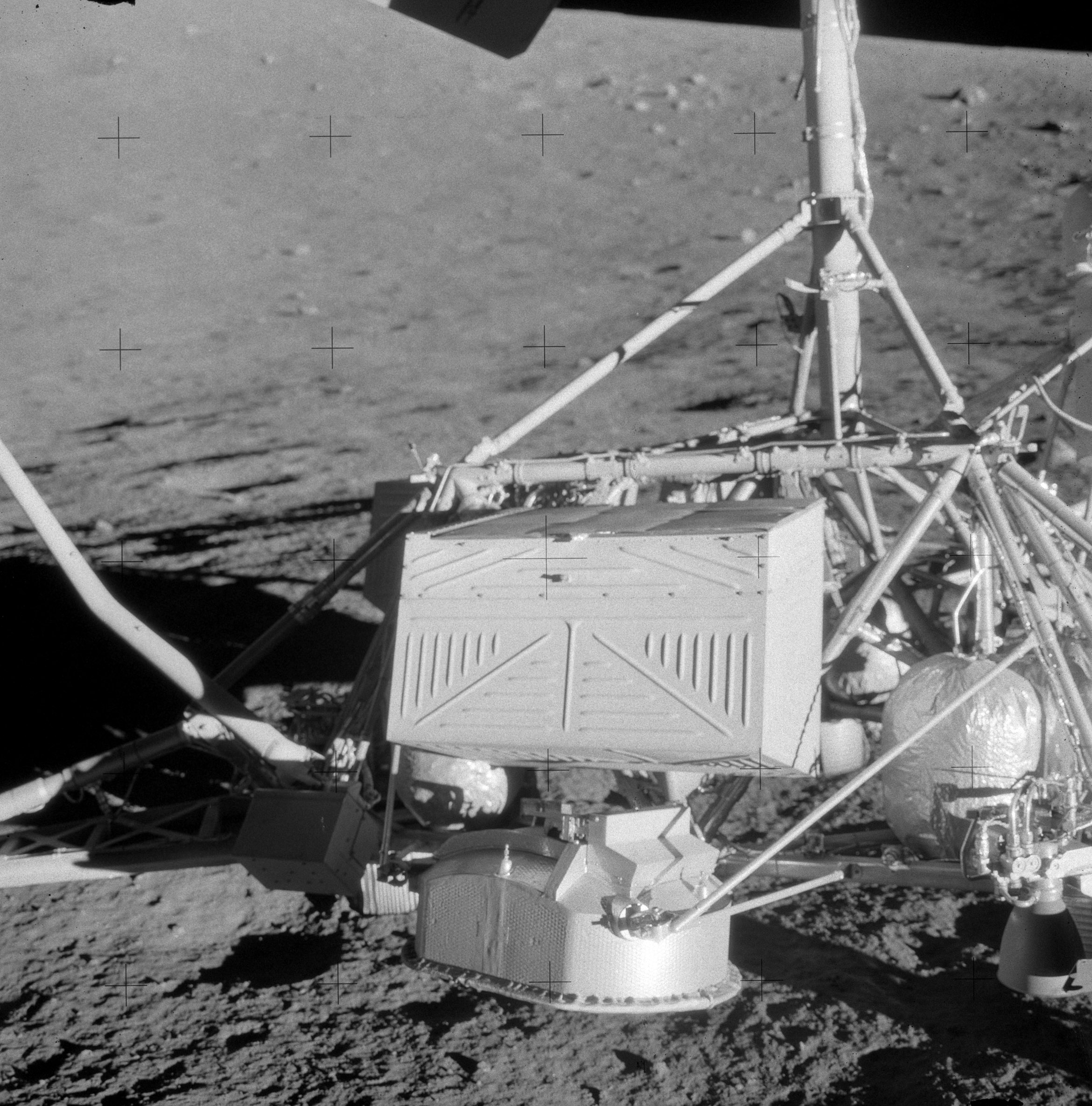Dick Gordon spotted both the LM and Surveyor III on the surface, using the Command Module sextant during his pass over the landing site at 114:22:28. At Houston's suggestion, he used the DAC to film his next pass and this is a frame from that film sequence. At that time, the solar elevation was about 8.1 degrees and the LM sahdow about 160 feet. Ulli Lotzmann provided the frame and a labeled version.