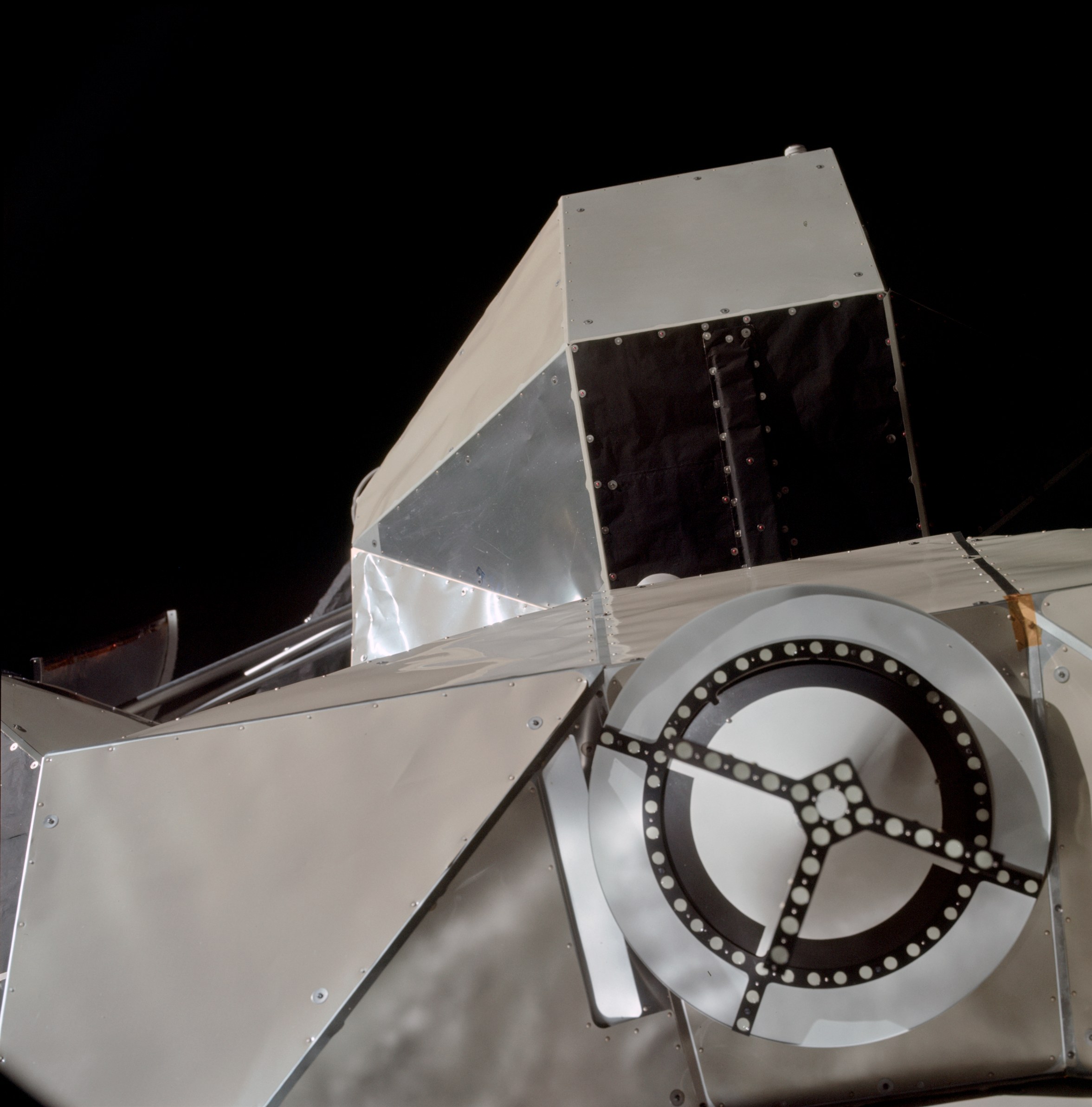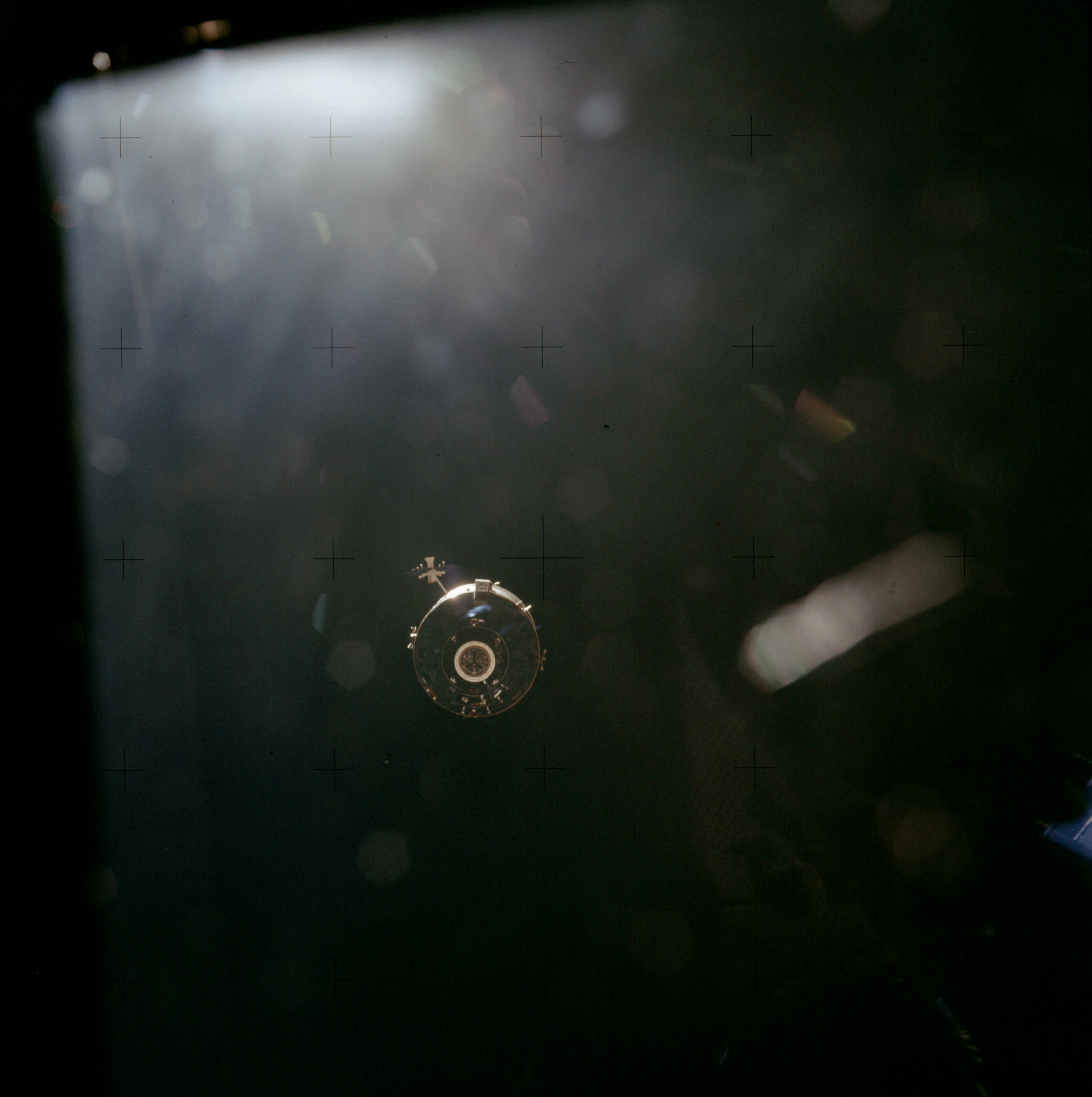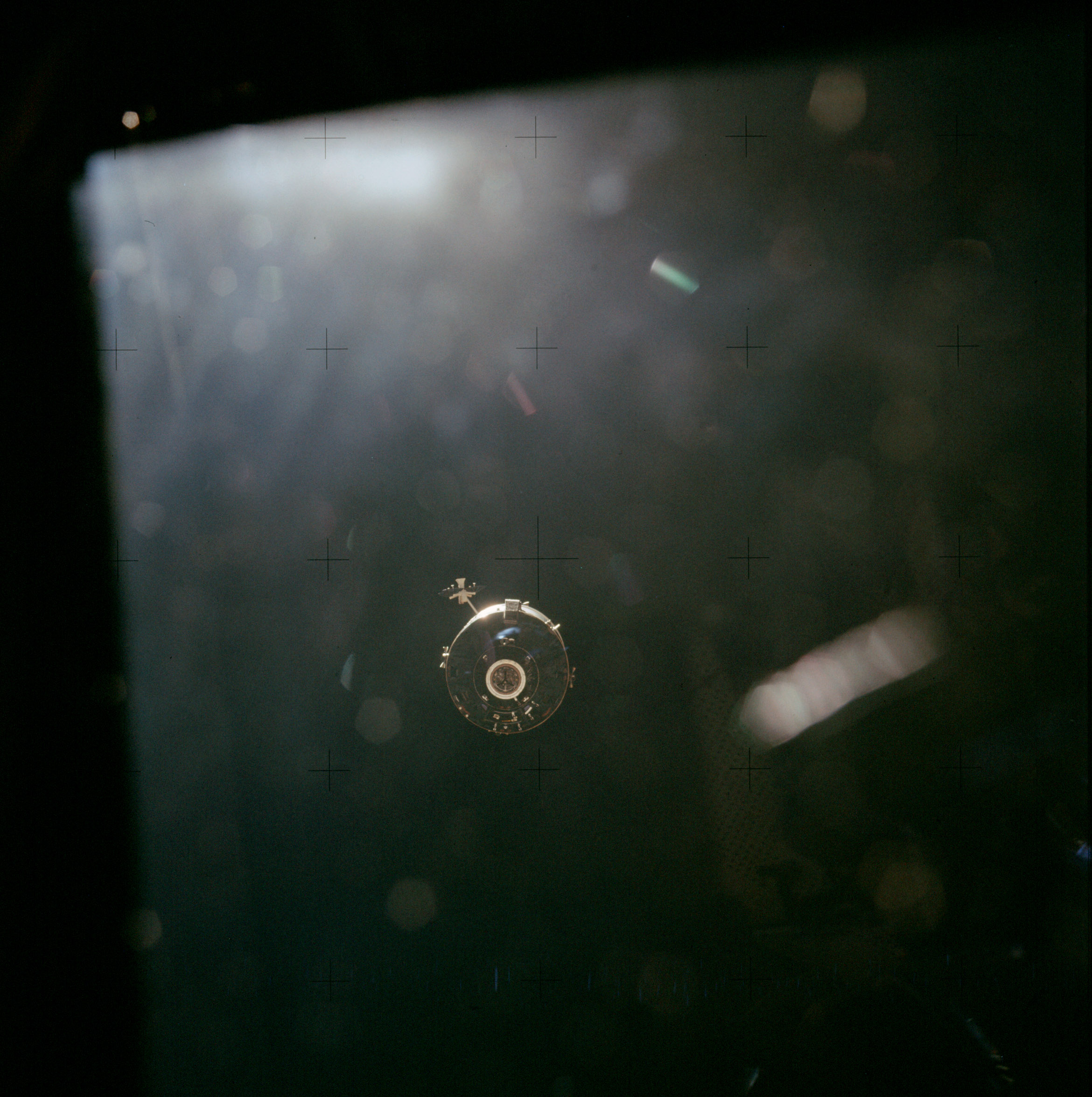 View of the LM docking target. This photo was taken inside the Command Module during the translunar coast.