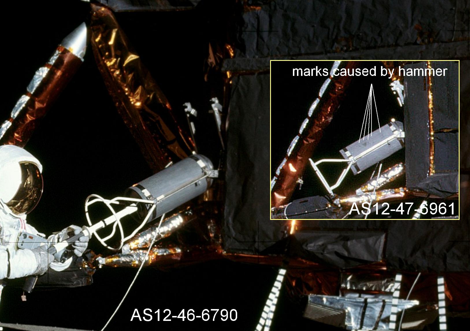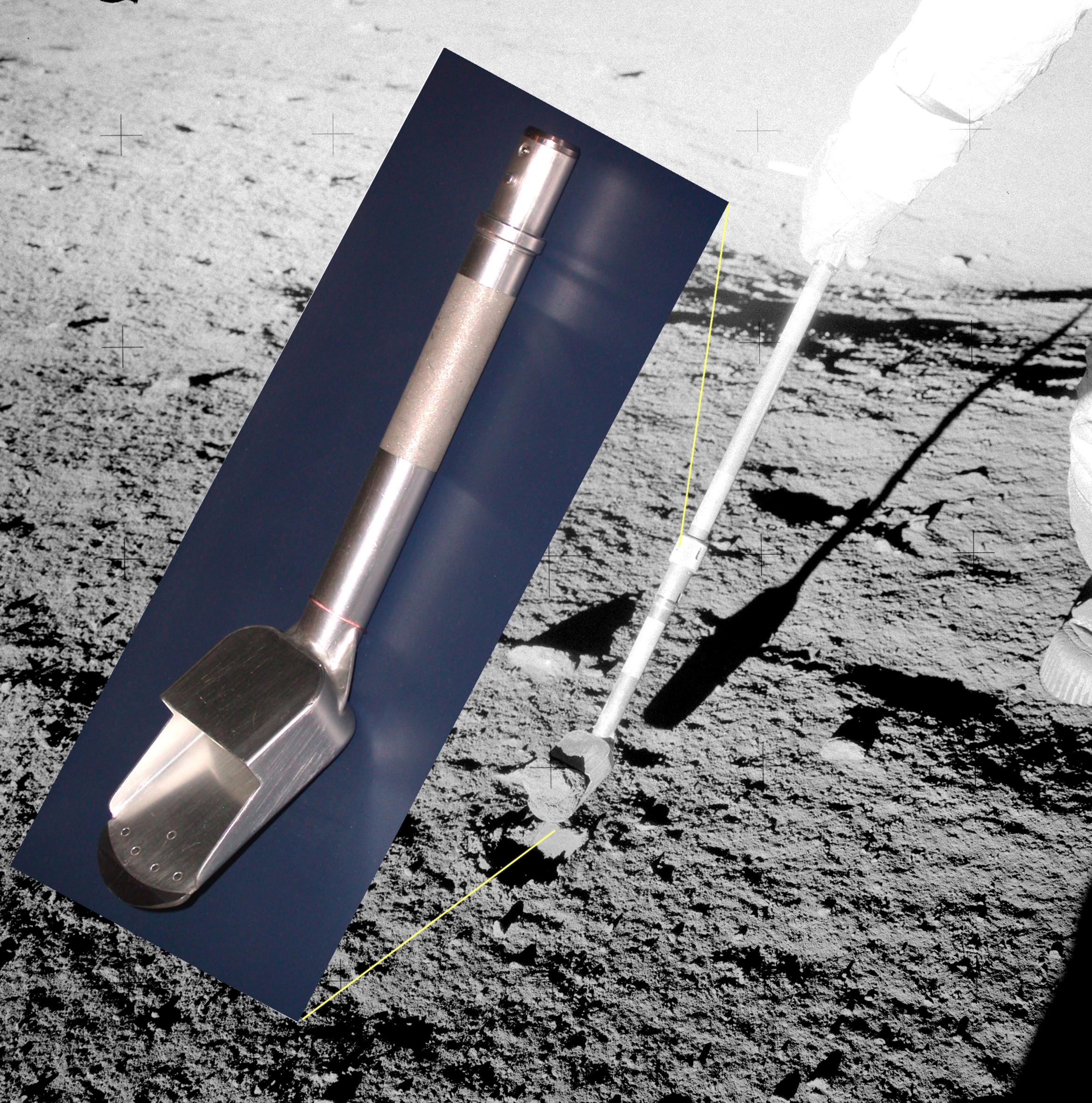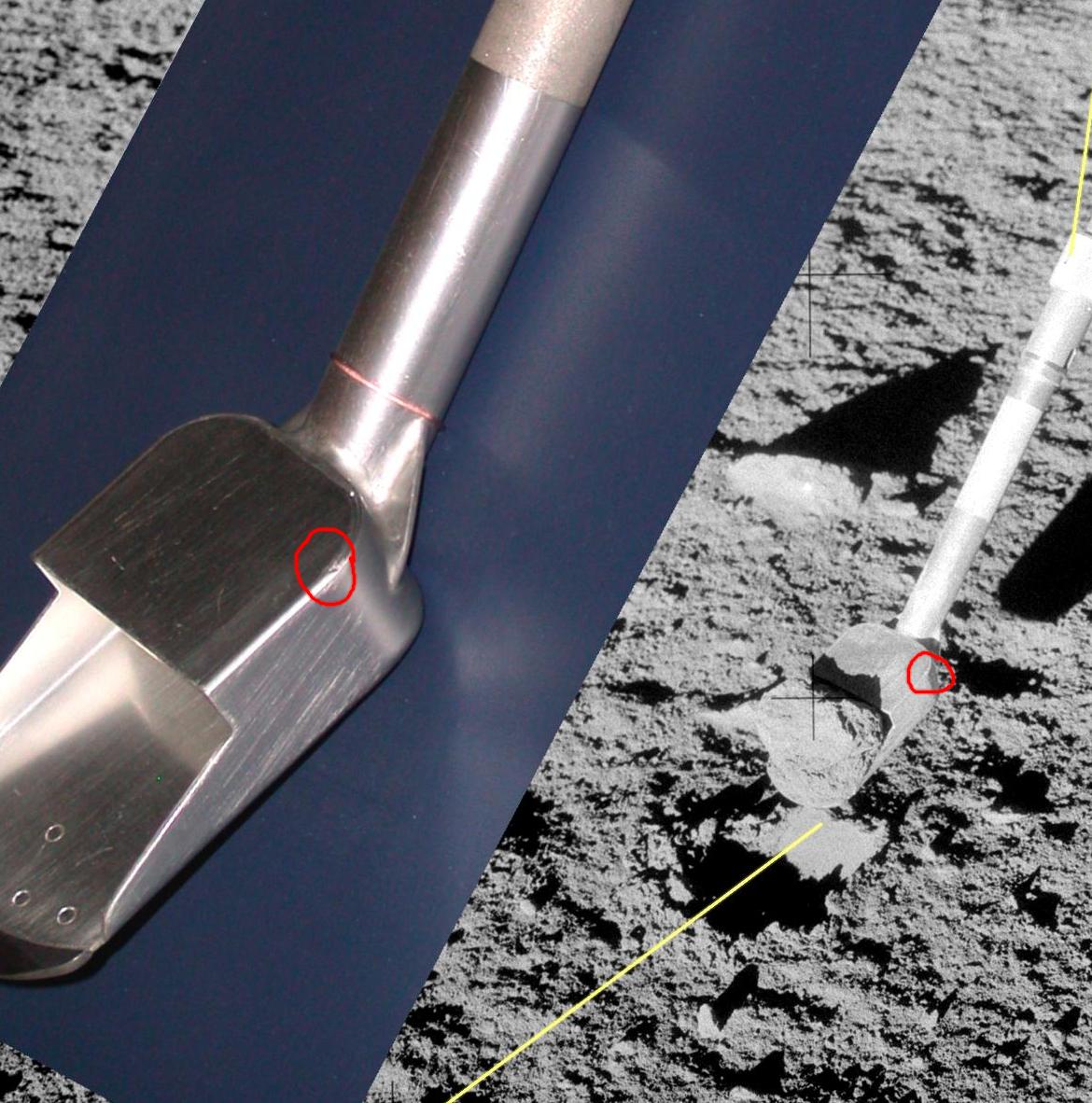 Photograph taken at the Astronaut Hall of Fame, Titusville, Florida in 2004 by Ulrich Lotzmann. Apollo 12 photograph AS12-49-7312 shows Pete using the scoop near Halo Crater at about 133:38:37. The scoop was fitted into an extension handle. A detail from 7312 shows the extent of the scoop. A labeled detail shows the location of a defect/blemish on the scoop as displayed in 2004 and what appears to be the same feature on the scoop in 7312.