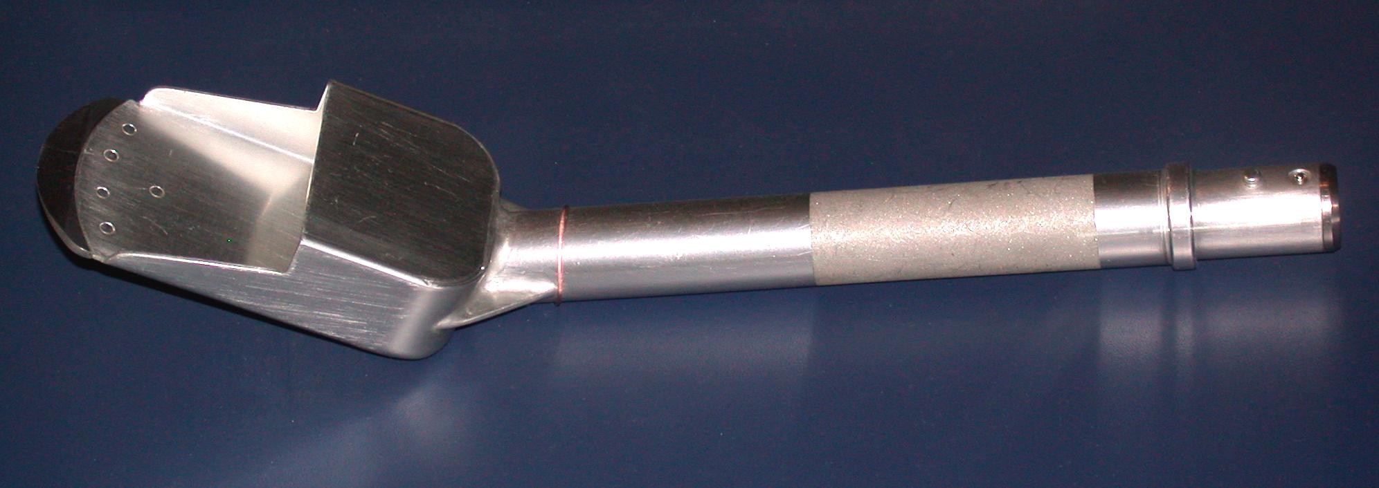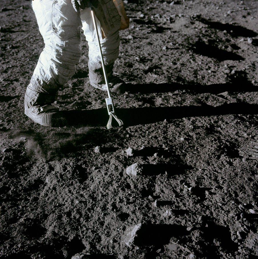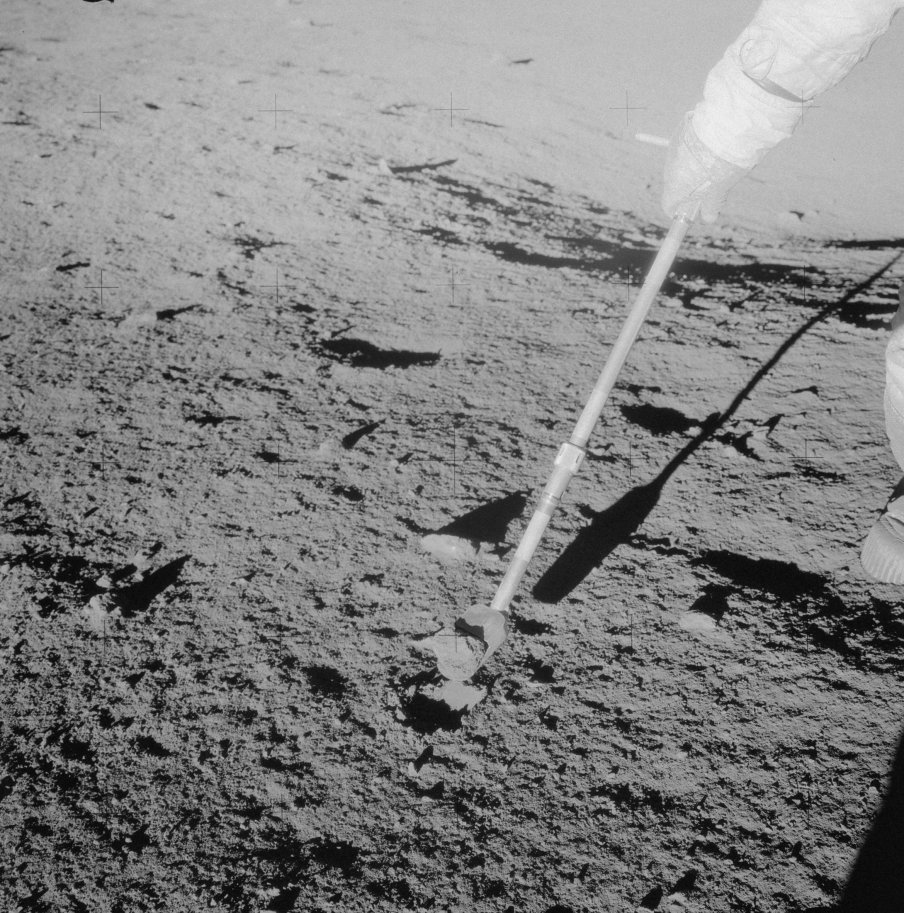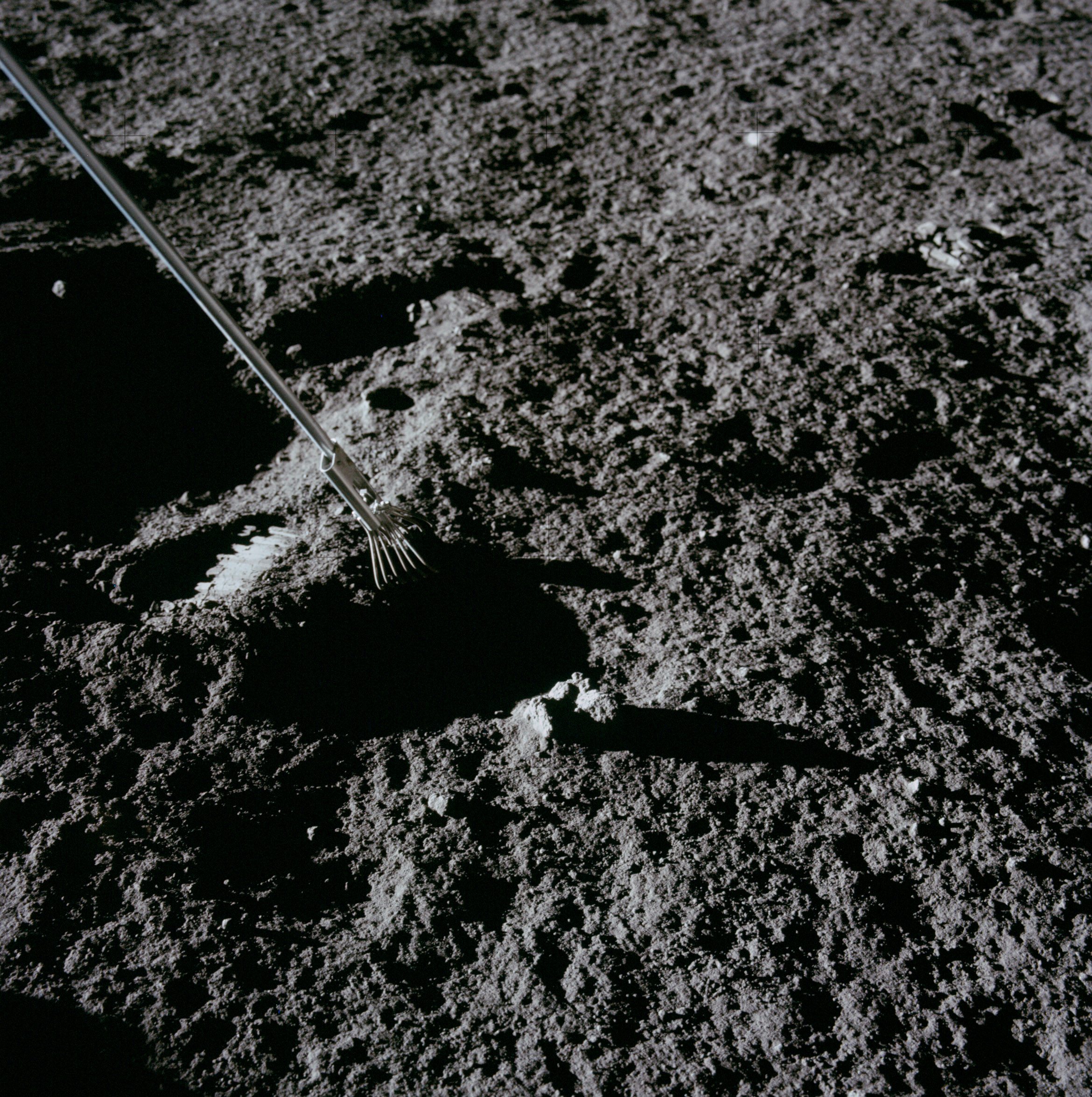 Photograph taken at the Astronaut Hall of Fame, Titusville, Florida in 2004 by Ulrich Lotzmann. Apollo 12 photograph AS12-49-7312 shows Pete using the scoop near Halo Crater at about 133:38:37. The scoop was fitted into an extension handle. A detail from 7312 shows the extent of the scoop. A labeled detail shows the location of a defect/blemish on the scoop as displayed in 2004 and what appears to be the same feature on the scoop in 7312.