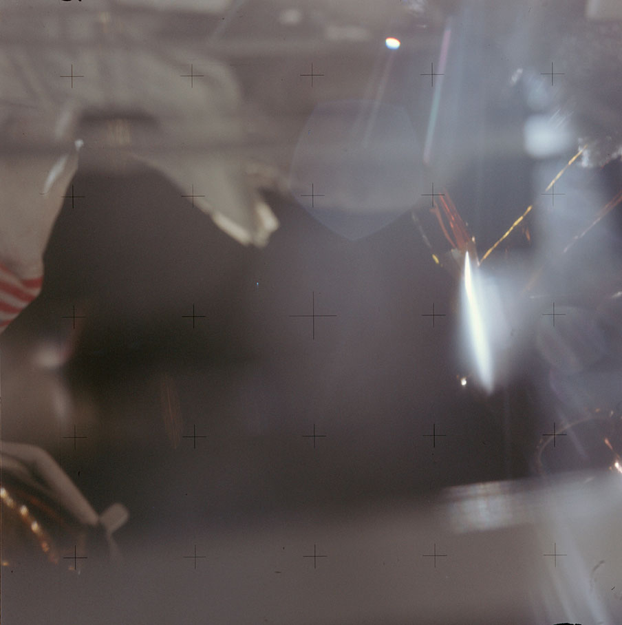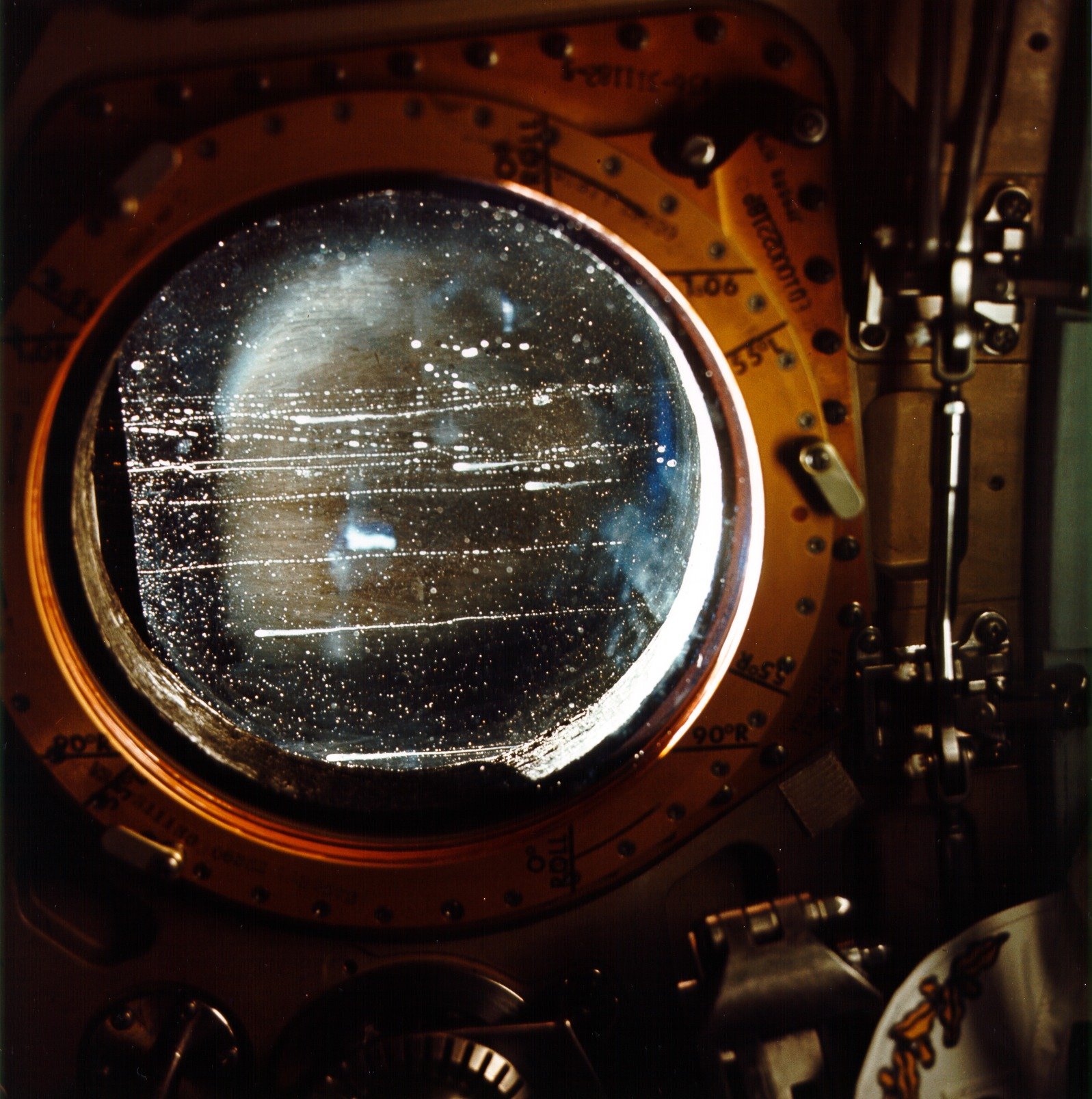 According to National Space Science Data Center document NSSDC-70-11 (July 1970), this photo shows the 'fouled hatch window; streaks go (left) away from the CMS cone (right)'. This photo was taken inside the Command Module during the translunar coast. Scans by Kipp Teague.AS12-50-7374 ( 85k or 462k )