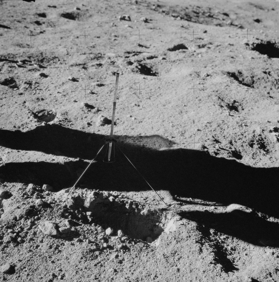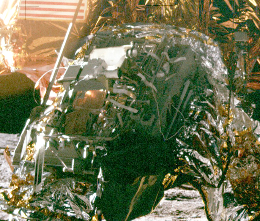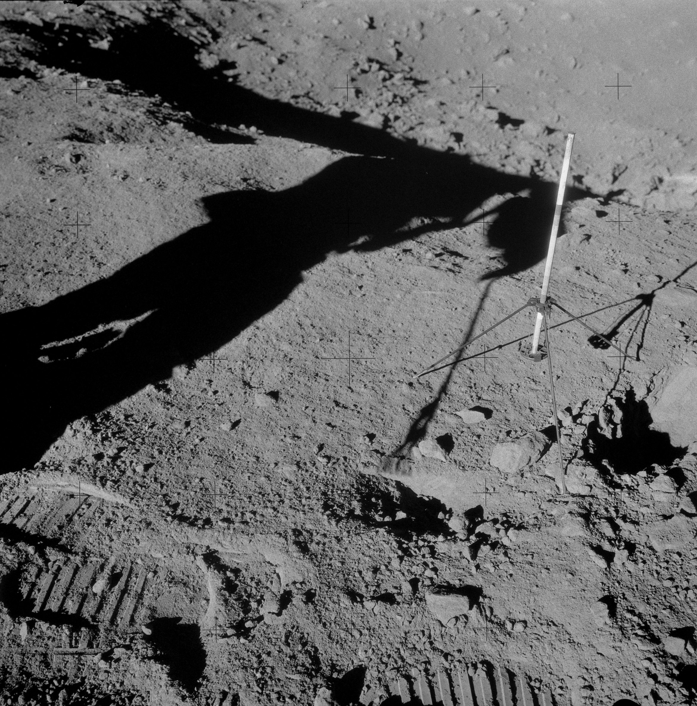 133:41:25 Cross-Sun companion to 7313 with much better exposure than 7314. It is a good portrait of the gnomon, with the HTC in the background. Note the core tubes which are affixed horizontally to the near face of the HTC.AS12-49-7316 (OF300) ( 108k or 800k )