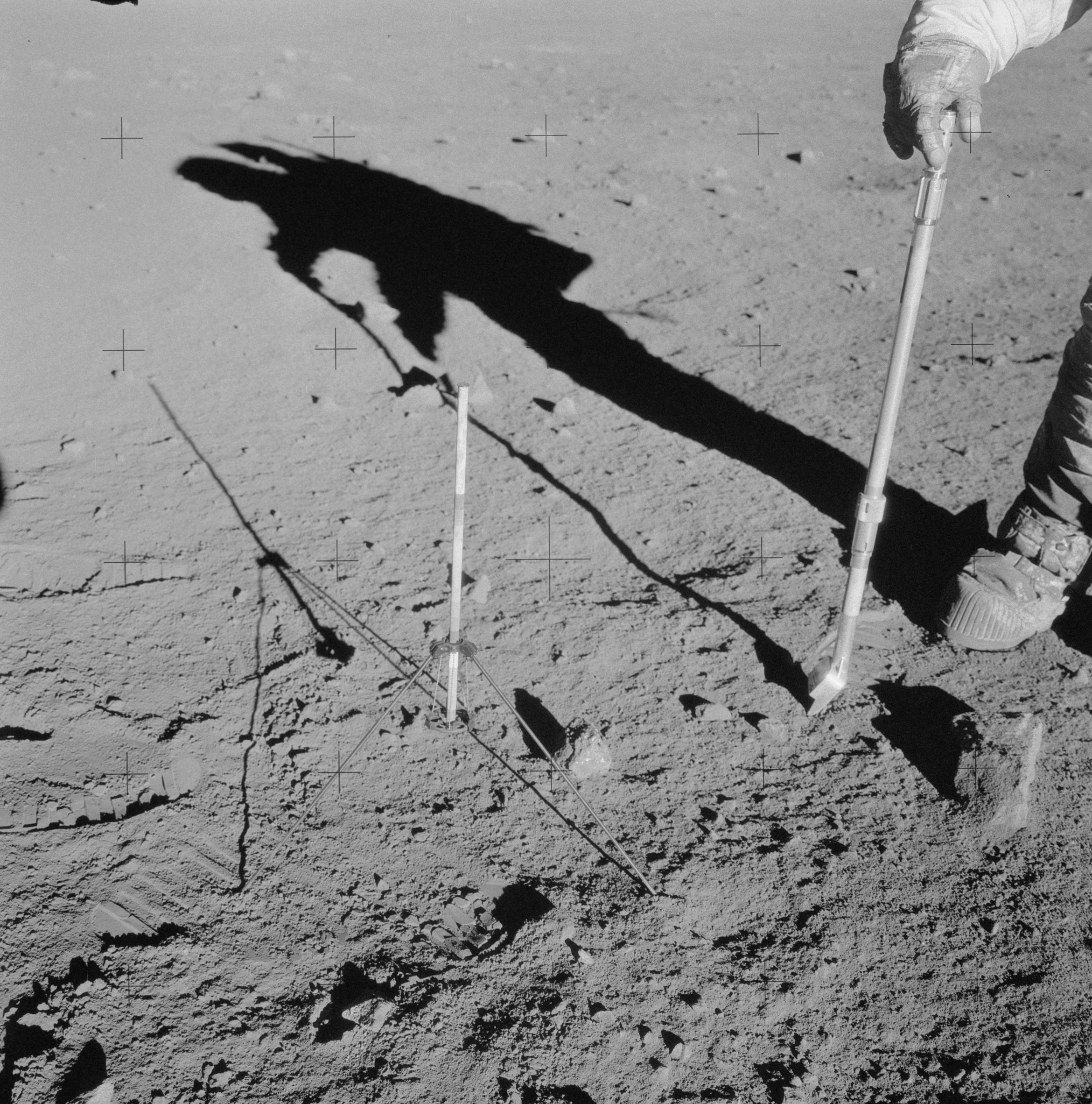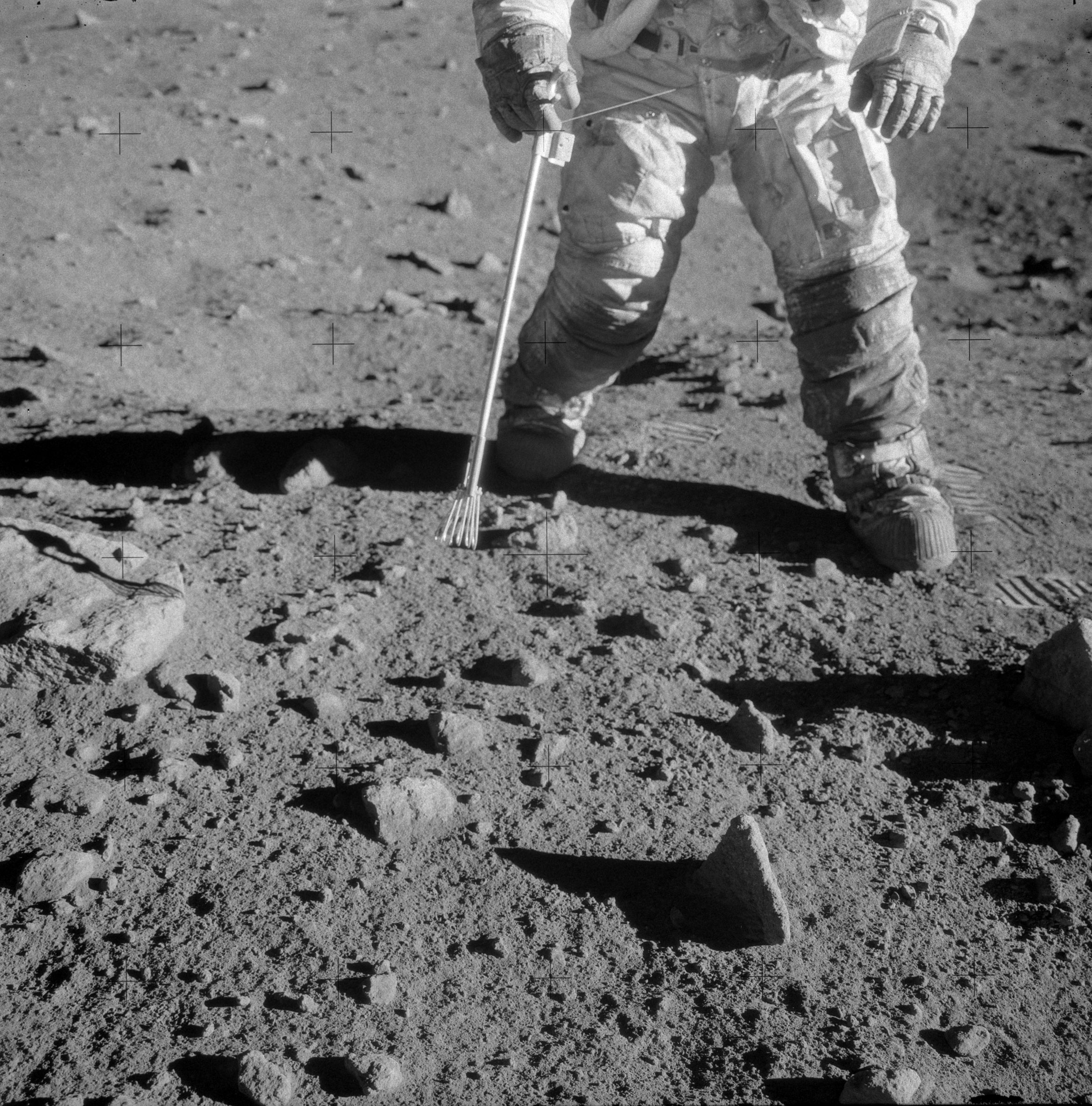 133:41:13 Al's Down-Sun "before" of a sample site showing the gnomon and Pete's boots, hands, and scoop. Note how dirty Pete's gloves have become.AS12-49-7314 (OF300) ( 256k or 1300k )