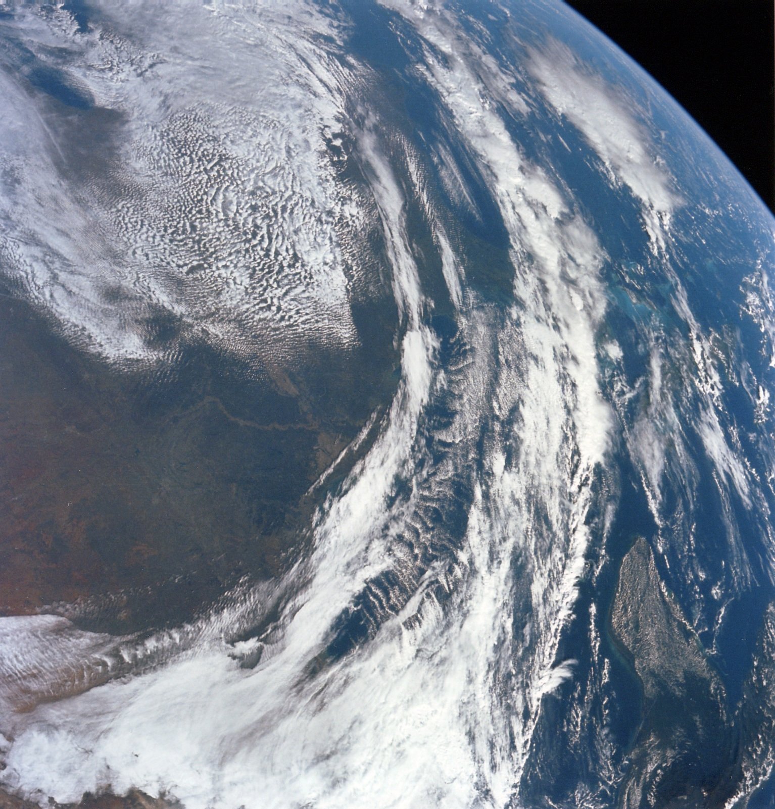 This photo was taken not long after translunar injection and is centered on the Gulf Of Mexico near New Orleans. East is at the upper right and north is at the upper left. The Yucatan Pennisula is in the lower right part of the image. Scan by Kipp Teague.AS12-50-7326 ( 128k or 353k )