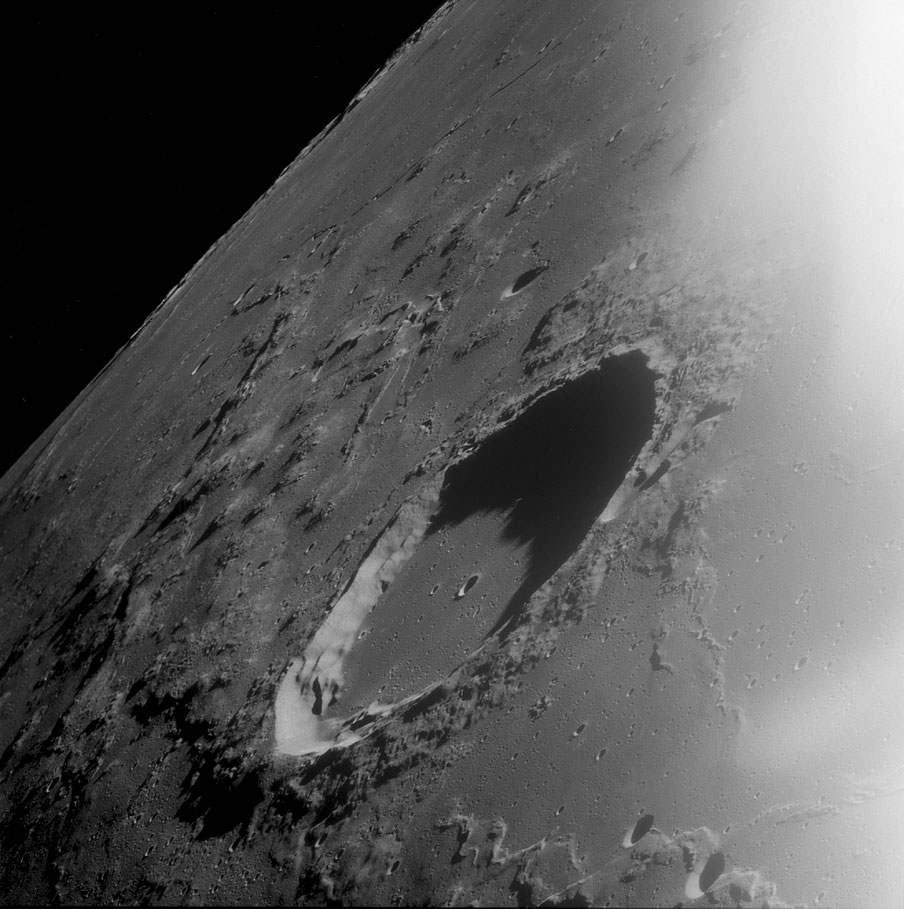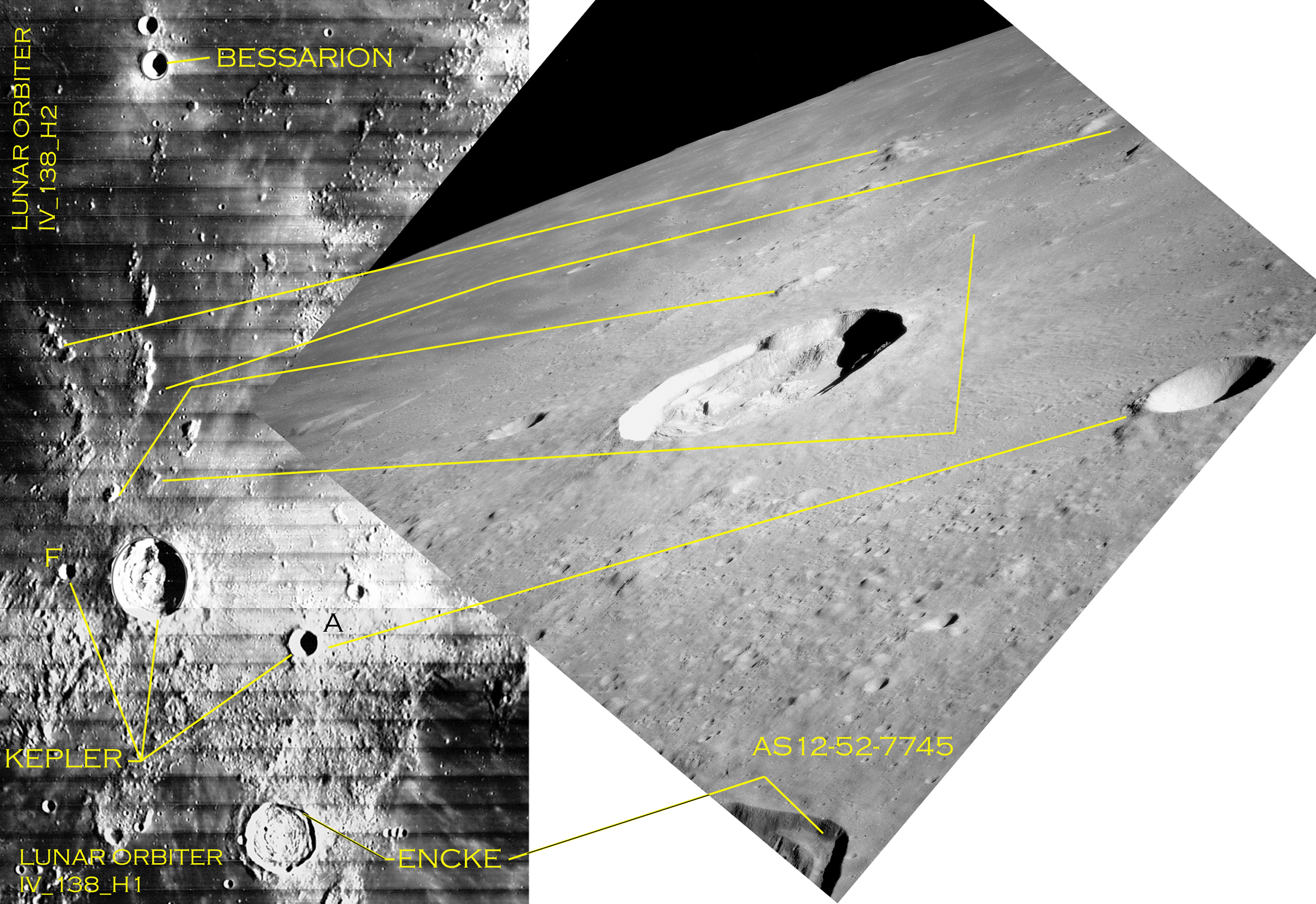 View of Kepler Crater from lunar orbit. See, also, a labeled version ( 3.2 Mb ) by René Cantin.AS12-52-7757 ( 144k or 761k )