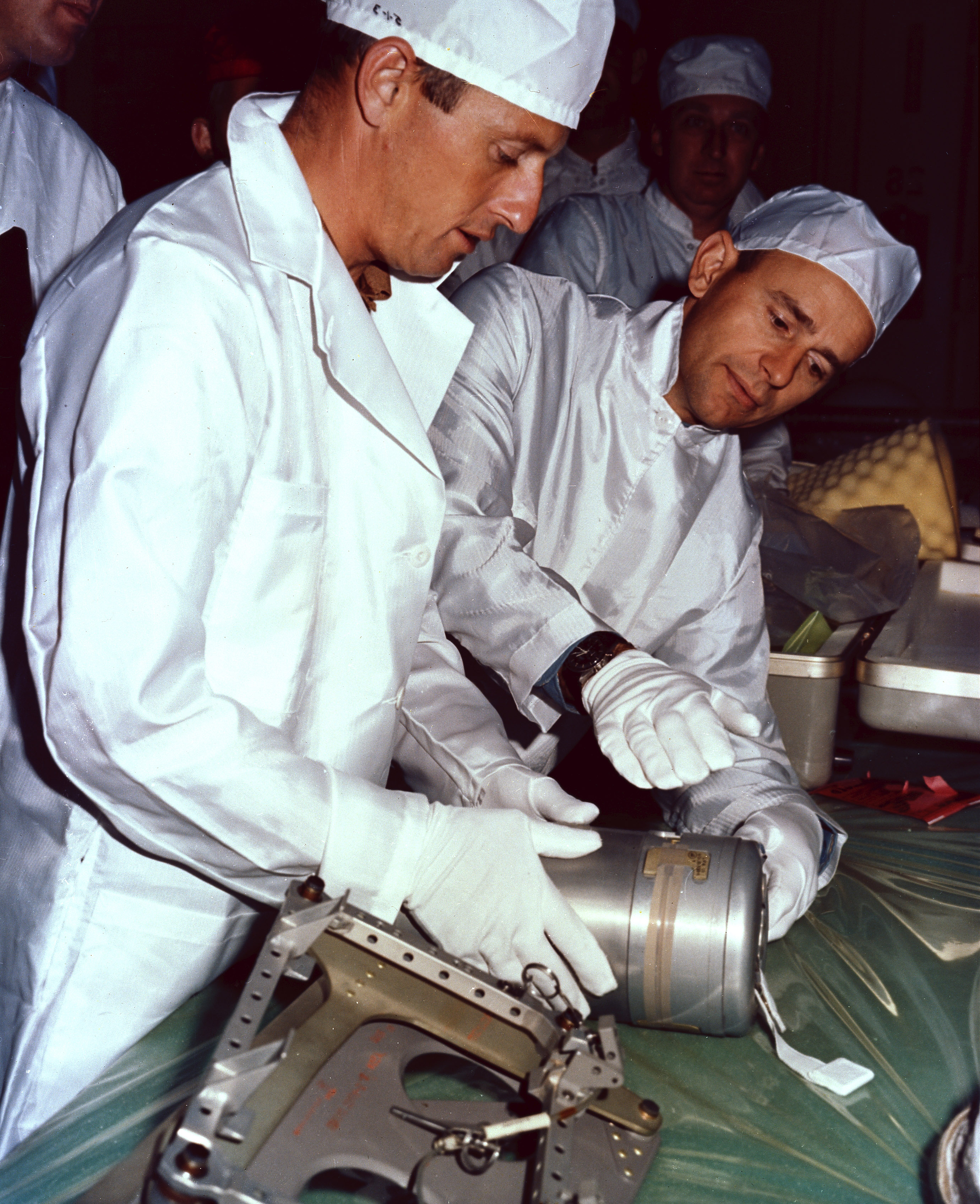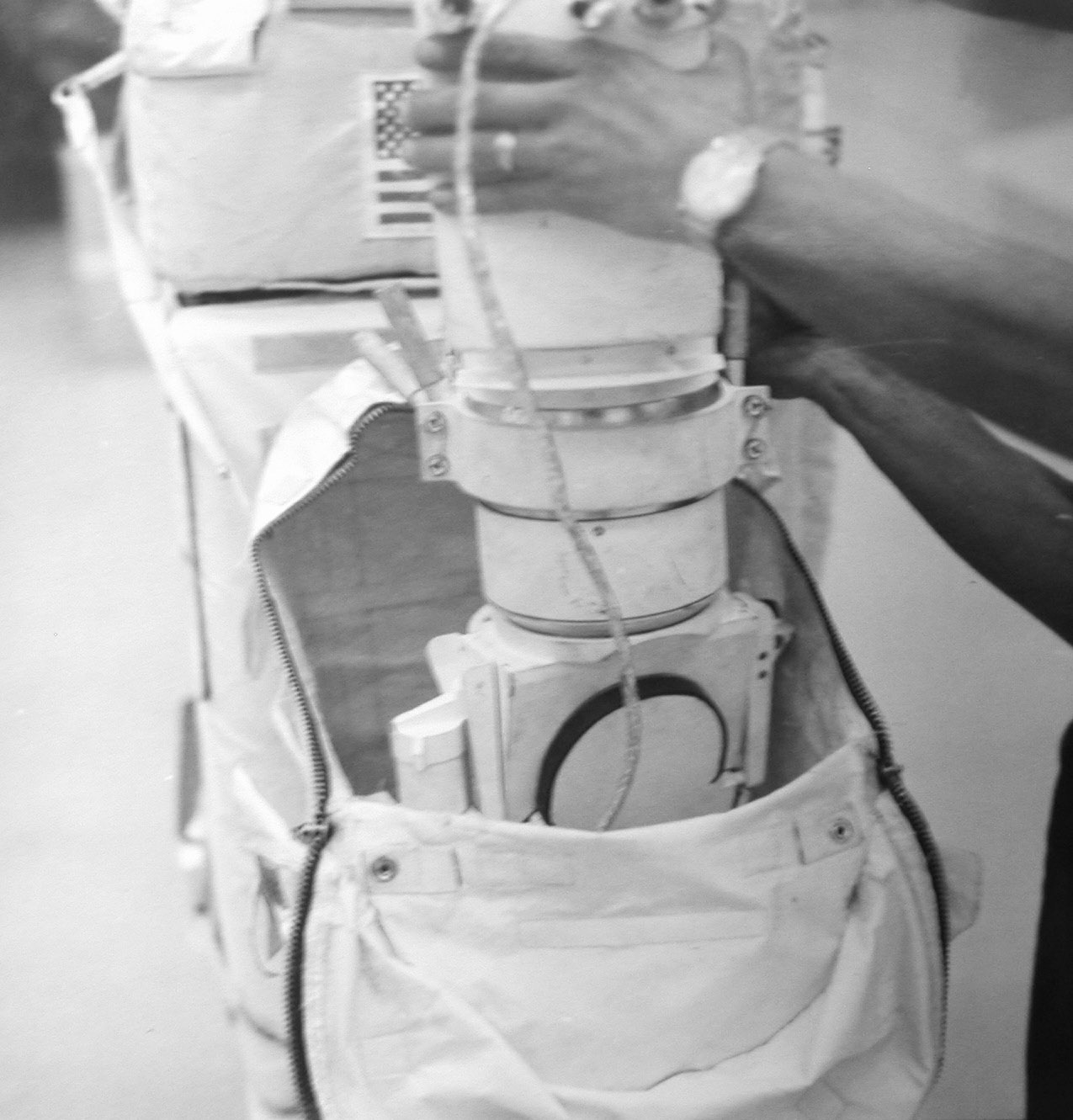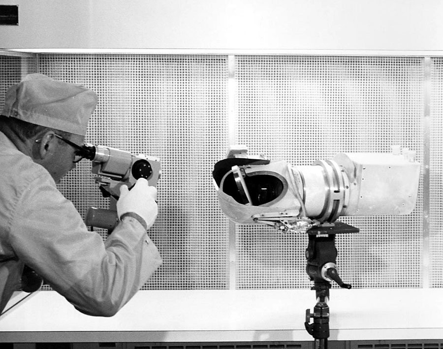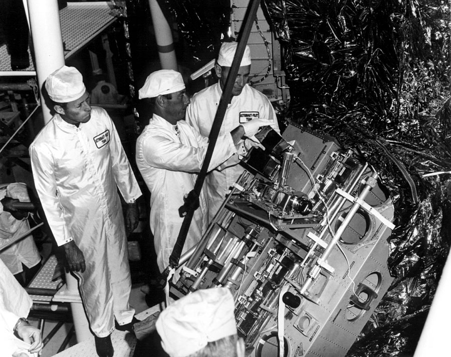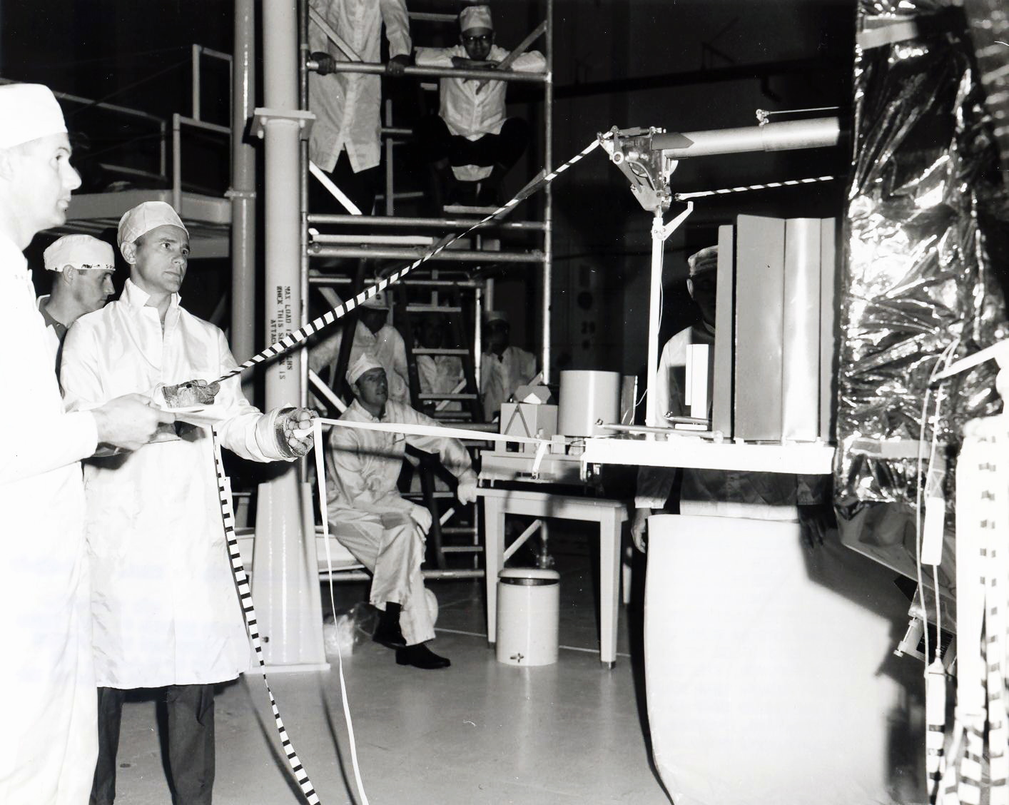 Inspection of the Surveryor 3 camera at Hughes Aircraft Company. April 1970. Scan by J.L. Pickering."Dixie Cup" Sample bags and dispenser ( 451k )