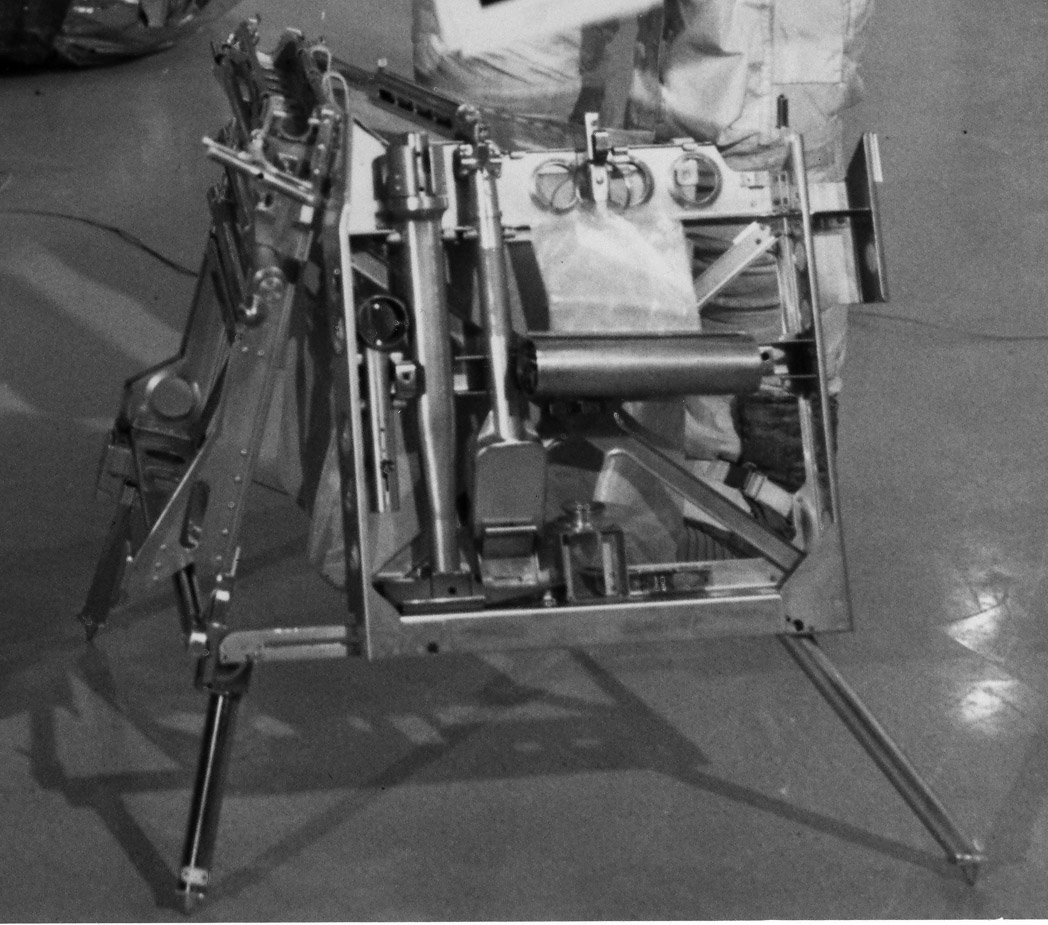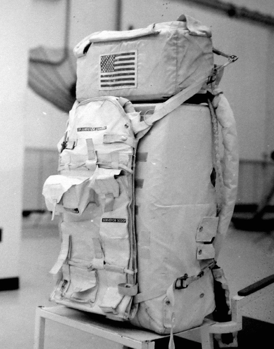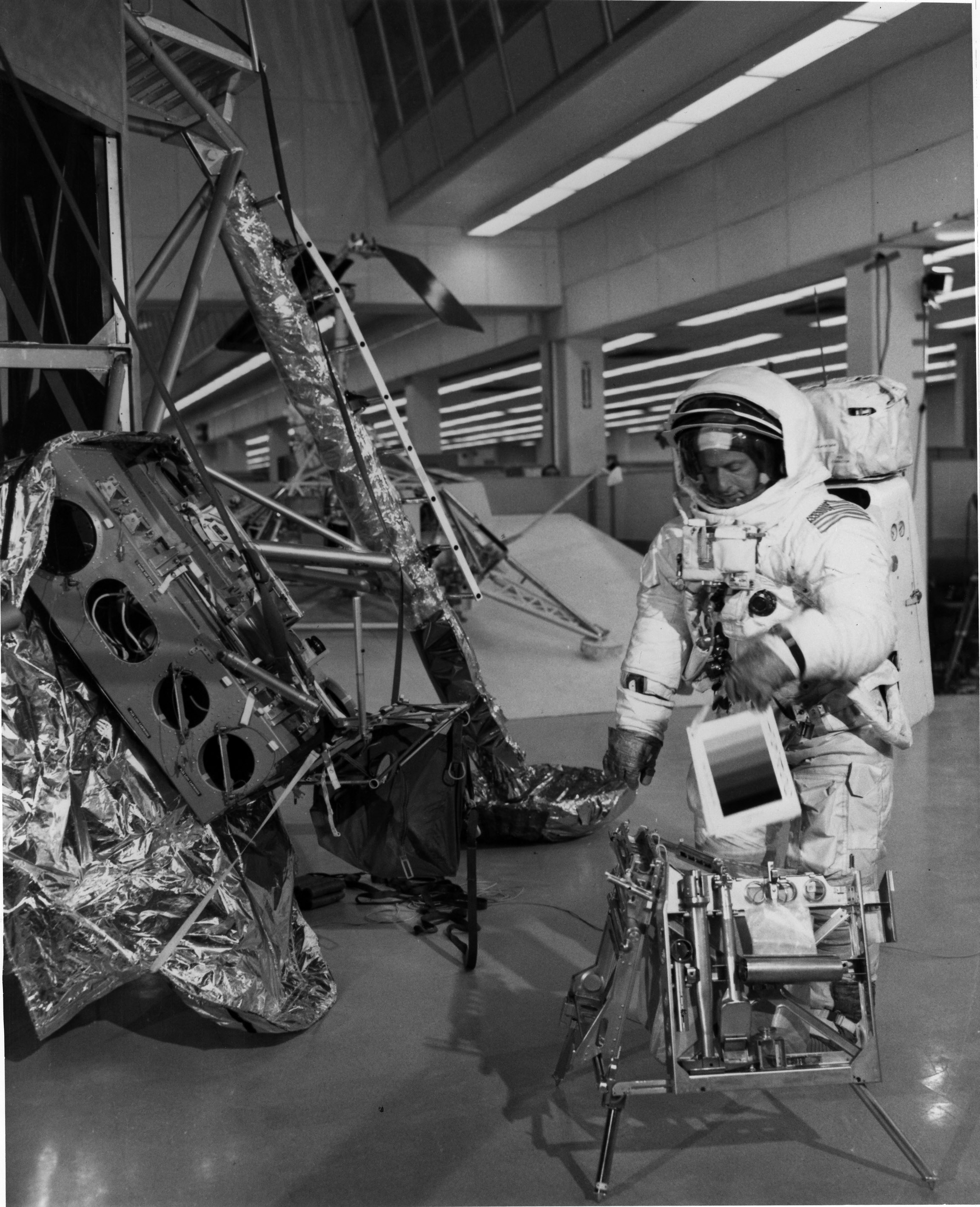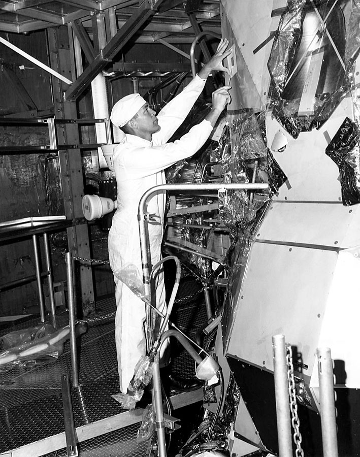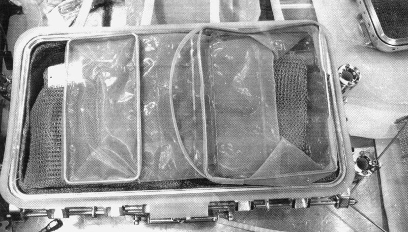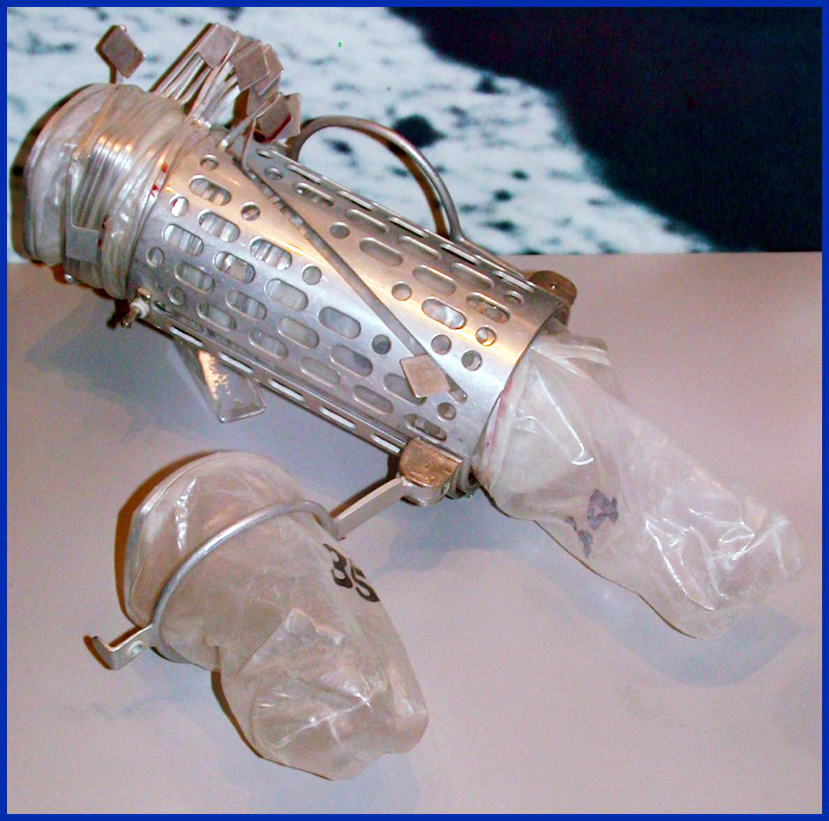 Inspection of the Surveryor 3 camera at Hughes Aircraft Company. April 1970. Scan by J.L. Pickering."Dixie Cup" Sample bags and dispenser ( 451k )