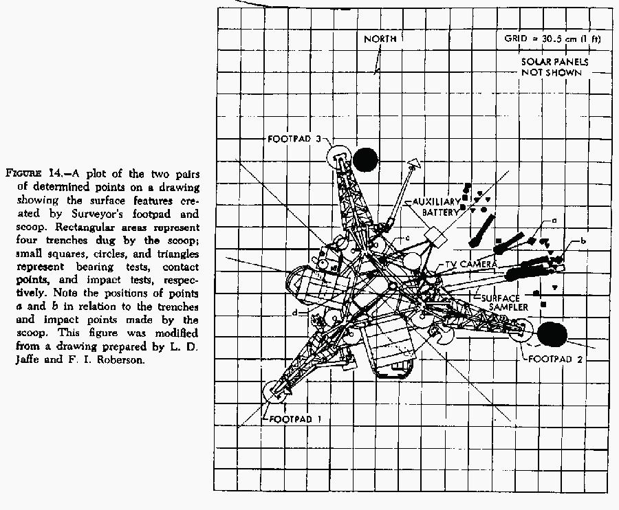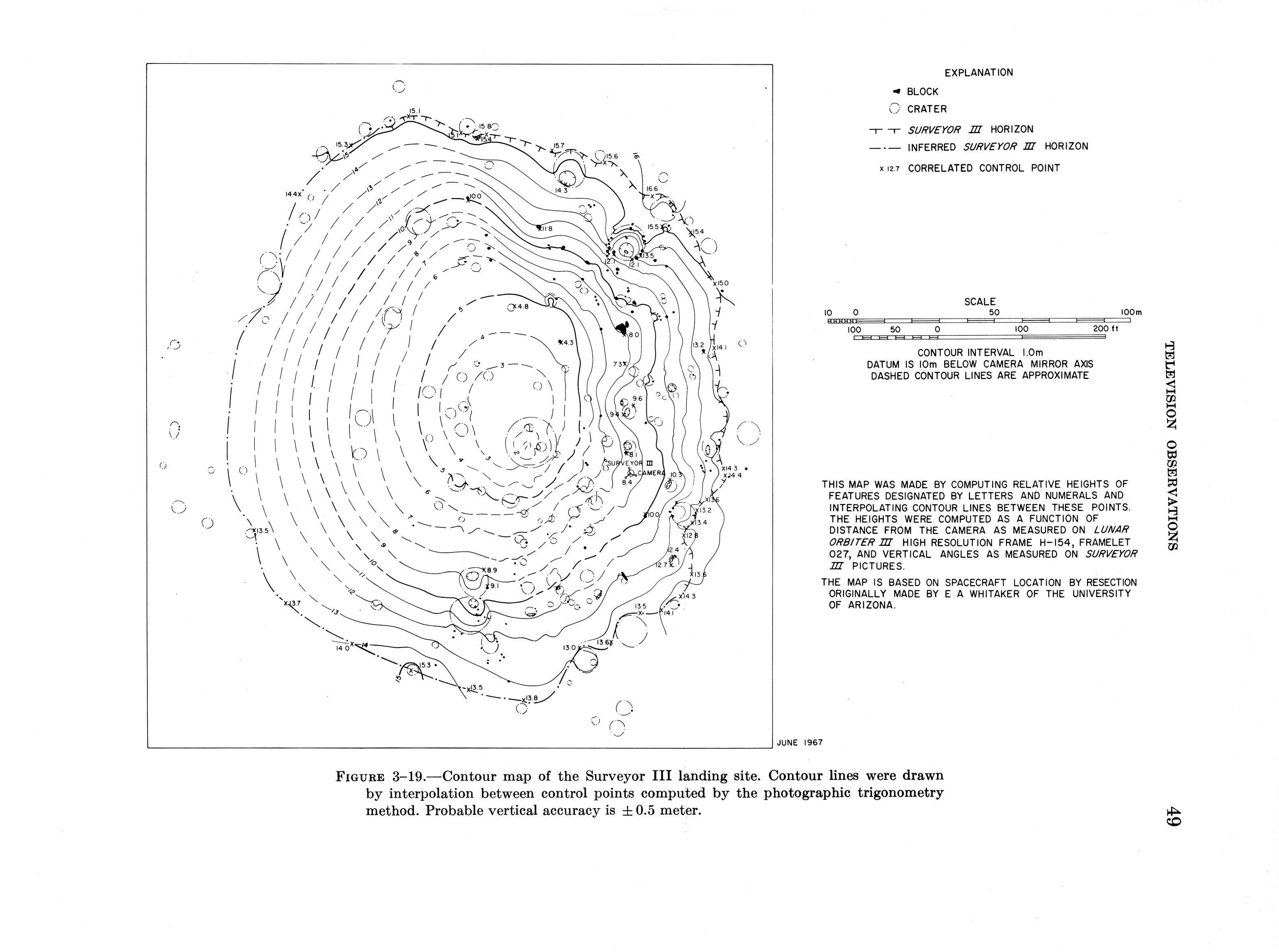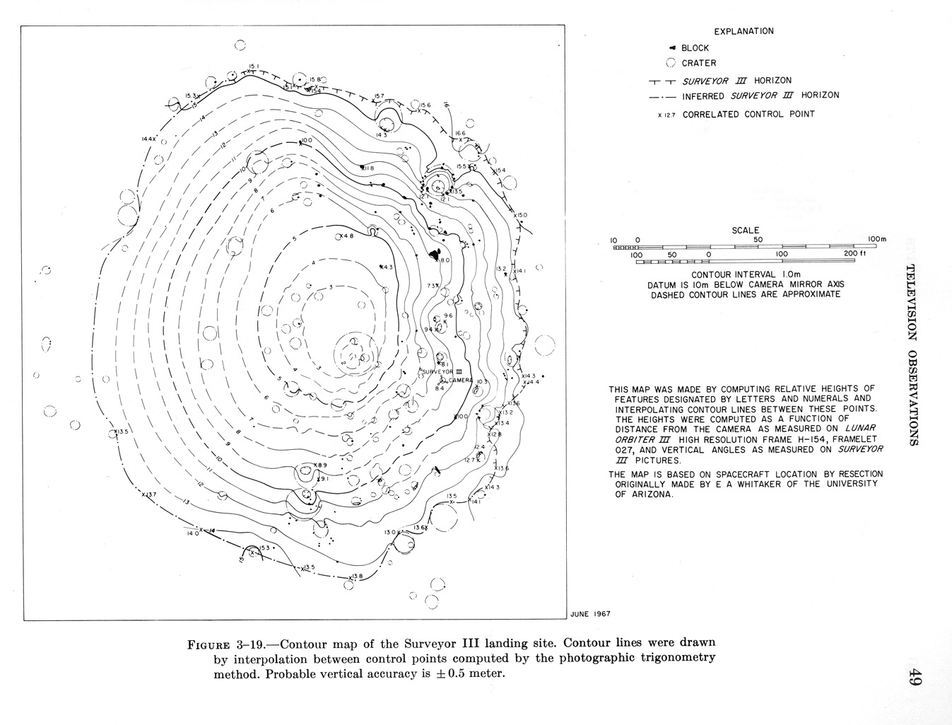 This contour map is reproduced on page 49 in NASA SP-184, Surveyor Program Results, published in 1969. An explanation of the map can be found on a scan of the entire page ( 0.3Mb or 21Mb ). This map was undoubtedly used in planning the EVA-2 entry into the crater and in properly tilting the Surveyor mock-up used in training. Scans courtesy Mary Ann Hagar, Lunar and Planetary Institute.Descartes Landing Site
