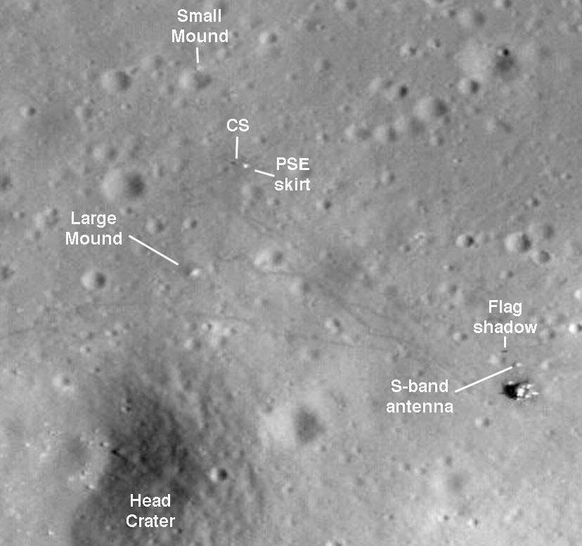 With the Sun close to the zenith the range of brightness in the field-of-view is narrow. The disturbed areas near the LM and Surveyor III are the darkest portions of the image but, up close, would not appear as dark as they seem to be in the image. A labeled detail shows the LM and ALSEP. Note that portions of the ribbon cables connecting the SIDE/CCIG and LSM to the Central Station are quite bright. The shiny, surface of the cables is a good sunlight reflector so that, with the Sun and the spacecraft both virtually at the zenith, those portions of the cable which are lying flat on the surface are bright. Pete's photo AS12-46-6820 shows the SIDE/CCIG cable running off to the right. Although the cable clearly has up/down 'waves', it doesn't appear to be twisted. Labeled versions and a link to the raw file (M109386083RE) are available at the LROC website.29 November 2009 03:34:10 UTC; Solar El/Az 31.9/89.3; LRO altitude 42.8 km. ( 6.6 Mb )Deconvolved, 0.25 m/pixel (3.1 Mb TIF) and 0.5 m/pixel (3.4 Mb TIF) versions by GoneToPlaid.
