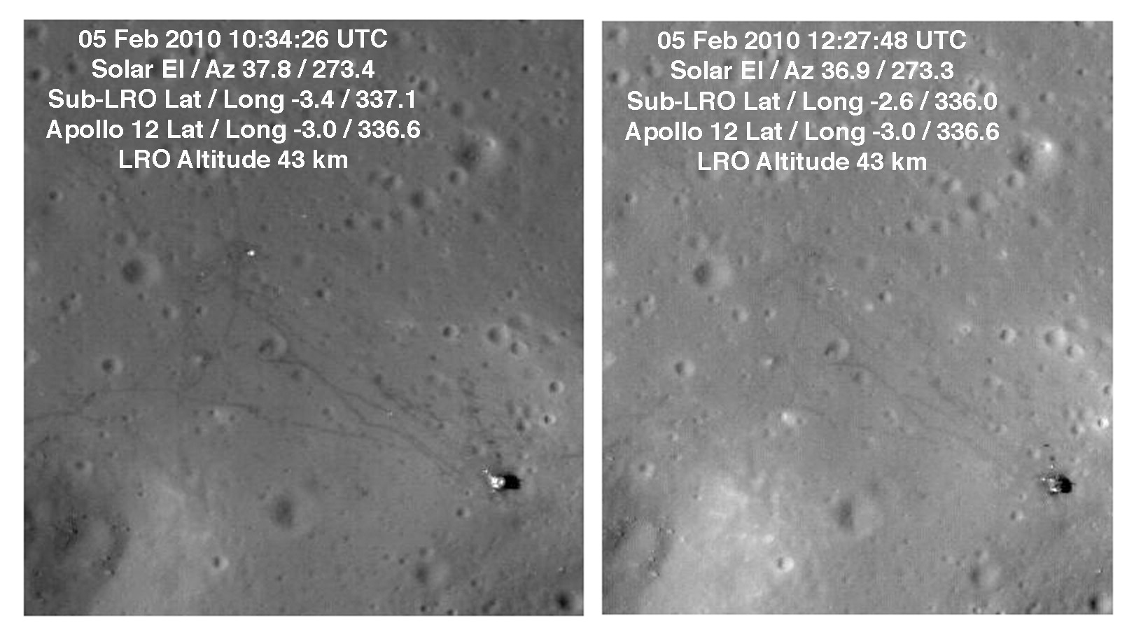 The raw image is M120005333R.05 February 2010 12:27:48 UTC (Second of Two Passes); Solar El/Az 36.9/273.3; LRO altitude 43 km; resolution 0.51m/pixel ( 8.9 Mb )Deconvolved, 0.25 m/pixel (9 Mb TIF); deconvolved/gamma-corrected 0.25 m/pixel (12 Mb TIF); deconvolved 0.5 m/pixel (3.6 Mb TIF) and deconvolved/gamma-corrected 0.5 m (4.4 Mb TIF) versions by GoneToPlaid.