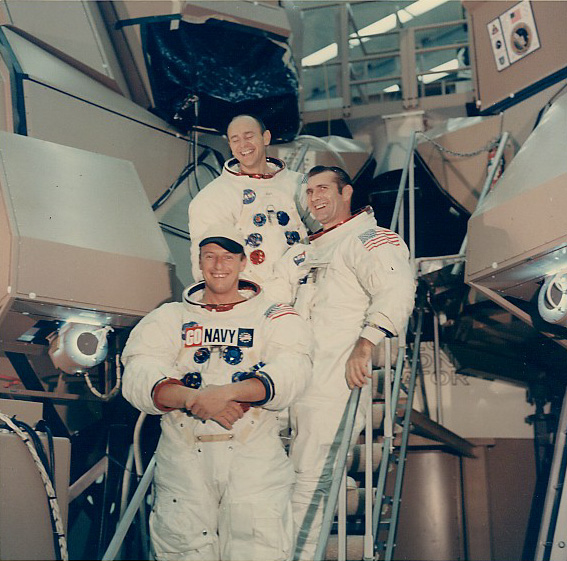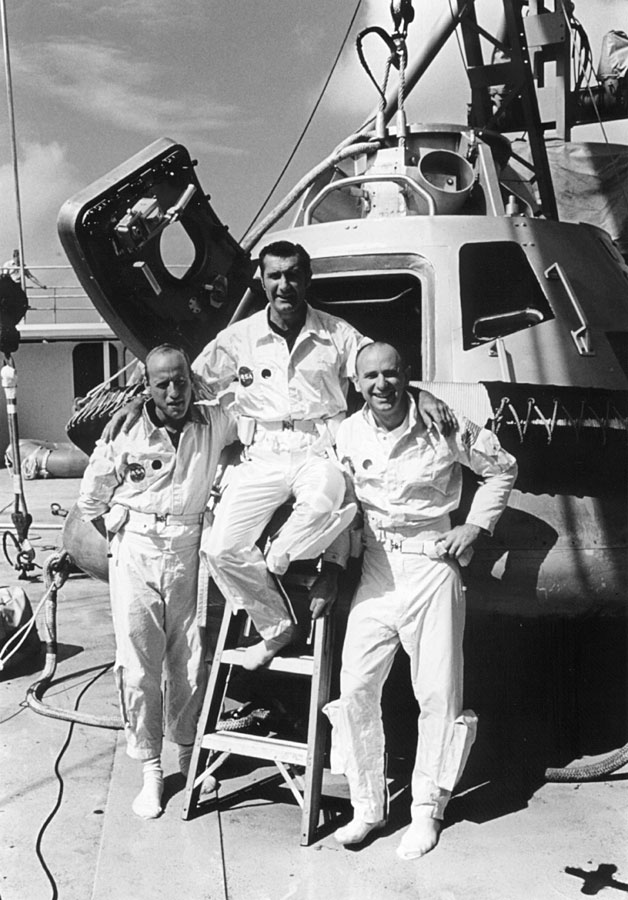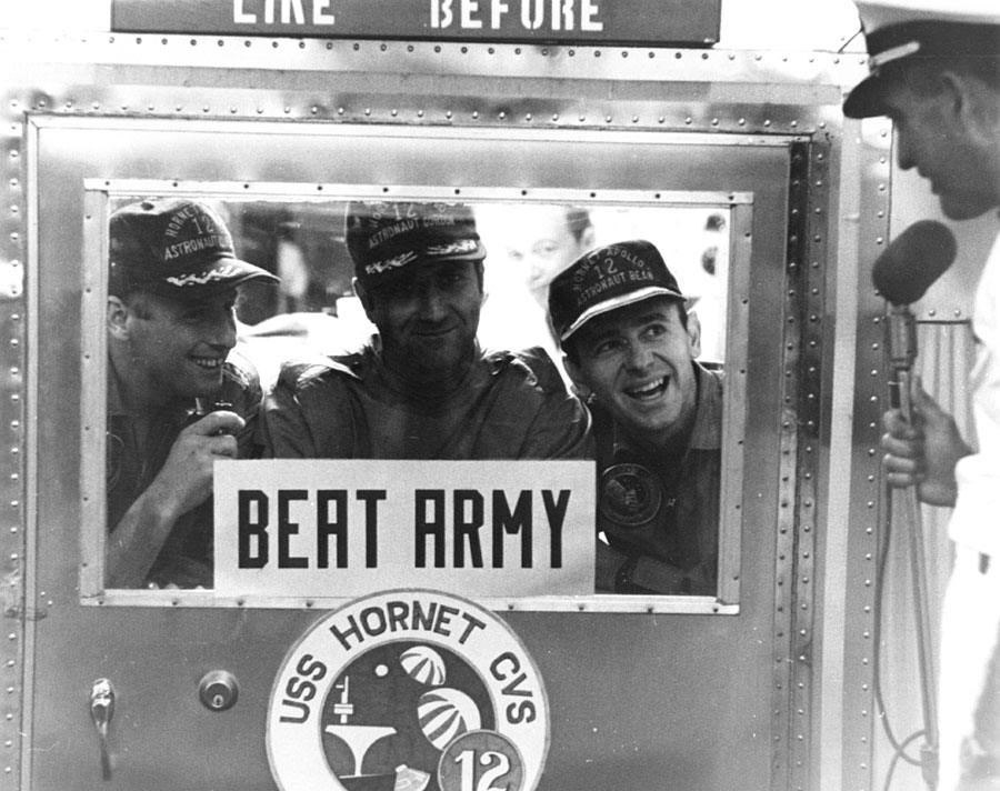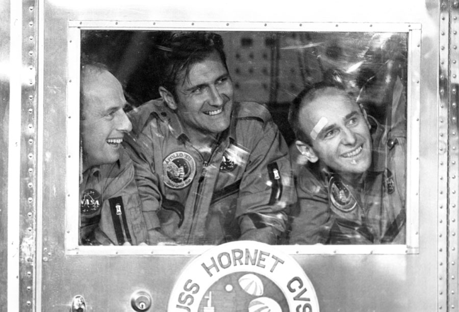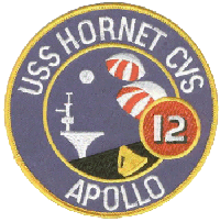 Rear Admiral Donald C. David, Commander, Manned Spacecraft Recovery Force, Pacific, welcomes the crew of the Apollo 12 lunar landing mission aboard the U.S.S. Hornet. 24 November 1969. Scan by Ed Hengeveld.USS Hornet Patch ( 25k )