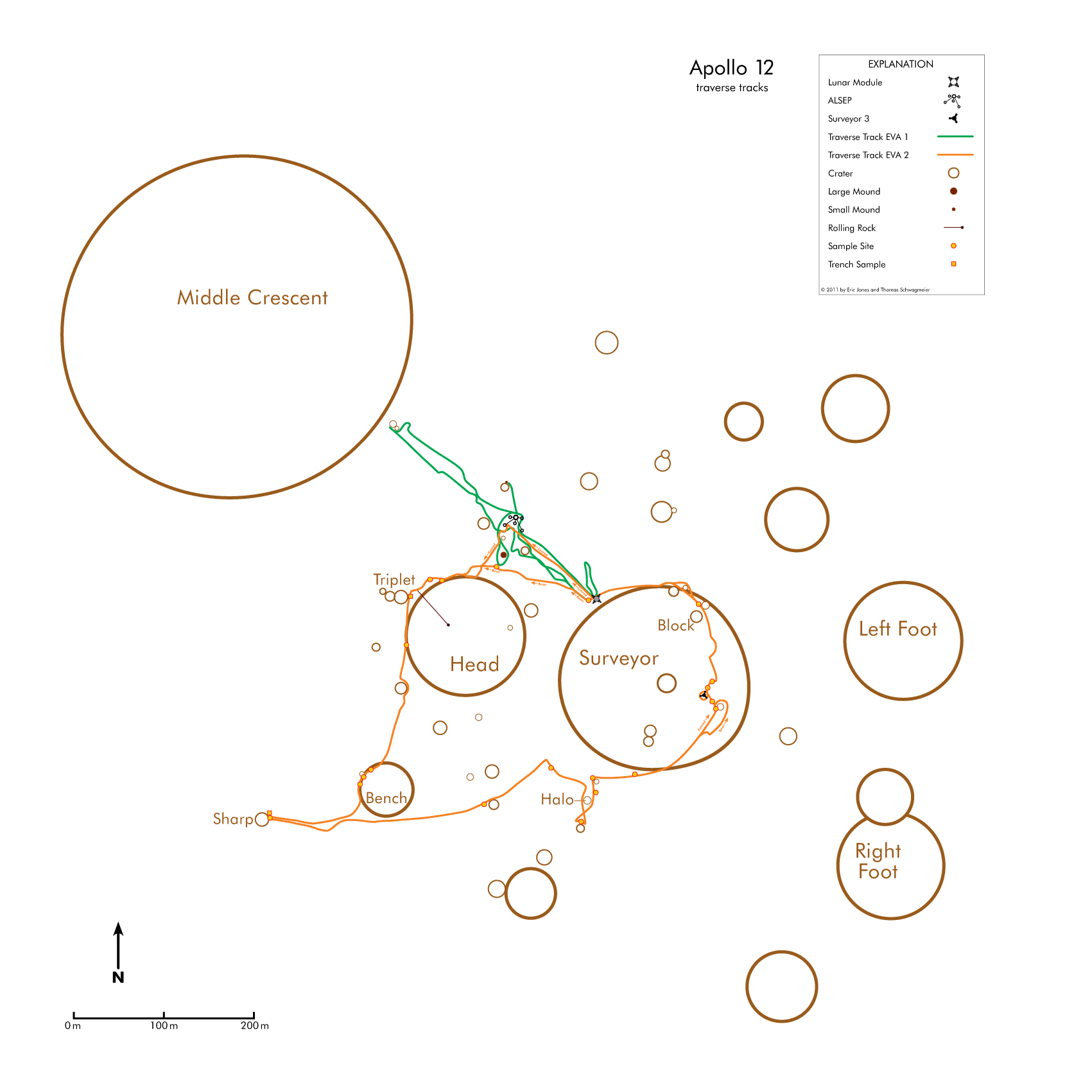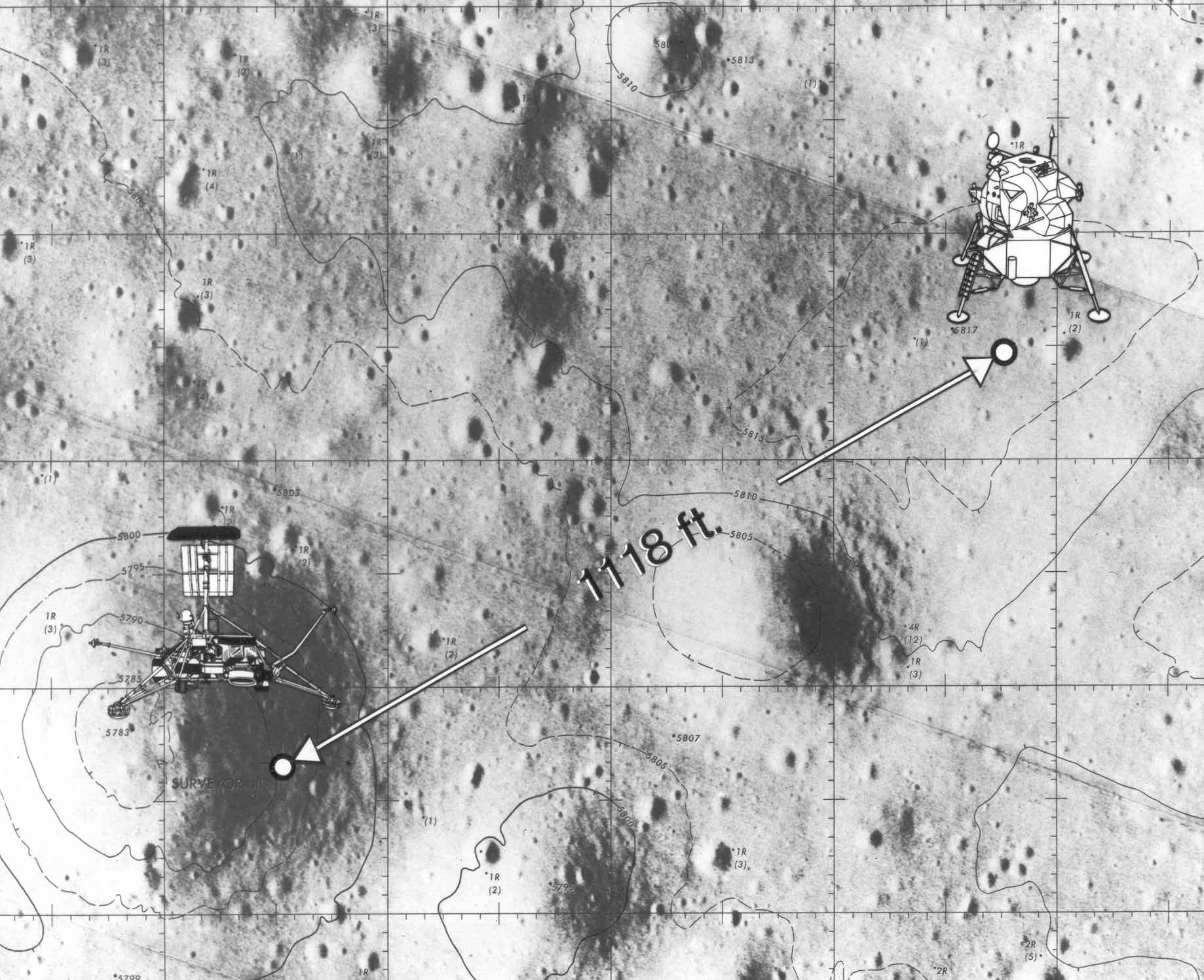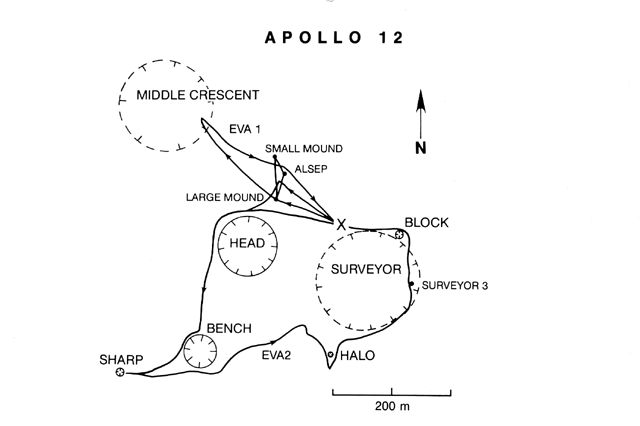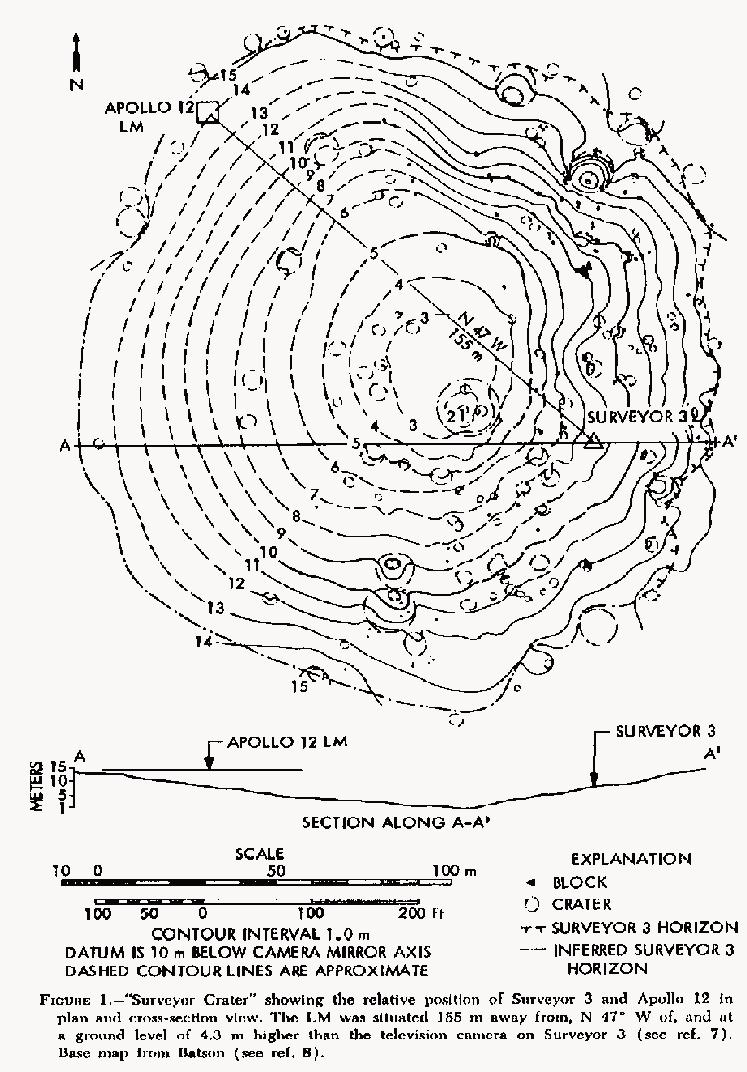 Figure 4-9 from the Apollo 12 Mission Report shows the approach view (top) used in training. Head Crater is the large crater just below the top of the frame and Surveyor Crater is the larger crater just below it. Note that this view overemphasizes the apparent depth of the crater below and slightly to the left of Surveyor Crater. The photograph at bottom right is a frame of 16-mm film shot through Al's LM window during the approach. The sketch at the bottom right includes an outline of the Snowman. The large crater beyond and to the right of the Snowman is Middle Crescent Crater, which Pete and Al will visit at the end of EVA-1.Surveyor Crater Contour Map ( 1.1Mb )