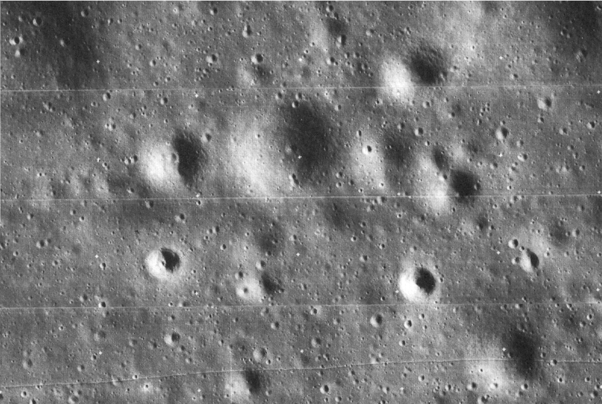 Composite of Lunar Orbiter III strips showing the prime Apollo 12 lunar landing site. The landing ellipse is 7.2 nautical miles by 2.6 nautical miles. The coordinates of the ellipse center are 2 degrees 56 minutes 33 seconds (2.943 degrees) south latitude and 23 degrees 26 minutes 36 seconds (23.443 degrees) west longitude, and the elevation is 1,735,900 meters. Scan courtesy of David Harland.Lunar Orbiter View of the Landing Site ( 0.5Mb or 87k )