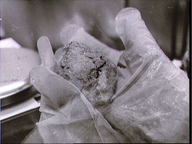 A scientist's gloved hand holds one of the numerous rock samples brought back to Earth from the Apollo 12 mission. This sample is a highly shattered basaltic rock with a thin black-glass coating on five of its six sides. Glass fills fractures and cements the rock together. The rock appears to have been shattered and thrown out by a meteorite impact explosion and coated with molten rock material before the rock fell to the surface.